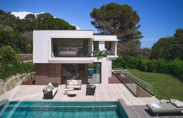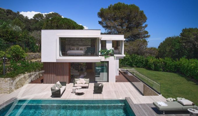 Diese zeitgenössische Villa mit einer Fläche von ca. 490 m² auf zwei Ebenen mit Pool ...