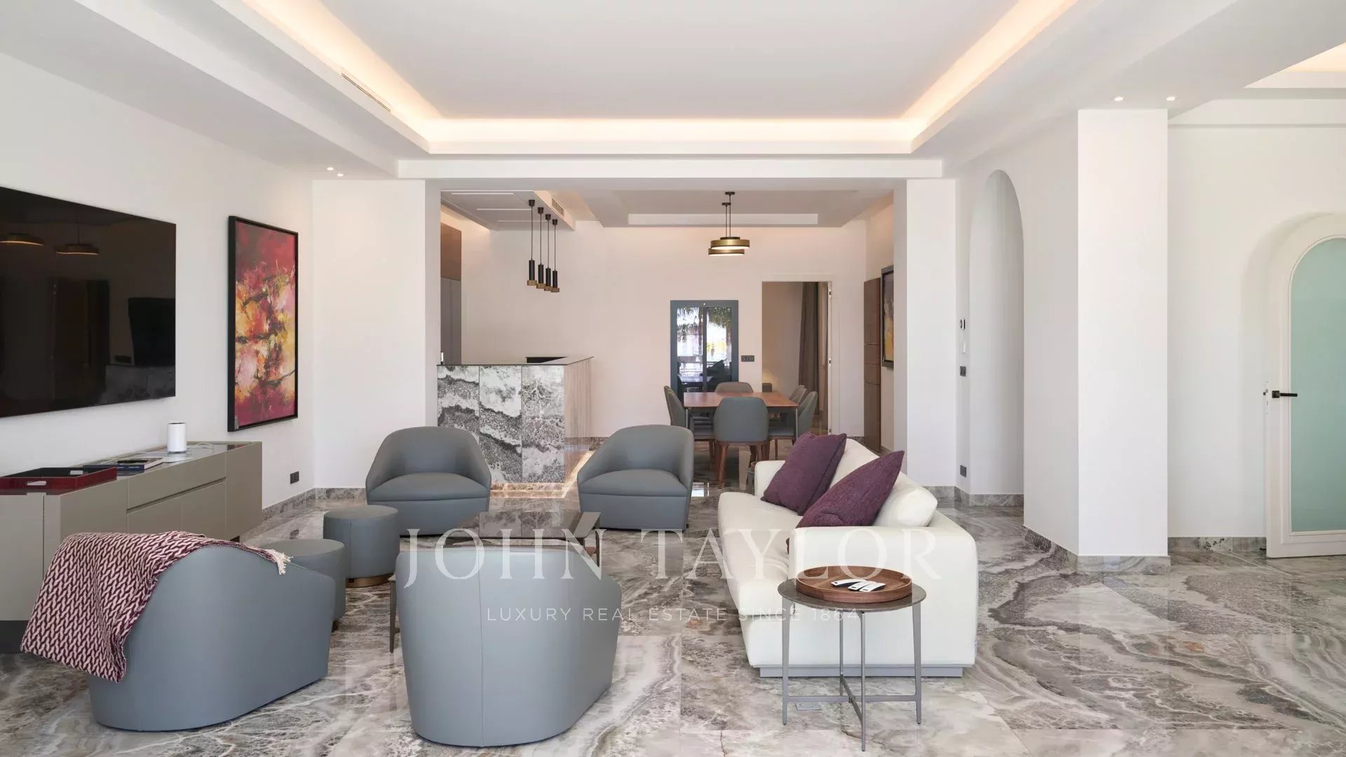 Die Wohnung wurde 2023 komplett renoviert und besticht durch ihre Dekoration, ihre hochwertigen Leistungen und ihre schöne und große, nach Süden ausgerichtete Terrasse von ca. 110 m2, die halb überdacht ist, mit Sommersalons ausgestattet ist und einen Blick auf die Bucht von Cannes und die Croisette bietet.