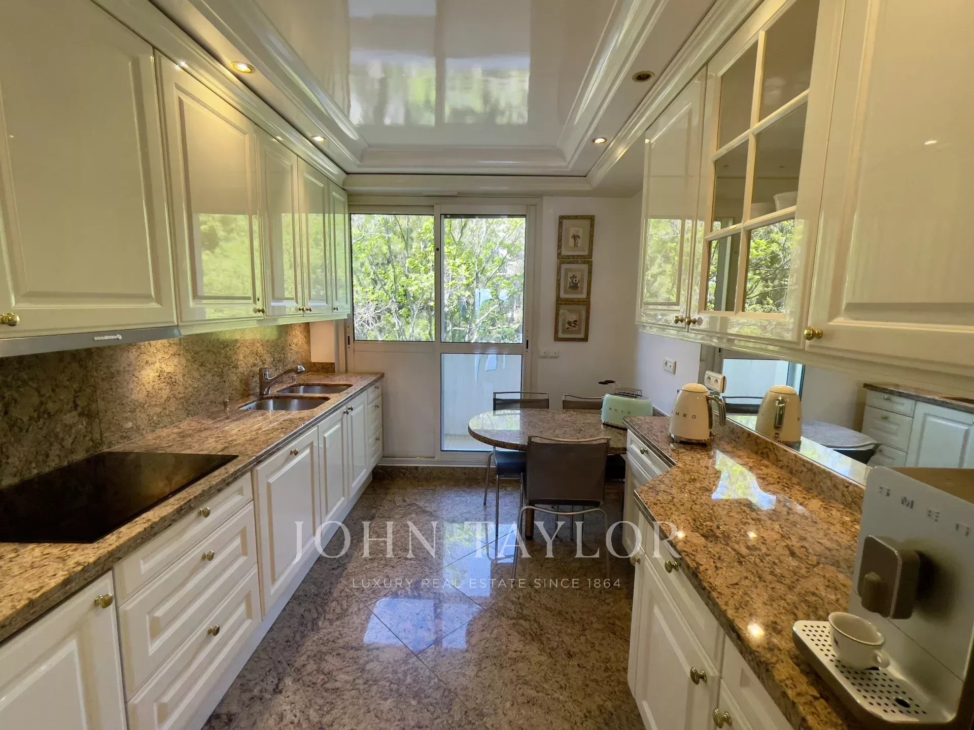 Große Einbauküche von 11 m2, die sich auf einen Balkon öffnet.