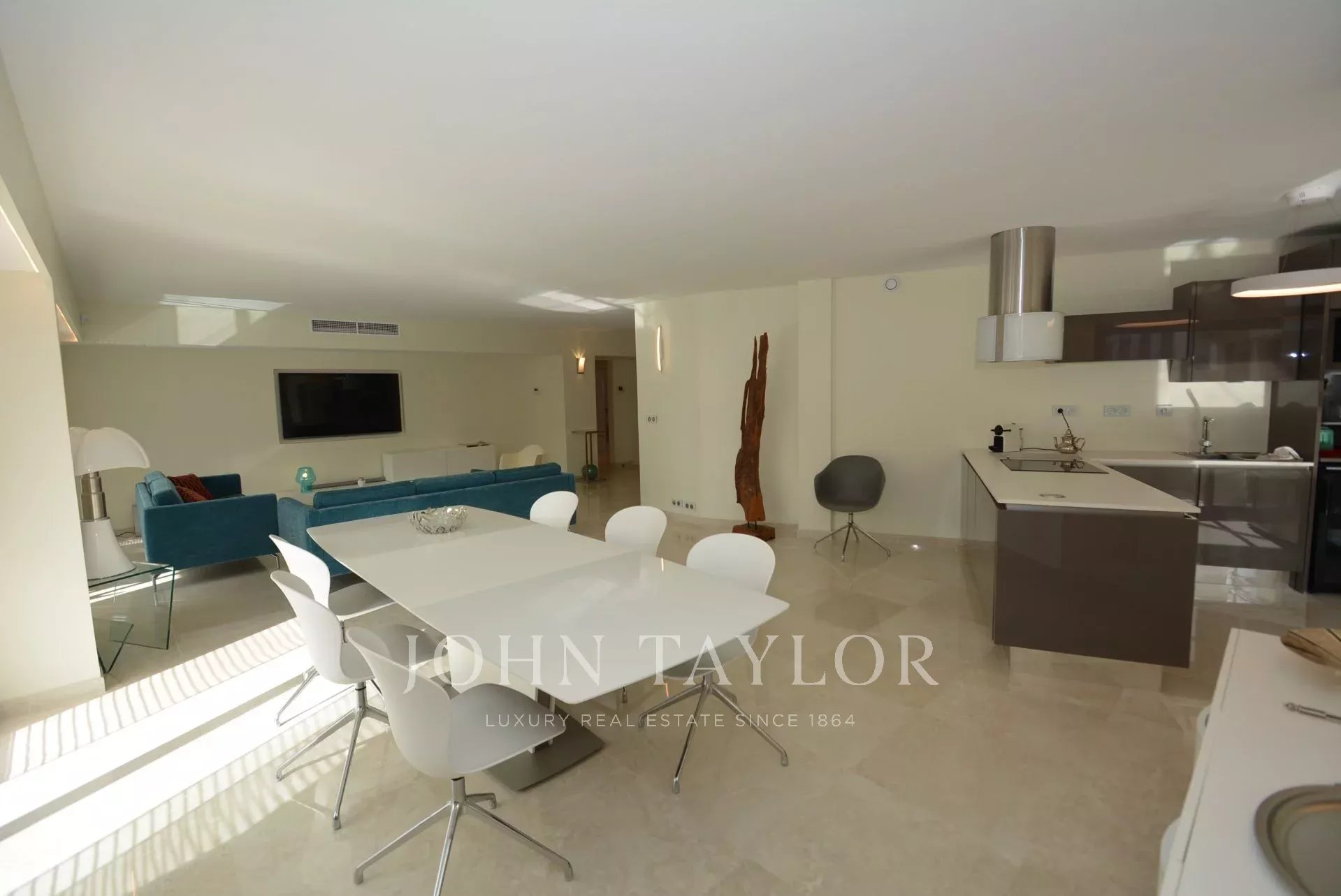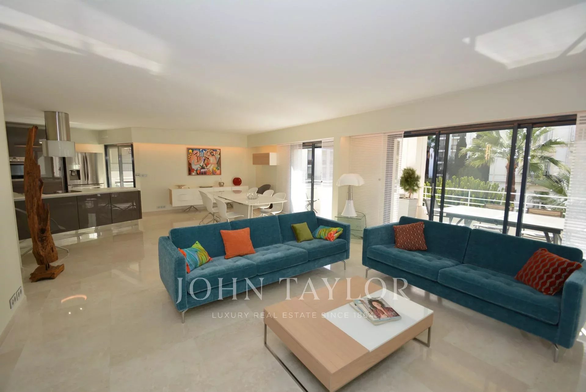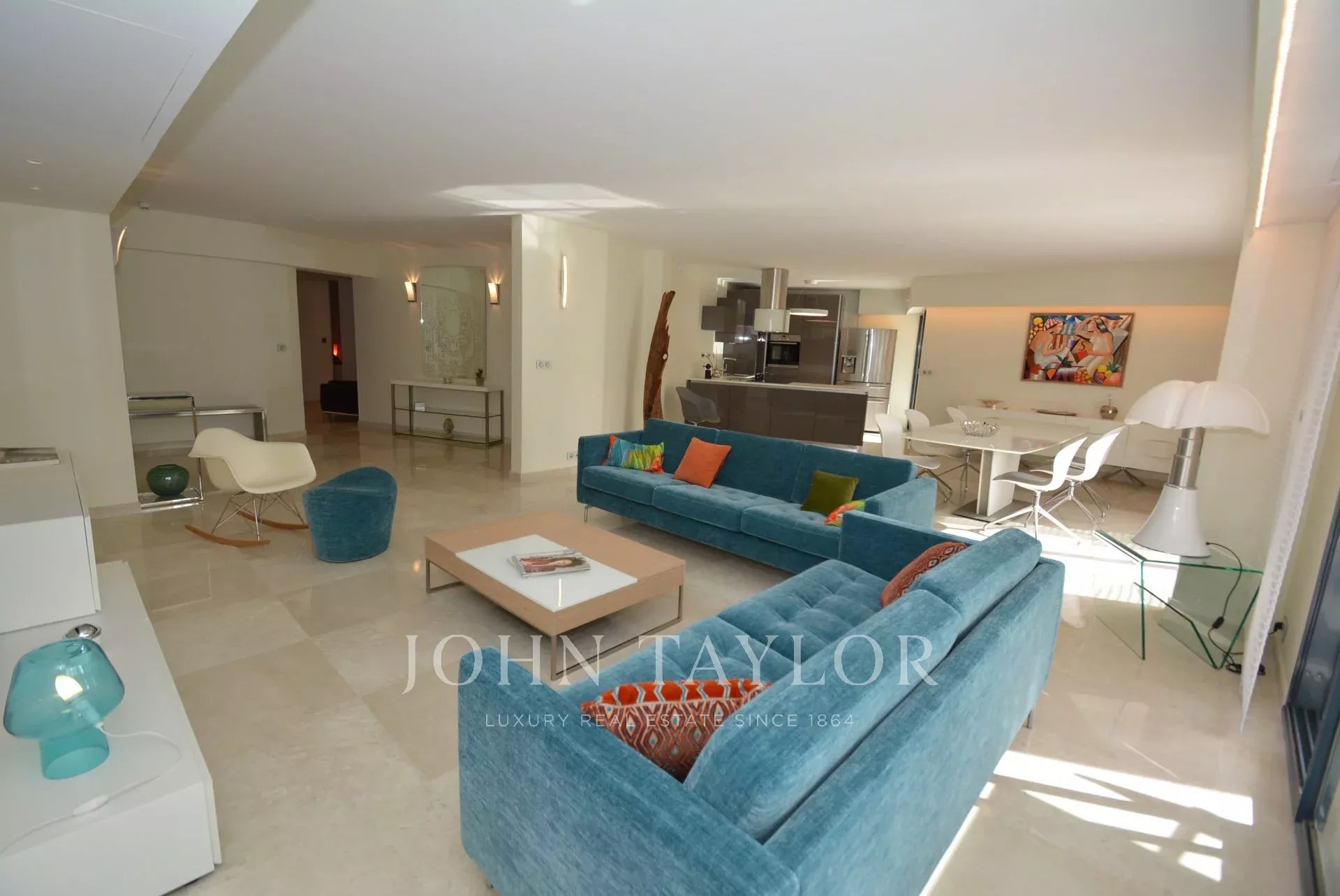Großer Empfang mit Wohnzimmer, Esszimmer und amerikanischer Küche, die sich zur Terrasse hin öffnen.