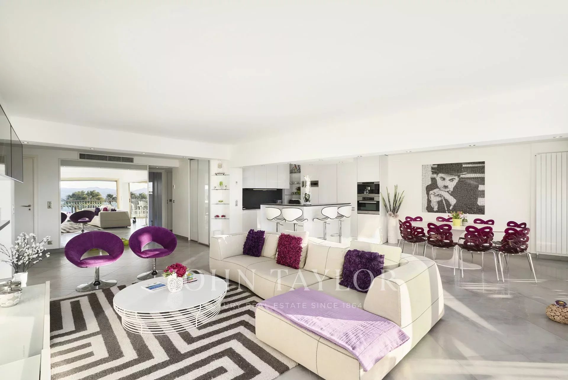 Großer Empfang, der sich zur Terrasse hin öffnet, mit Wohnzimmer, Esszimmer und amerikanischer Küche.