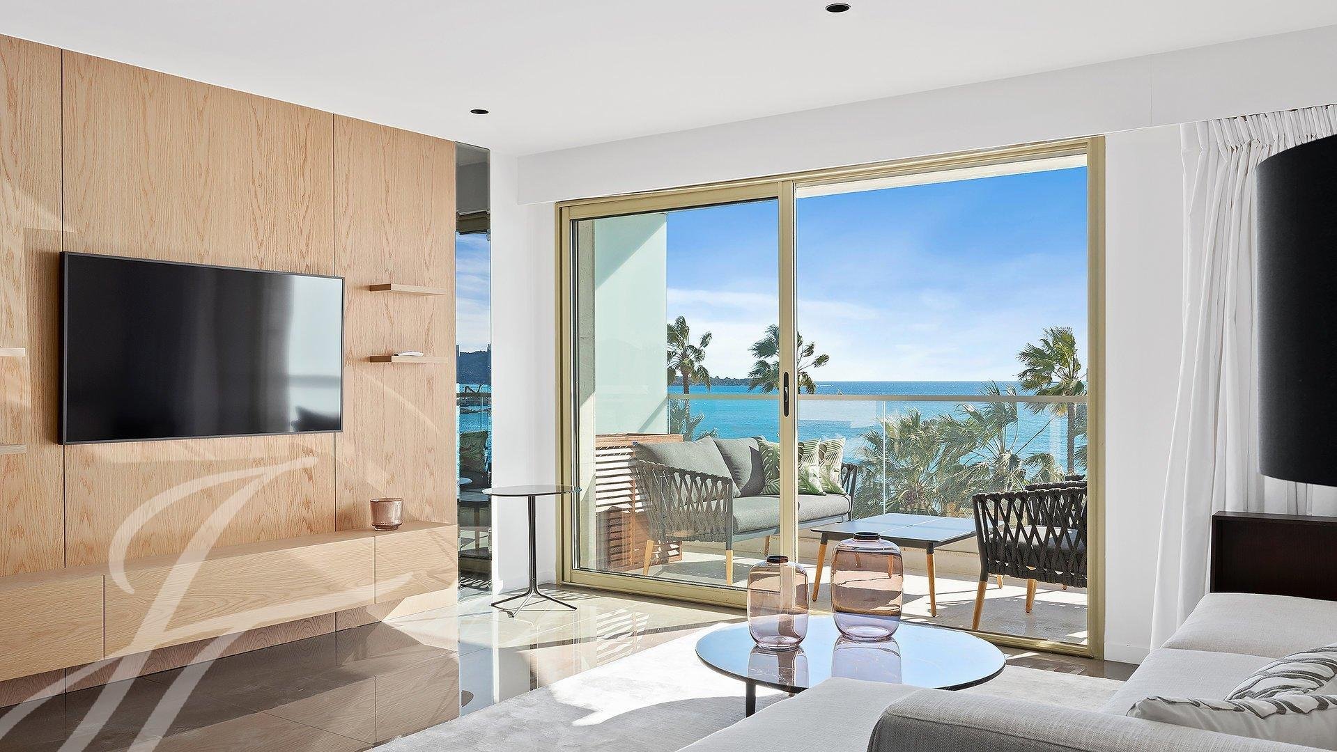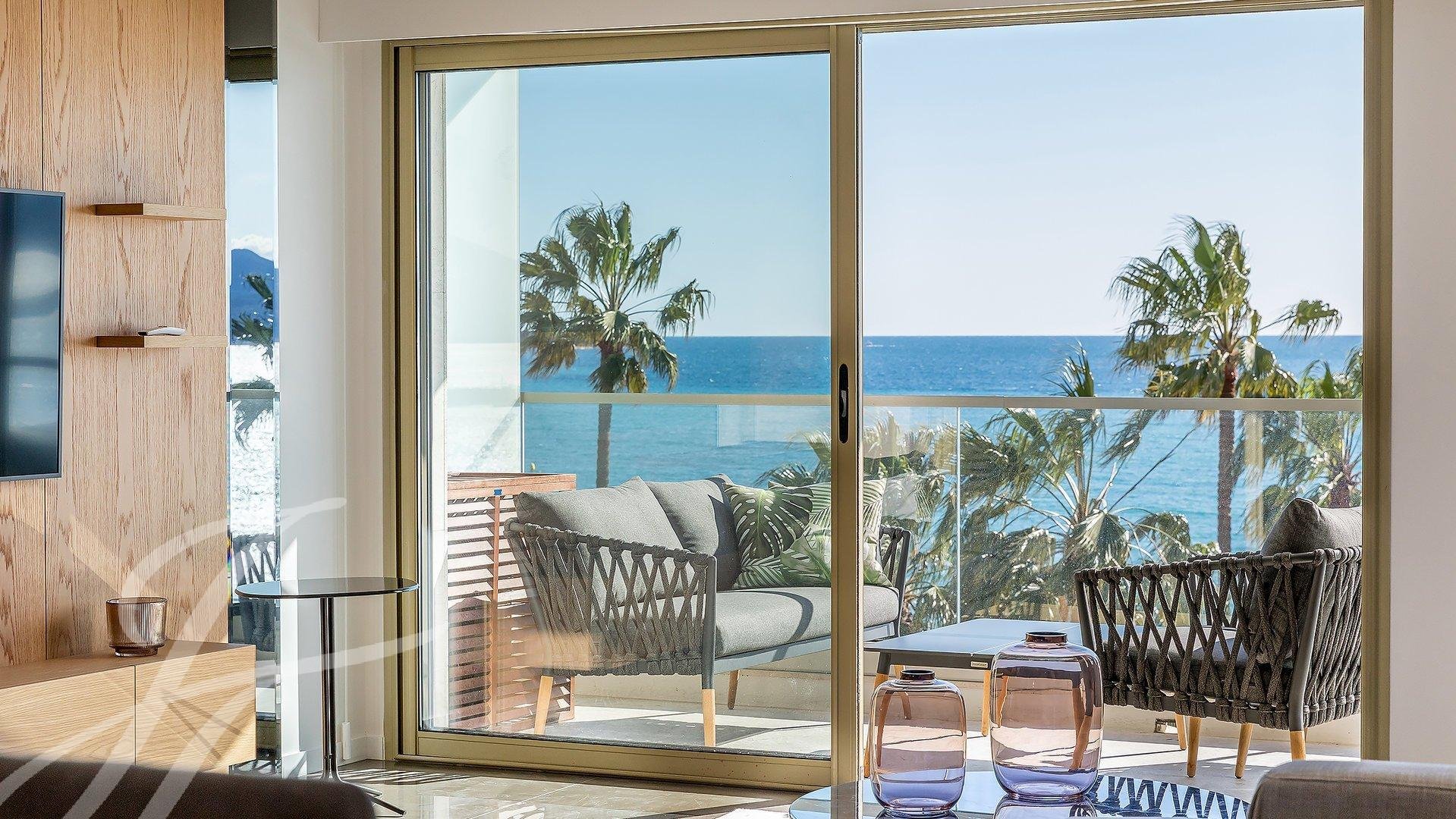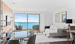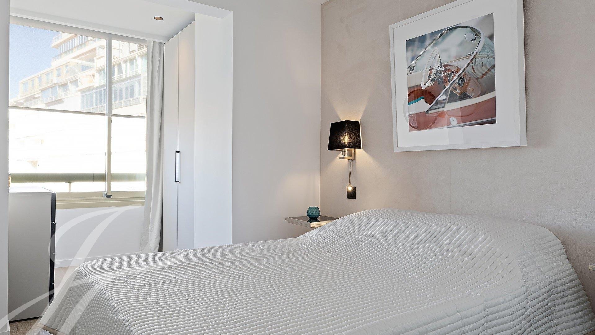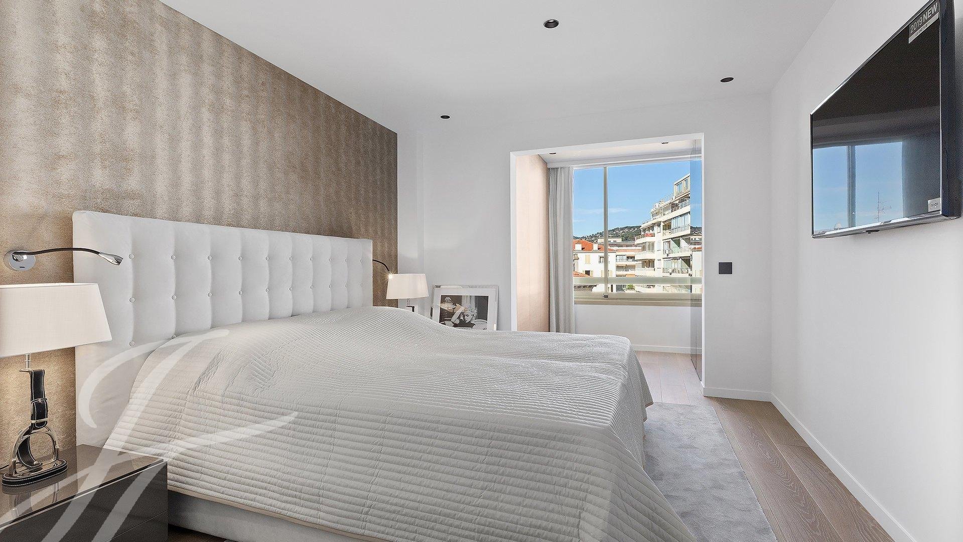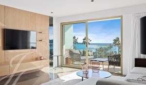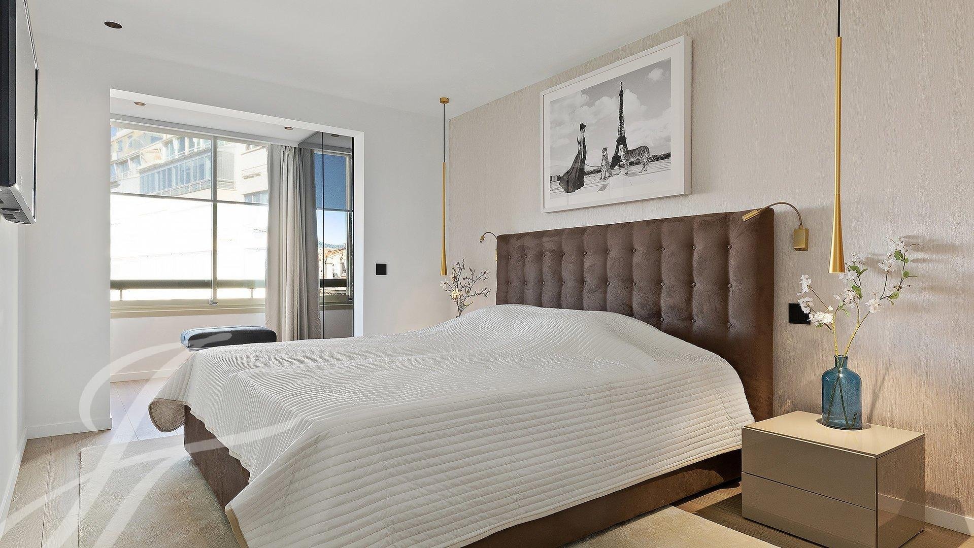 Schöne klimatisierte Wohnung im Herzen von La Croisette im 5. Stock einer Luxusresidenz mit einem herrlichen Panoramablick auf die Bucht von Cannes, die Strände, den Palais des Festivals und das Esterel-Gebirge.