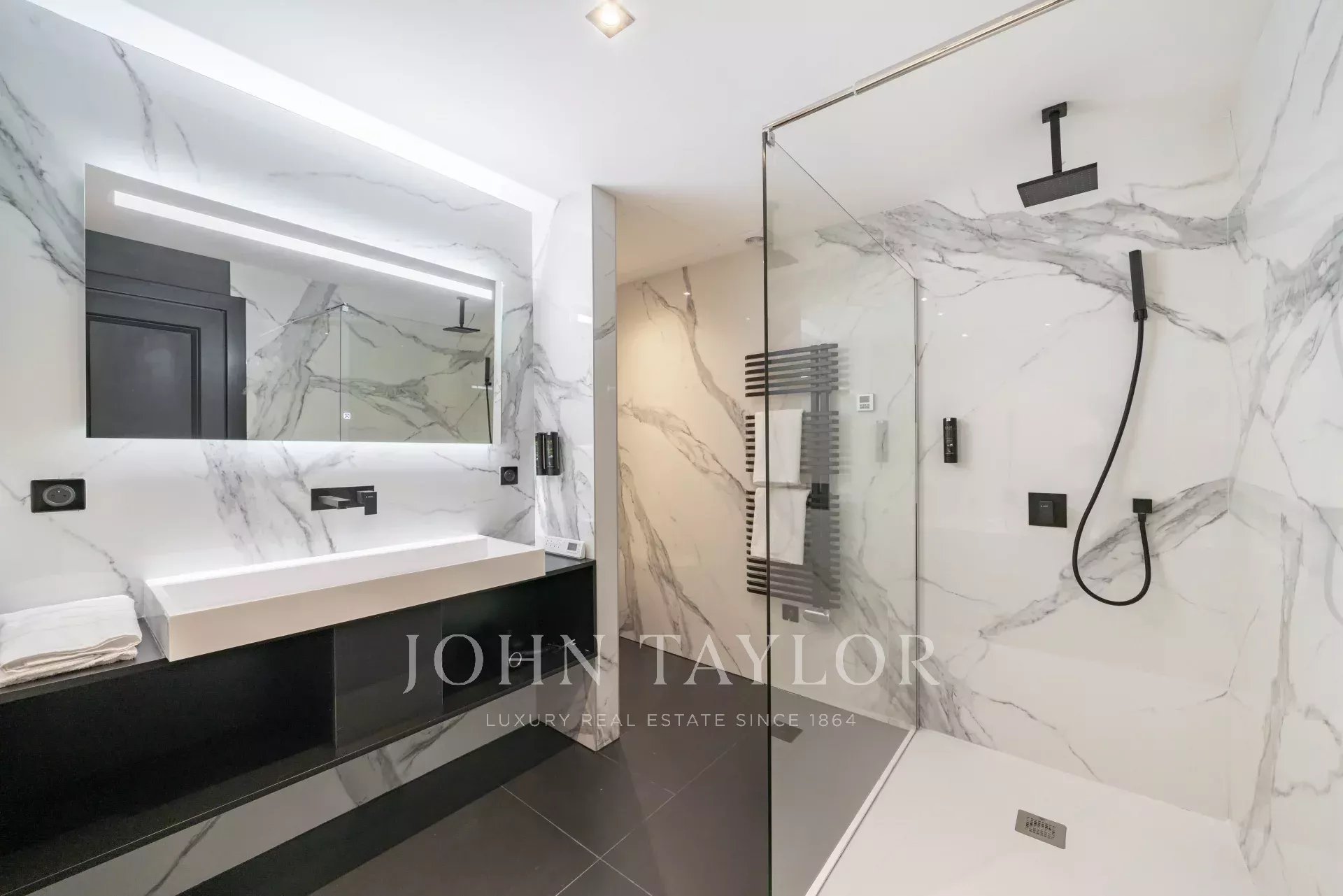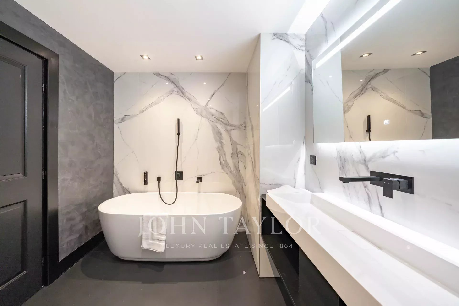 Schlafzimmer 1 (Bett 180 cm oder zwei Einzelbetten), TV, begehbarer Kleiderschrank - Blick auf den Palast und das Meer. En-suite Badezimmer, Badewanne, italienische Dusche, Handtuchtrockner / japanische Toilette.