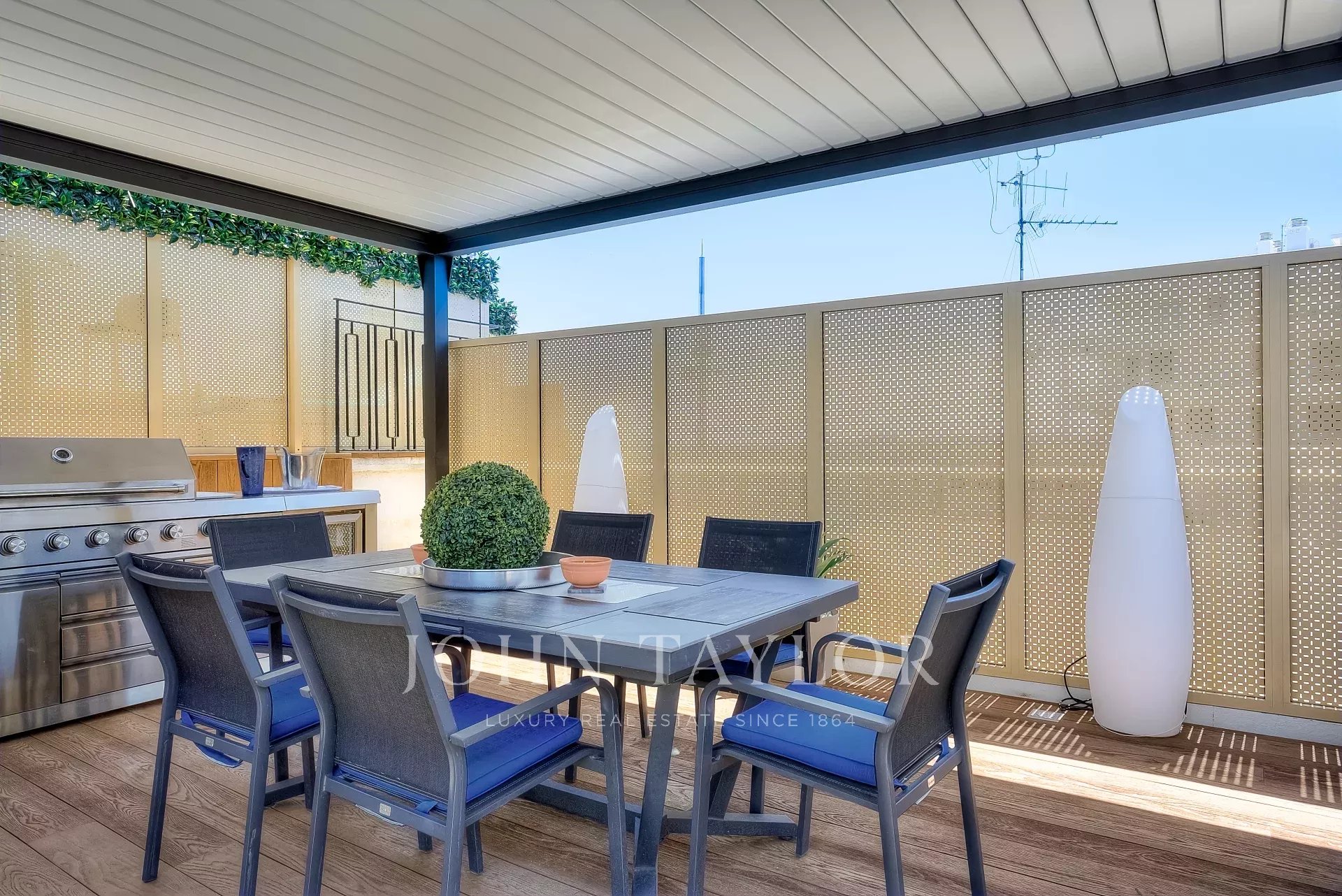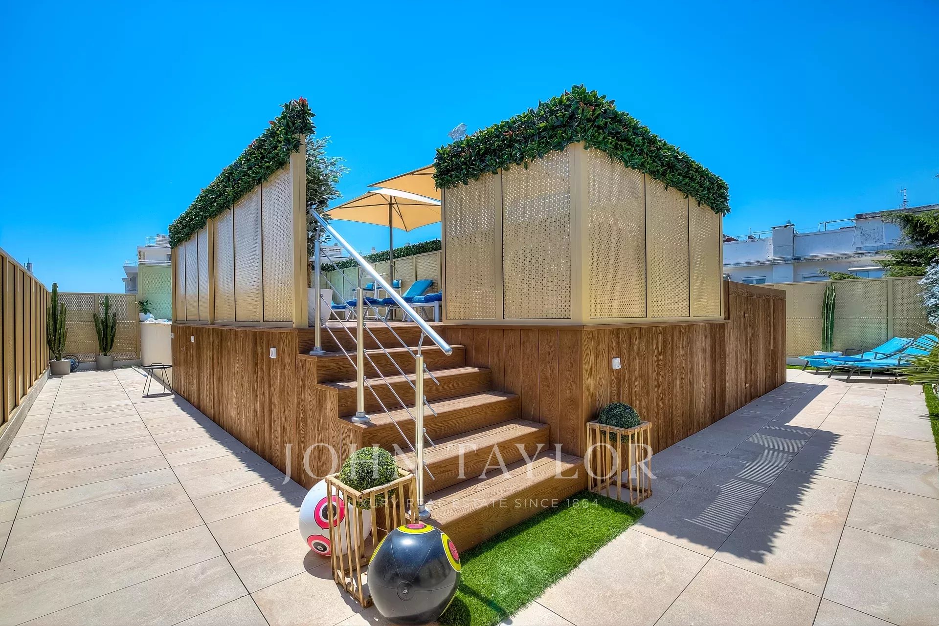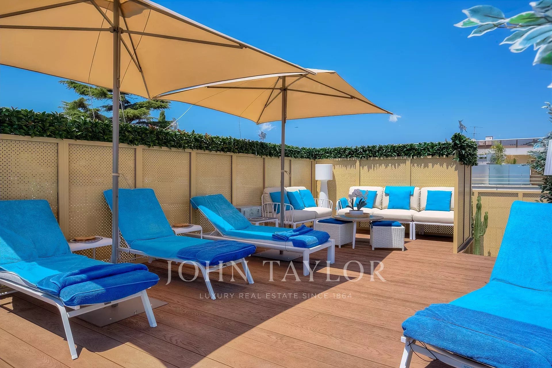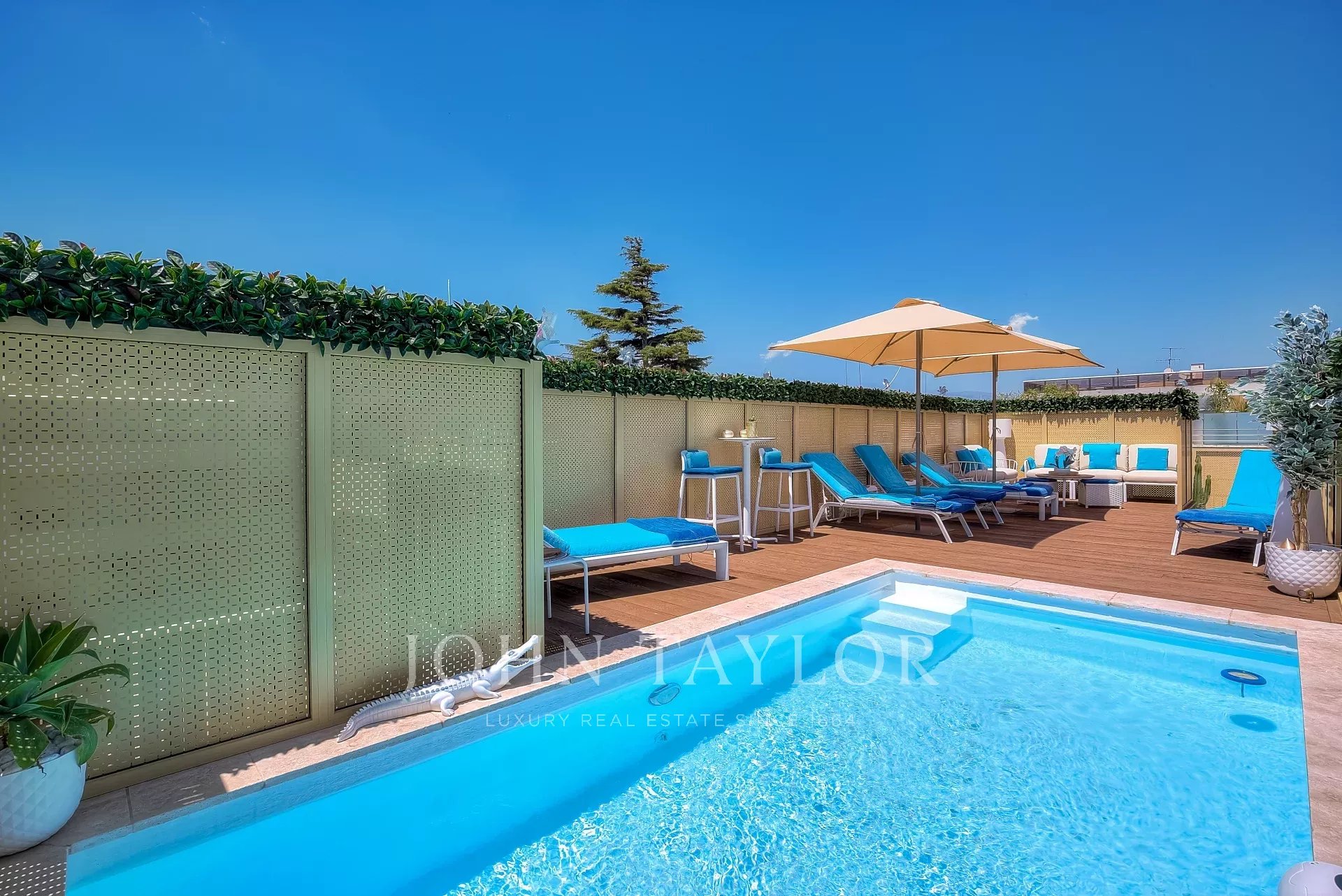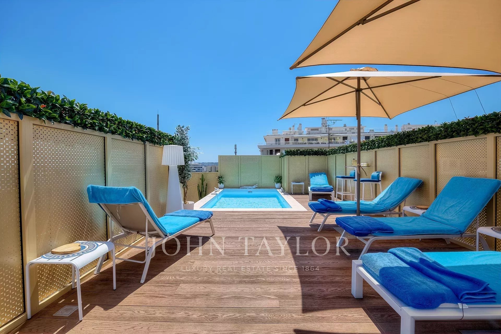 In einer luxuriösen Residenz, 2. Reihe von La Croisette, wunderschöne moderne Wohnung von 100 m2 mit einer Dachterrasse von 176 m2 mit privatem Pool (5,5m x 3m), Liegestühlen, Wohnzimmer, Essbereich und Sommerküche mit BBQ.