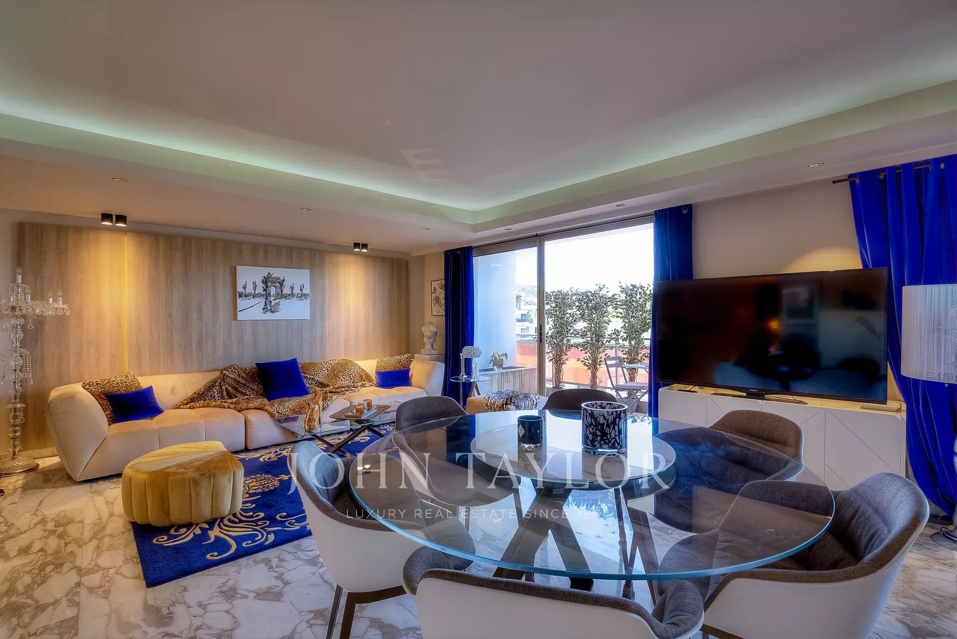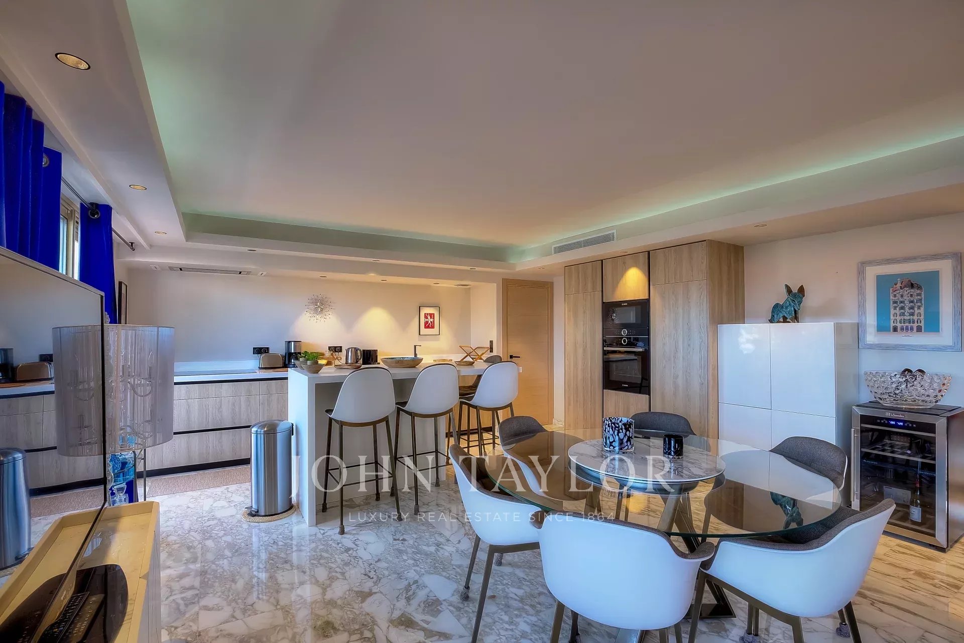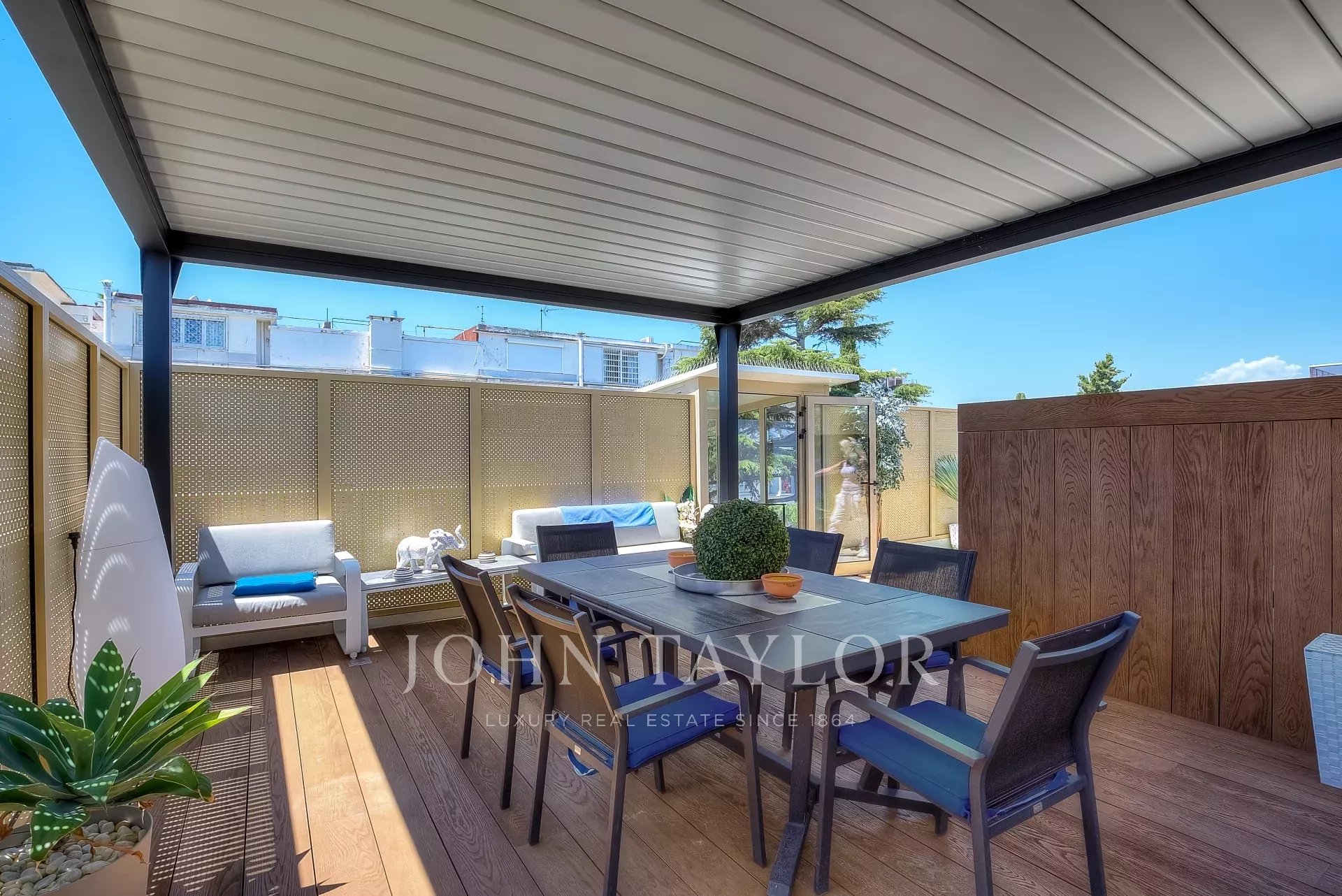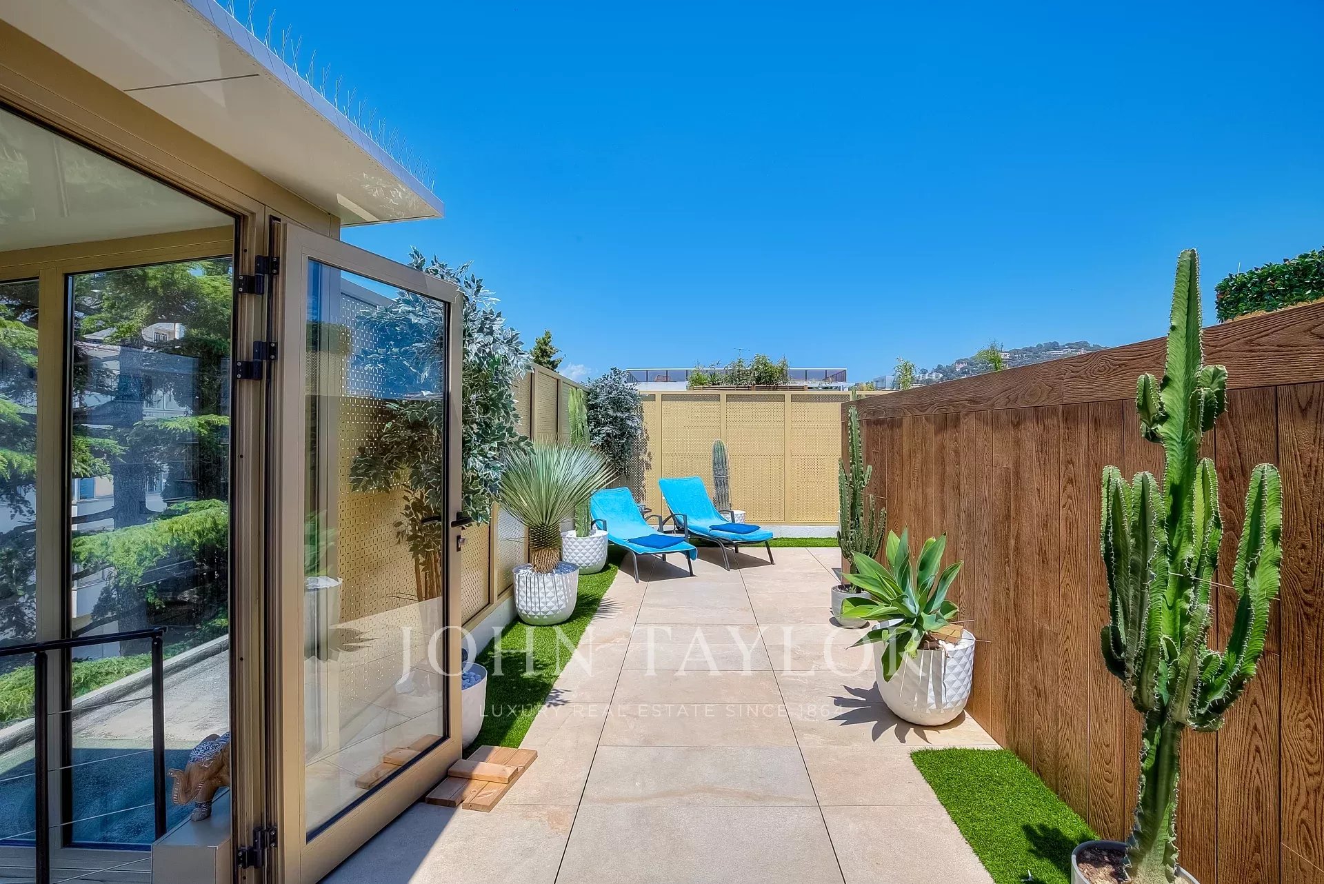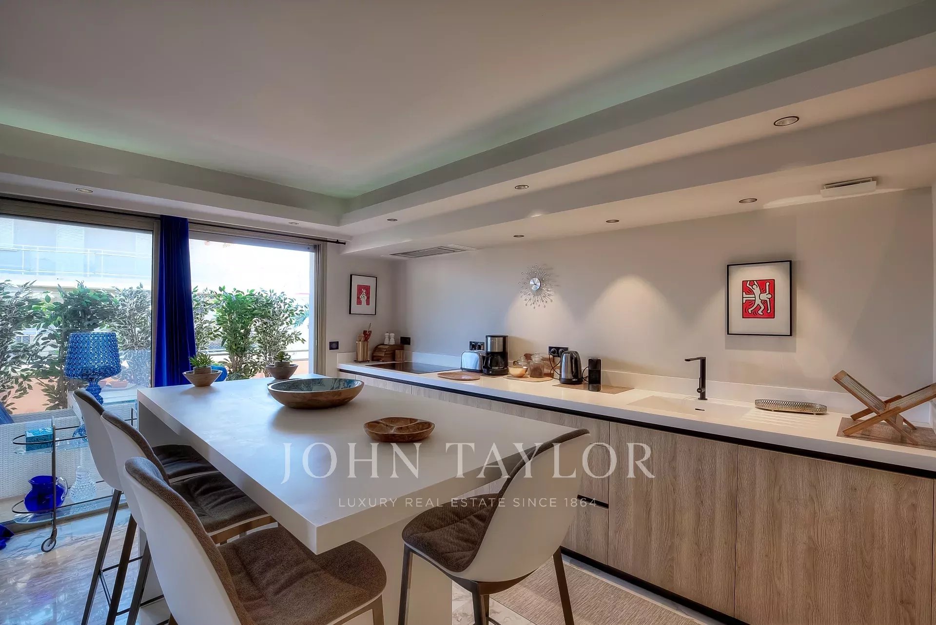 In einer luxuriösen Residenz, 2. Reihe von La Croisette, wunderschöne moderne Wohnung von 100 m2 mit einer Dachterrasse von 176 m2 mit privatem Pool (5,5m x 3m), Liegestühlen, Wohnzimmer, Essbereich und Sommerküche mit BBQ.