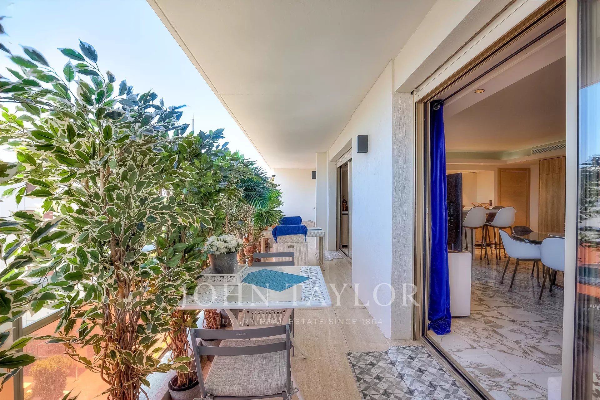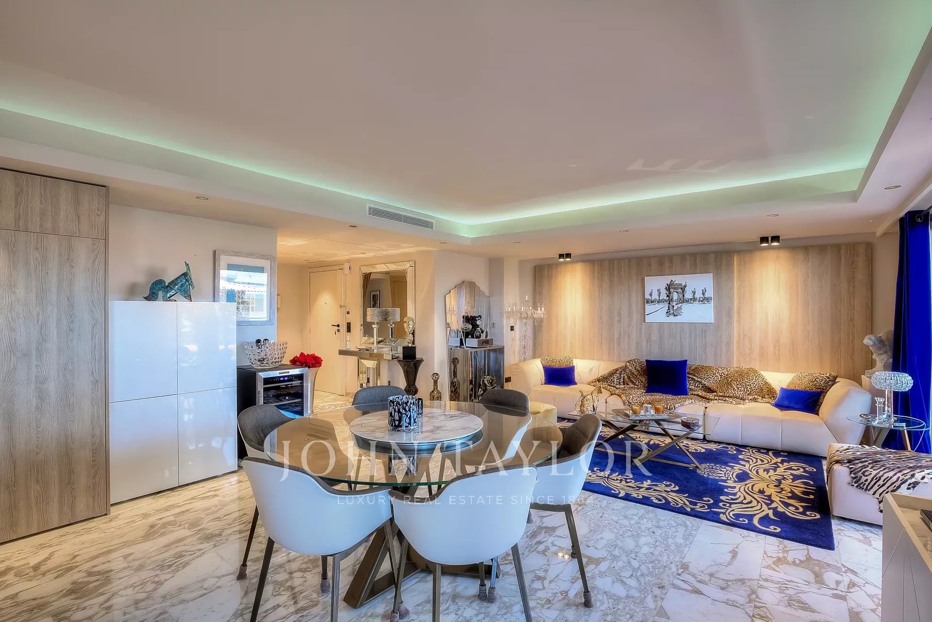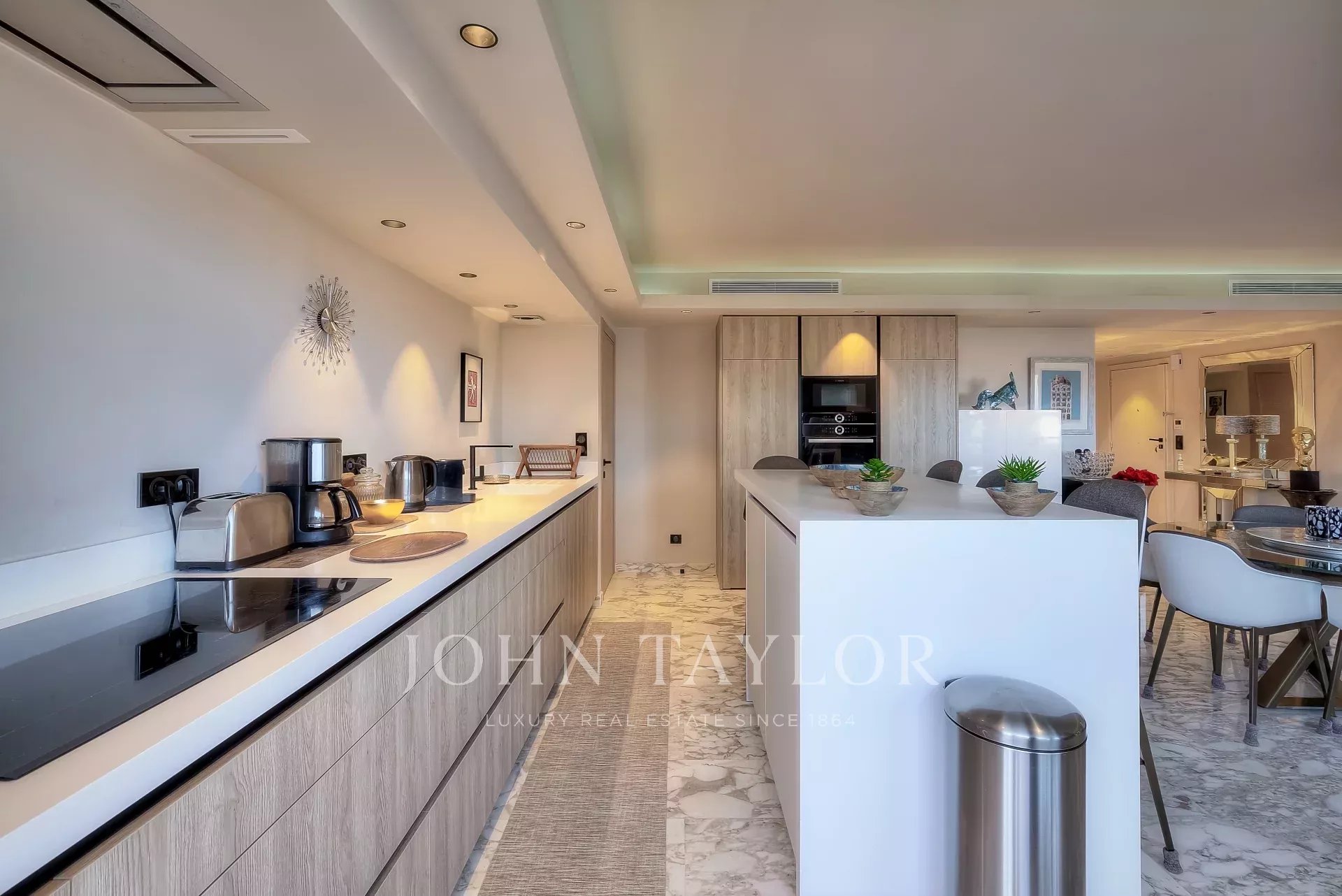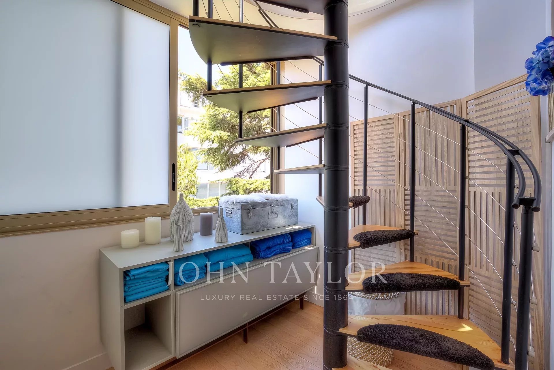 In einer luxuriösen Residenz, 2. Reihe von La Croisette, wunderschöne moderne Wohnung von 100 m2 mit einer Dachterrasse von 176 m2 mit privatem Pool (5,5m x 3m), Liegestühlen, Wohnzimmer, Essbereich und Sommerküche mit BBQ.