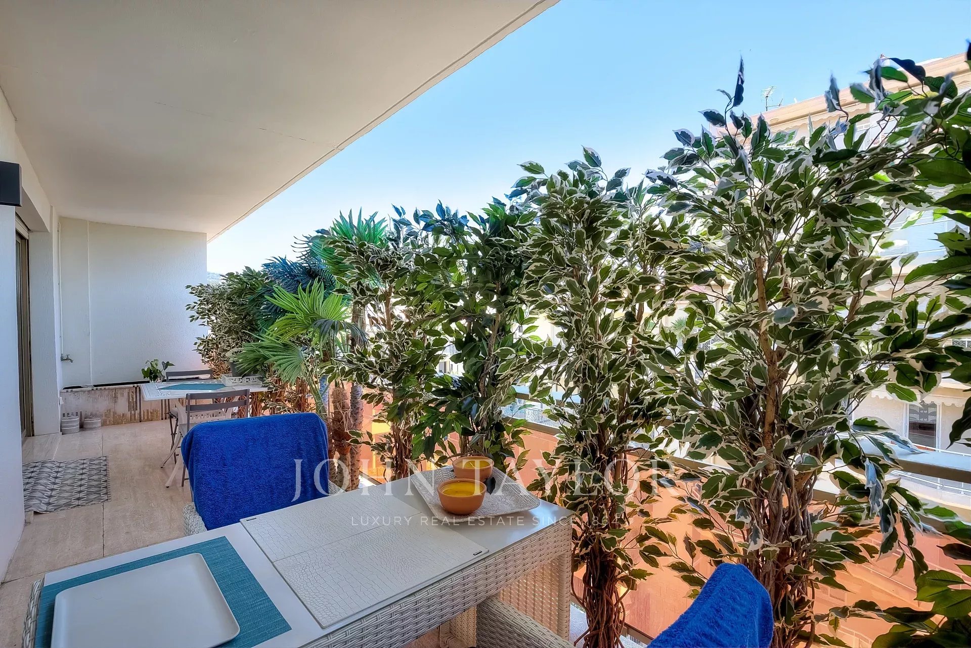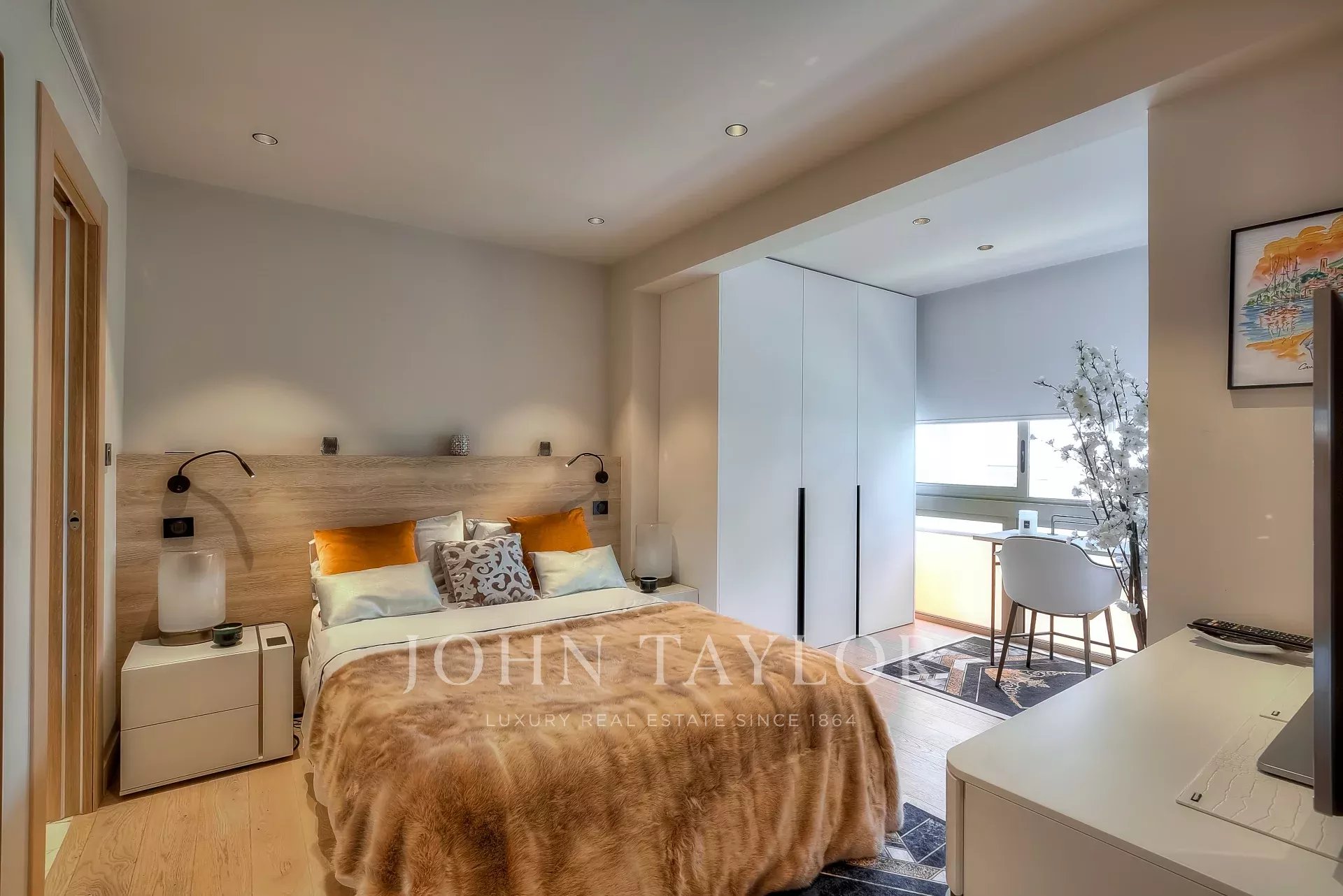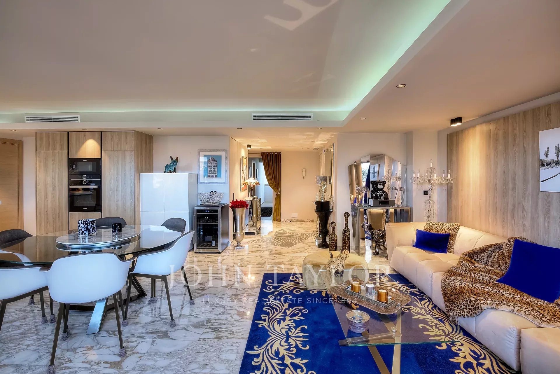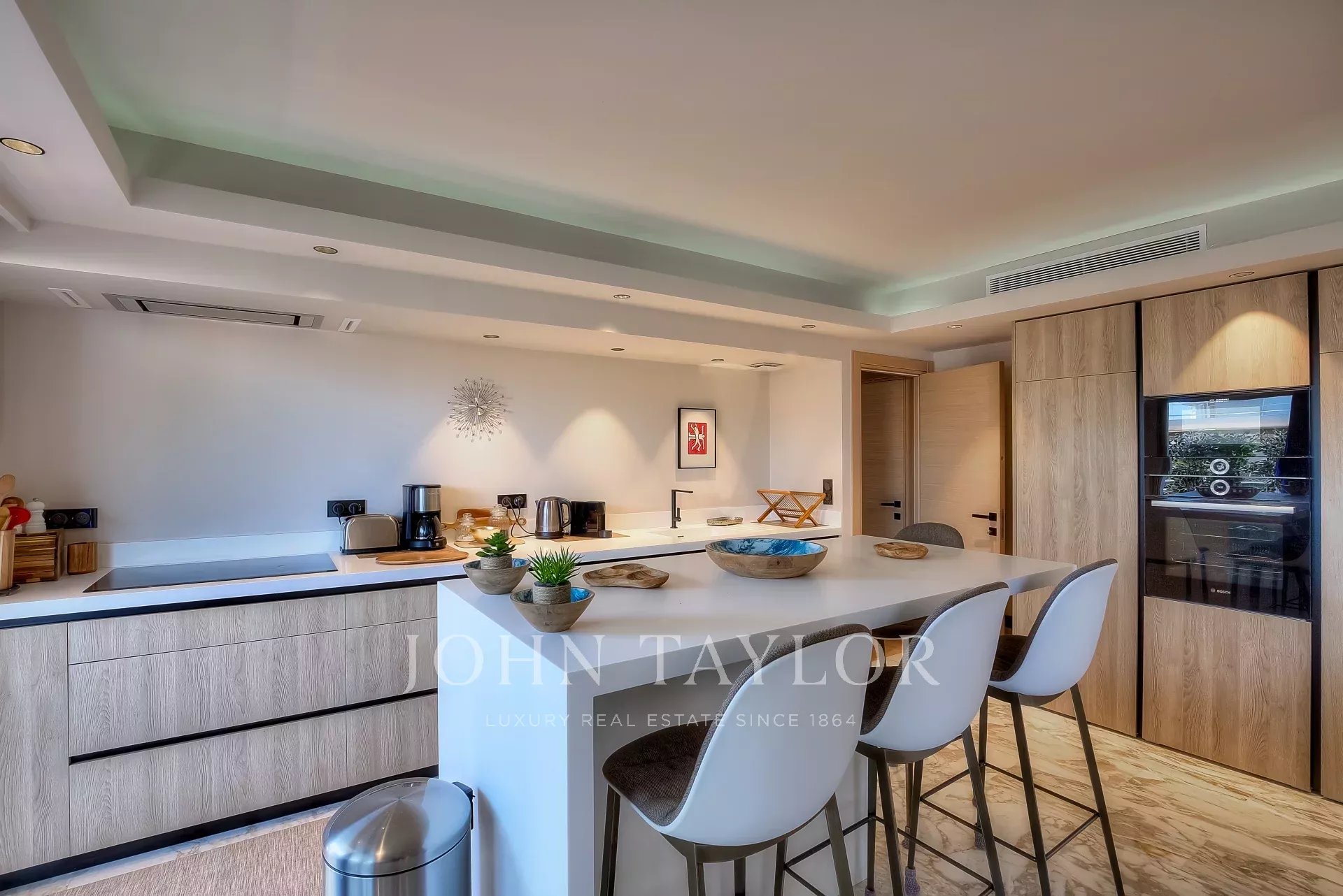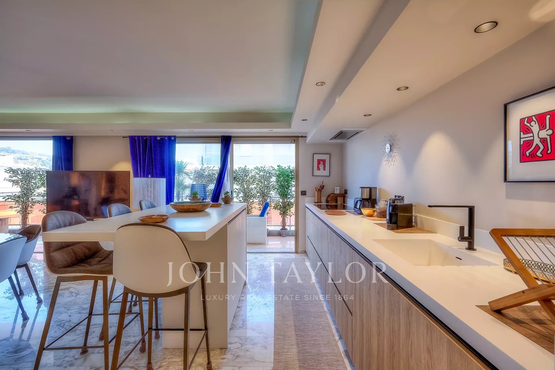 In einer luxuriösen Residenz, 2. Reihe von La Croisette, wunderschöne moderne Wohnung von 100 m2 mit einer Dachterrasse von 176 m2 mit privatem Pool (5,5m x 3m), Liegestühlen, Wohnzimmer, Essbereich und Sommerküche mit BBQ.