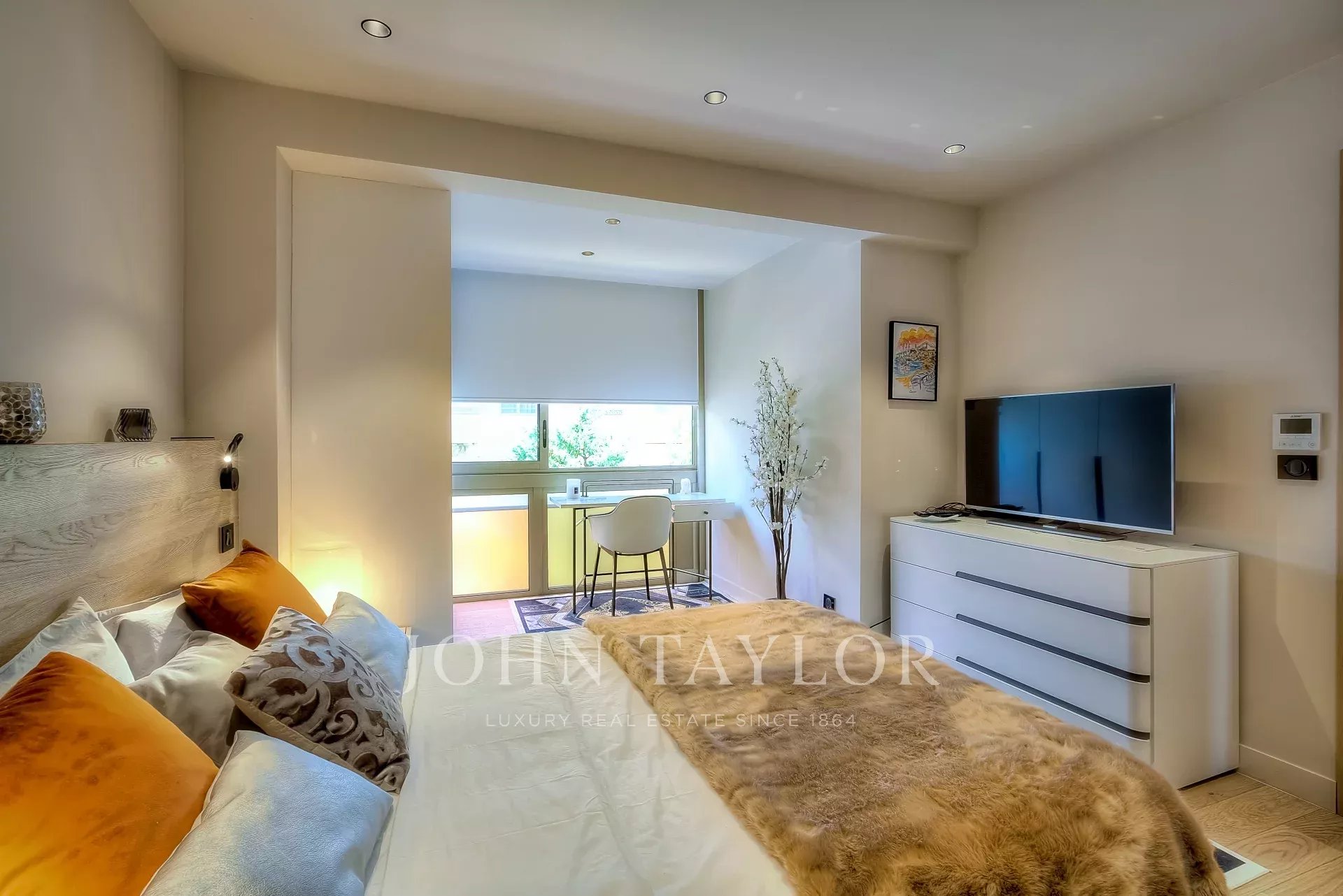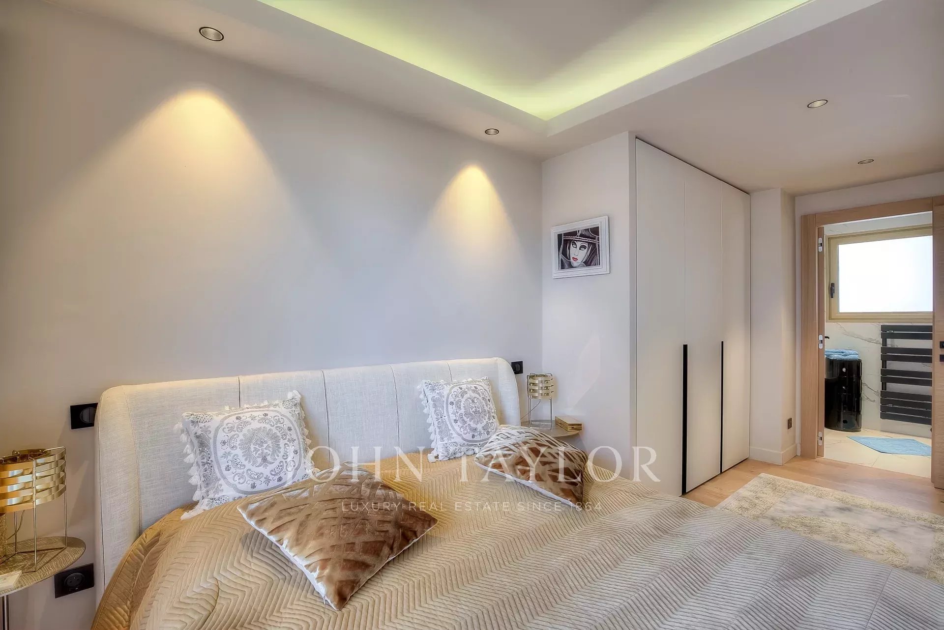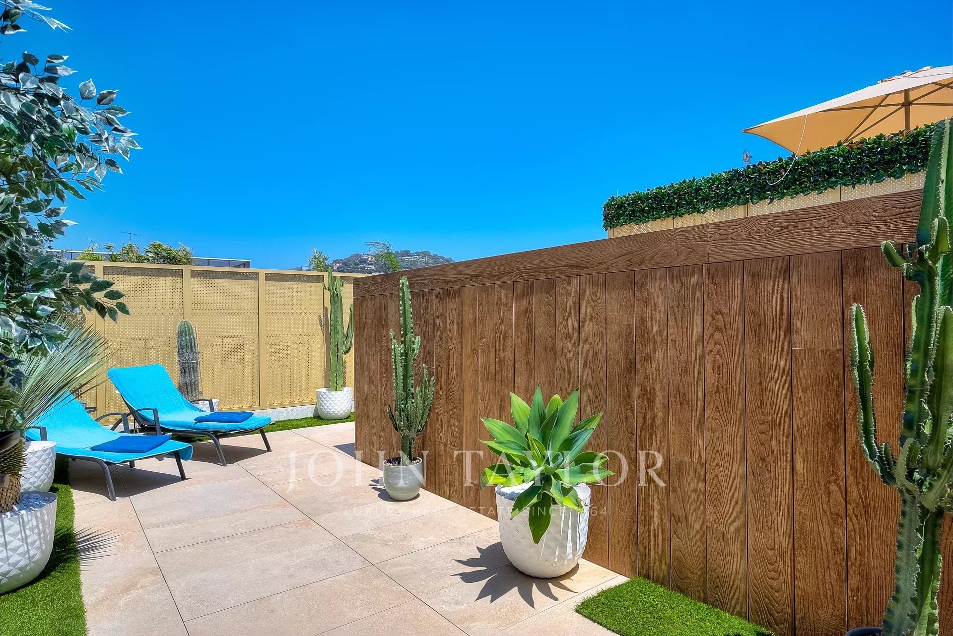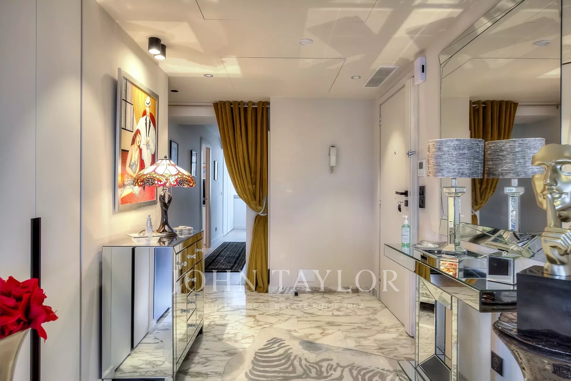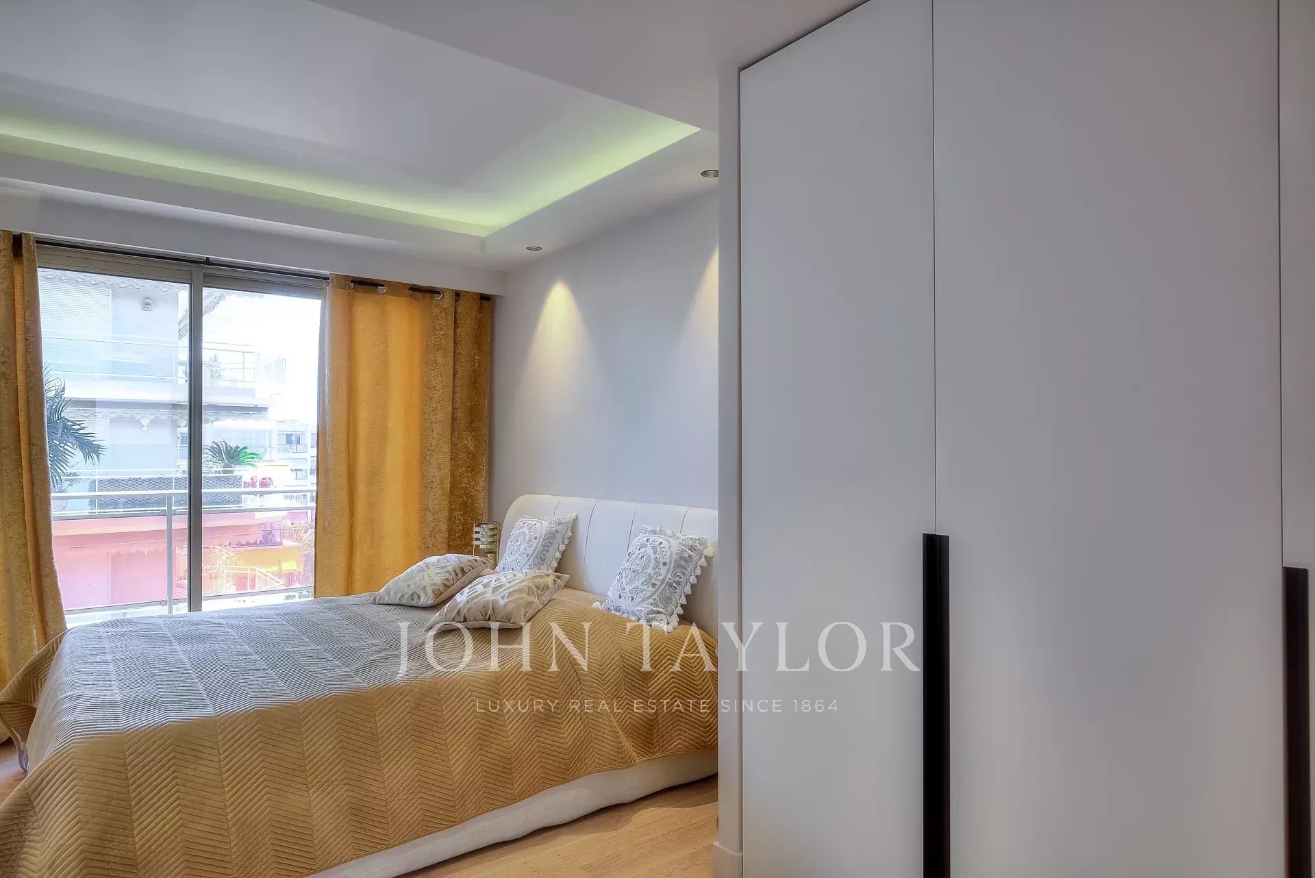 In einer luxuriösen Residenz, 2. Reihe von La Croisette, wunderschöne moderne Wohnung von 100 m2 mit einer Dachterrasse von 176 m2 mit privatem Pool (5,5m x 3m), Liegestühlen, Wohnzimmer, Essbereich und Sommerküche mit BBQ.