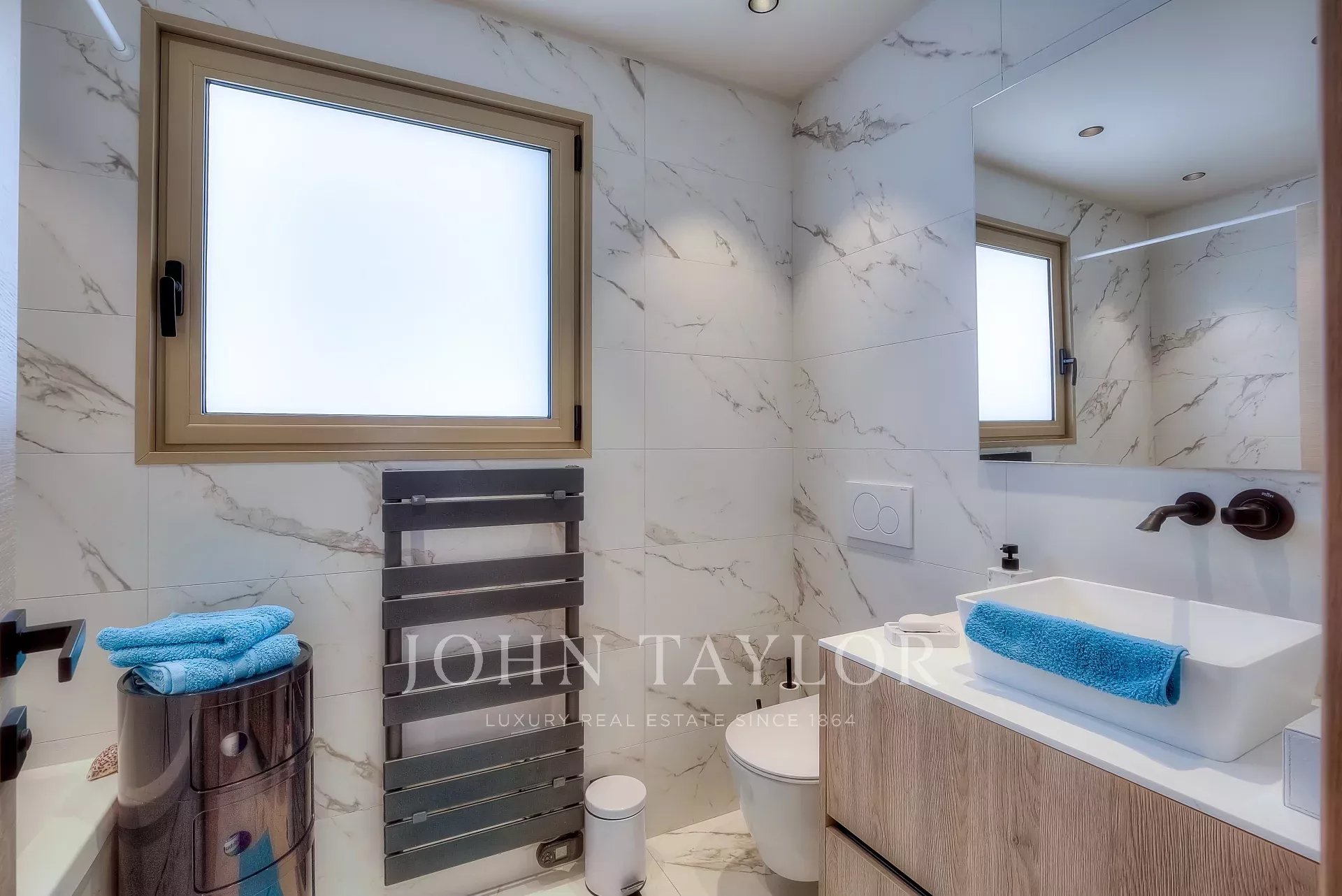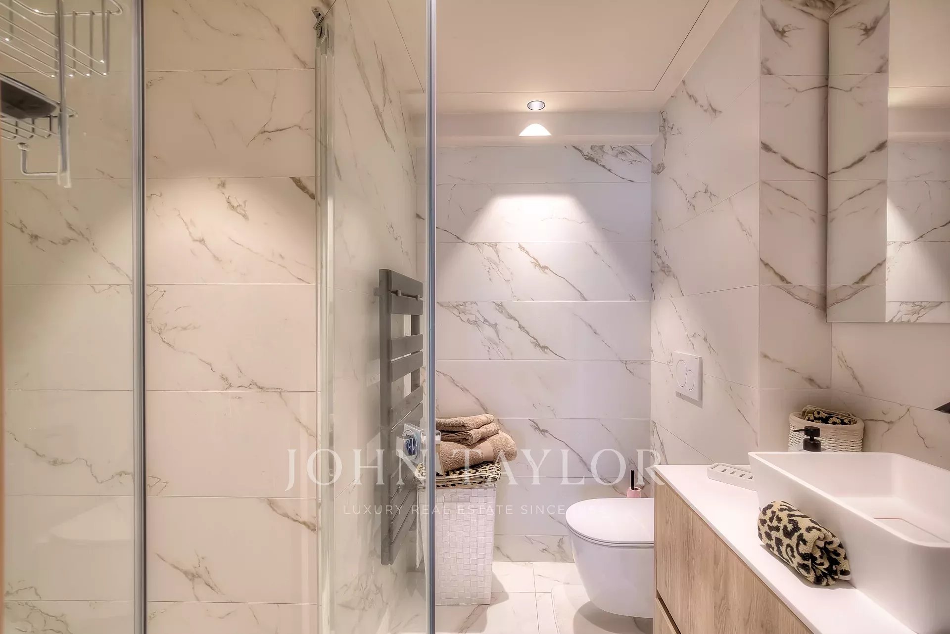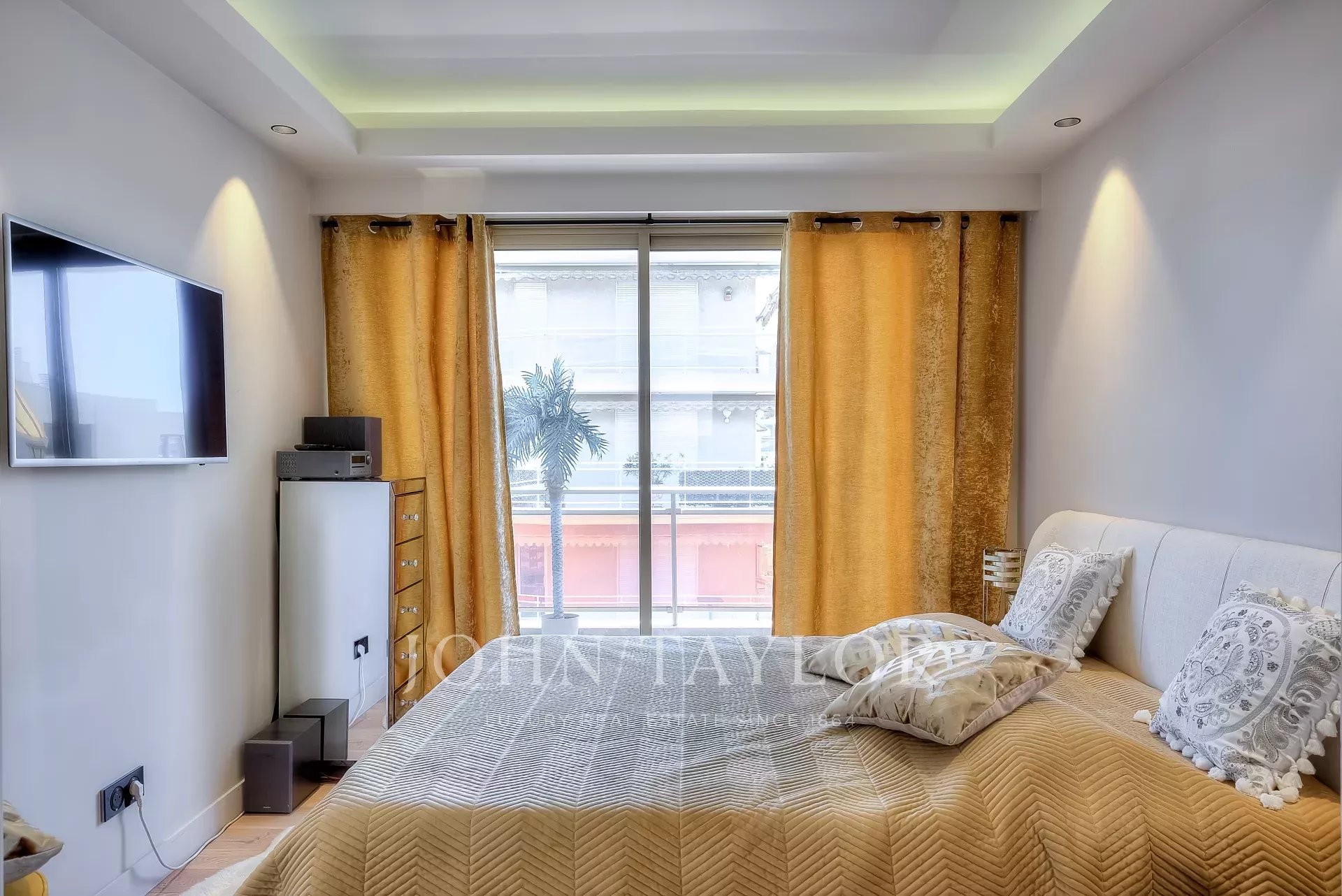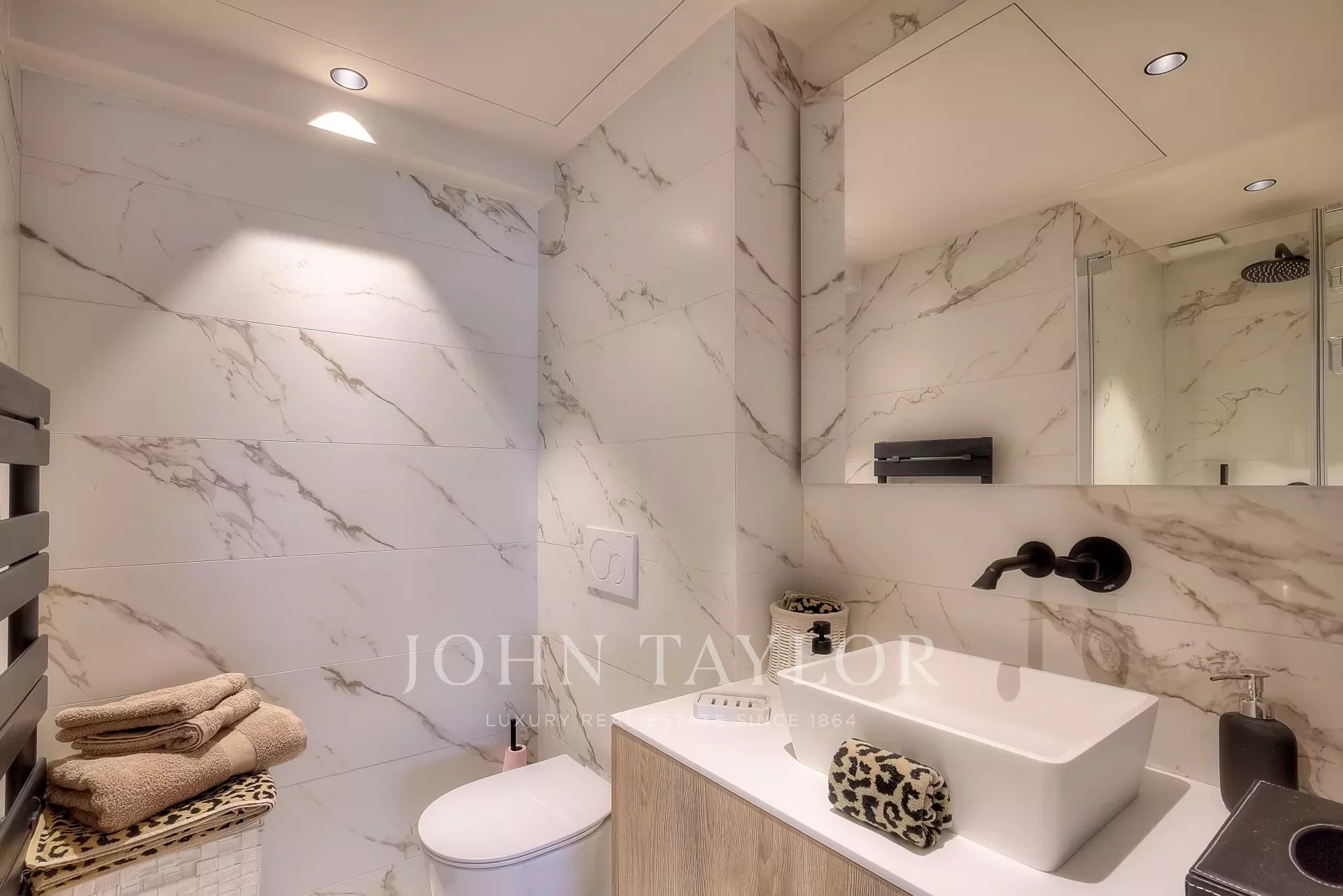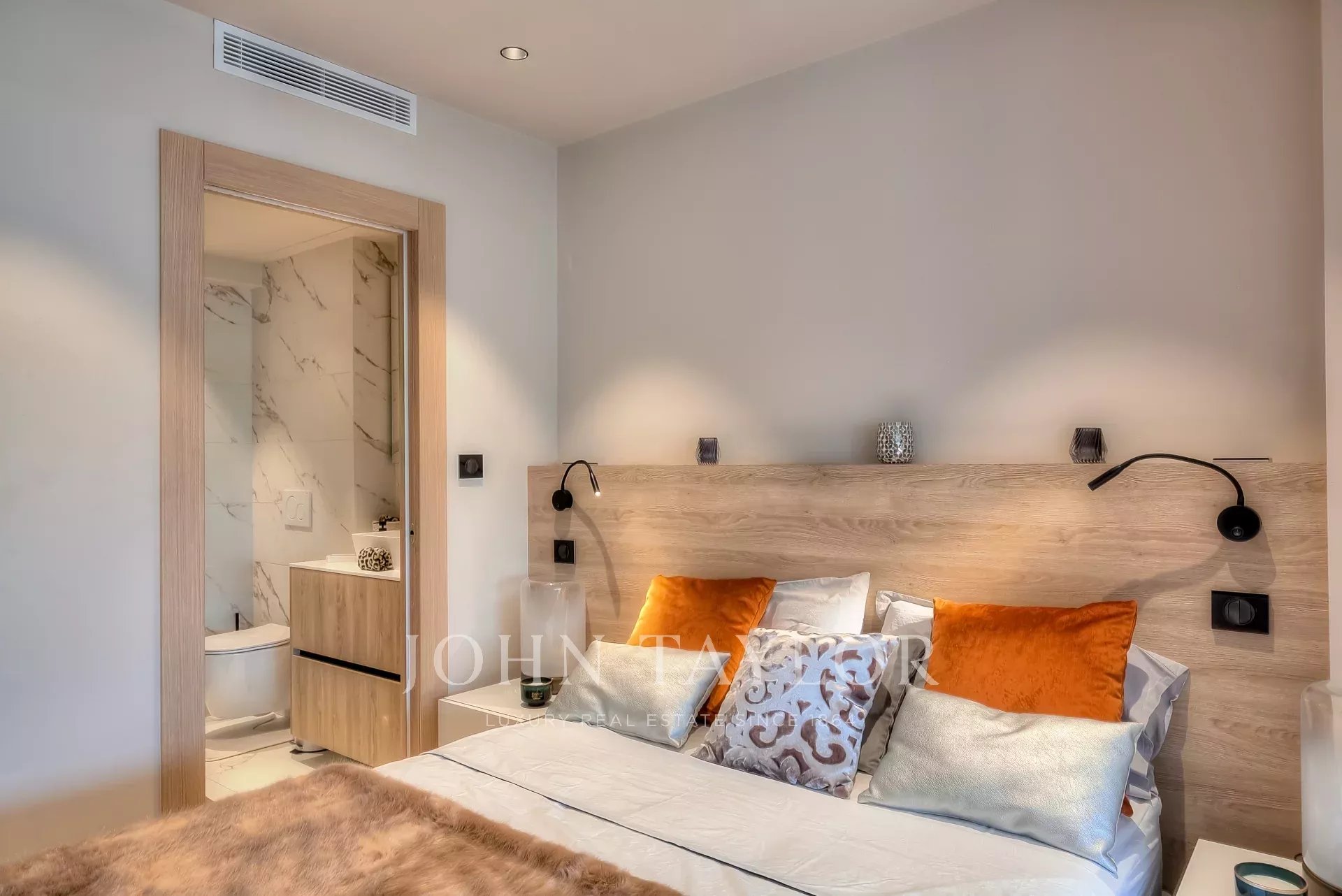 In einer luxuriösen Residenz, 2. Reihe von La Croisette, wunderschöne moderne Wohnung von 100 m2 mit einer Dachterrasse von 176 m2 mit privatem Pool (5,5m x 3m), Liegestühlen, Wohnzimmer, Essbereich und Sommerküche mit BBQ.