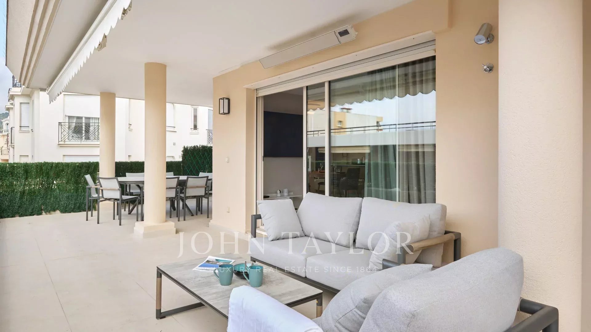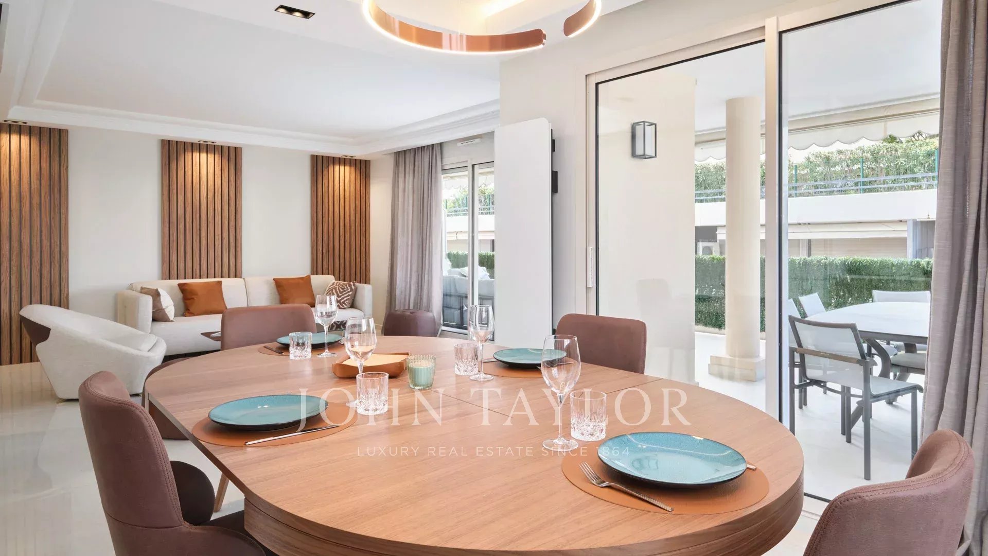 Wohn-/Esszimmer/amerikanische Küche das Ganze öffnet sich auf die ca. 40m² große Terrasse, die mit Sitzgruppe + Liegestuhl ausgestattet ist; Fogger und Außenheizung.