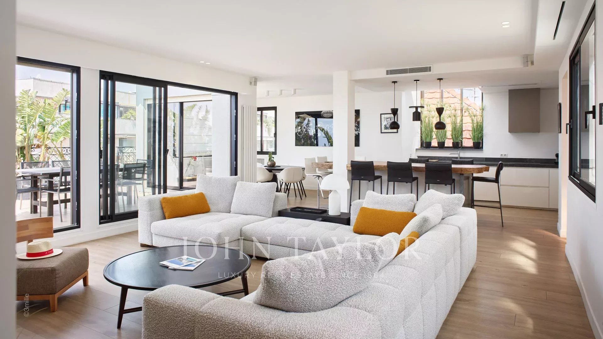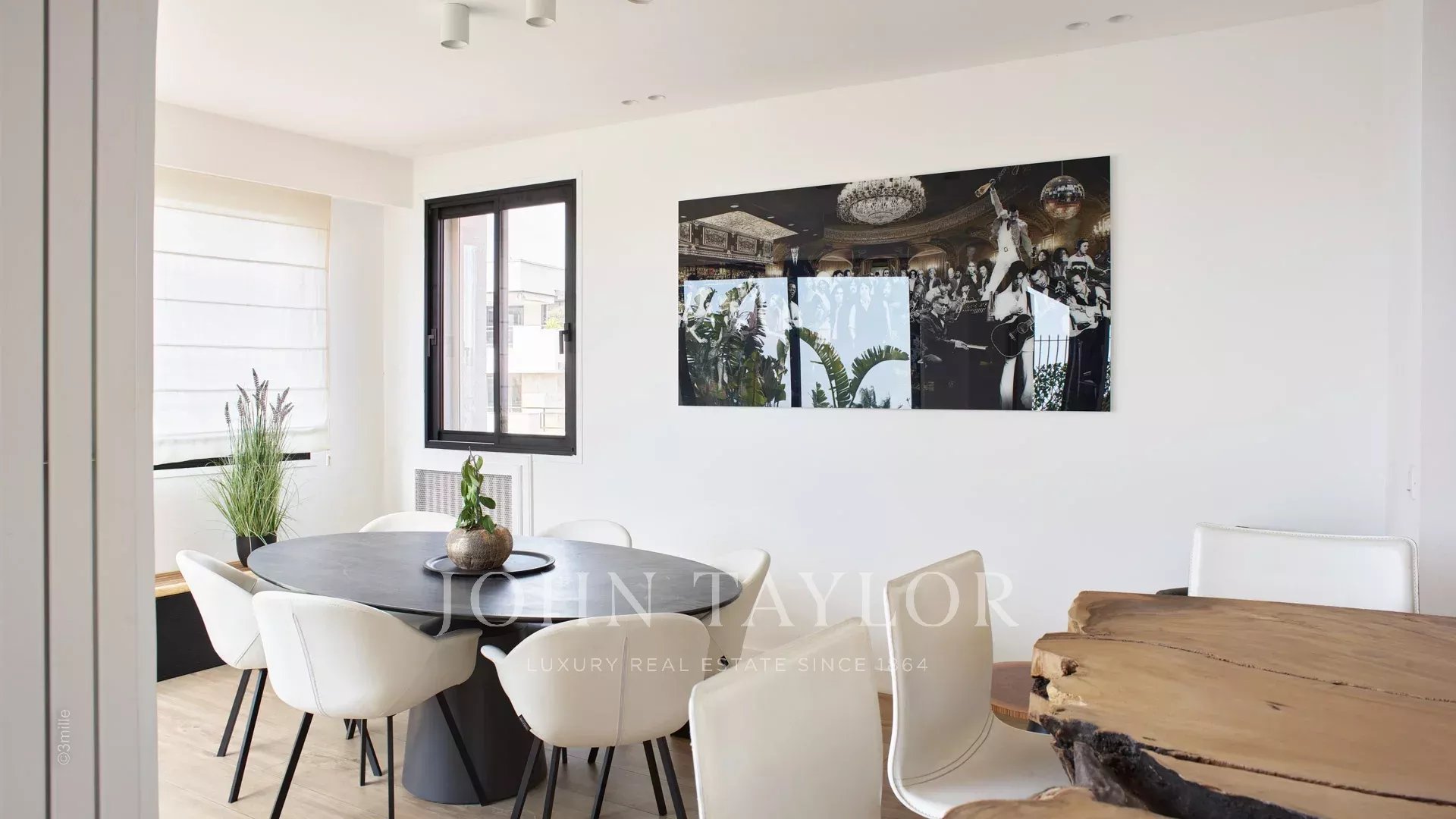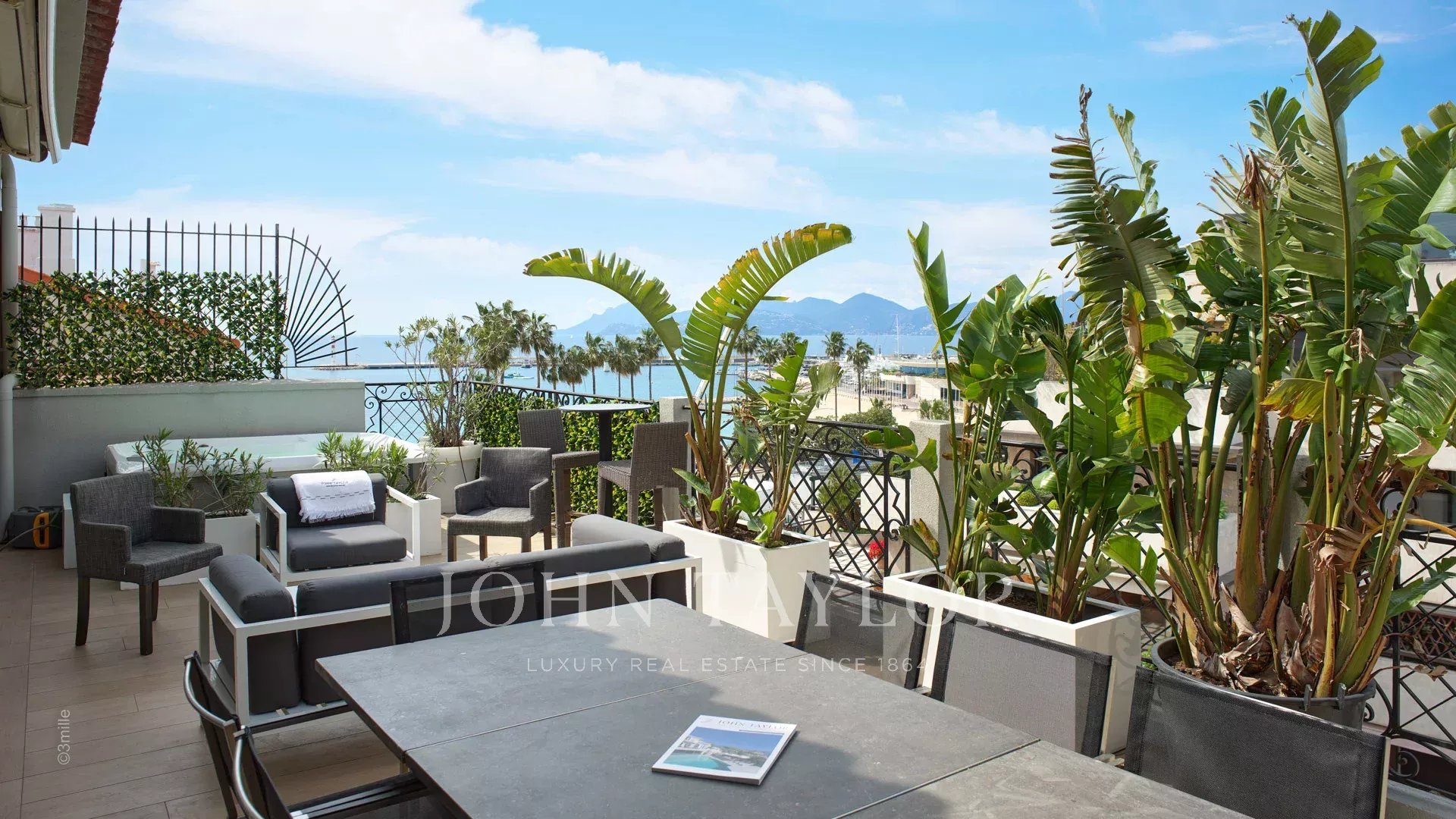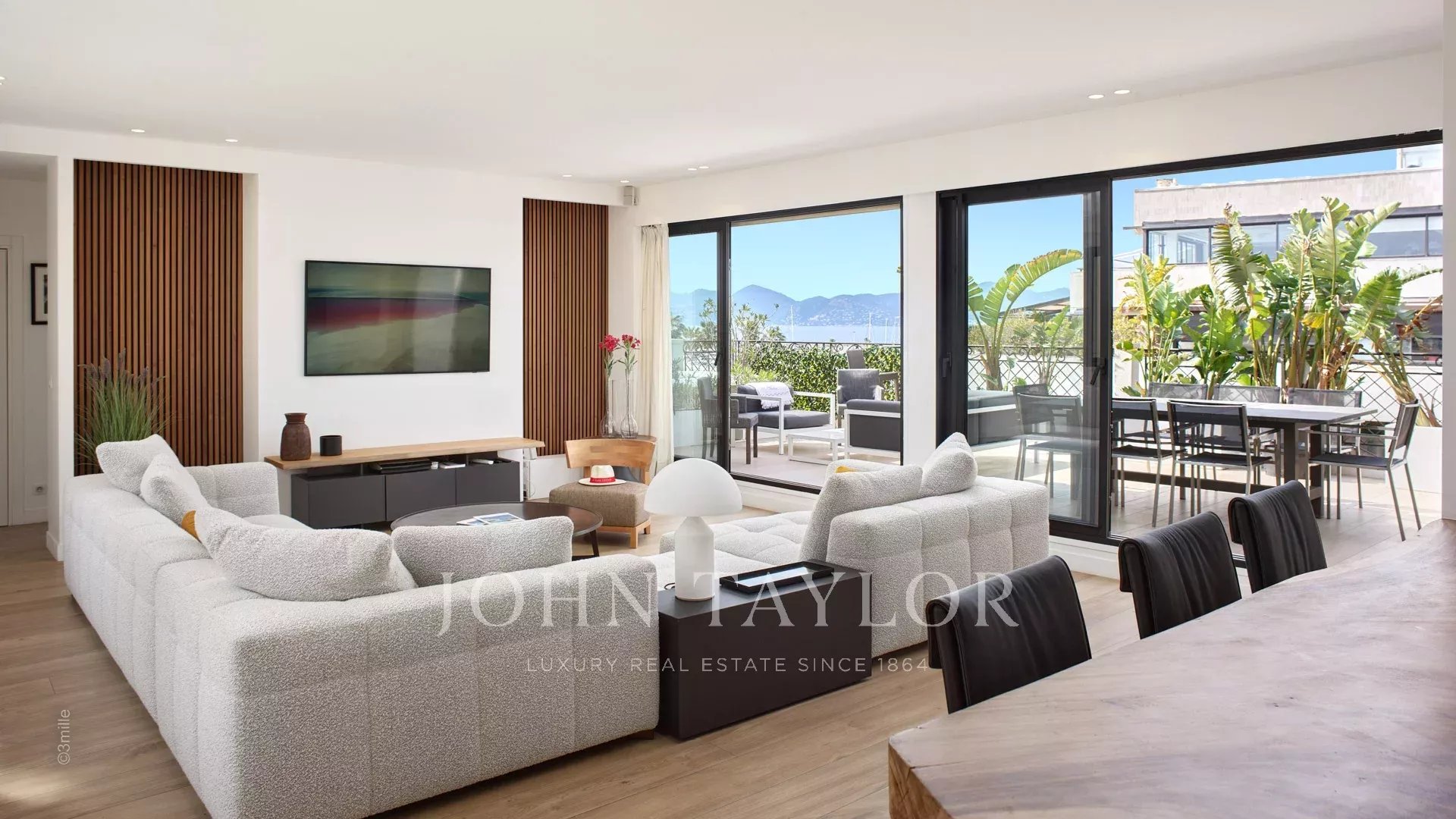 Ruhig und ideal in der Nähe des Palais des Festivals gelegen, wunderschöne zeitgenössische Wohnung von ca. 130 m2 Wohnfläche, vollständig klimatisiert und mit hochwertigen Leistungen renoviert. Sie bietet zwei große Terrassen und einen schönen Meerblick.