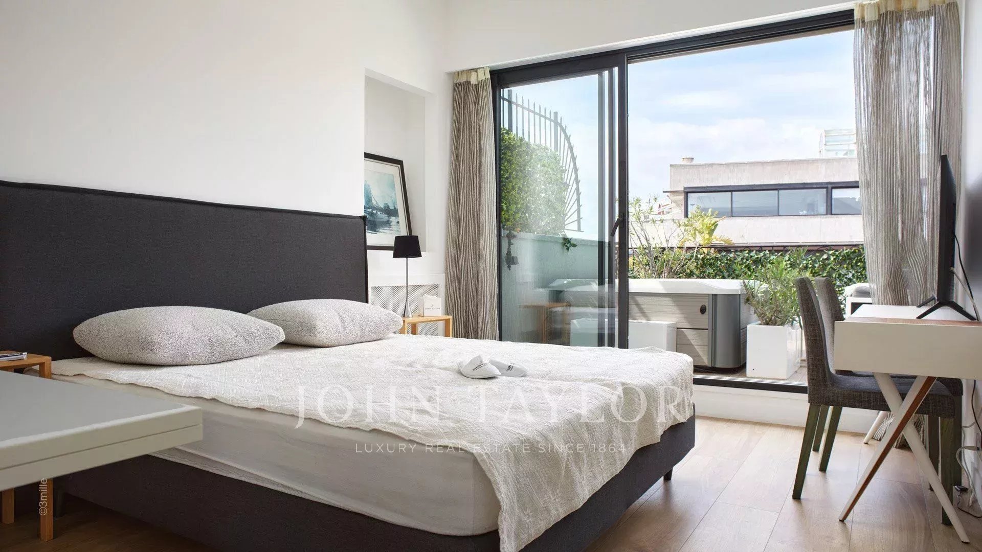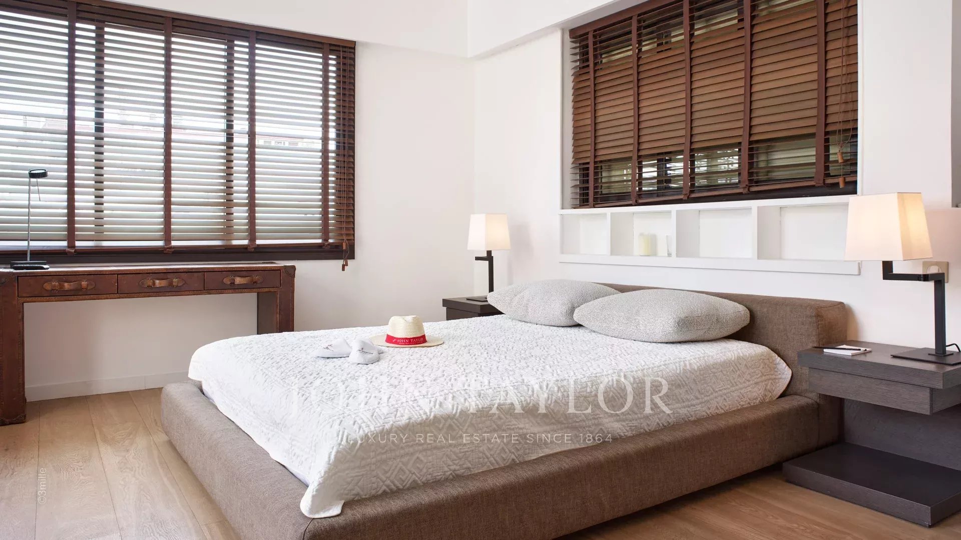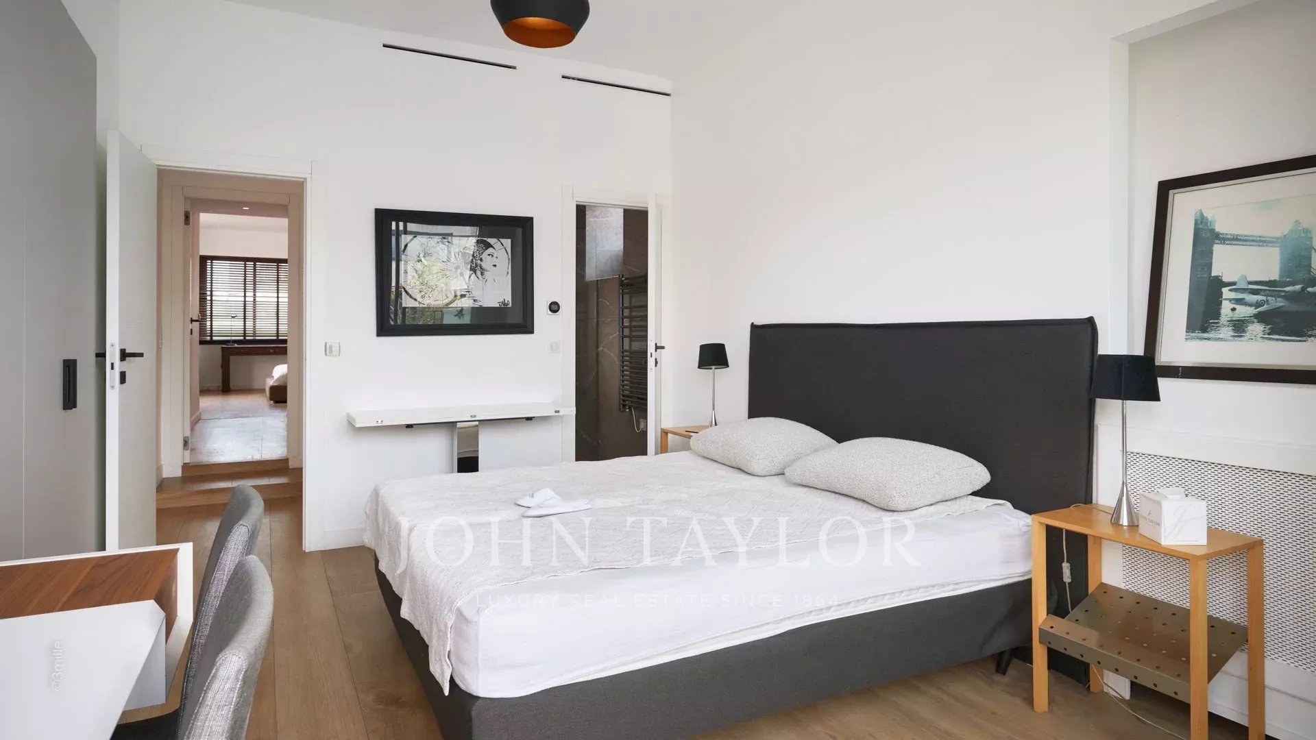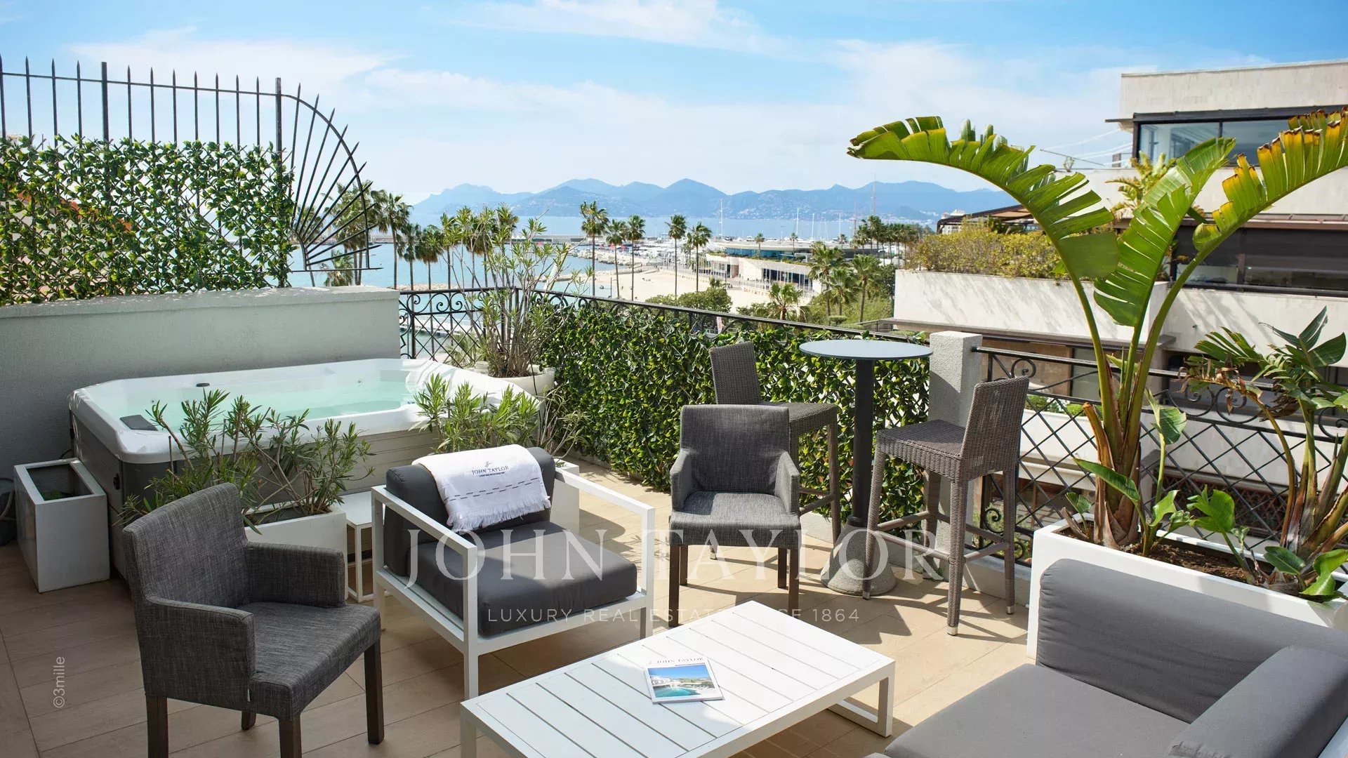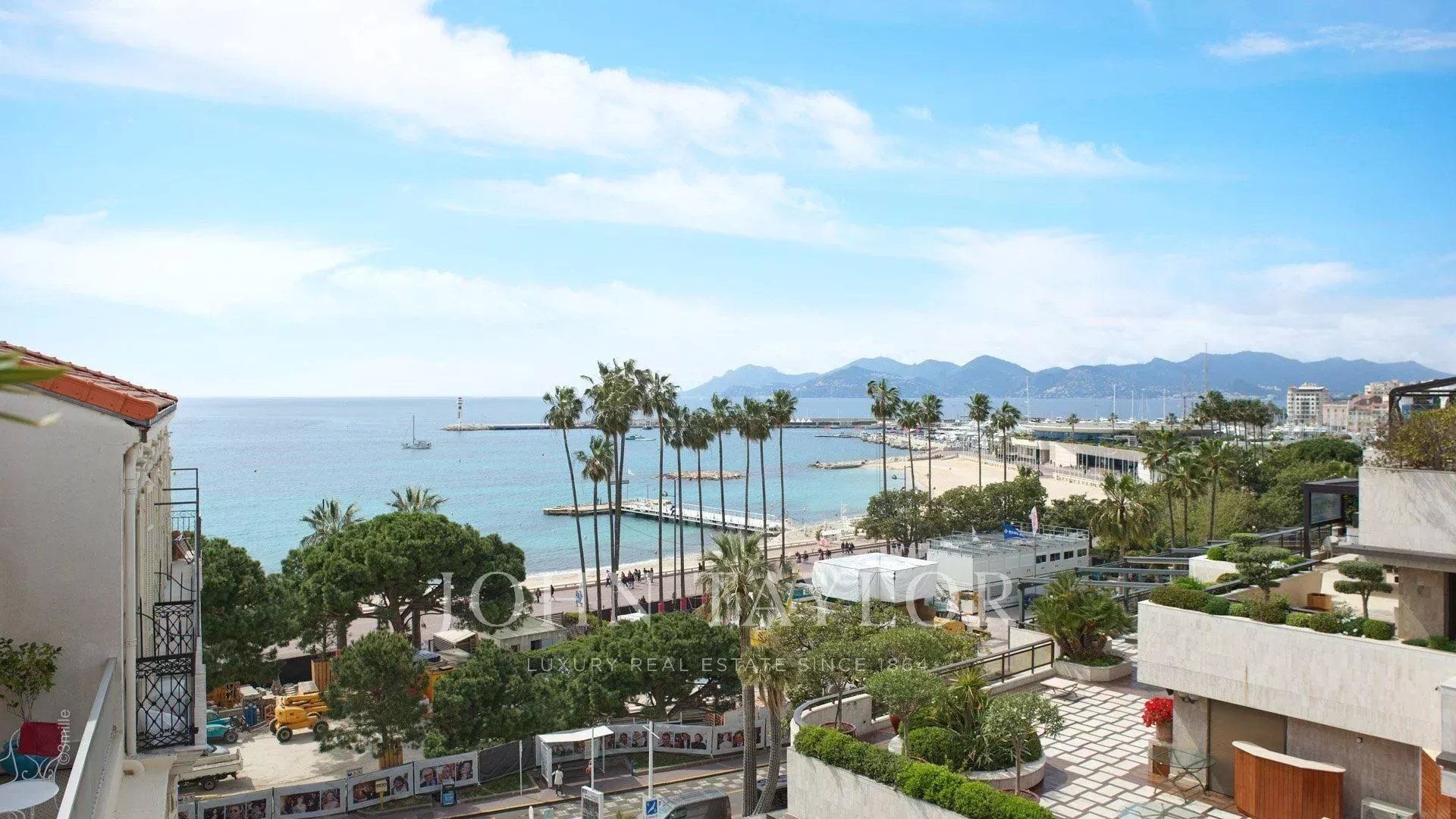 Ruhig und ideal in der Nähe des Palais des Festivals gelegen, wunderschöne zeitgenössische Wohnung von ca. 130 m2 Wohnfläche, vollständig klimatisiert und mit hochwertigen Leistungen renoviert. Sie bietet zwei große Terrassen und einen schönen Meerblick.