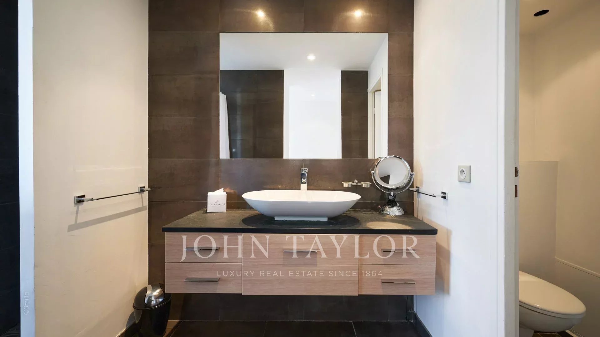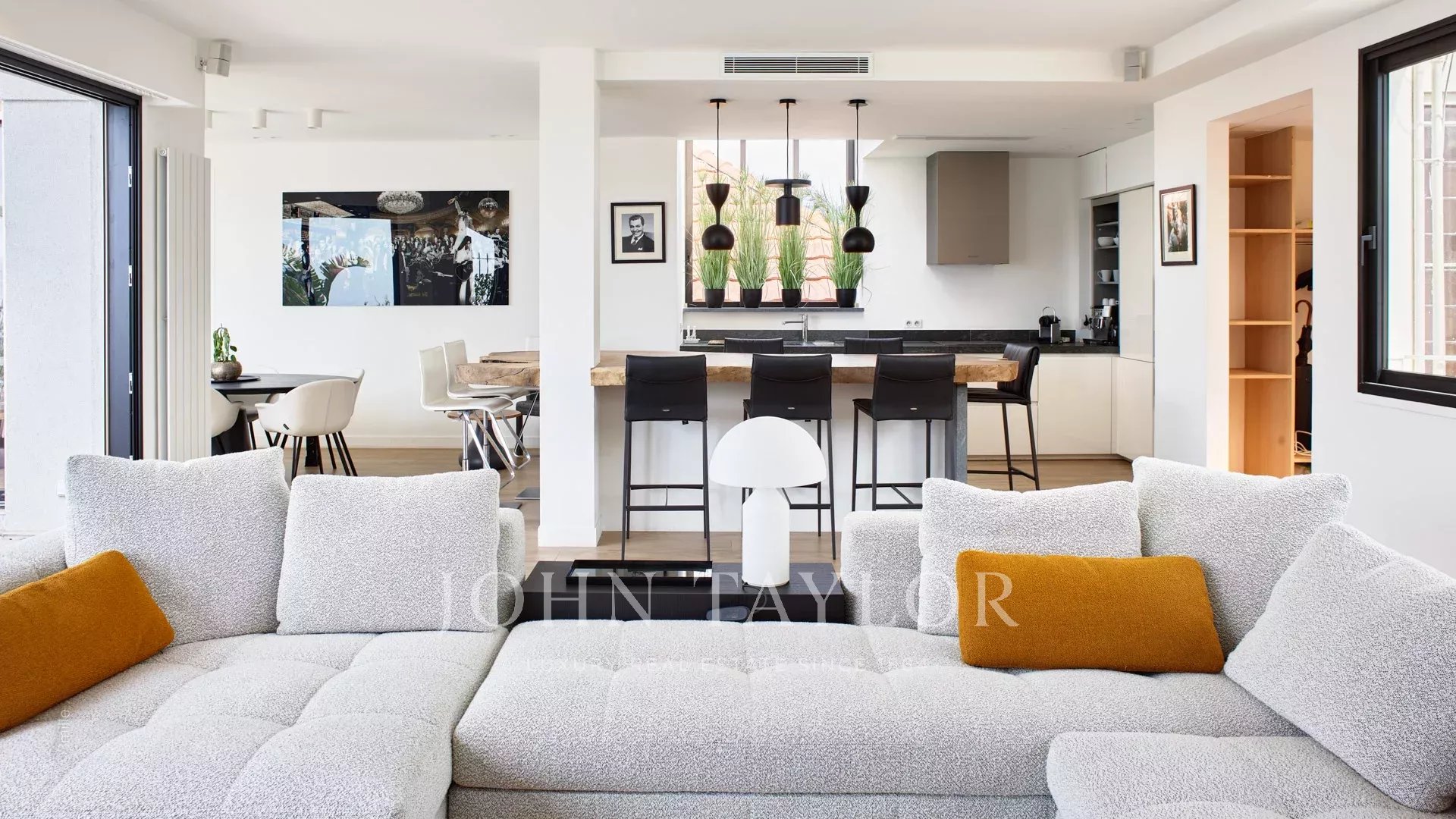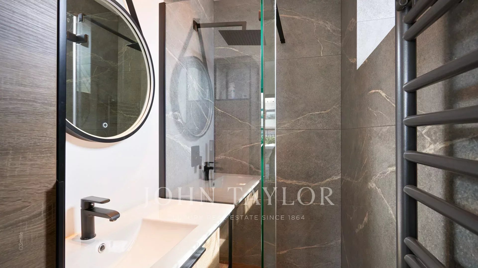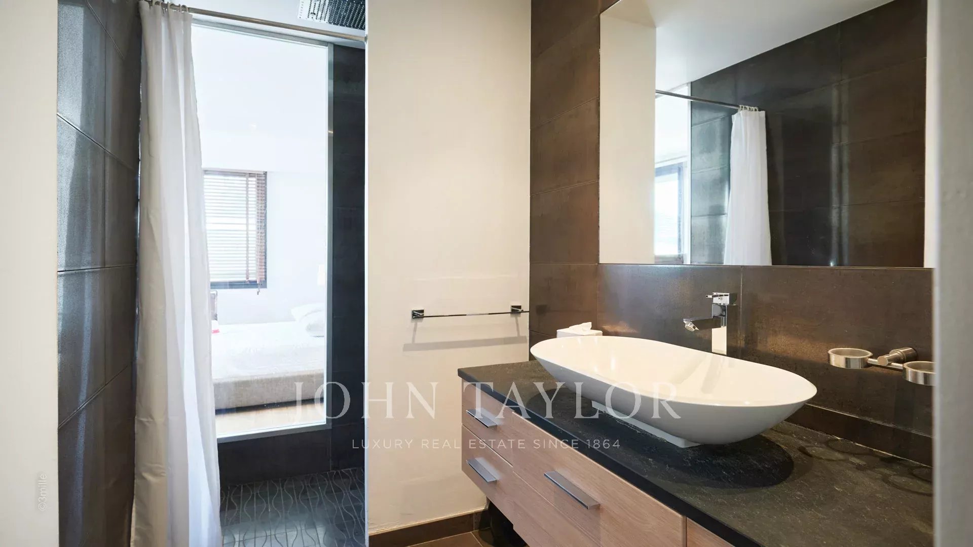 Ruhig und ideal in der Nähe des Palais des Festivals gelegen, wunderschöne zeitgenössische Wohnung von ca. 130 m2 Wohnfläche, vollständig klimatisiert und mit hochwertigen Leistungen renoviert. Sie bietet zwei große Terrassen und einen schönen Meerblick.