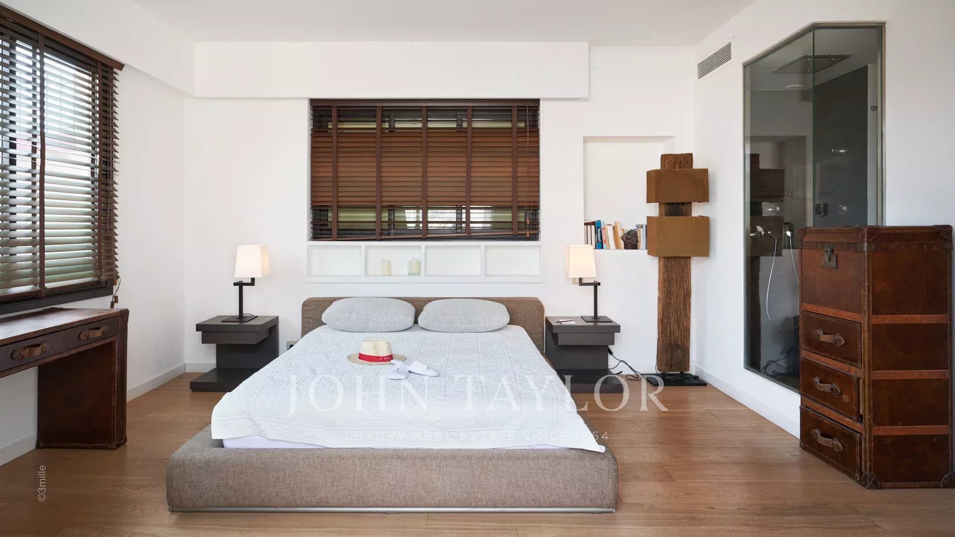 Hauptschlafzimmer (Bett 180 cm - Einbauschränke), das sich auf eine Terrasse von ca. 50 m² öffnet, mit eigenem Duschbad.