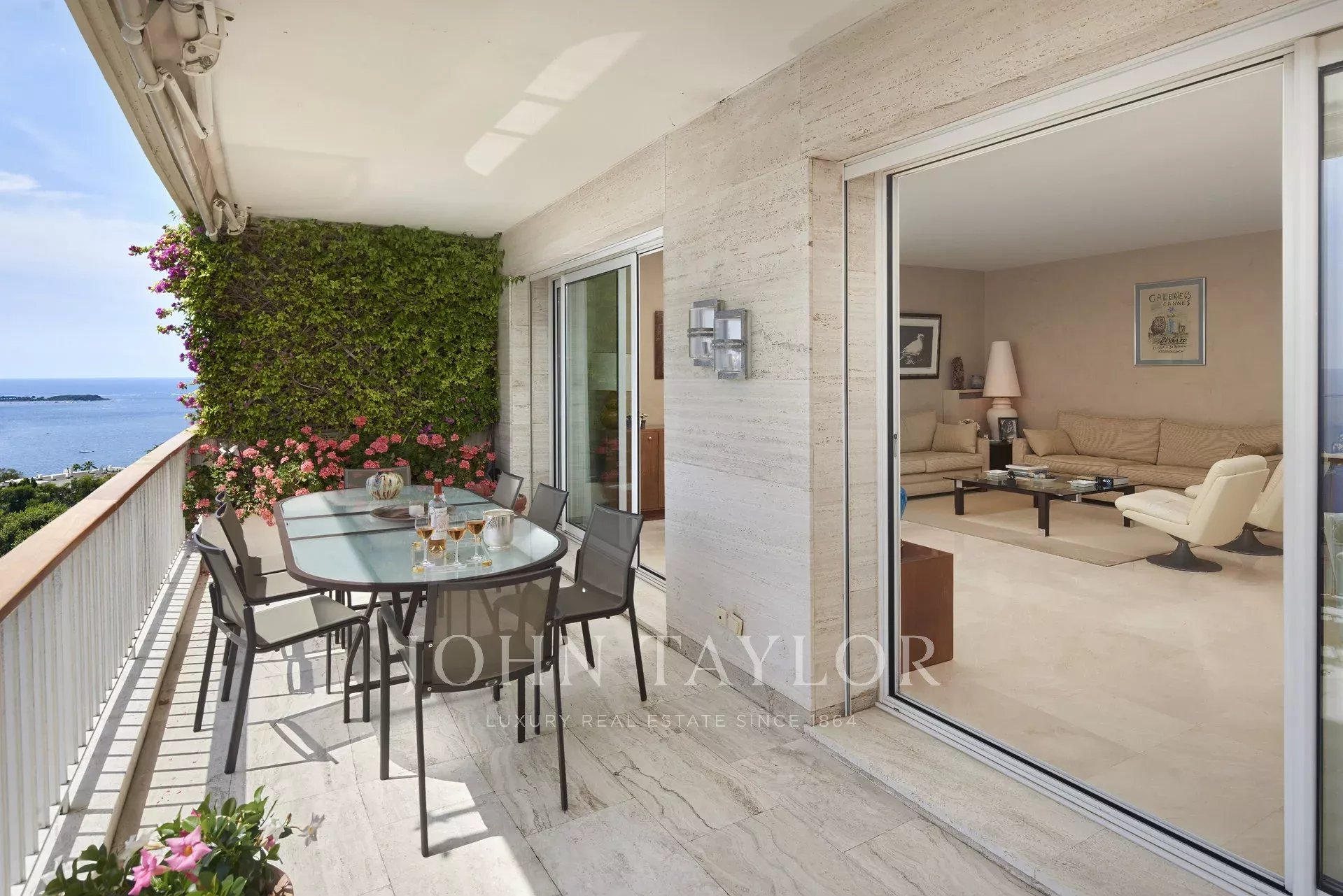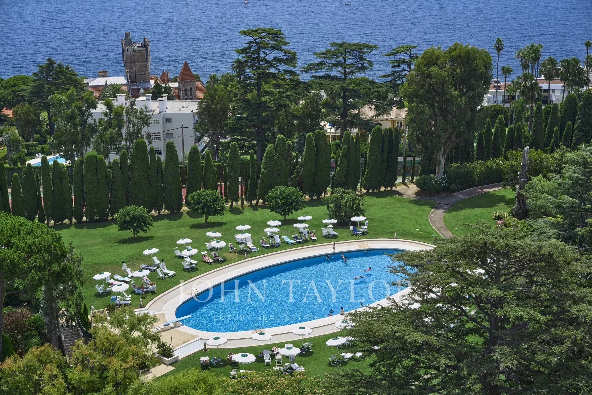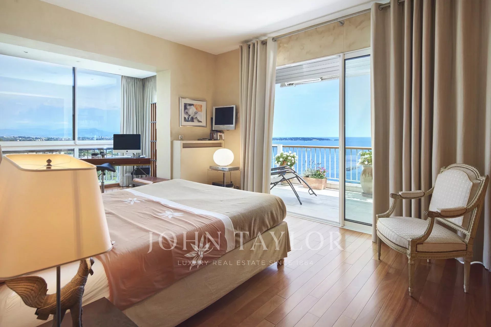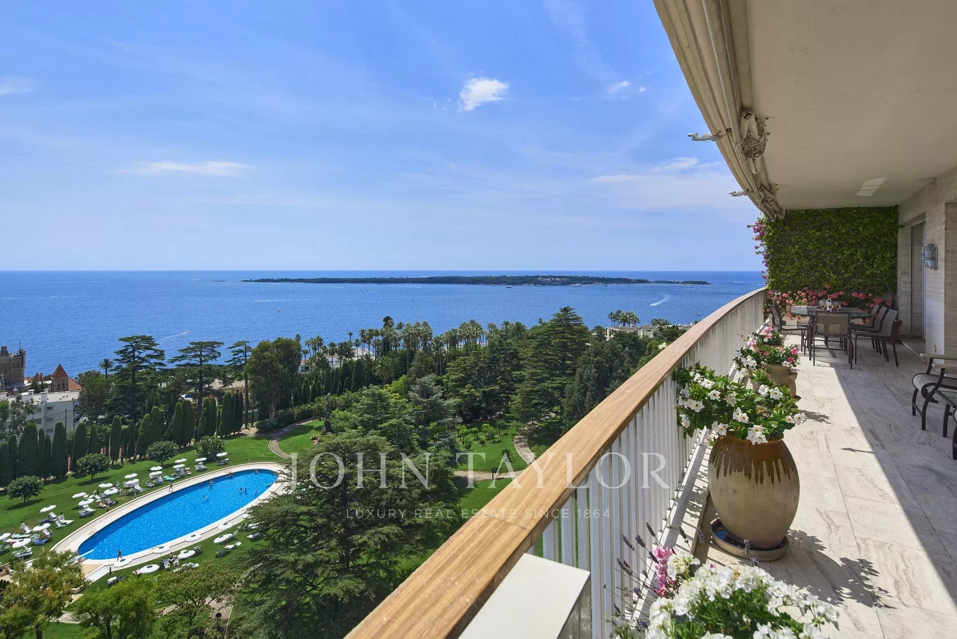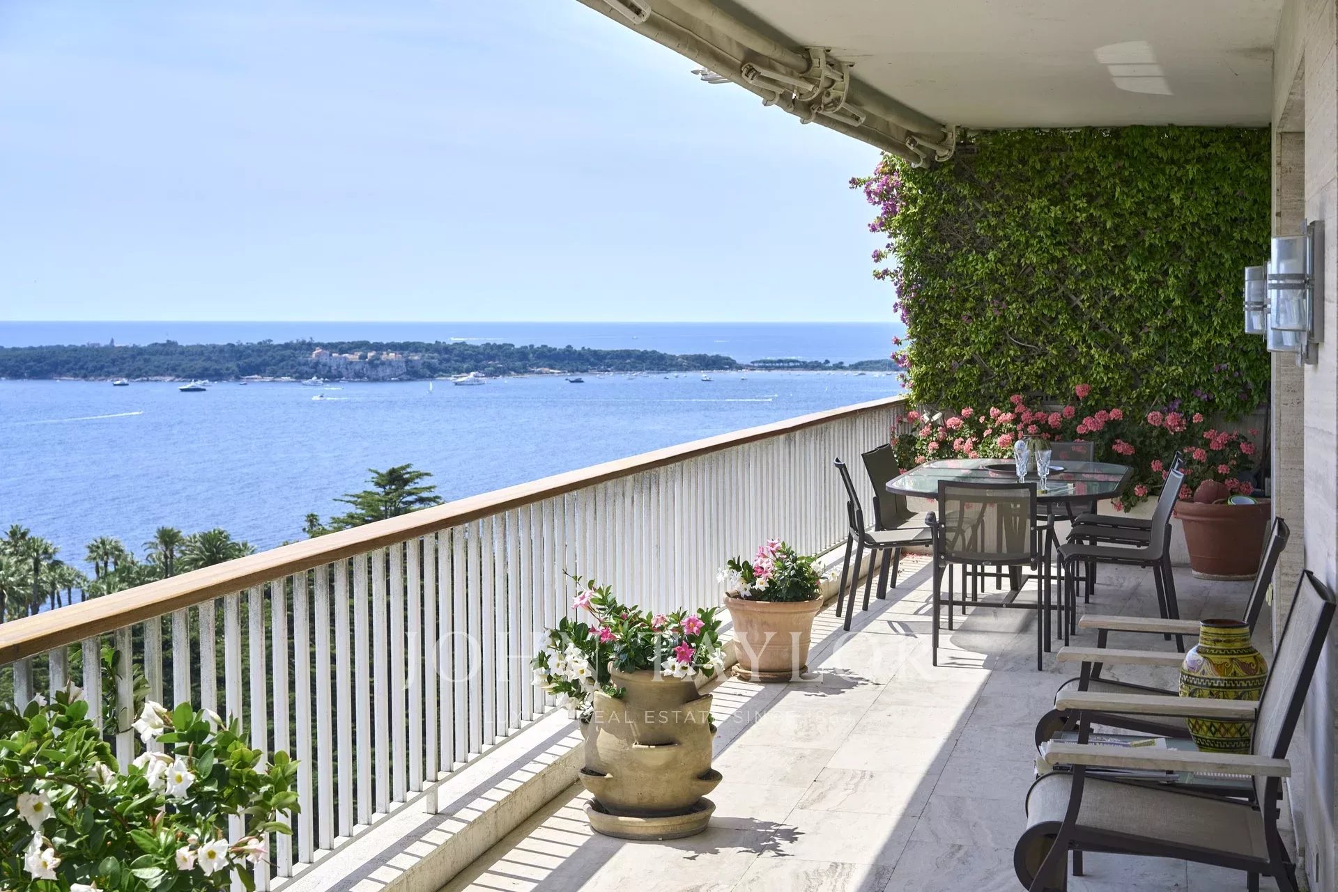 Auf den Höhen von Cannes, in einer Luxusresidenz im Herzen eines 11 Hektar großen Parks, klimatisierte Wohnung mit herrlichem Meerblick auf die Iles de Lérins und das Cap d'Antibes.