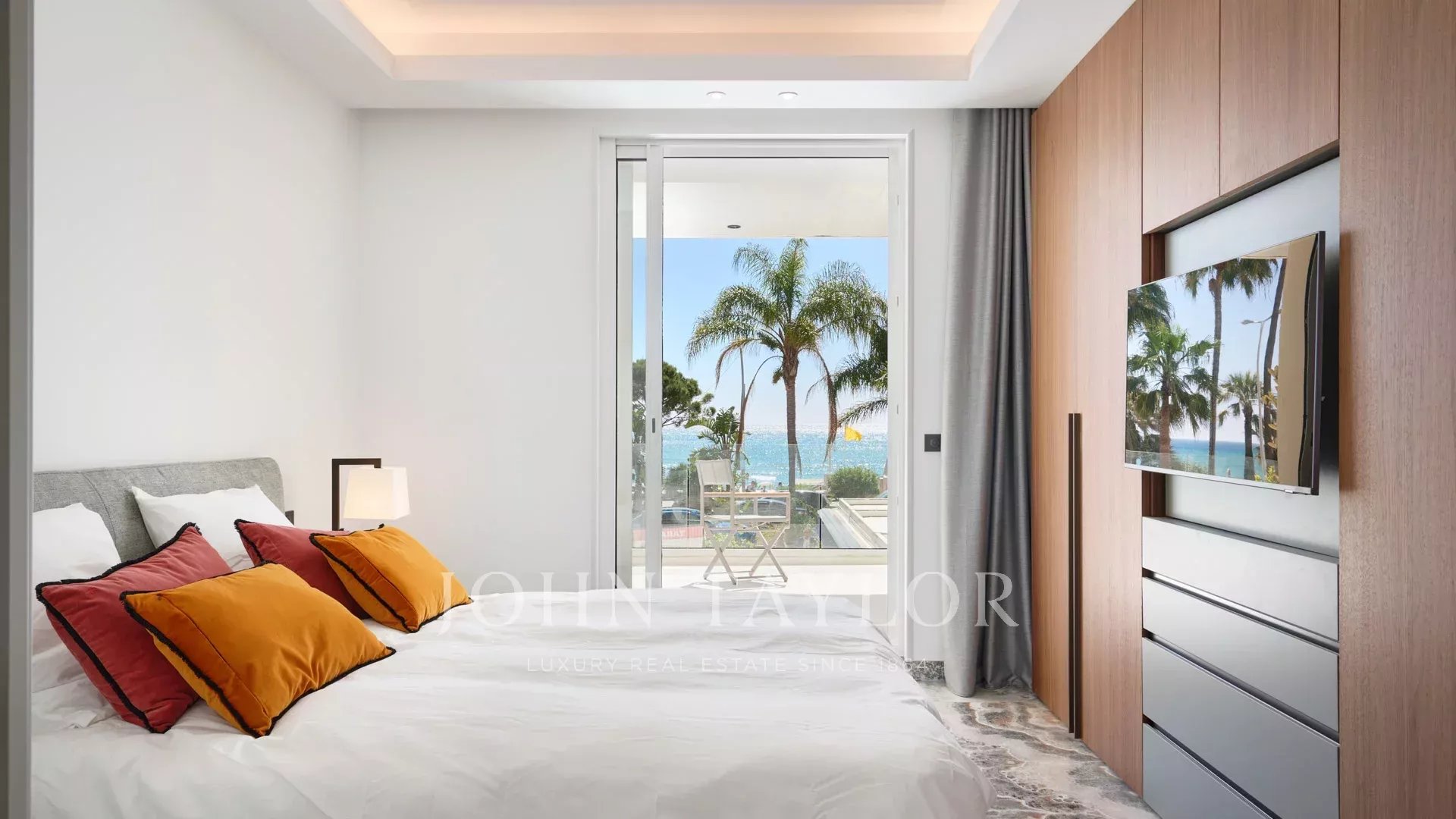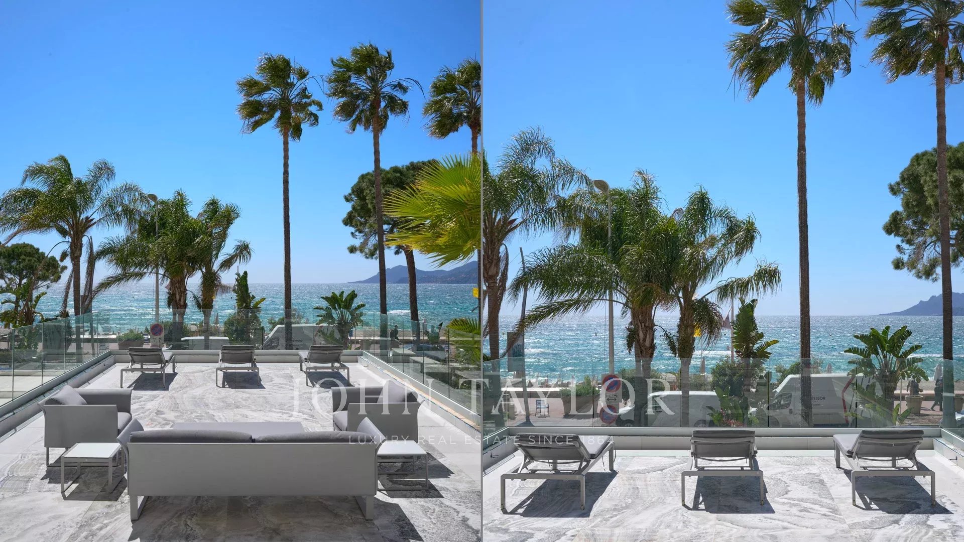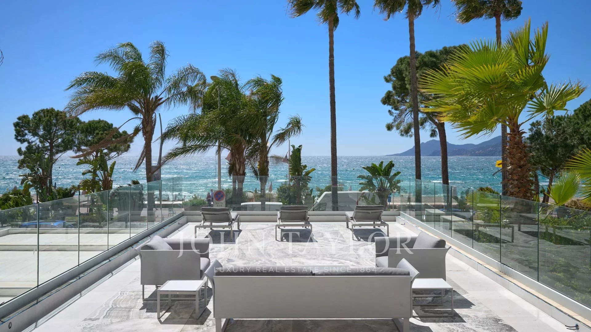 Die Wohnung wurde 2023 komplett renoviert und besticht durch ihre Dekoration, ihre hochwertigen Leistungen und ihre schöne und große, nach Süden ausgerichtete Terrasse von ca. 110 m2, die halb überdacht ist, mit Sommersalons ausgestattet ist und einen Blick auf die Bucht von Cannes und die Croisette bietet.