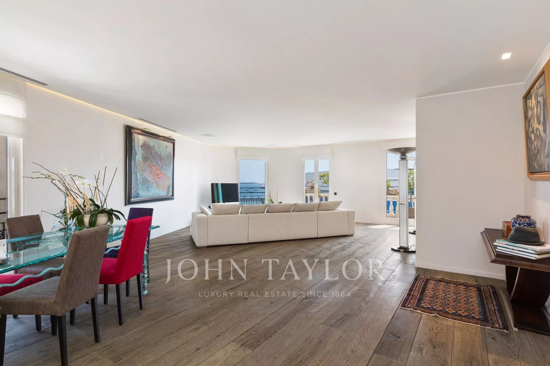 Eingang, der sich zu einer 60 m2 großen Rezeption öffnet, die eine amerikanische Küche "Pedini", ein Esszimmer und ein Wohnzimmer umfasst, die sich alle zu einer Terrasse mit Blick auf das Meer und den Palais des Festivals öffnen.