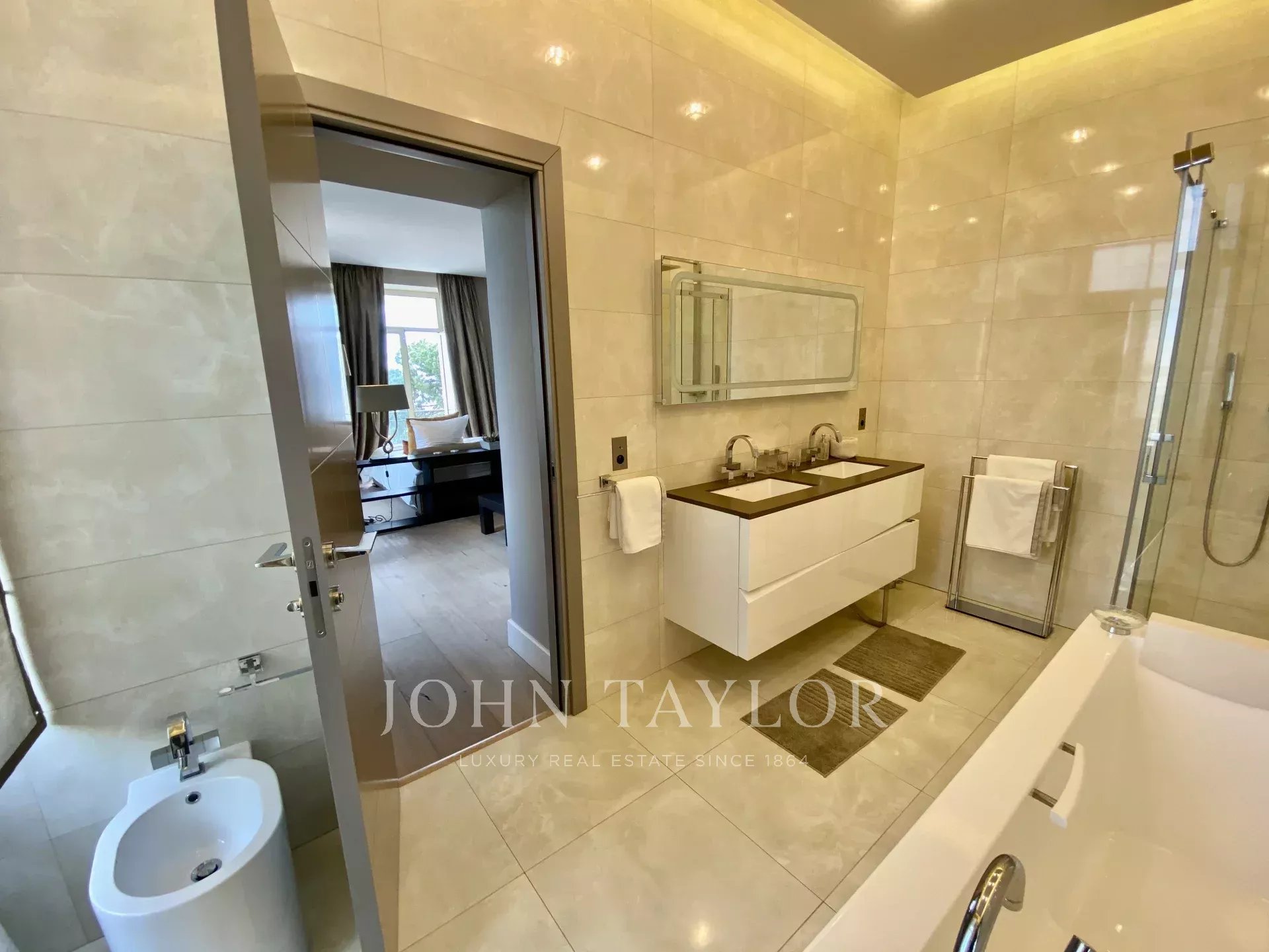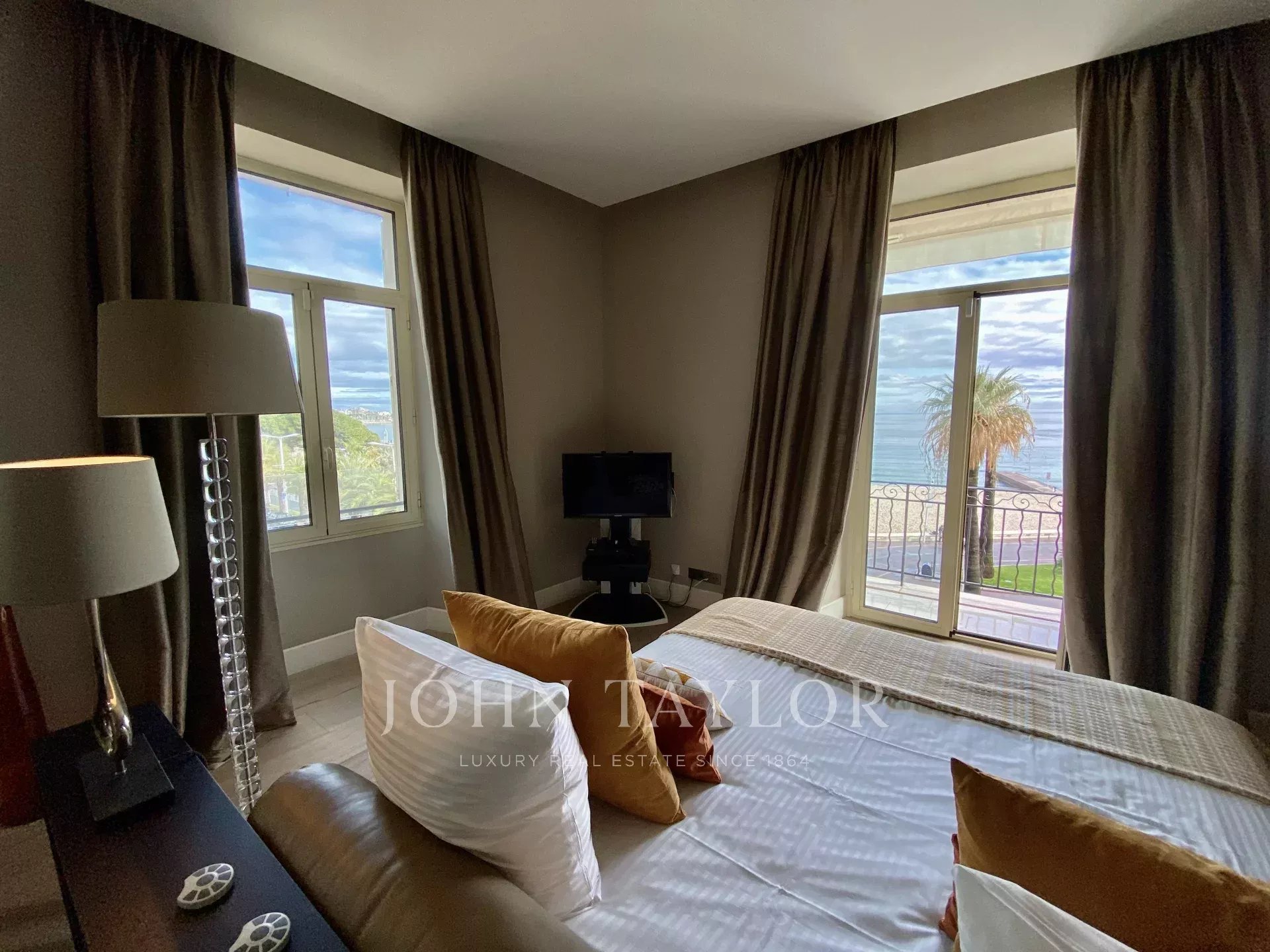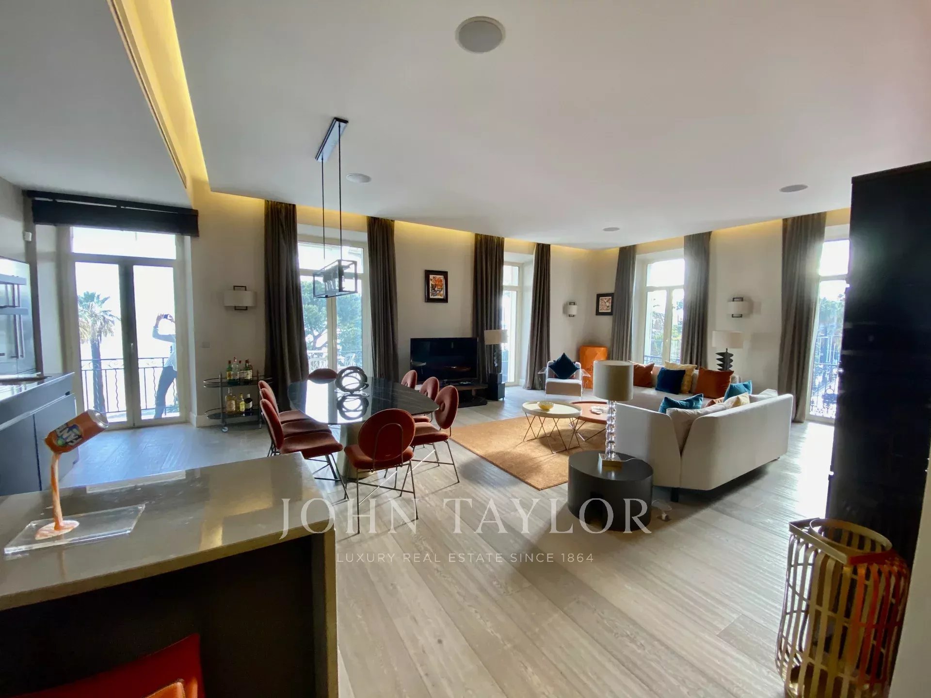 Mit einem herrlichen Blick auf die Bucht von Cannes und die Croisette, nur wenige Gehminuten vom Palais des Festivals entfernt, befindet sich dieses wunderschöne, zeitgenössische Apartment mit einer Wohnfläche von ca. 230 m2 und 35 m2 Terrassen.