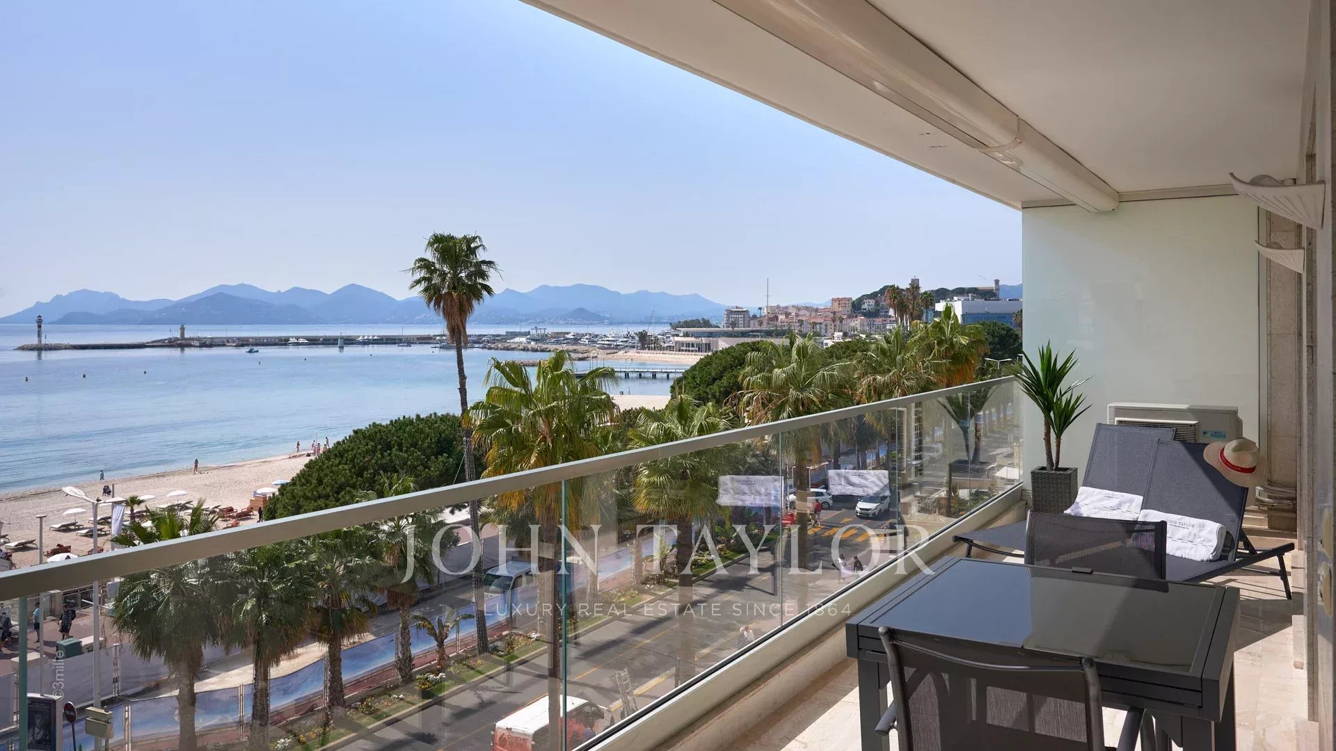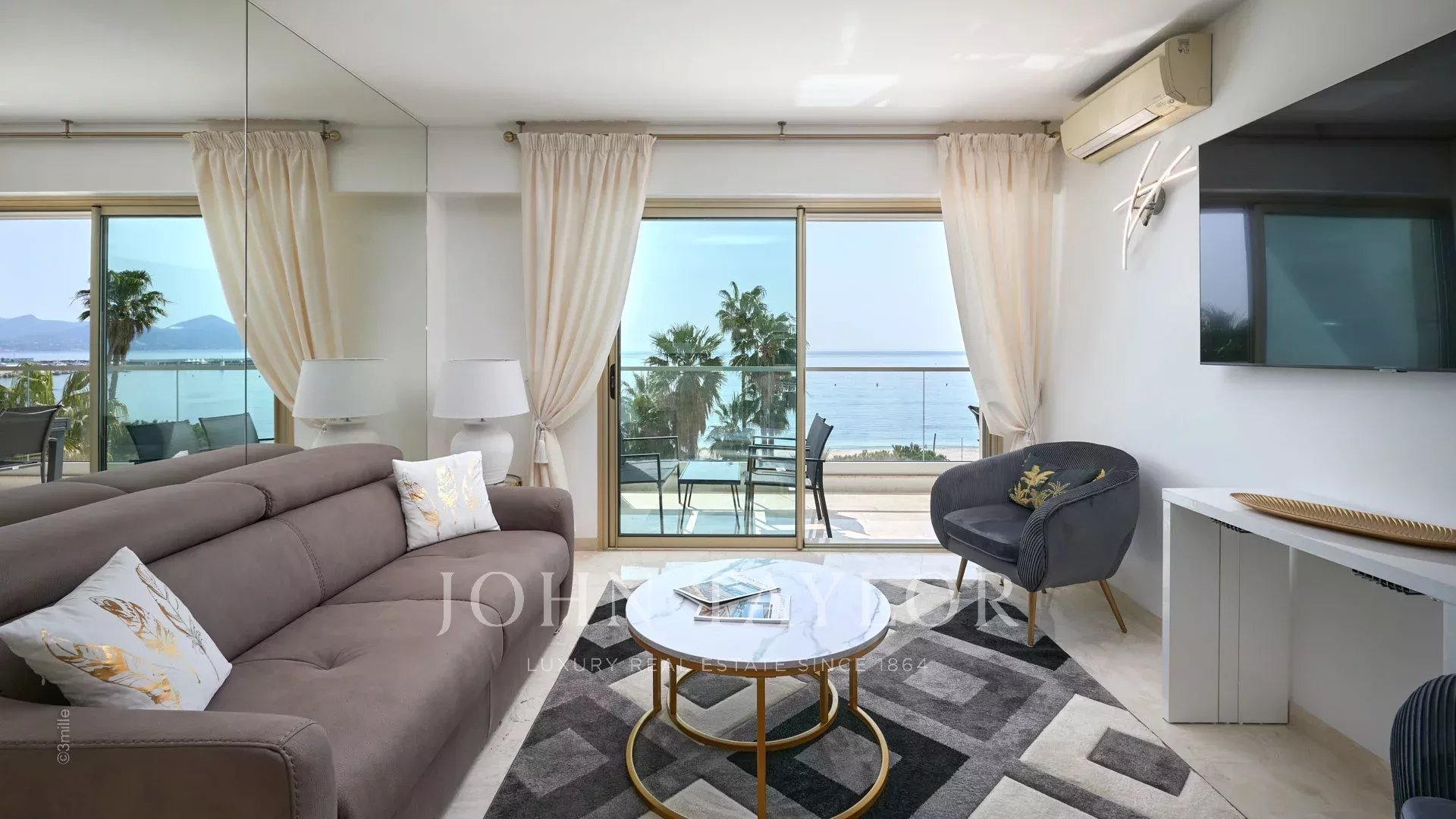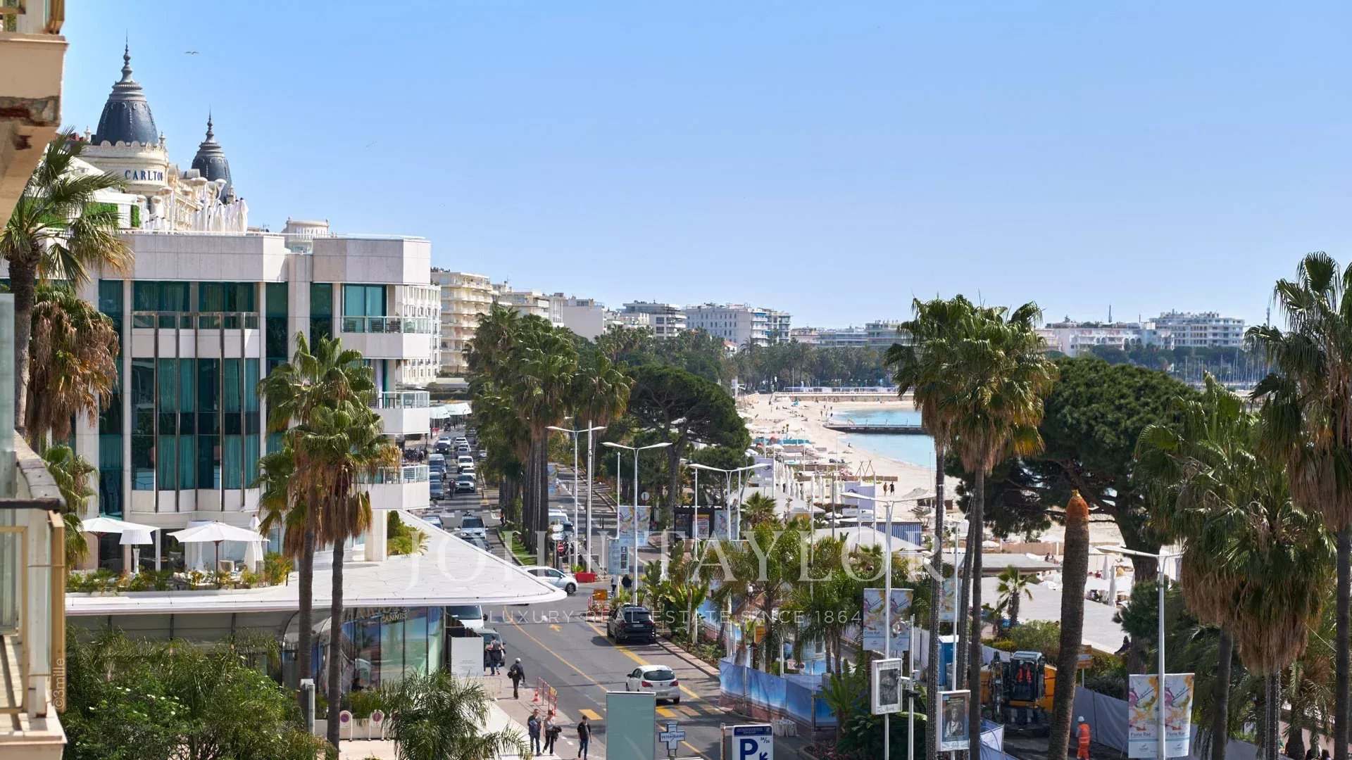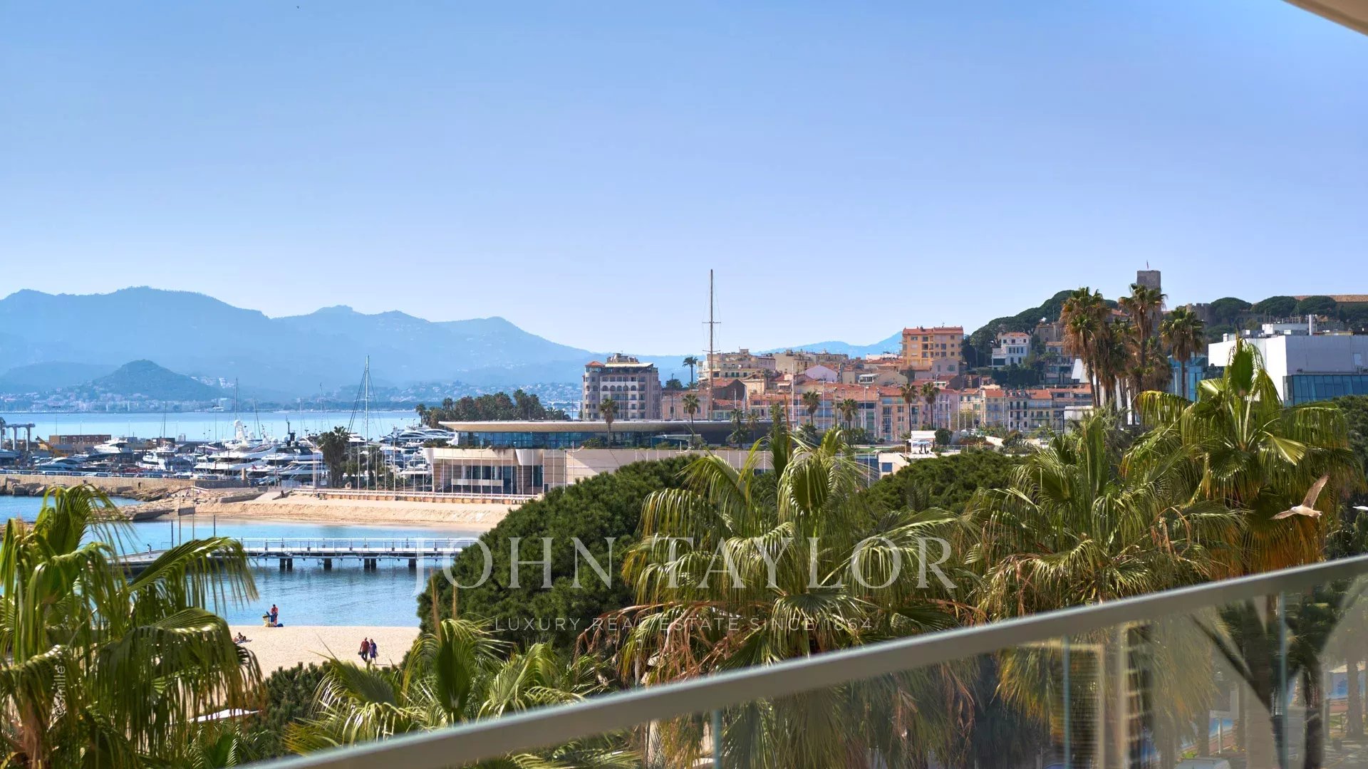 Schöne klimatisierte Wohnung im Herzen von La Croisette im 4. Stock einer Luxusresidenz mit Panoramablick auf die Bucht von Cannes, die Strände, den Palais des Festivals und das Esterel-Gebirge.