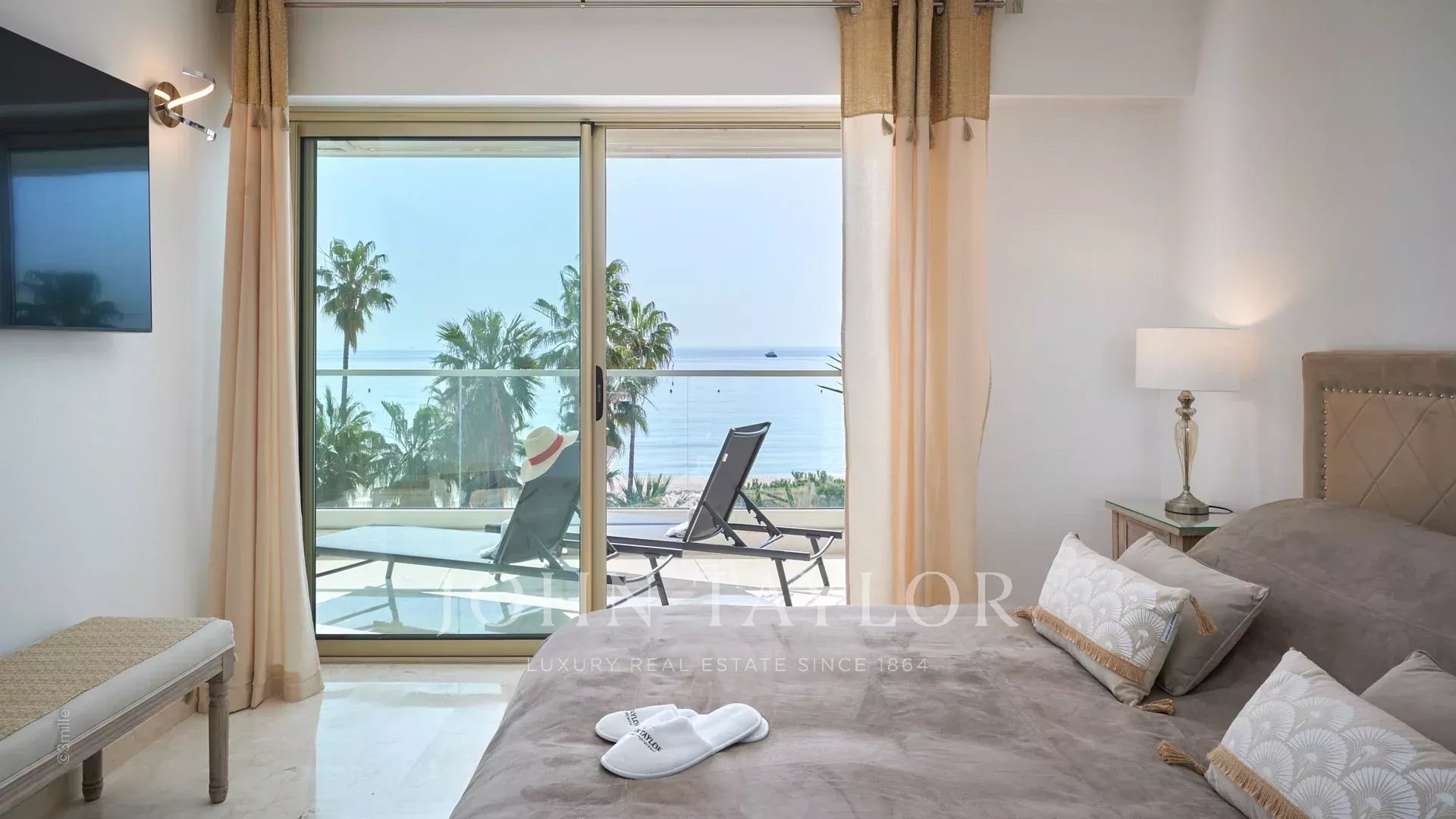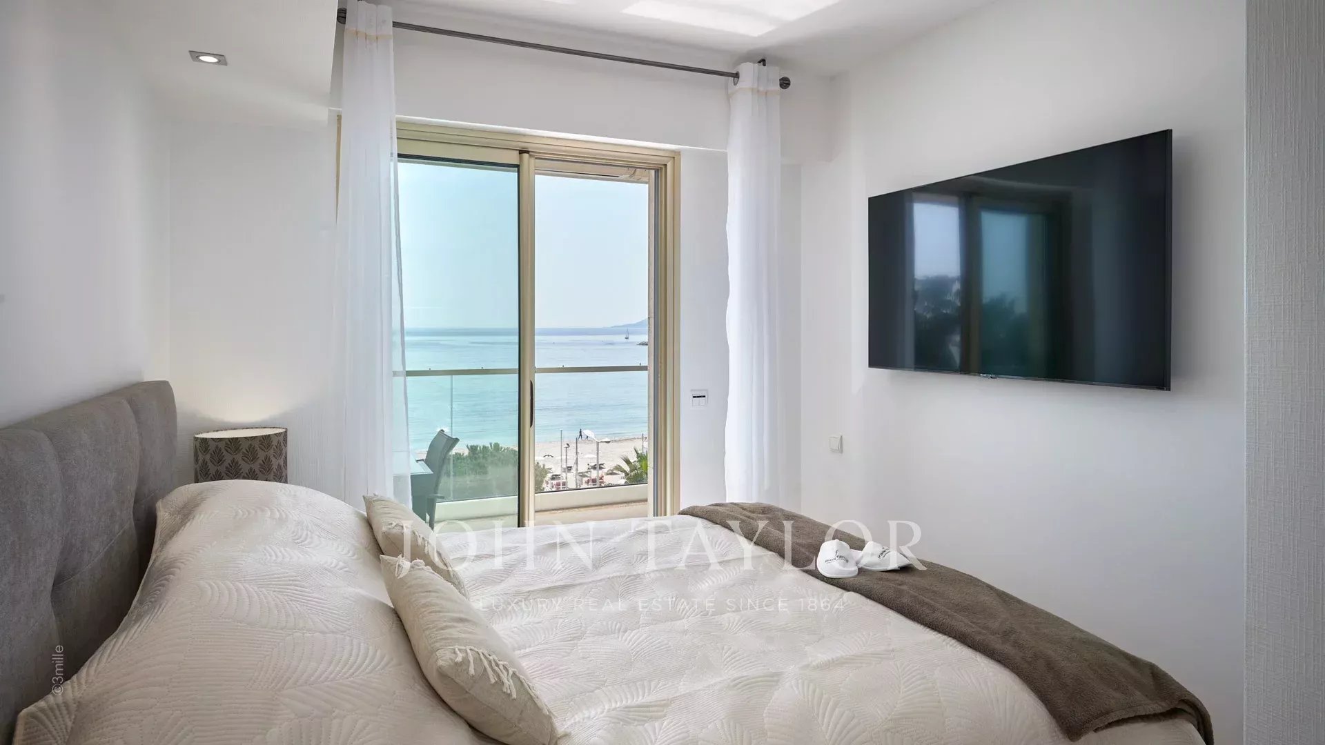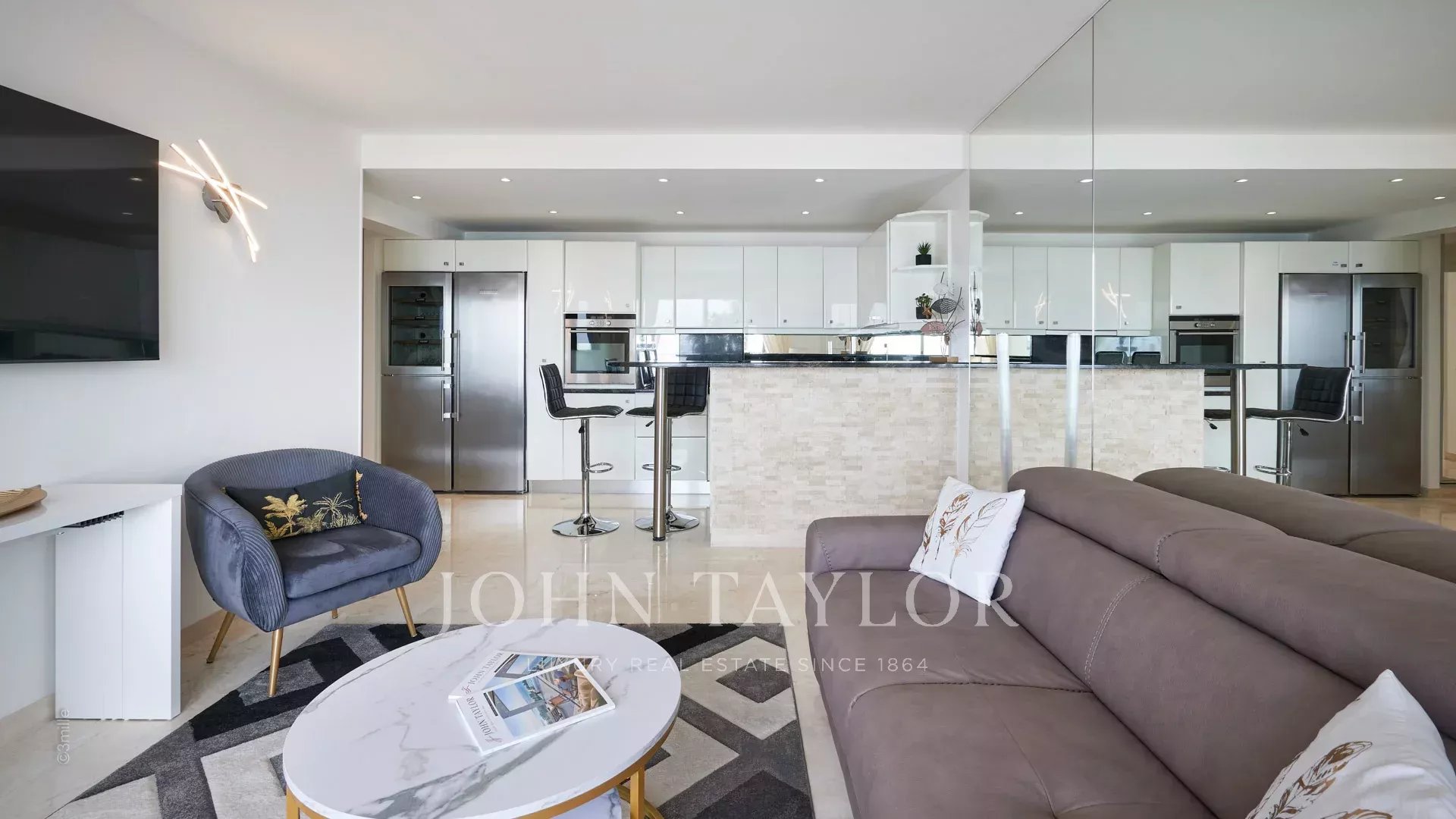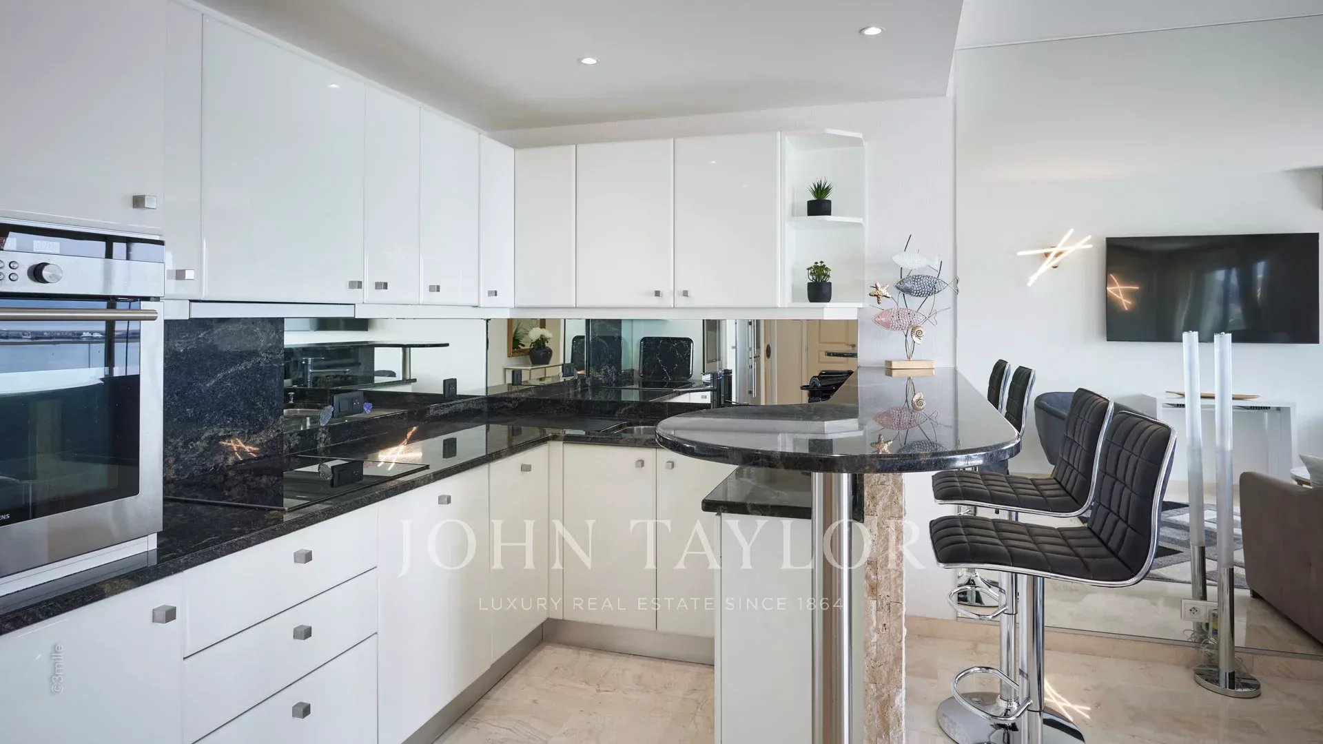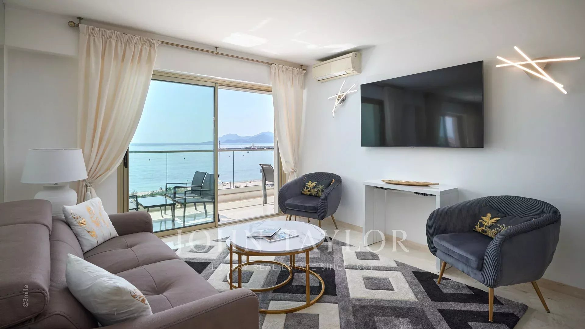 Schöne klimatisierte Wohnung im Herzen von La Croisette im 4. Stock einer Luxusresidenz mit Panoramablick auf die Bucht von Cannes, die Strände, den Palais des Festivals und das Esterel-Gebirge.