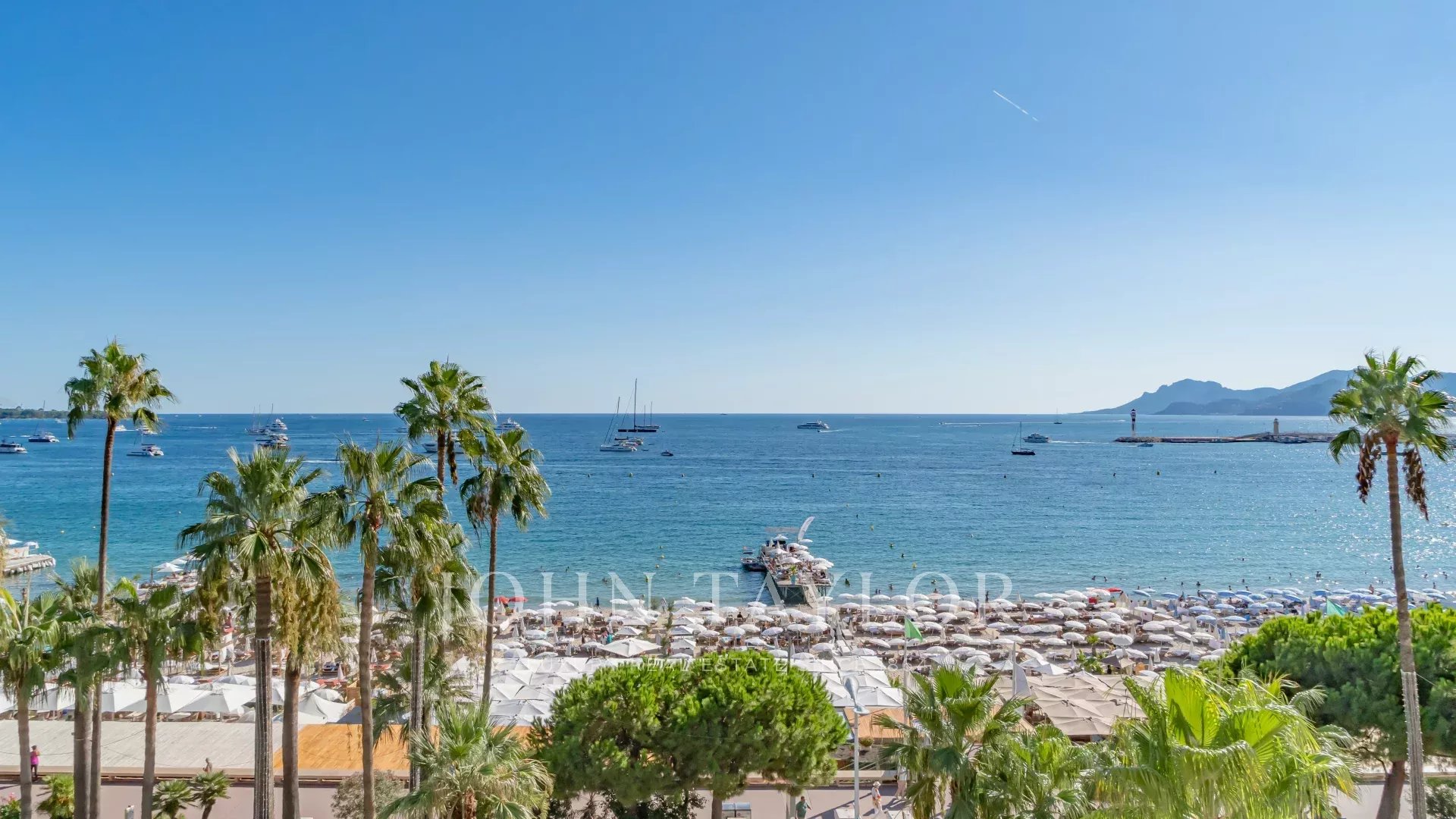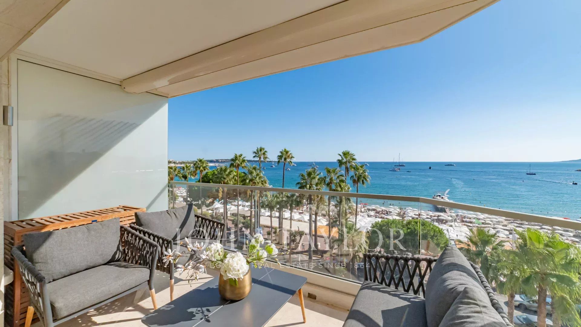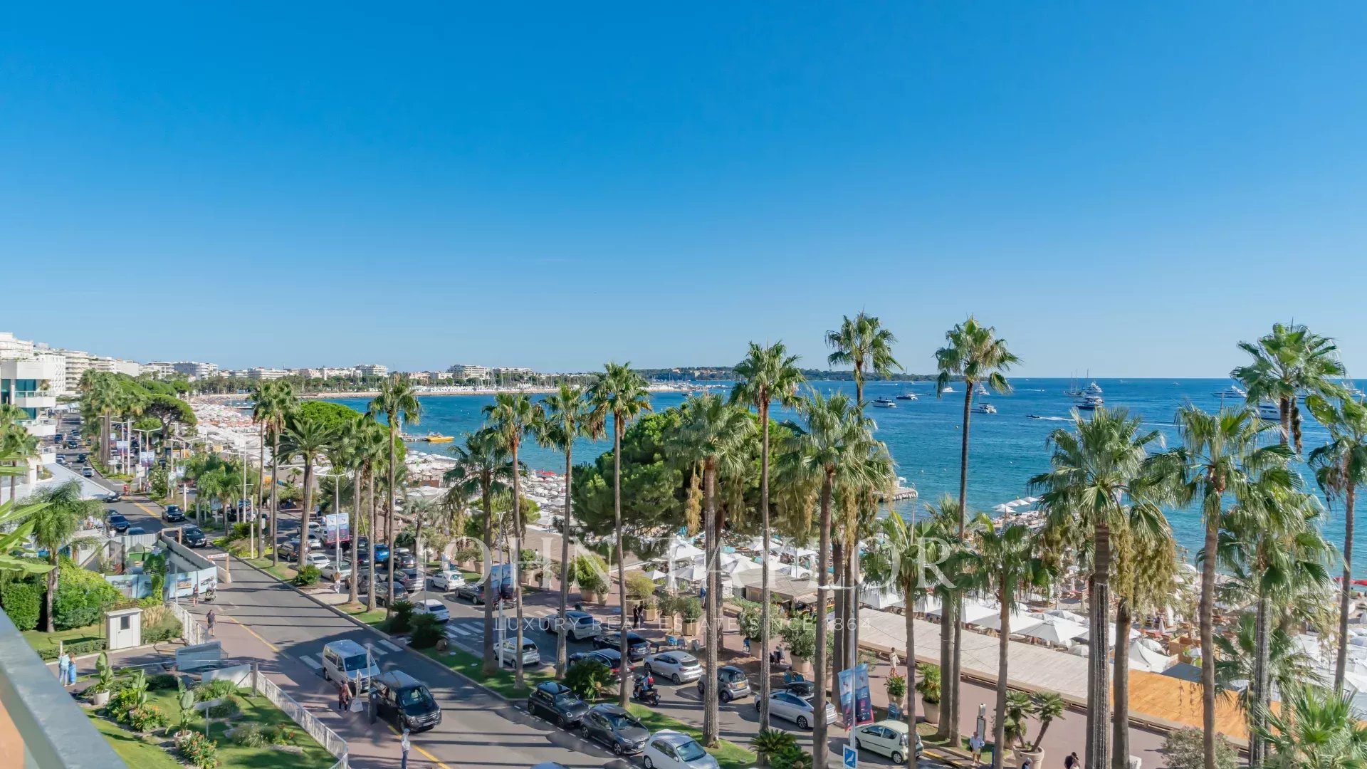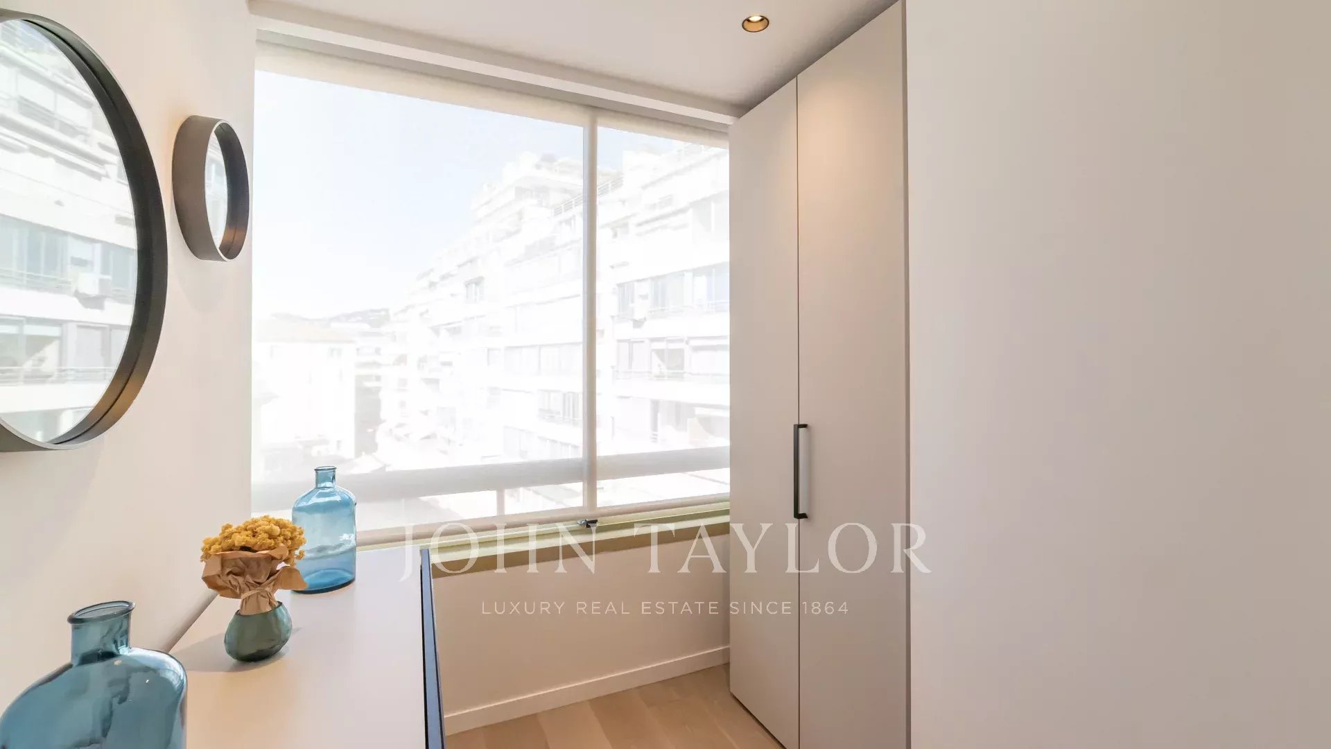 Schöne klimatisierte Wohnung im Herzen von La Croisette im 5. Stock einer Luxusresidenz mit einem herrlichen Panoramablick auf die Bucht von Cannes, die Strände, den Palais des Festivals und das Esterel-Gebirge.