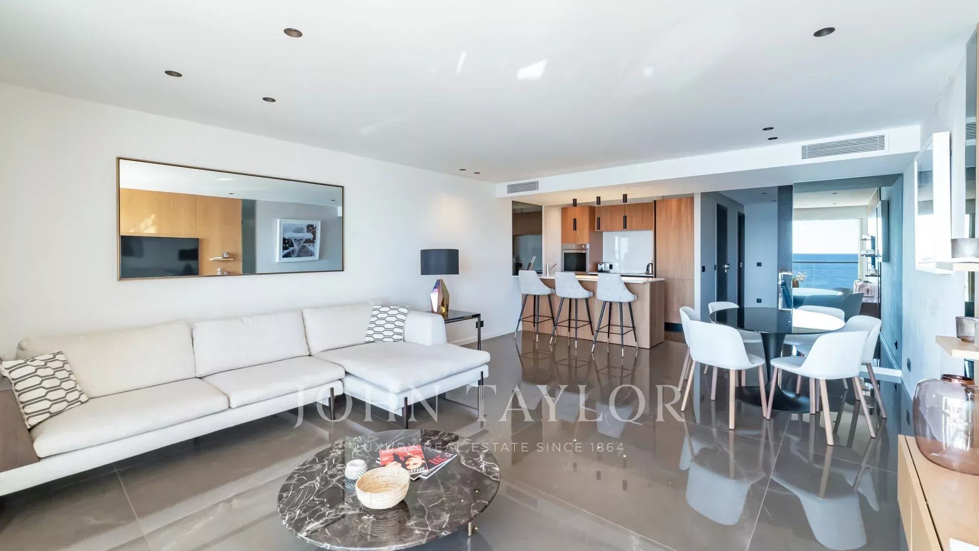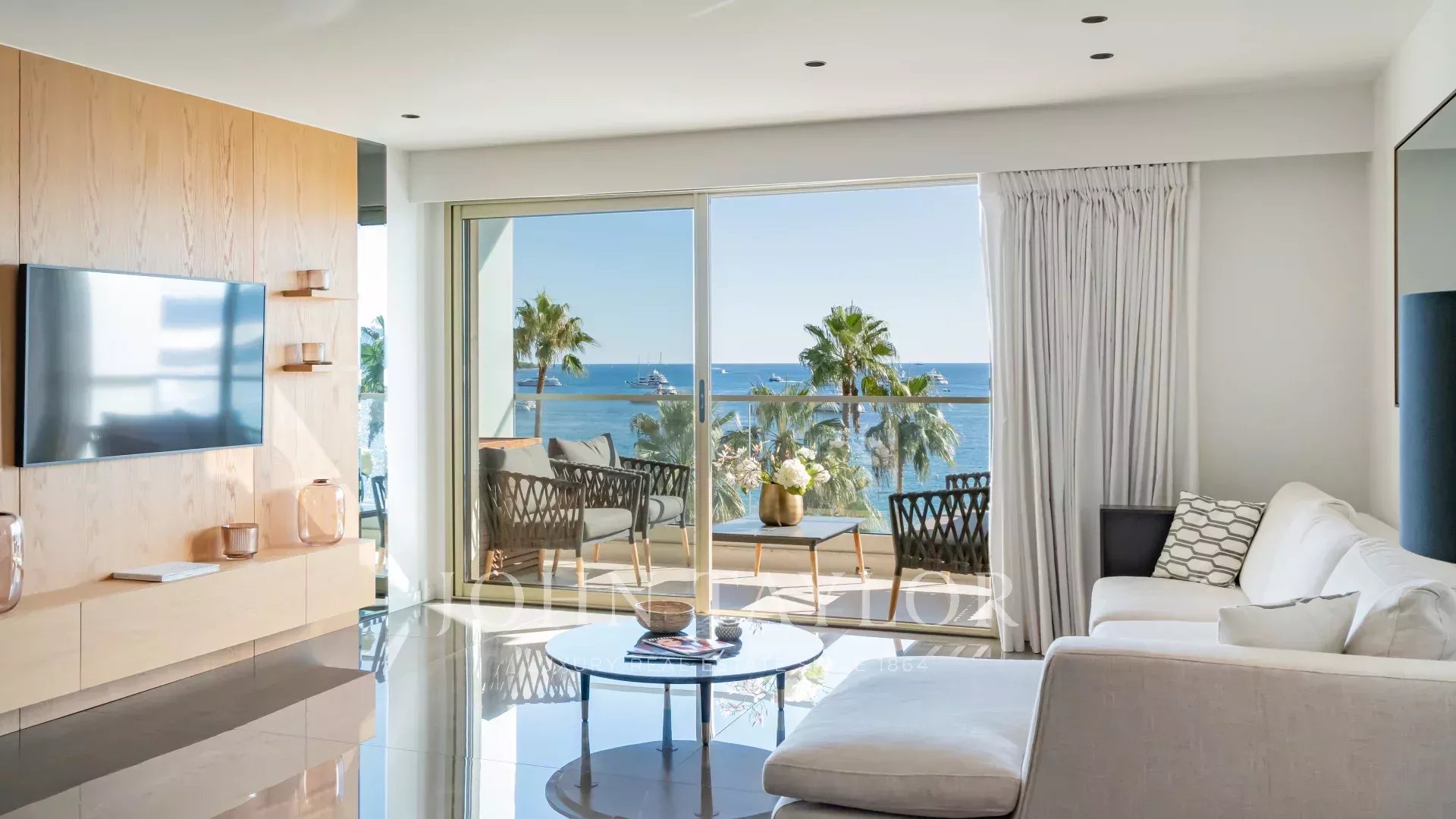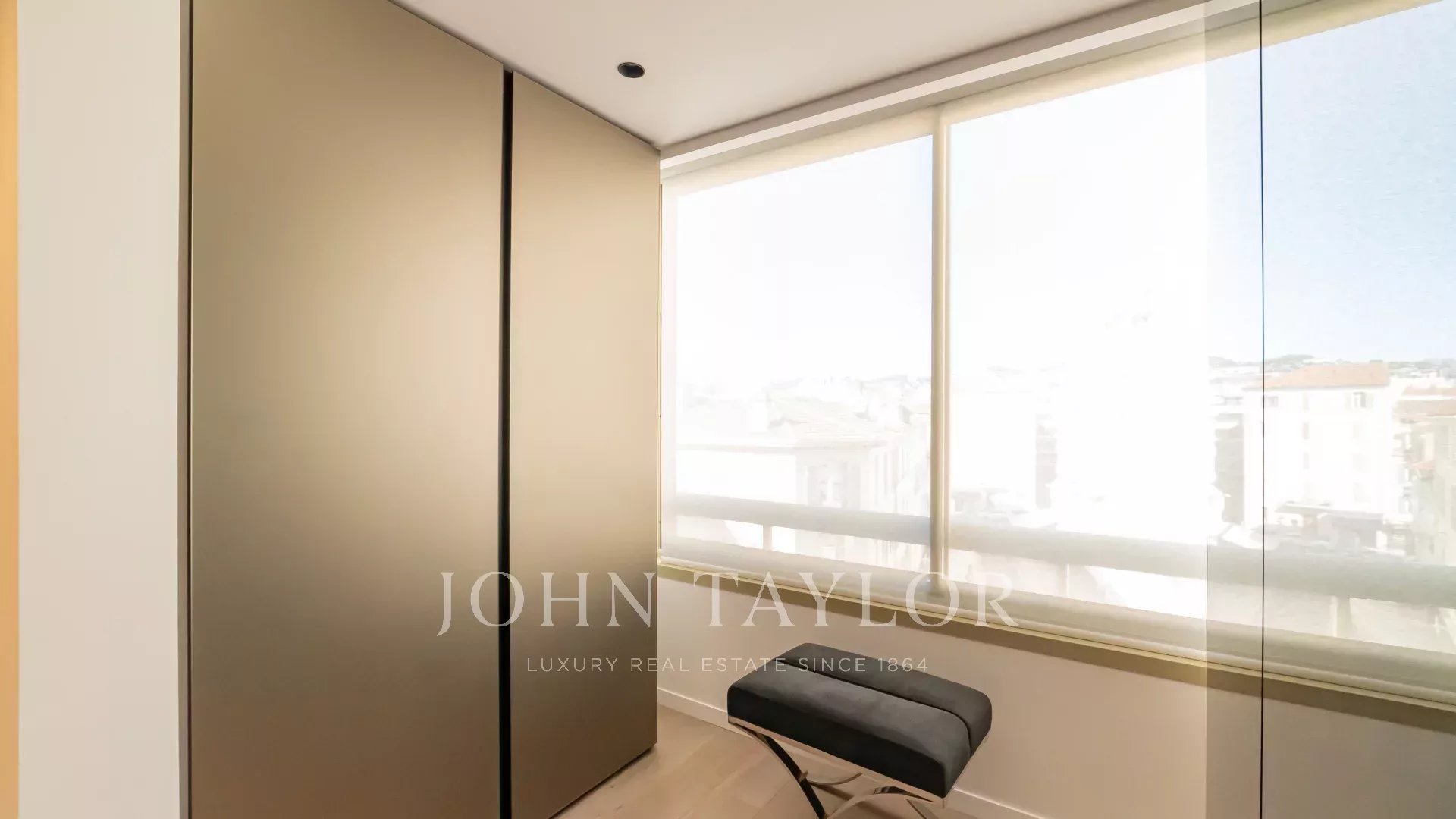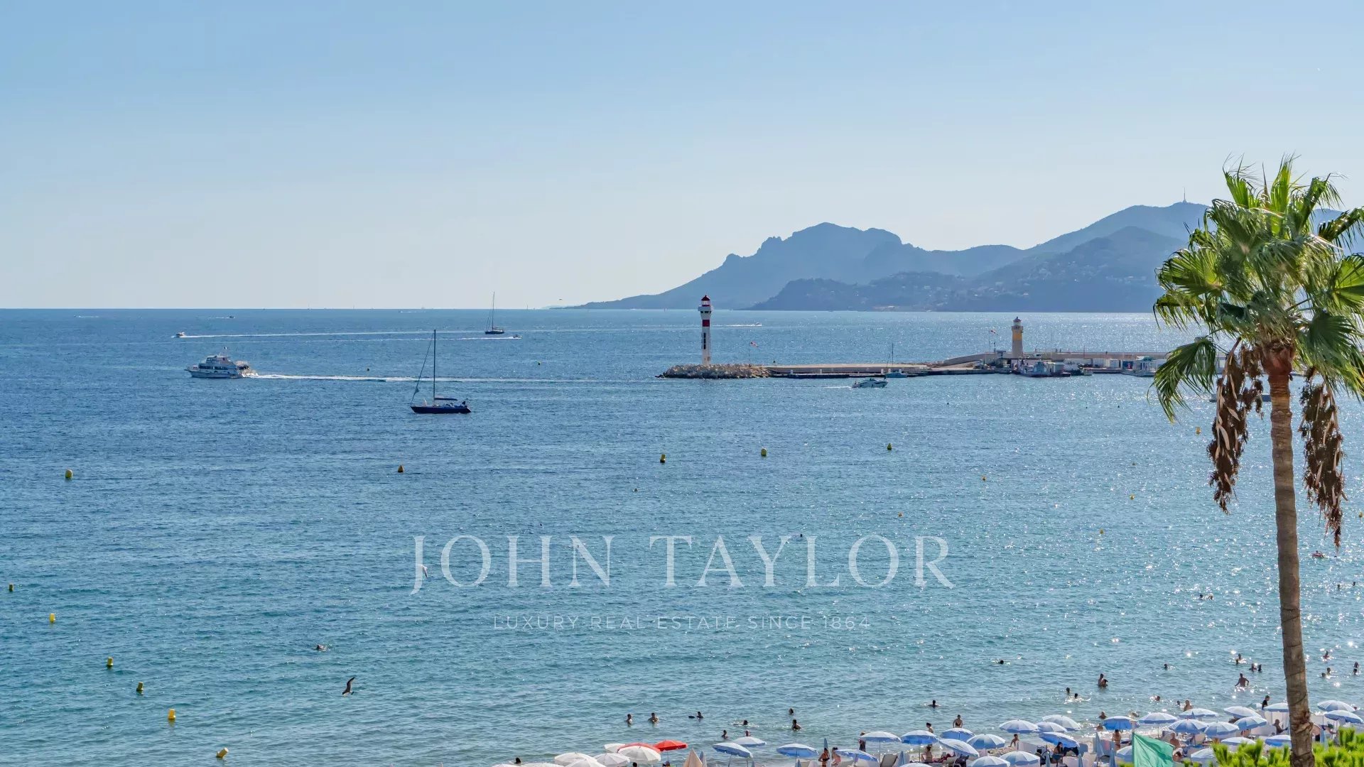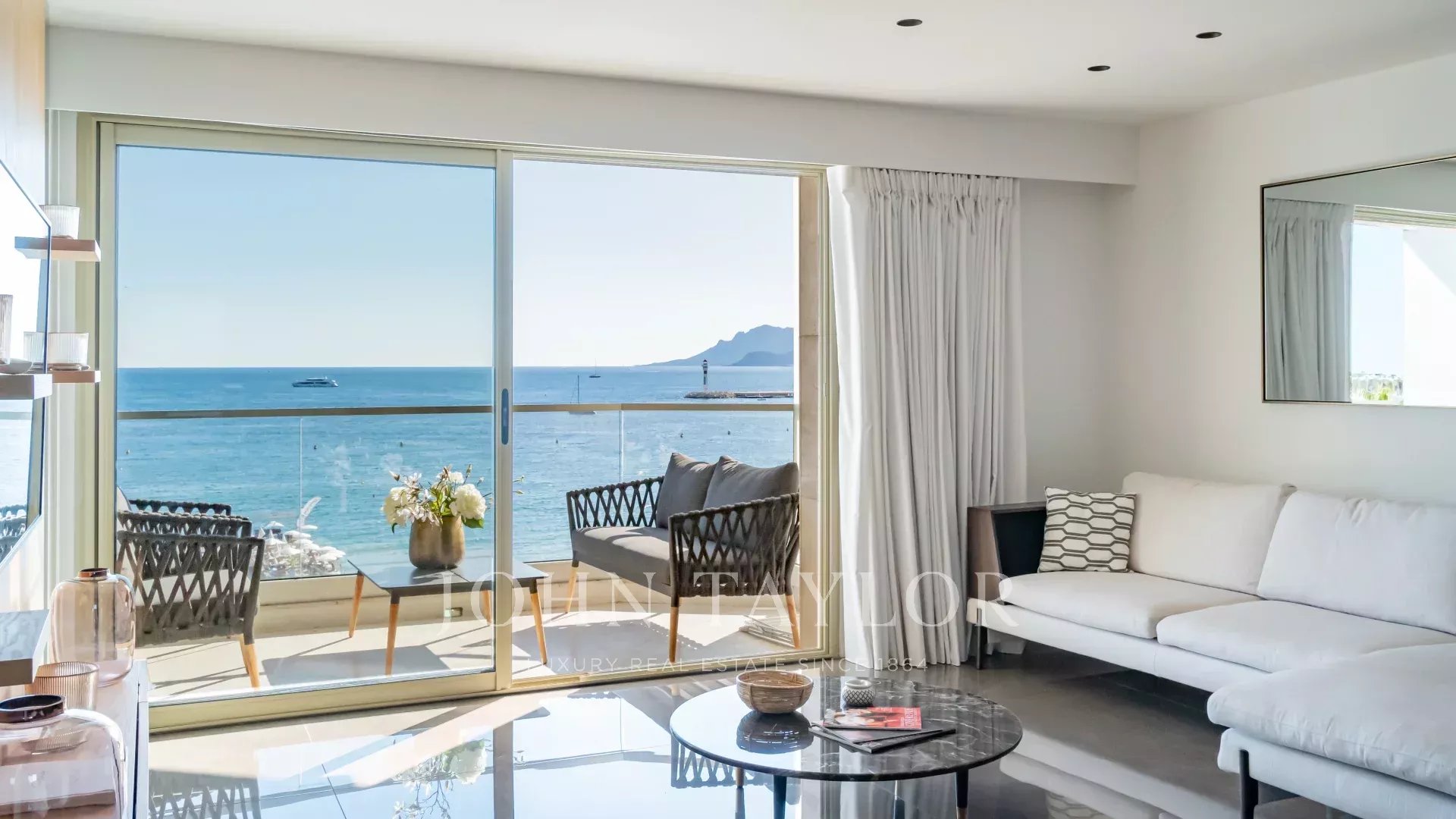 Schöne klimatisierte Wohnung im Herzen von La Croisette im 5. Stock einer Luxusresidenz mit einem herrlichen Panoramablick auf die Bucht von Cannes, die Strände, den Palais des Festivals und das Esterel-Gebirge.