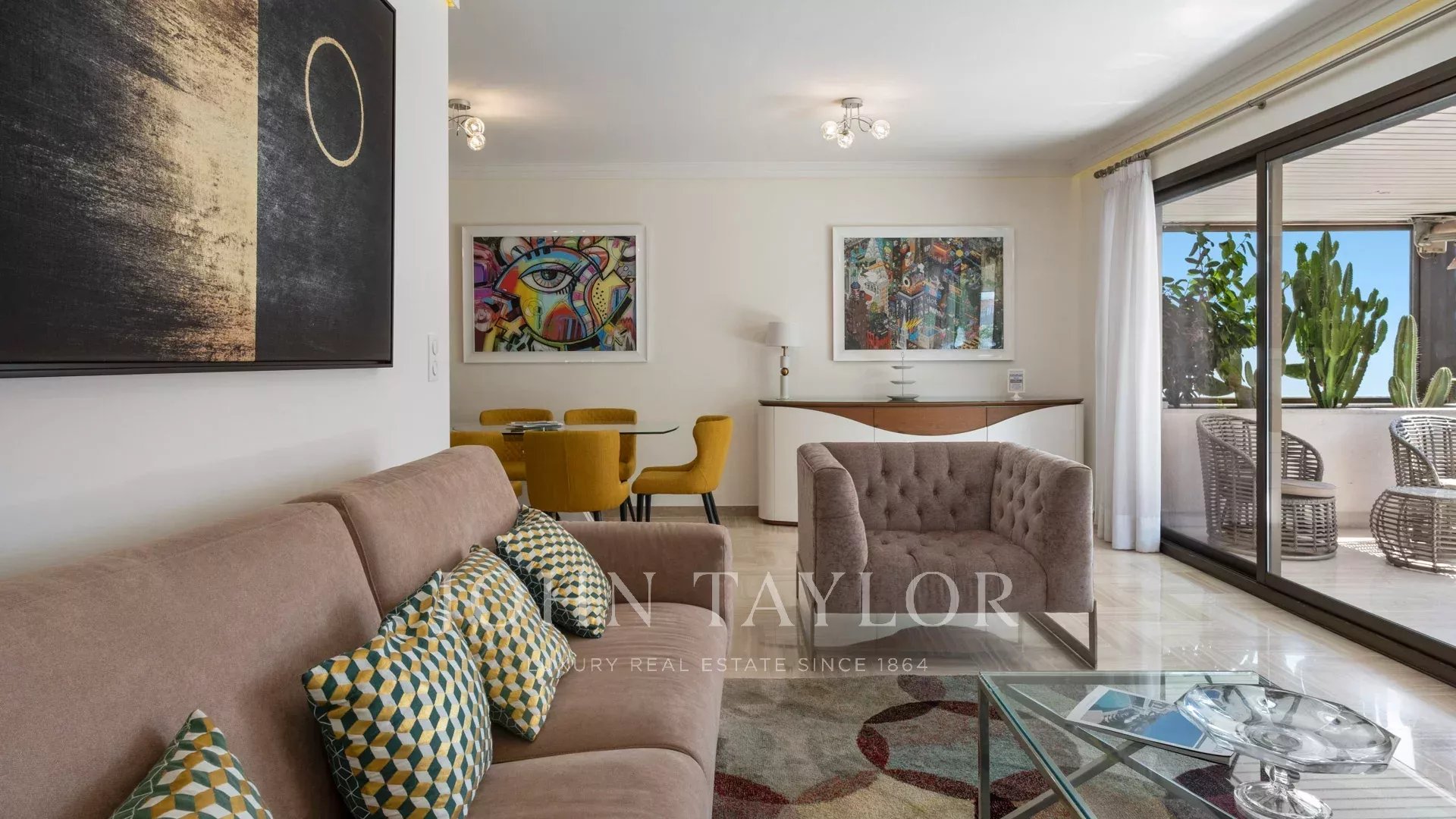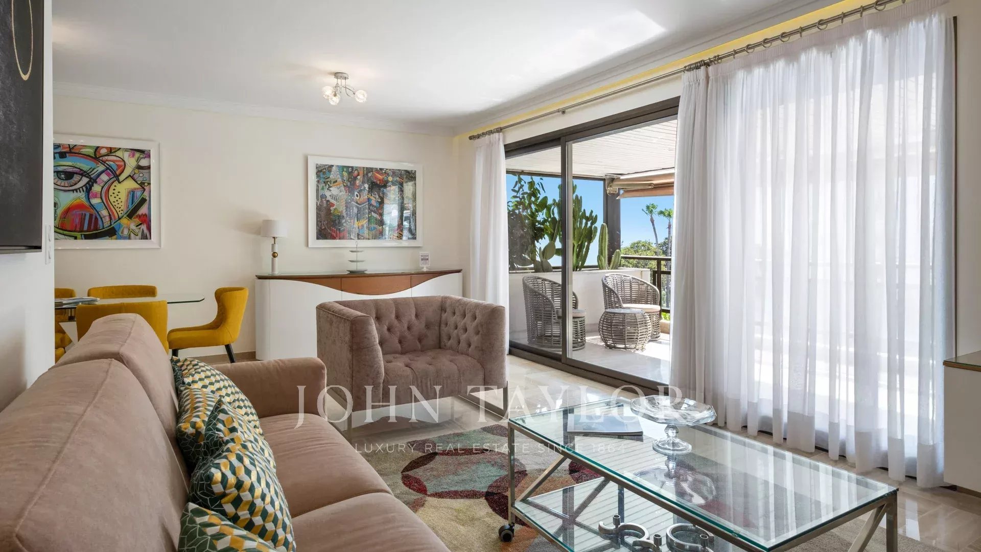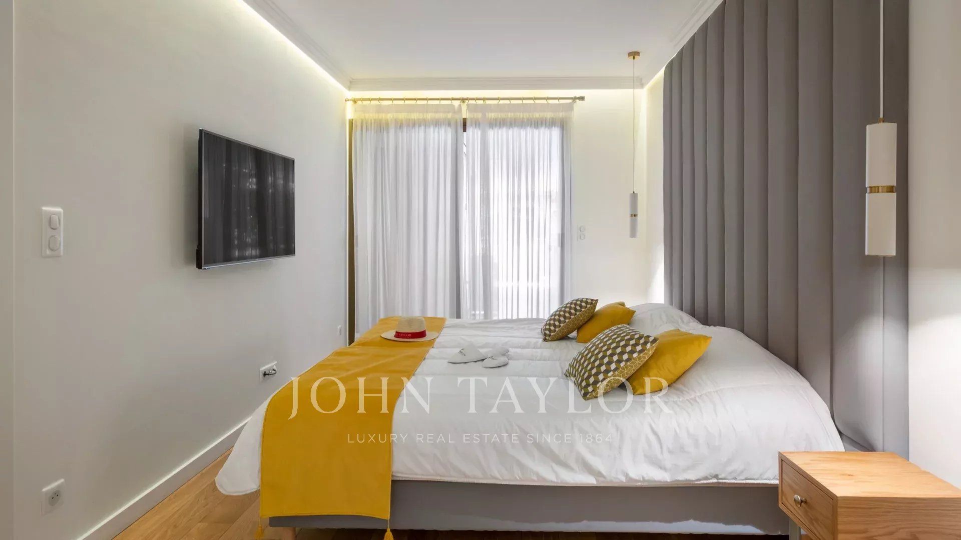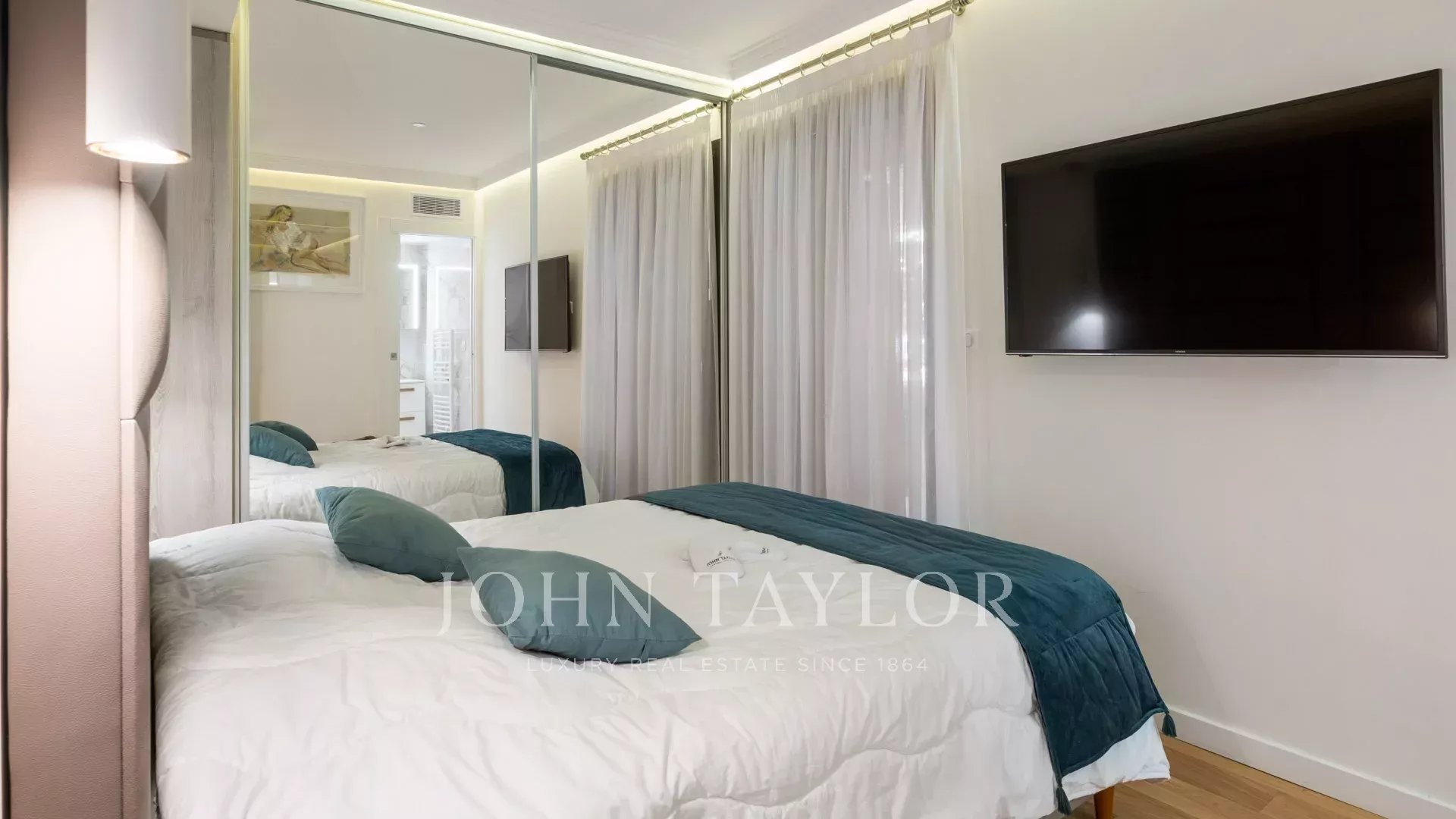 Ideal gelegen, nur 5 Gehminuten vom Palais des Festivals entfernt, bietet diese 87 m² große Wohnung mit einer 27 m² großen, nach Südwesten ausgerichteten Eckterrasse einen schönen Blick auf die Stadt und die Bucht von Cannes und die Croisette.