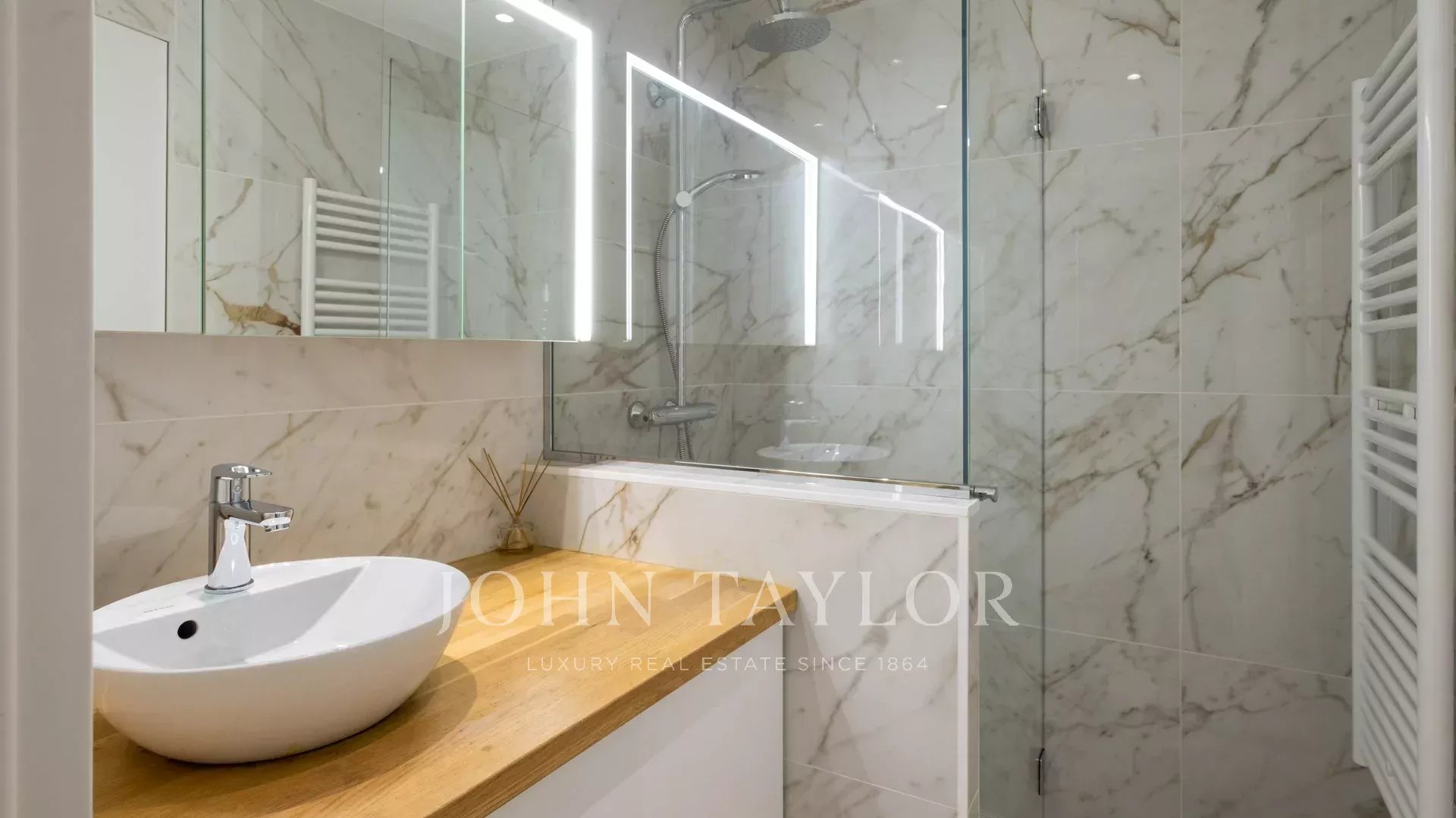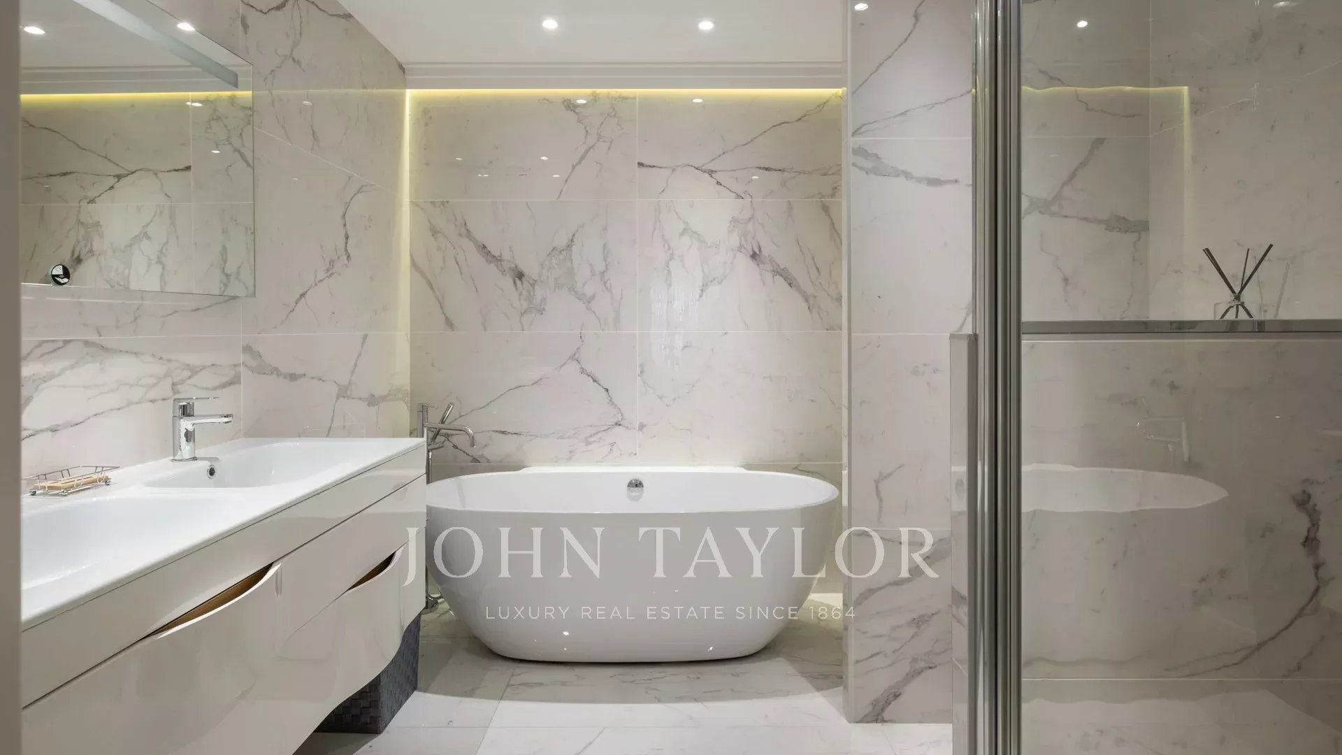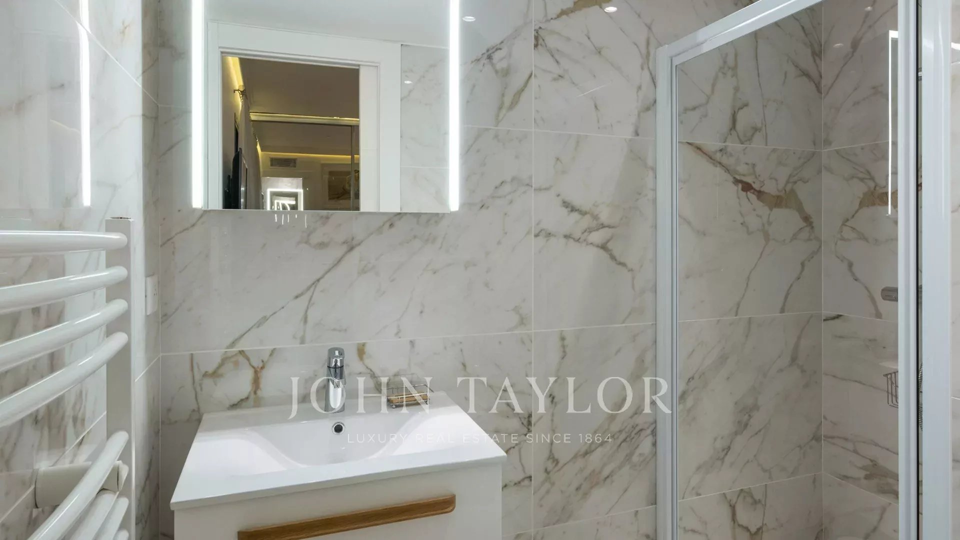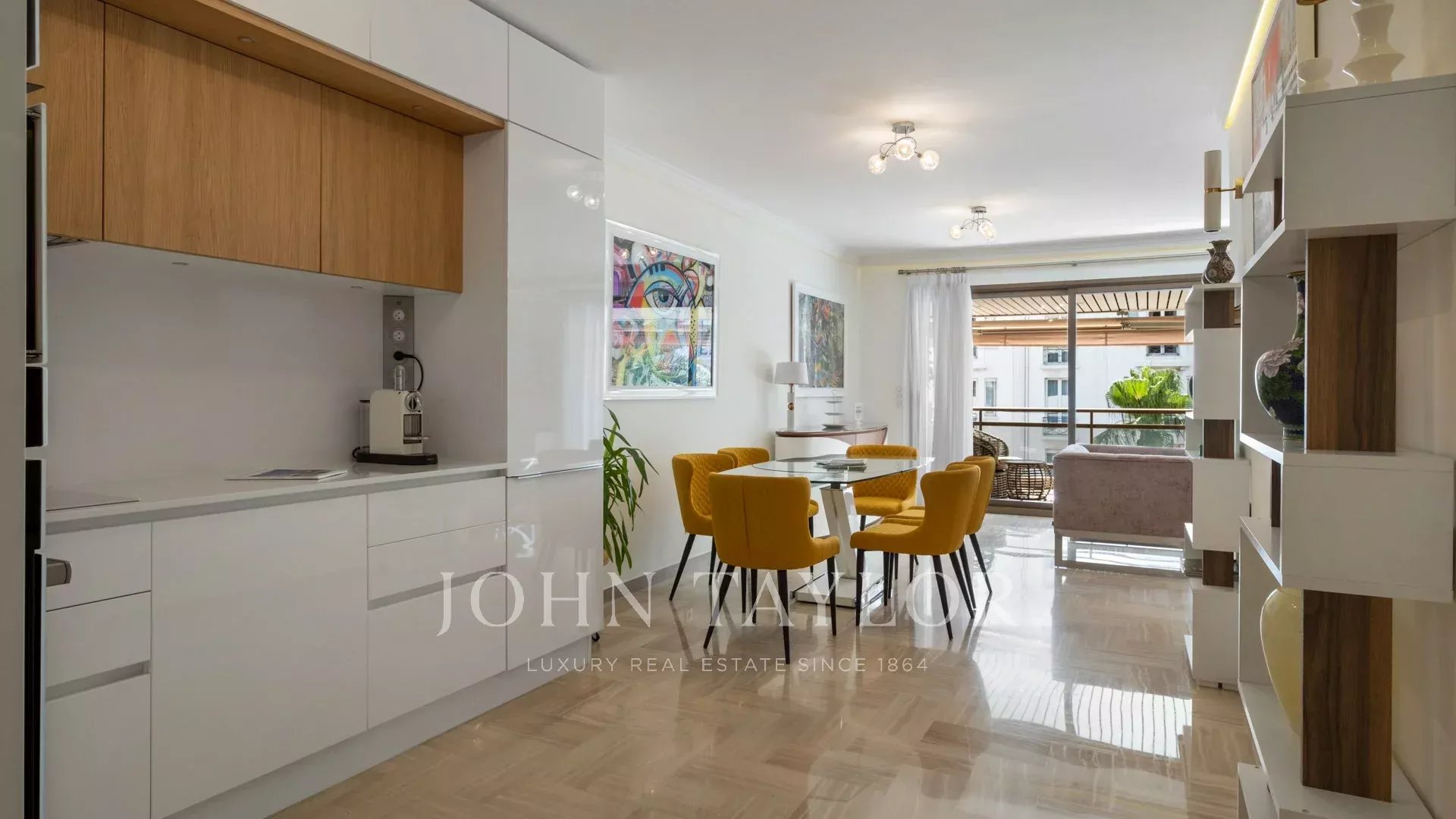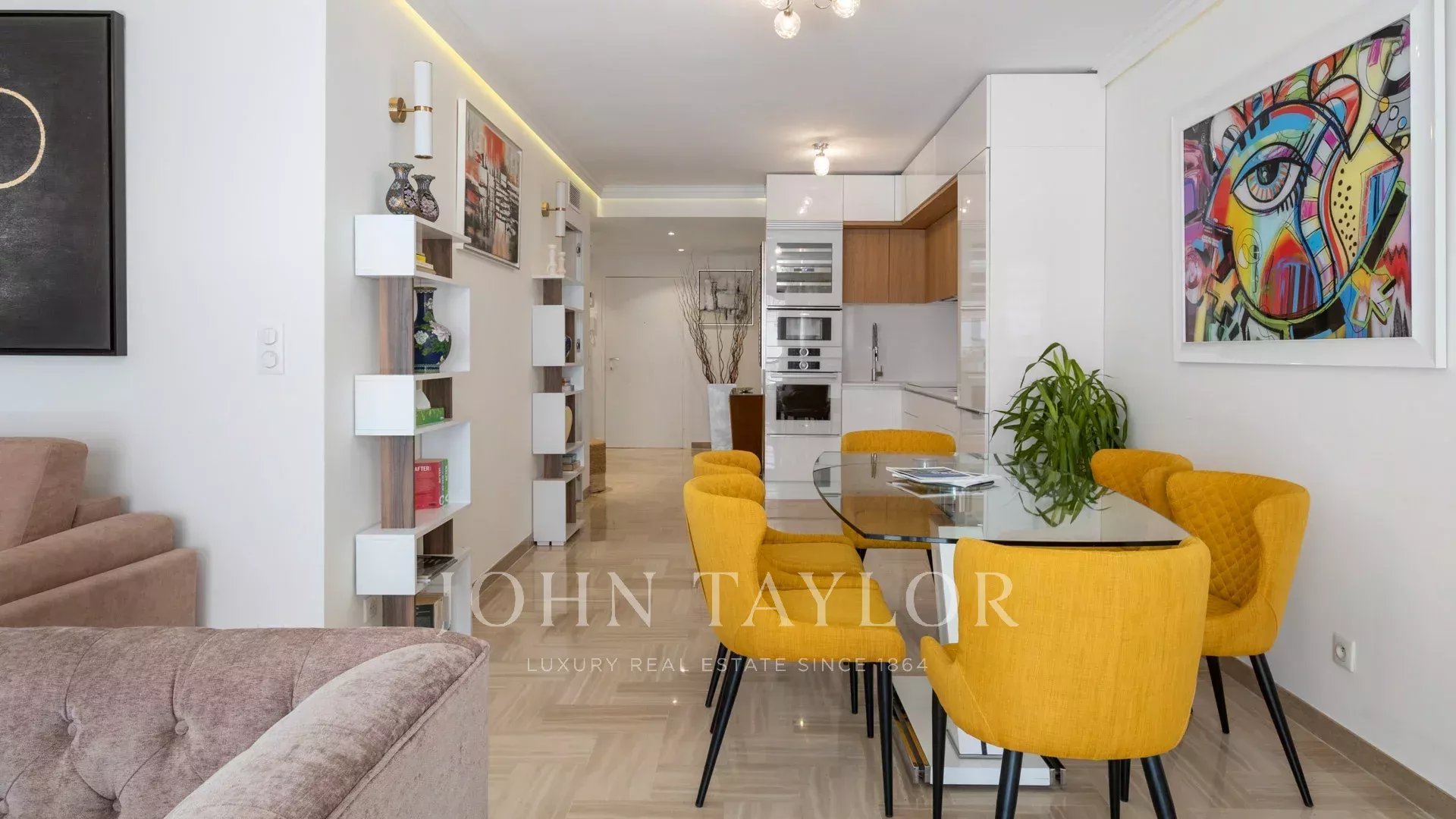 Ideal gelegen, nur 5 Gehminuten vom Palais des Festivals entfernt, bietet diese 87 m² große Wohnung mit einer 27 m² großen, nach Südwesten ausgerichteten Eckterrasse einen schönen Blick auf die Stadt und die Bucht von Cannes und die Croisette.