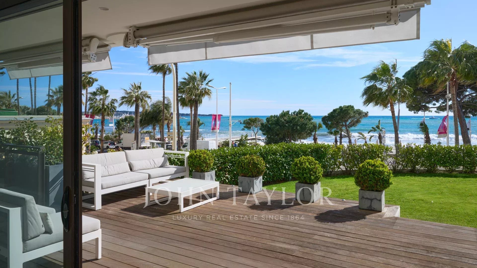 Die privilegierte Lage dieser bewachten Residenz neben dem Carlton Hotel bietet einen atemberaubenden Blick auf die Bucht von Cannes und bietet ein atemberaubendes Panorama auf das Mittelmeer. Genießen Sie diesen außergewöhnlichen Blick von der ca. 100 m² großen Gartenterrasse, die sich ideal für entspannende Momente oder geschäftliche Termine eignet.
