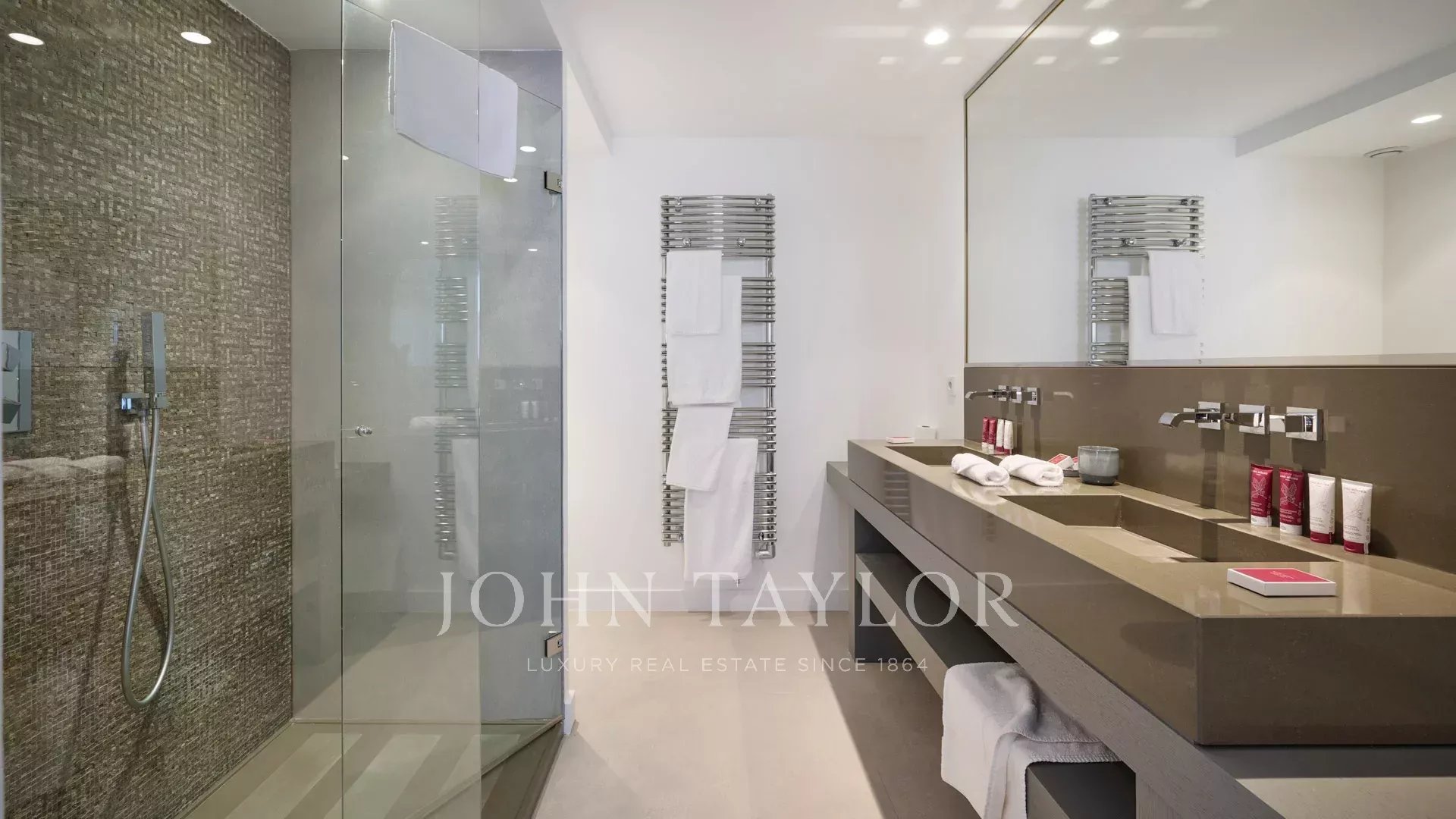 Das Innere der Wohnung besteht aus fünf Schlafzimmern, jedes mit eigenem Duschbad, was Privatsphäre und Bequemlichkeit für alle Gäste garantiert.
