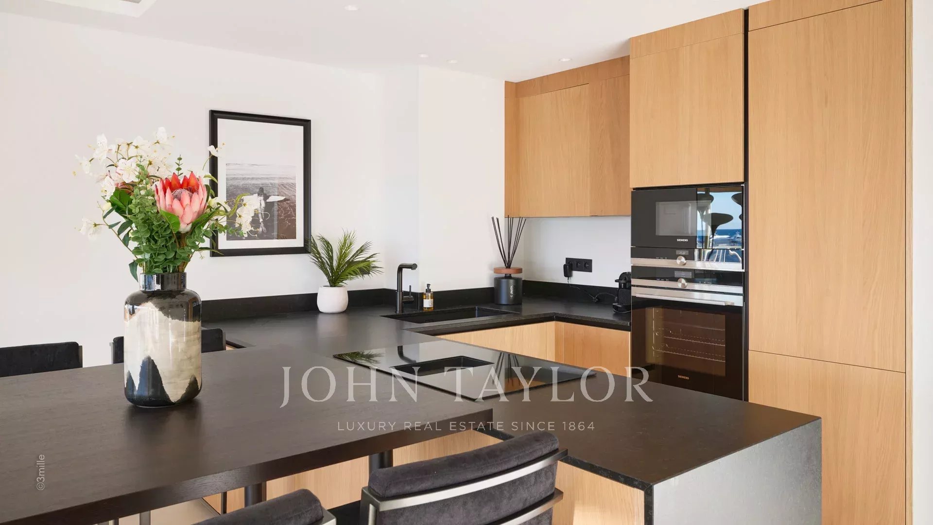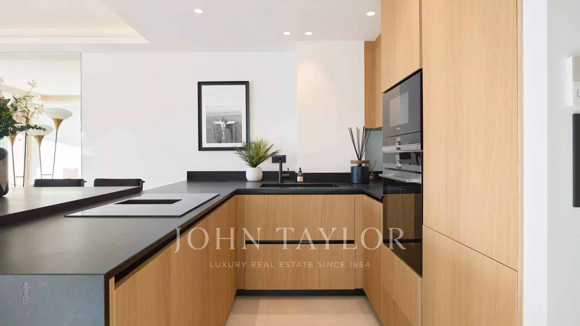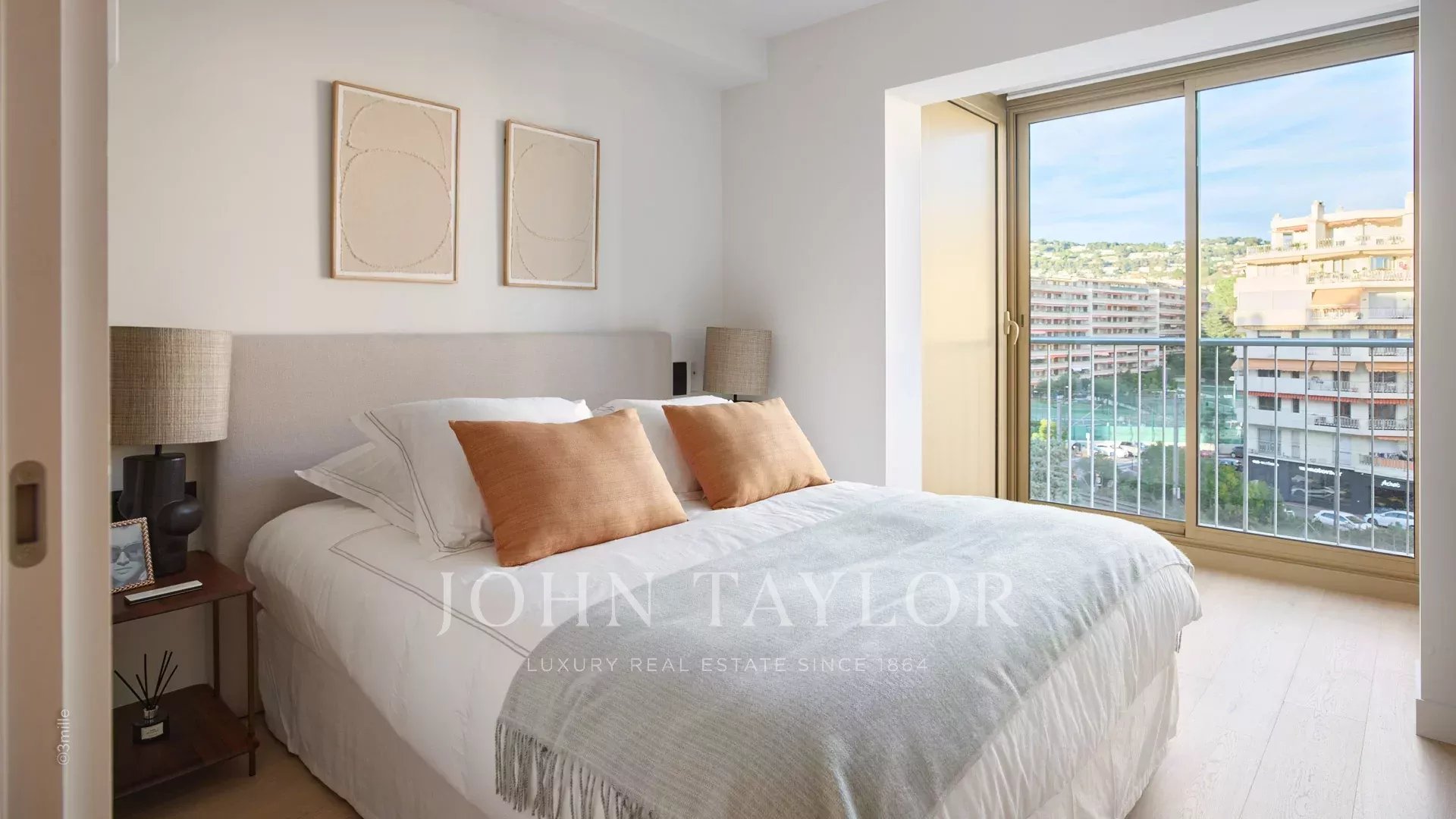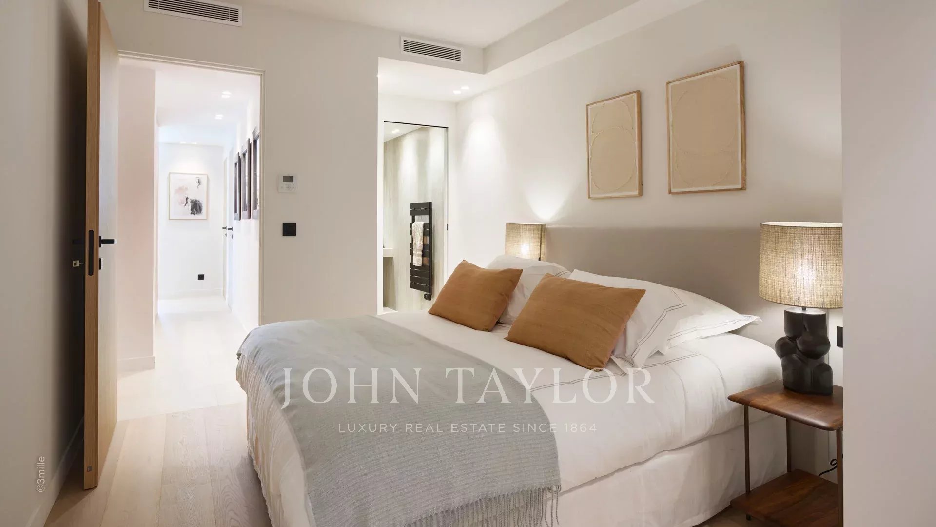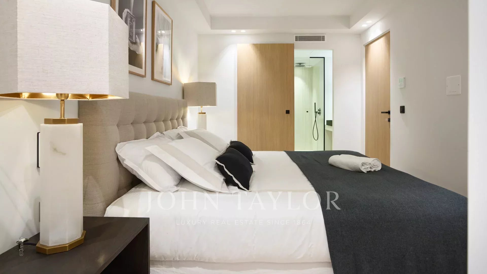 Die Wohnung besteht aus einem Wohnraum mit Küche, zwei Schlafzimmern en suite und einer 10 m² großen Terrasse.