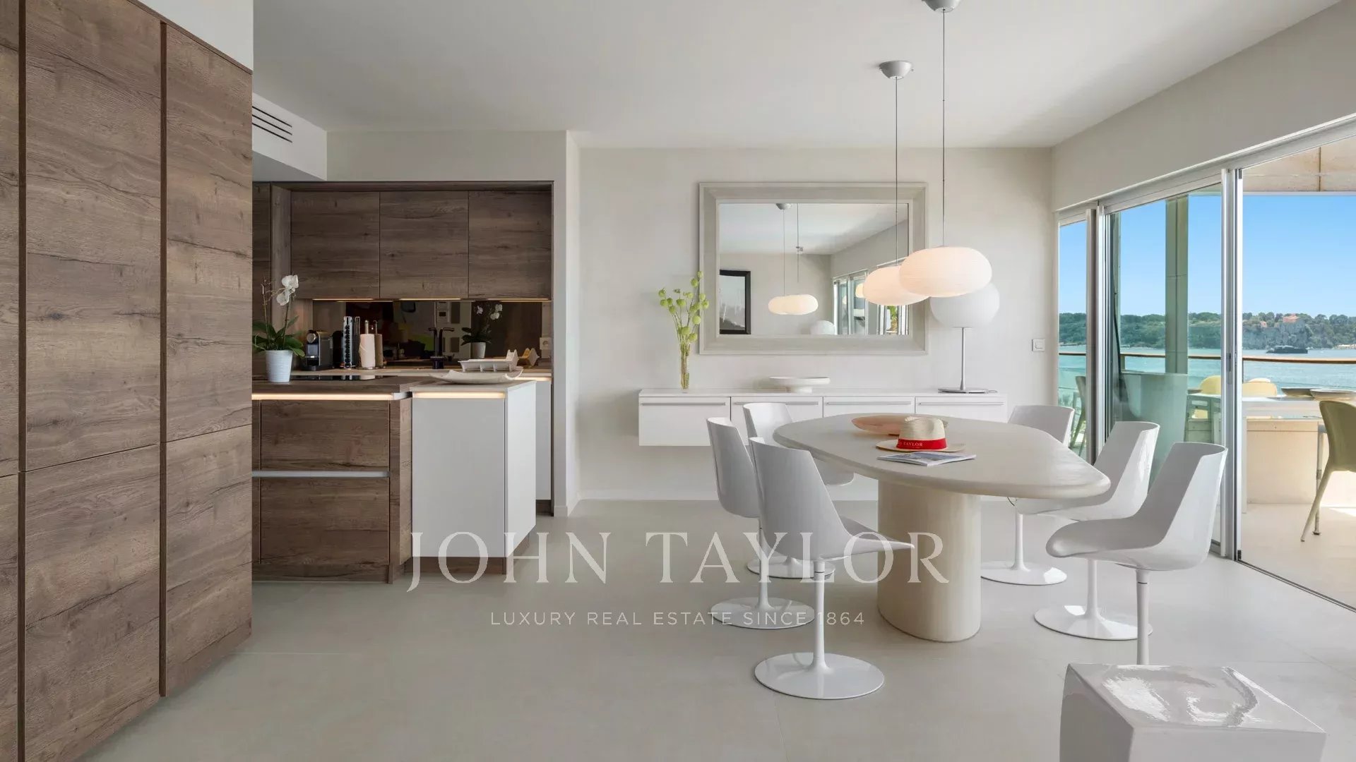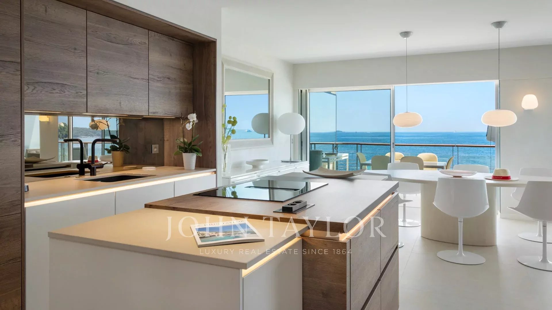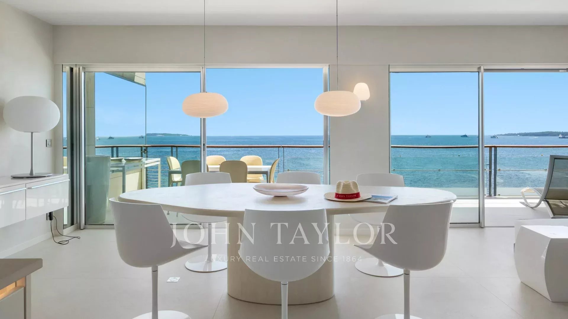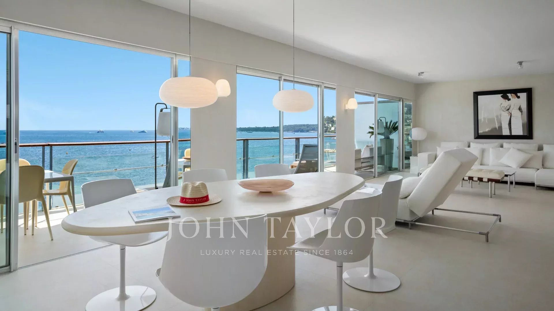 Großes Wohn-/Esszimmer, das sich auf die Terrasse öffnet, Meerblick