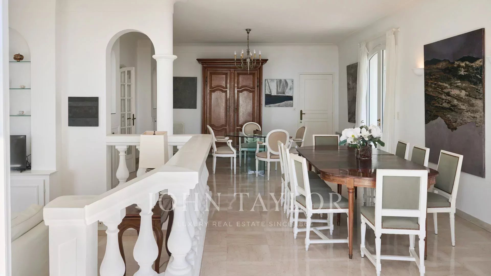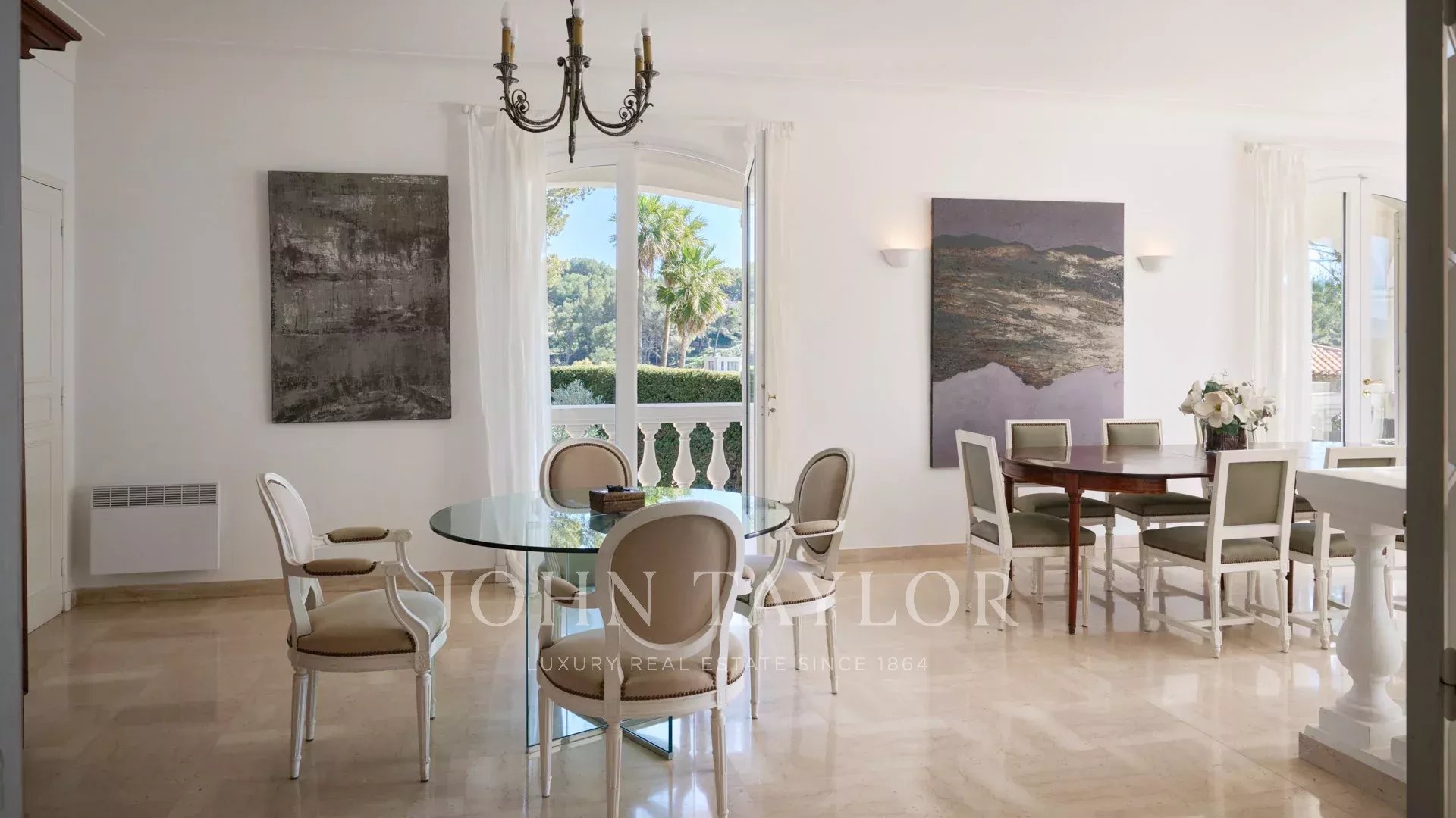 Klimatisiertes Wohn-/Esszimmer, das sich auf die Terrasse öffnet, Meerblick.