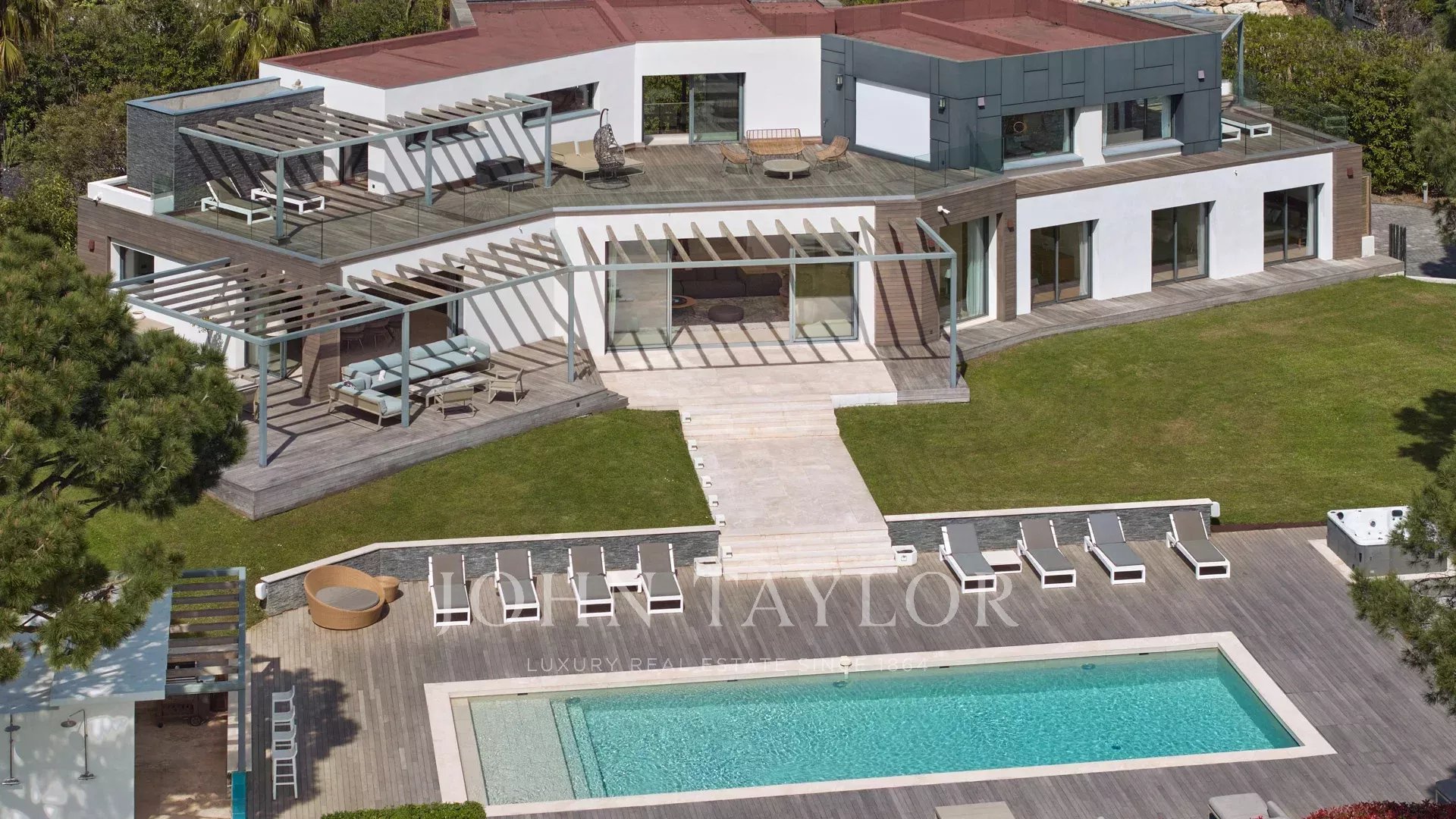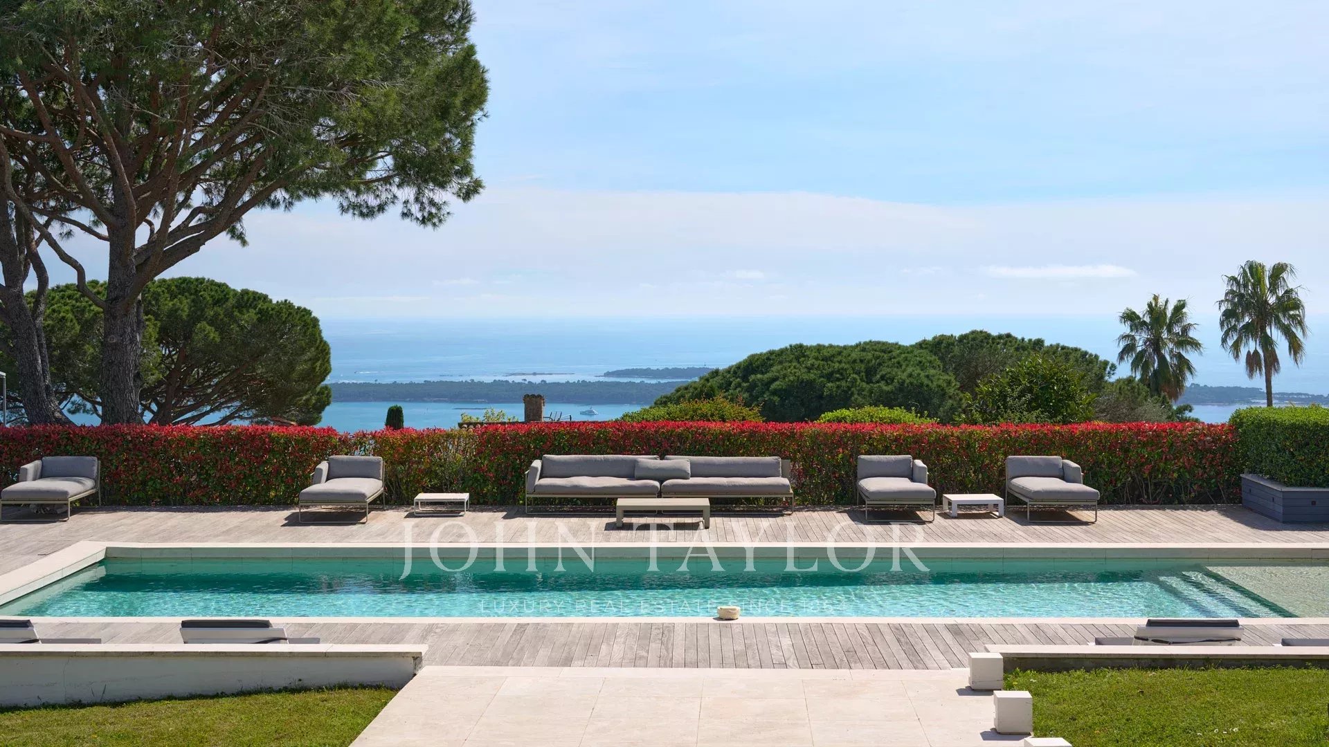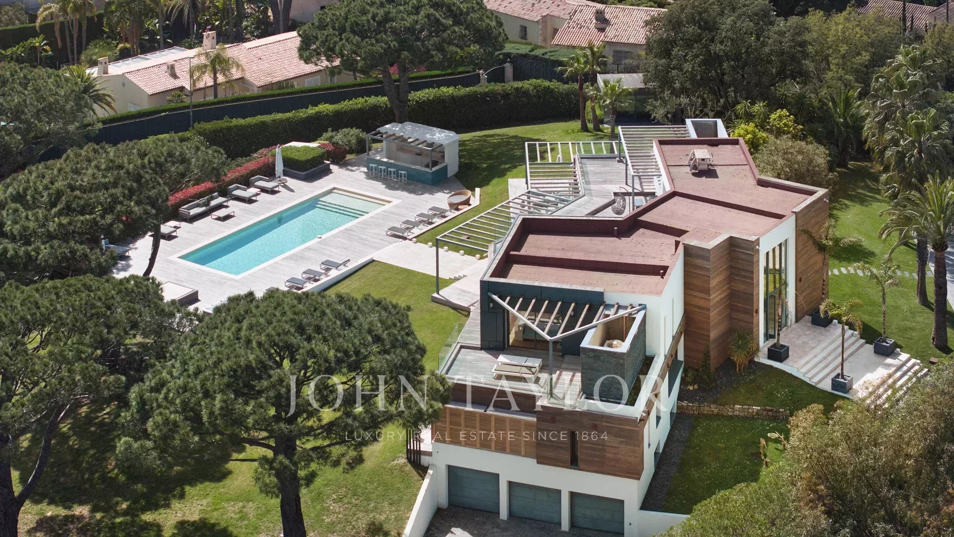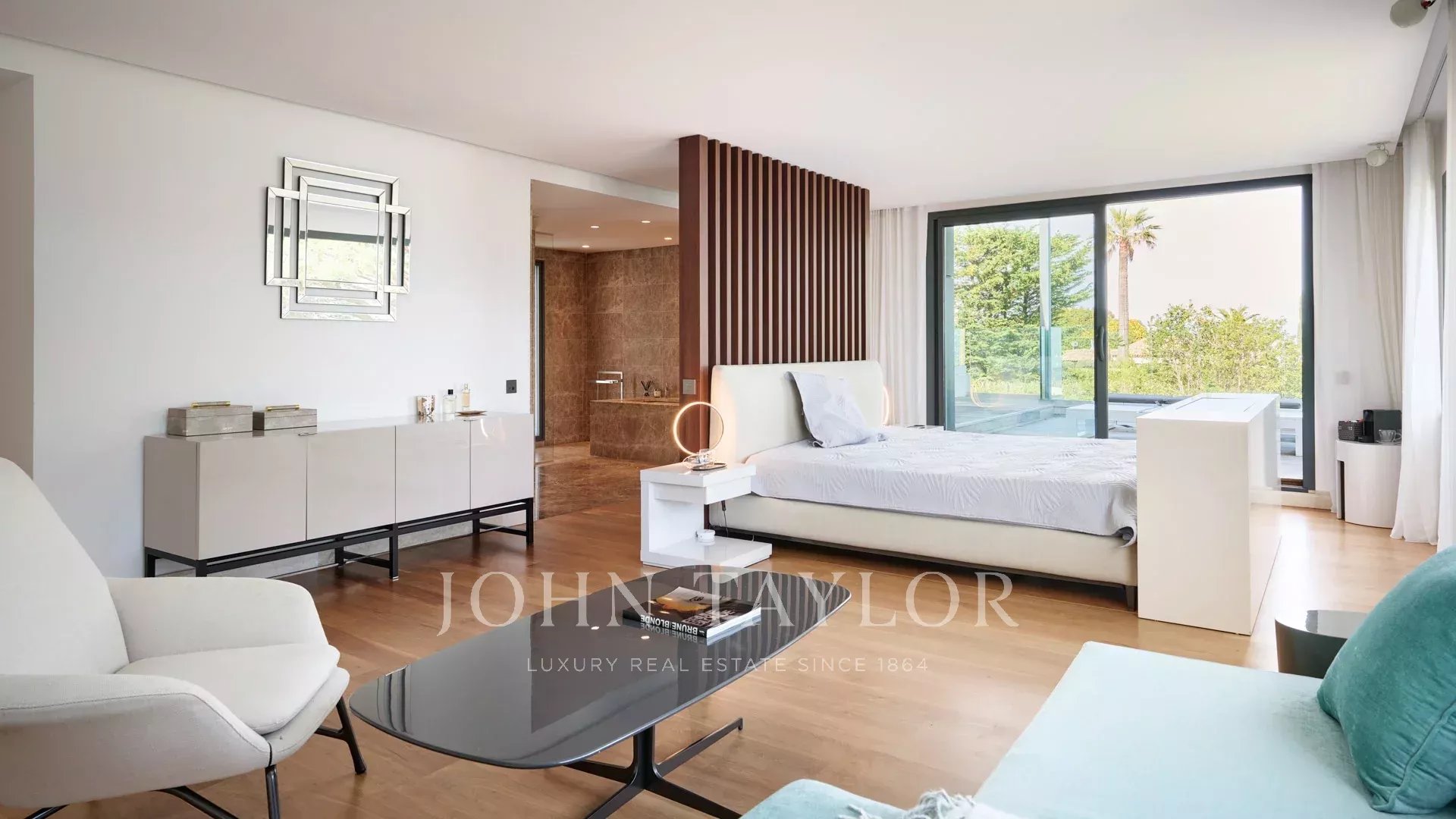 Auf den Anhöhen von Cannes, mit einem einzigartigen Panorama auf die Iles de Lérins, verbindet diese wunderschöne zeitgenössische Villa Holz und Beton inmitten eines ca. 6.200 m2 großen Parks. Die Villa wurde vollständig renoviert und besticht durch ihre großzügigen Räume, ihre hochwertigen Leistungen und ihre drei großen Terrassen.