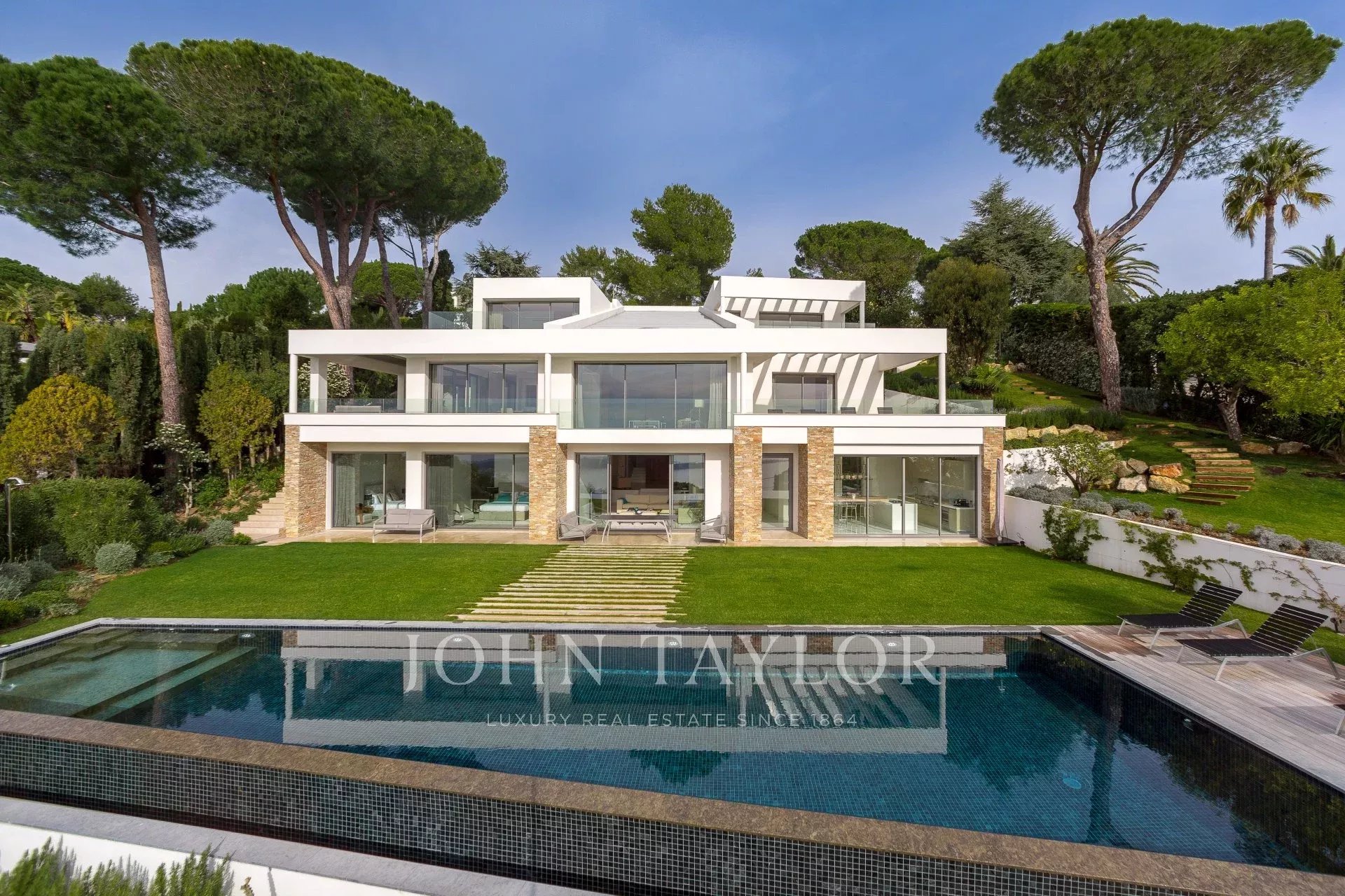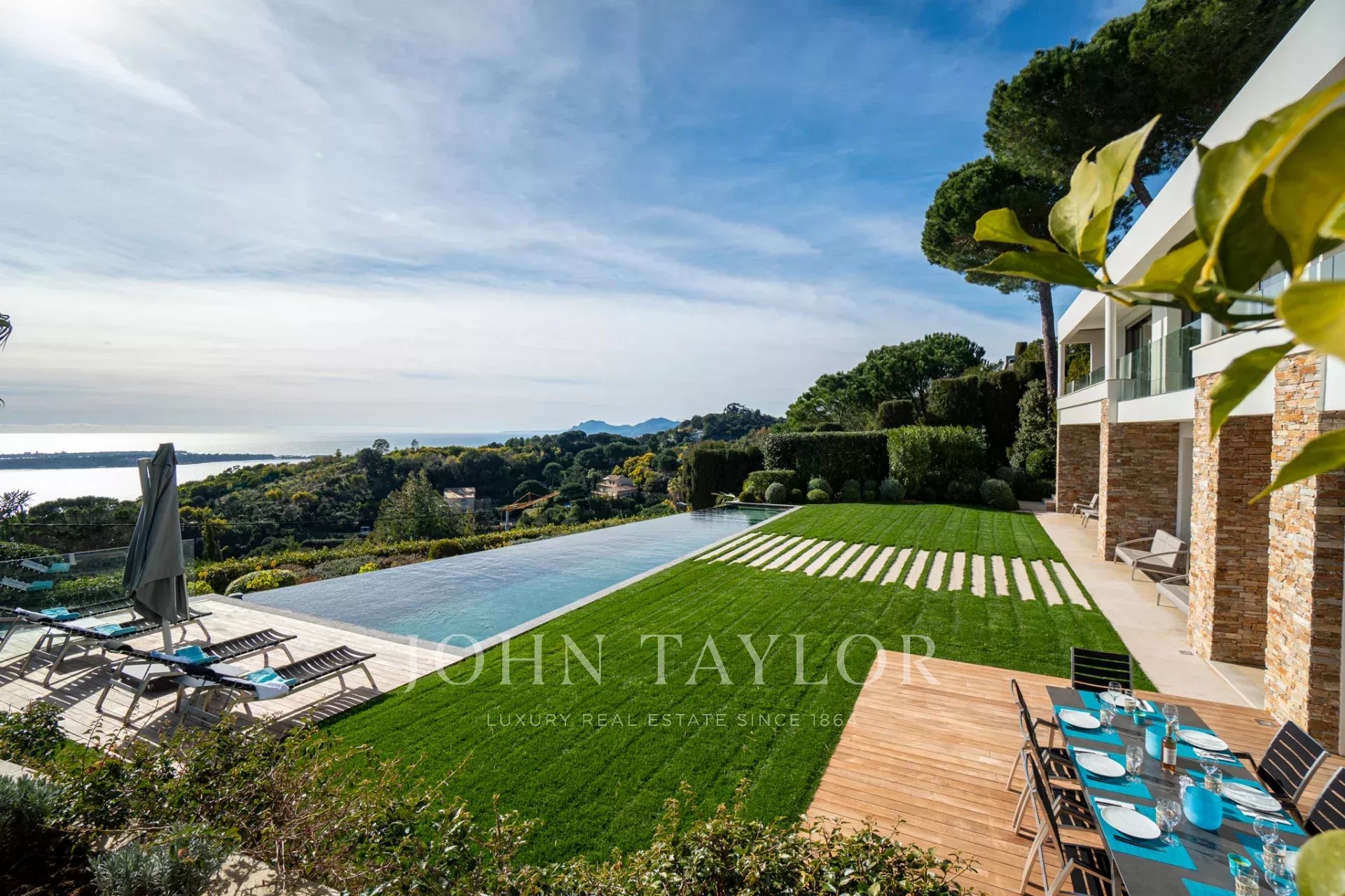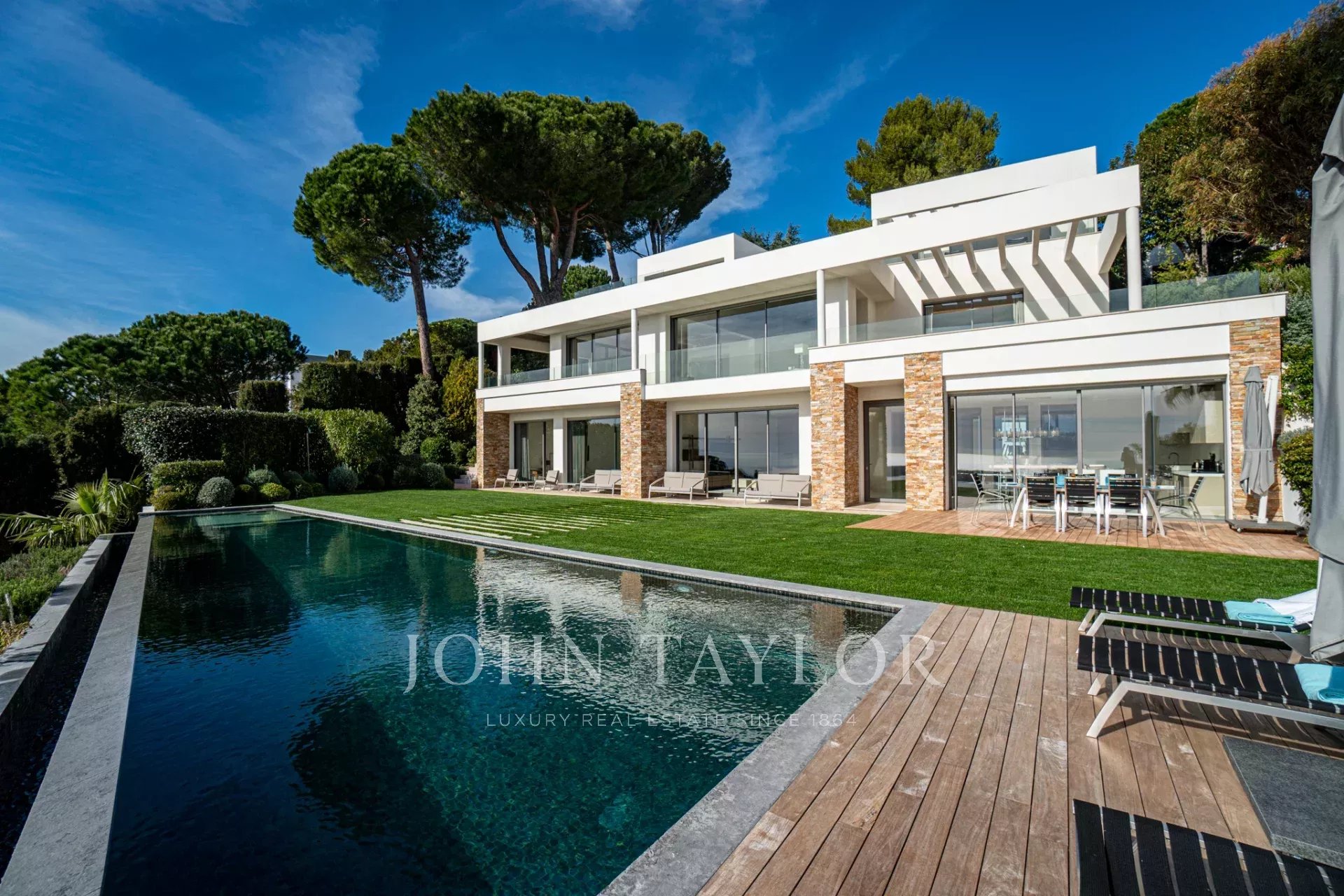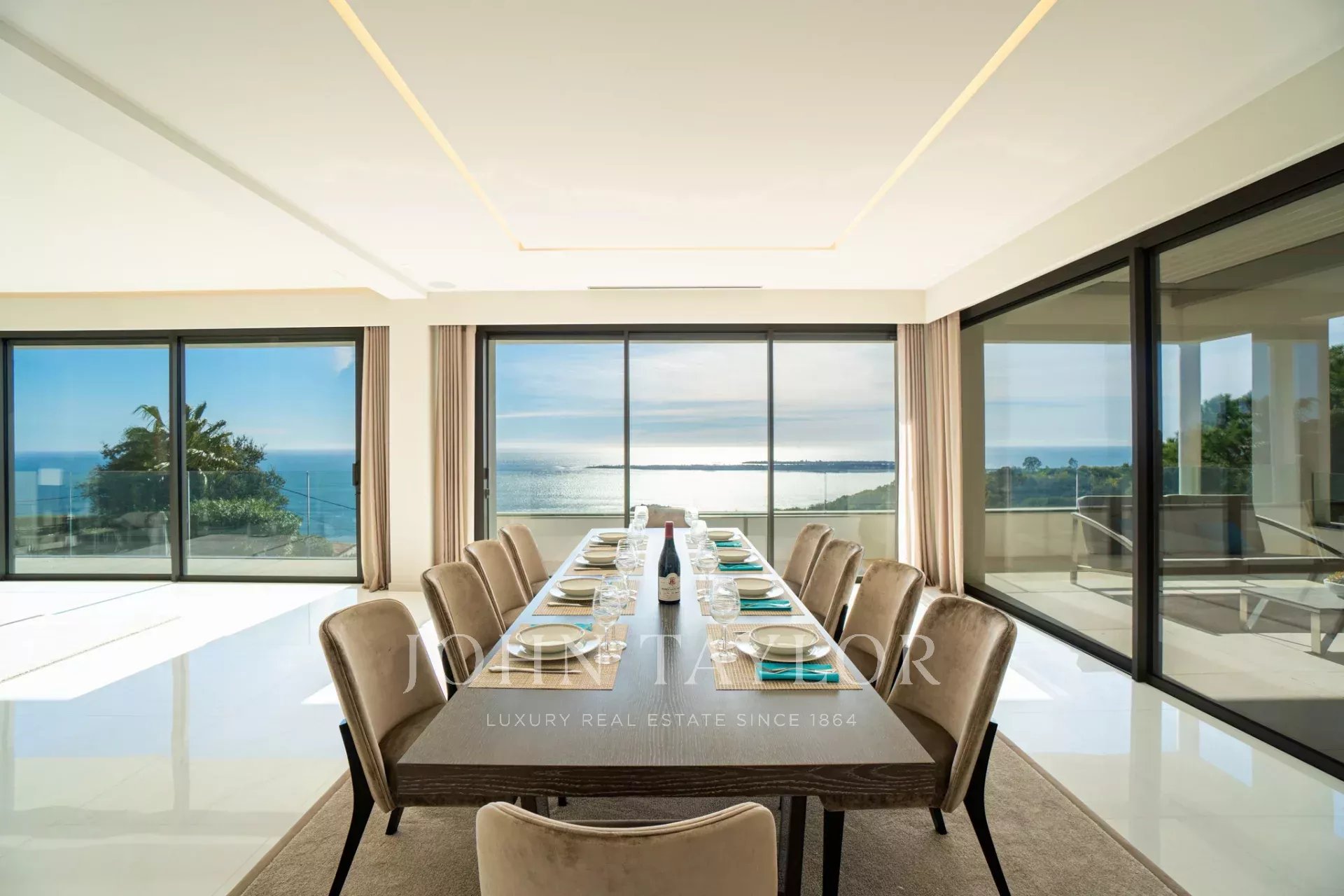Auf den Höhen von Cannes, in dominanter Lage und mit Panoramablick auf das Meer, die Lérins-Inseln, Cap d'Antibes und das Esterel-Massiv, schöne klimatisierte Villa im zeitgenössischen Stil, neu mit hochwertigen Dienstleistungen, mit einer Wohnfläche von ca. 630 m² auf einem sehr schönen Grundstück von ca. 2.000 m².