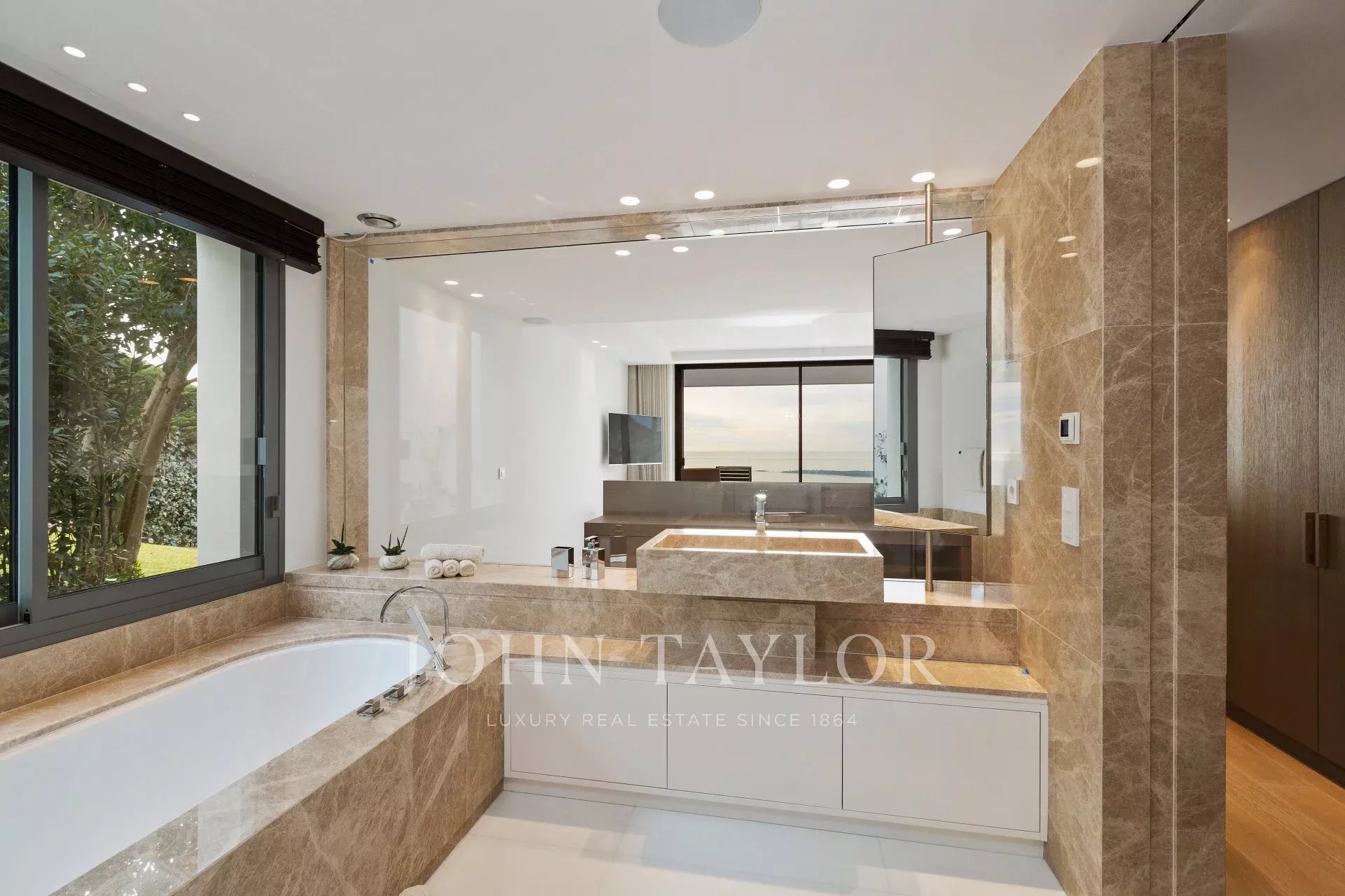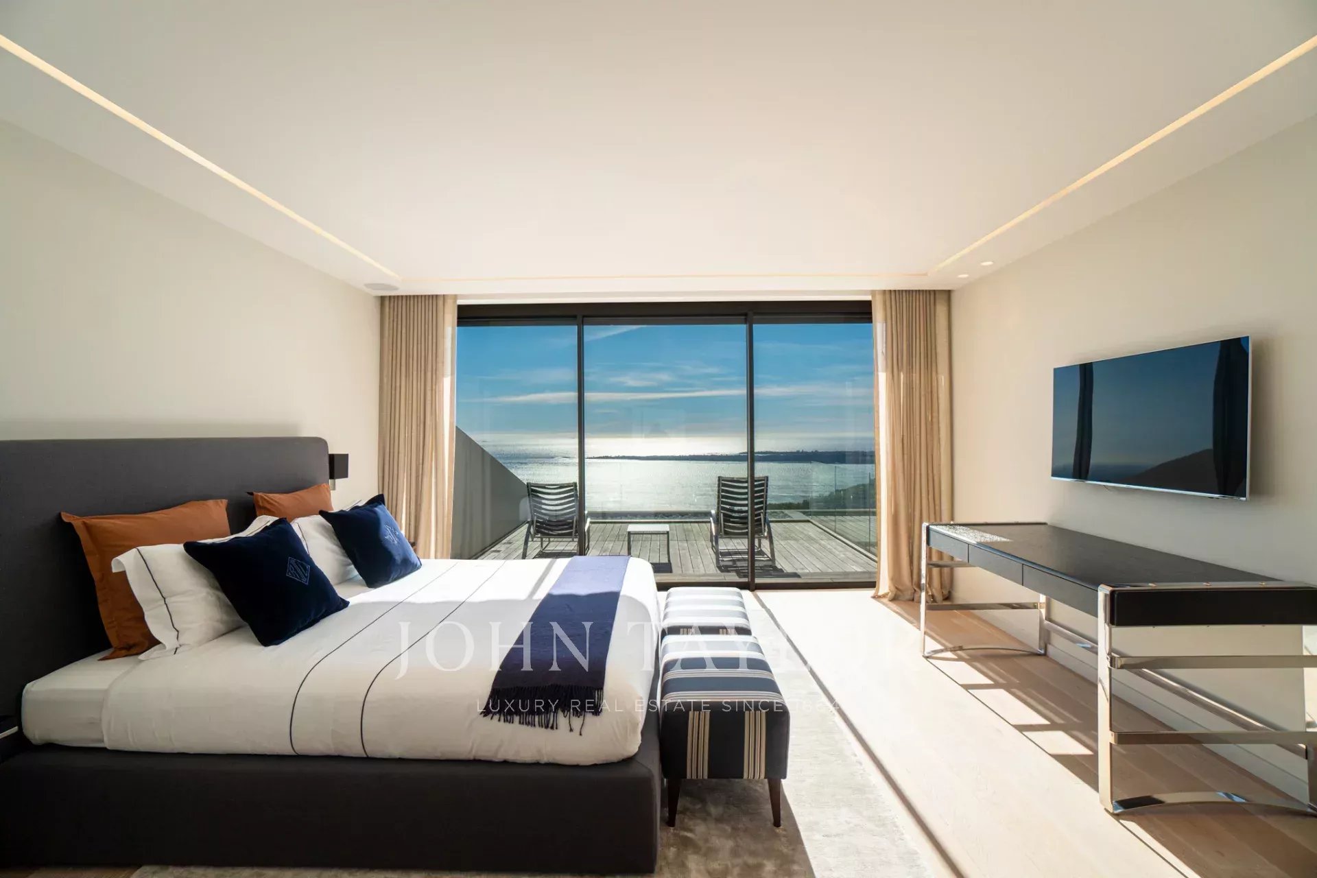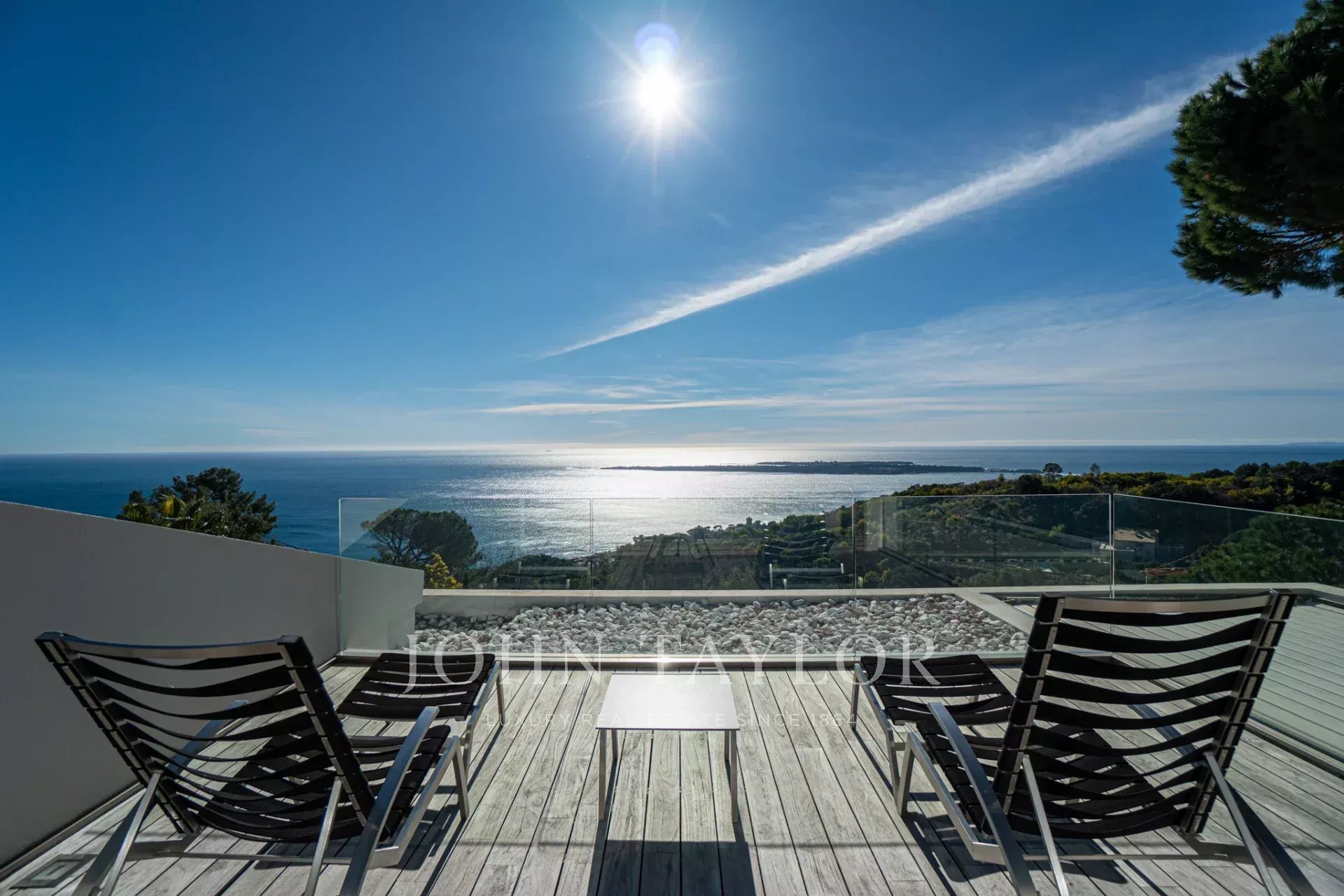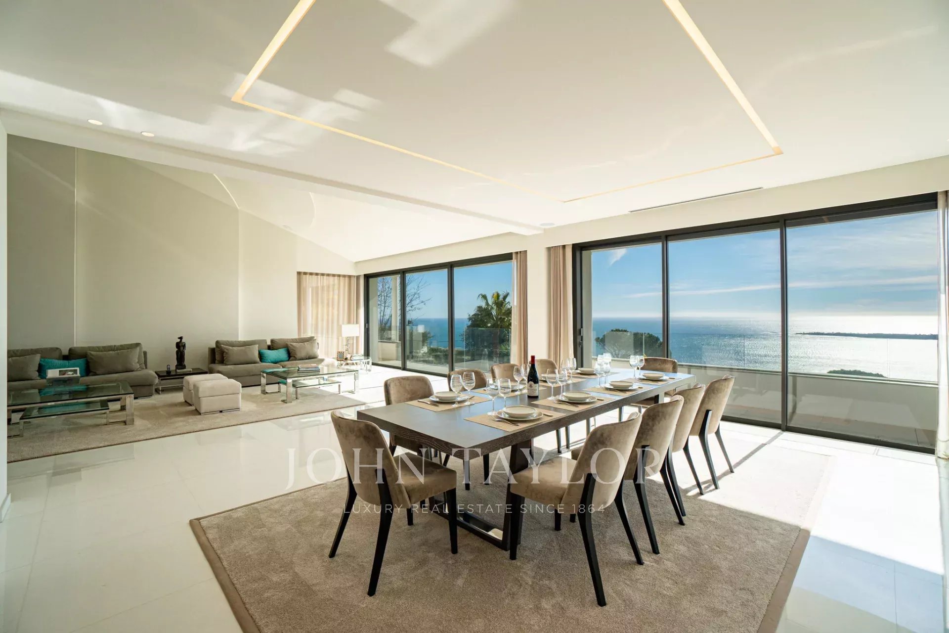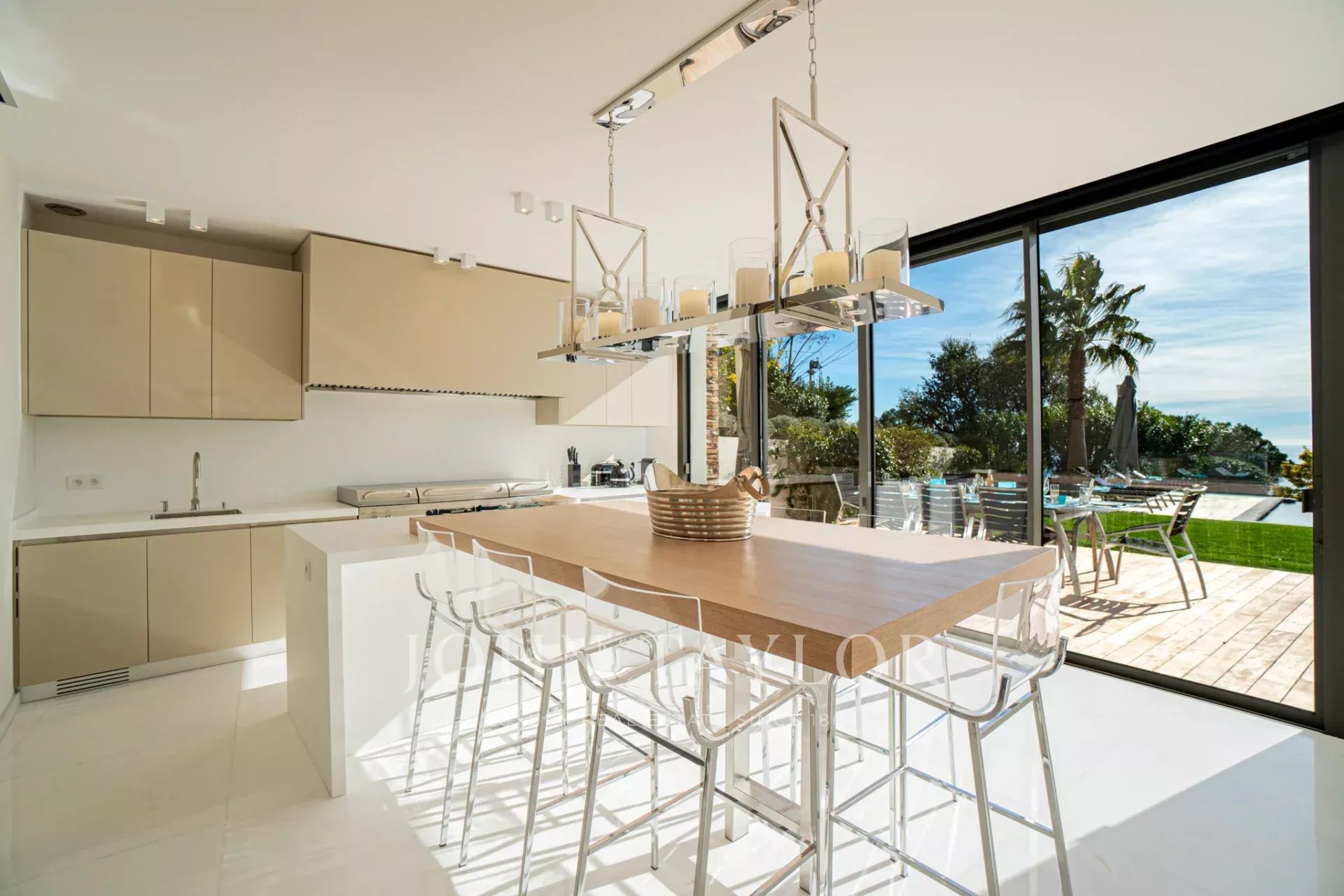Auf den Höhen von Cannes, in dominanter Lage und mit Panoramablick auf das Meer, die Lérins-Inseln, Cap d'Antibes und das Esterel-Massiv, schöne klimatisierte Villa im zeitgenössischen Stil, neu mit hochwertigen Dienstleistungen, mit einer Wohnfläche von ca. 630 m² auf einem sehr schönen Grundstück von ca. 2.000 m².