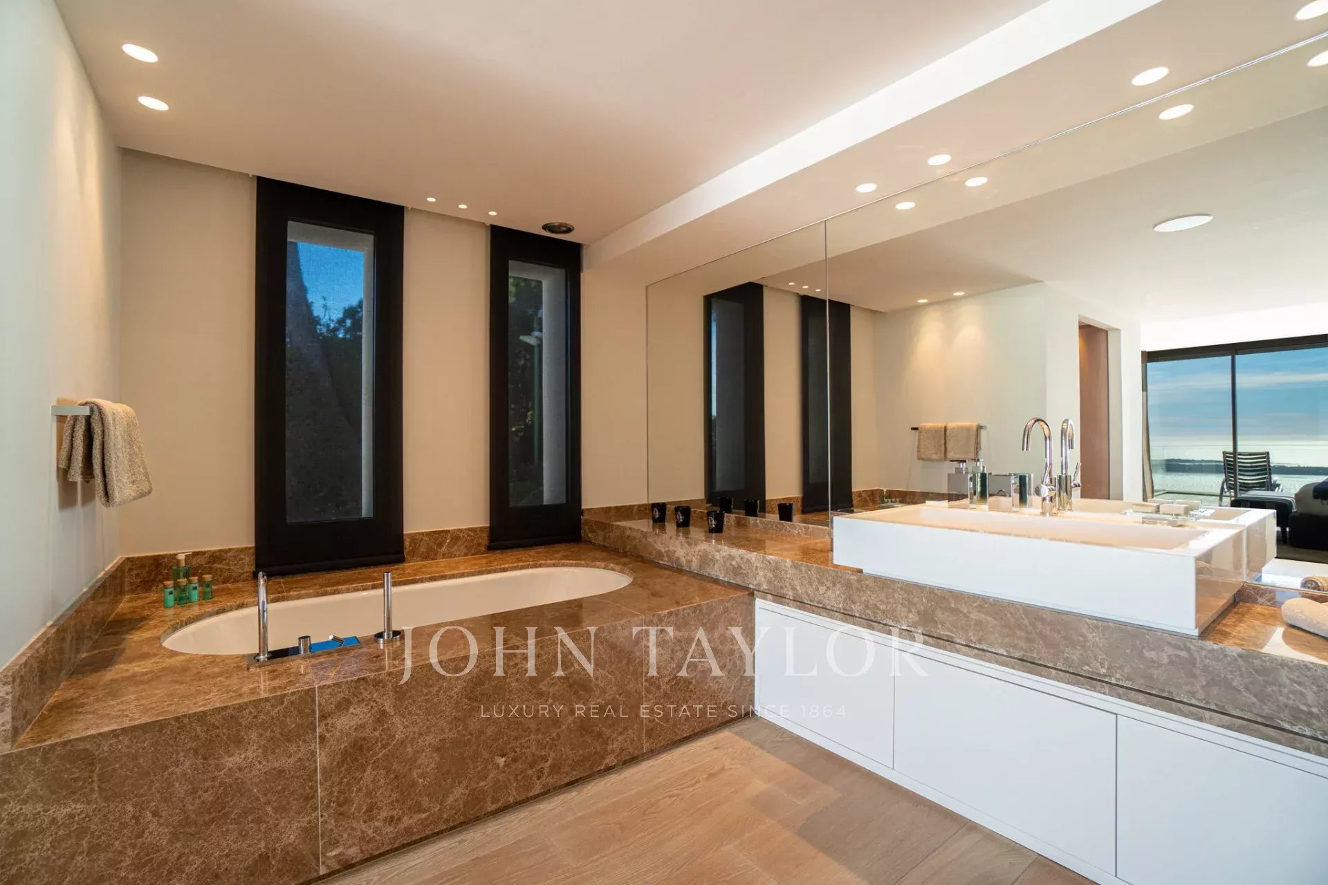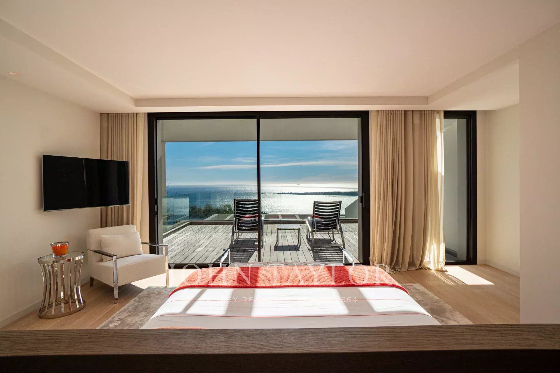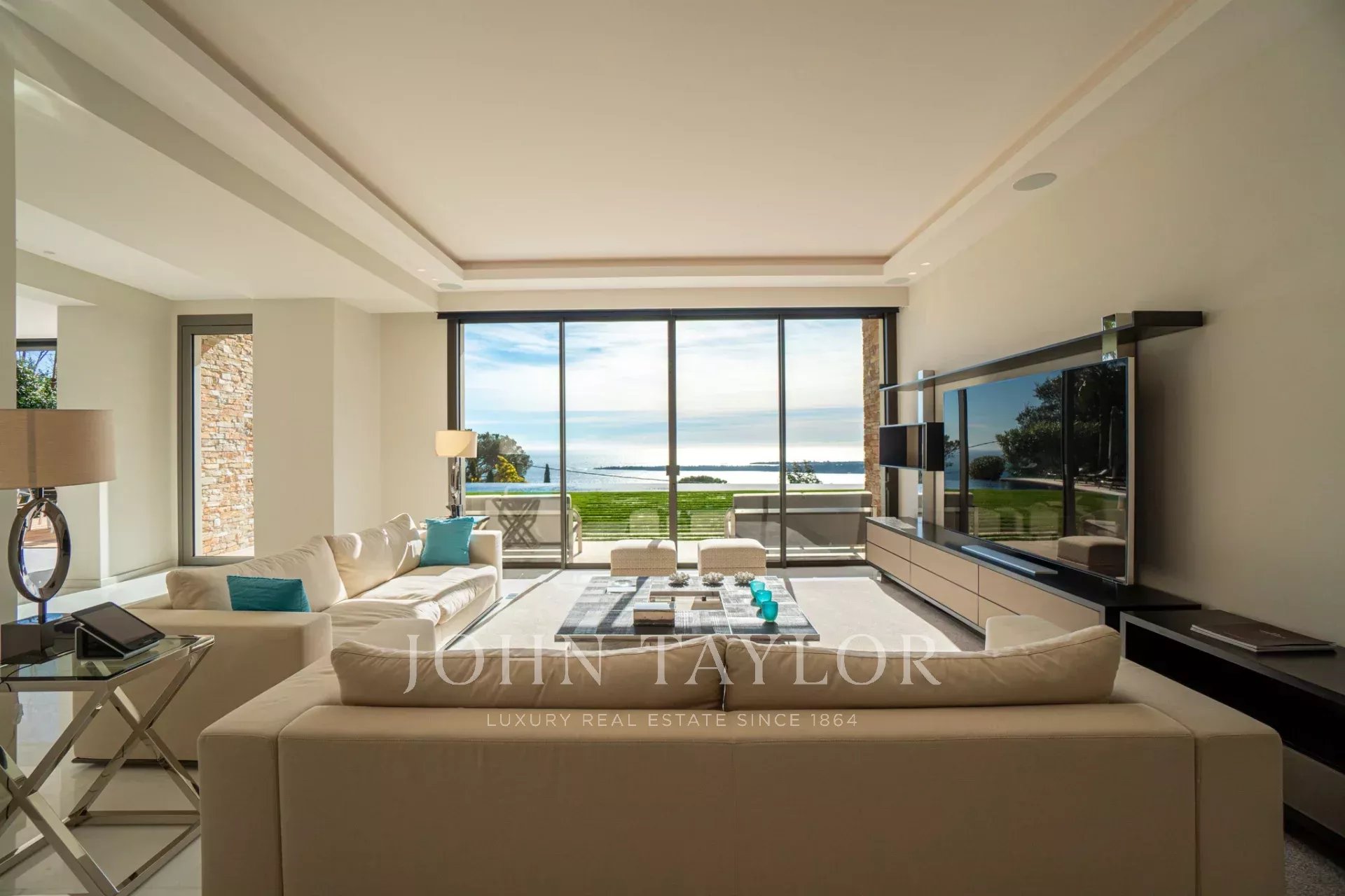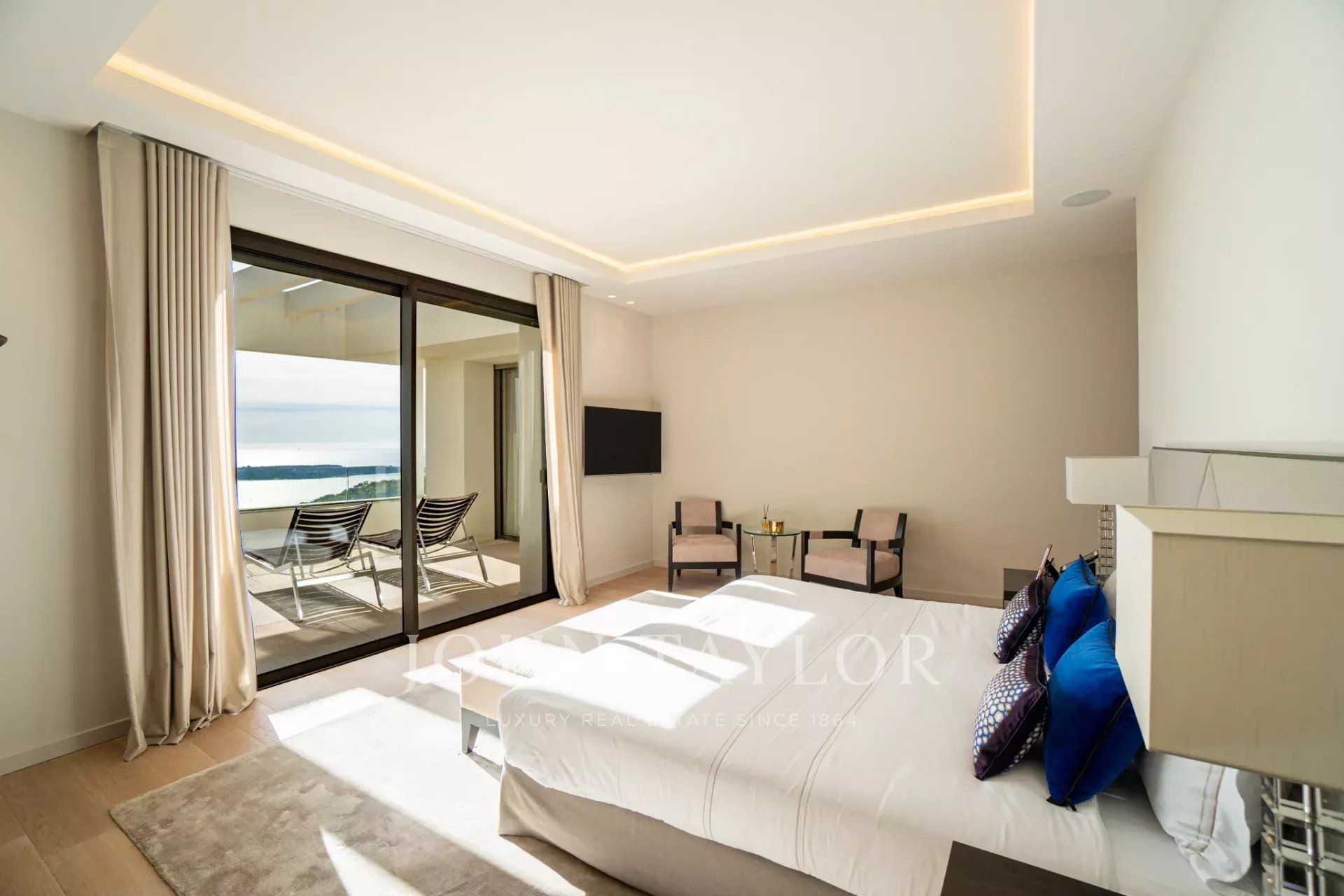 Auf den Höhen von Cannes, in dominanter Lage und mit Panoramablick auf das Meer, die Lérins-Inseln, Cap d'Antibes und das Esterel-Massiv, schöne klimatisierte Villa im zeitgenössischen Stil, neu mit hochwertigen Dienstleistungen, mit einer Wohnfläche von ca. 630 m² auf einem sehr schönen Grundstück von ca. 2.000 m².