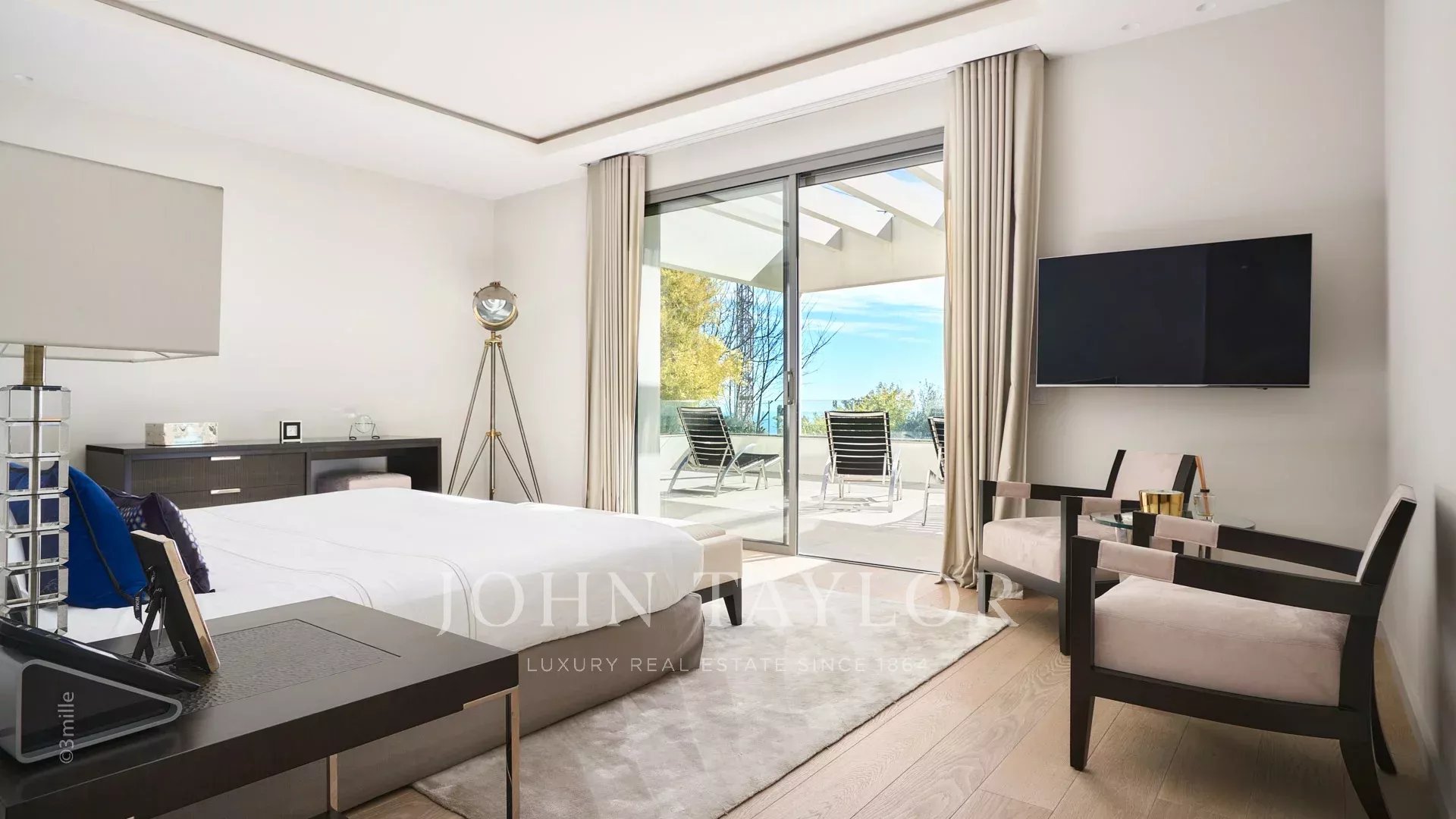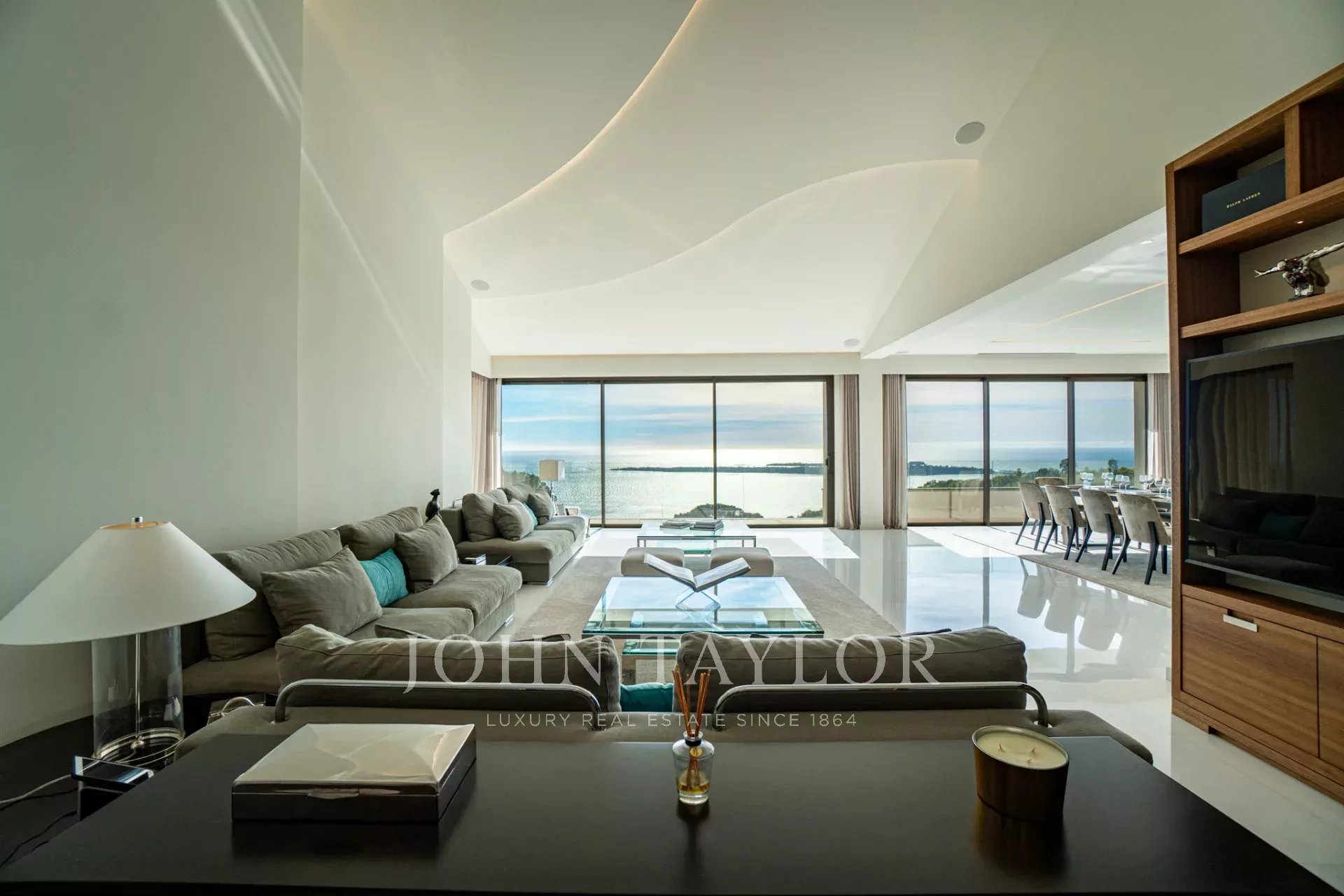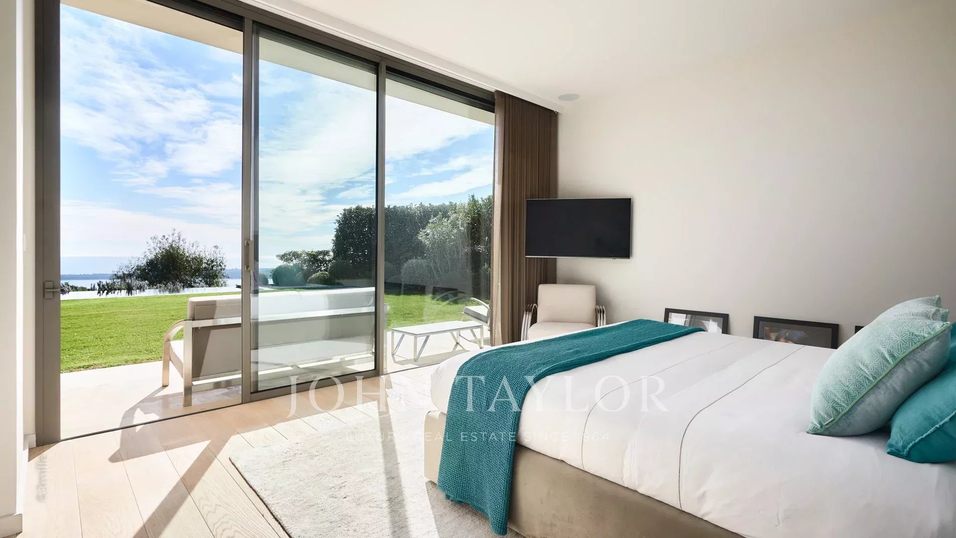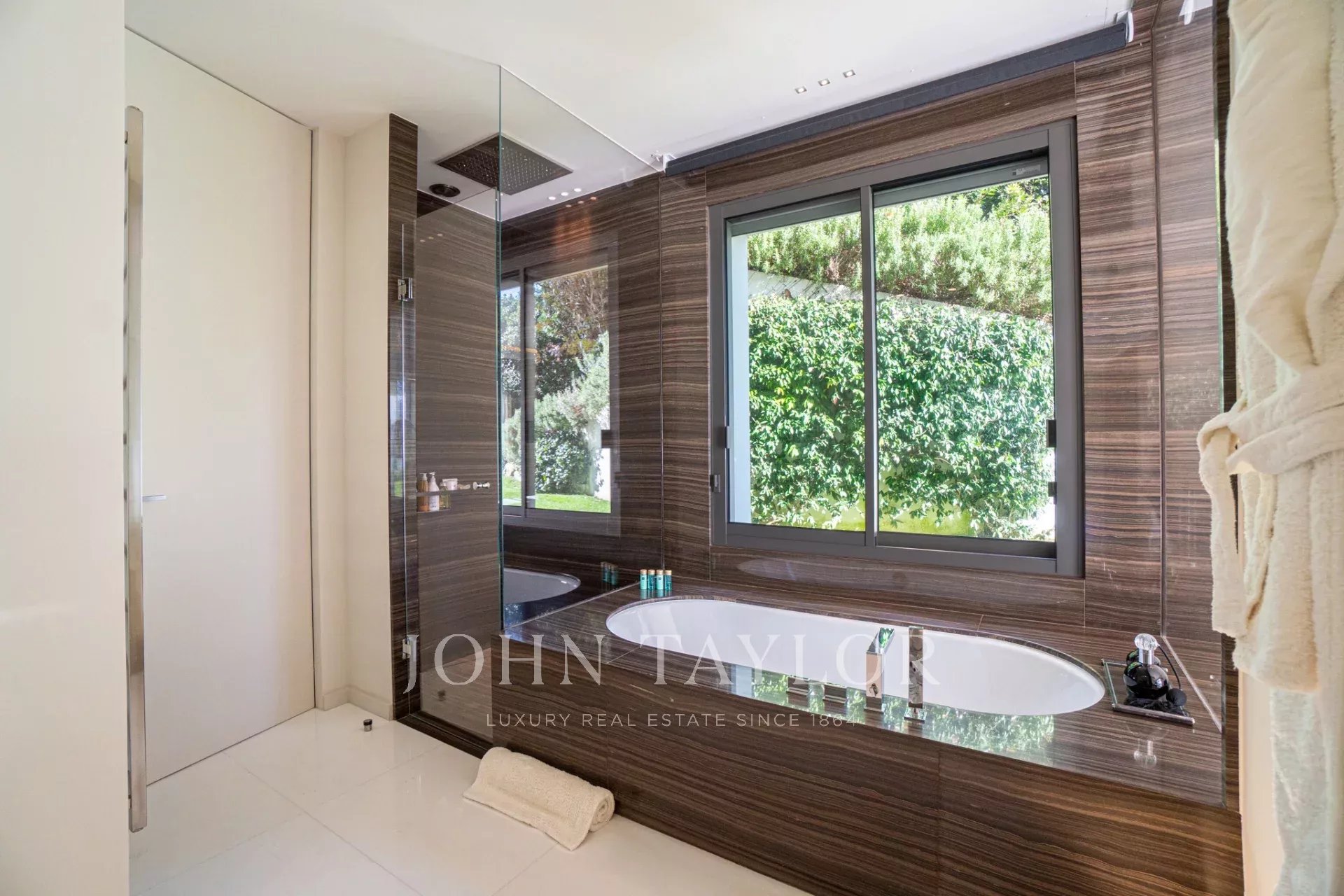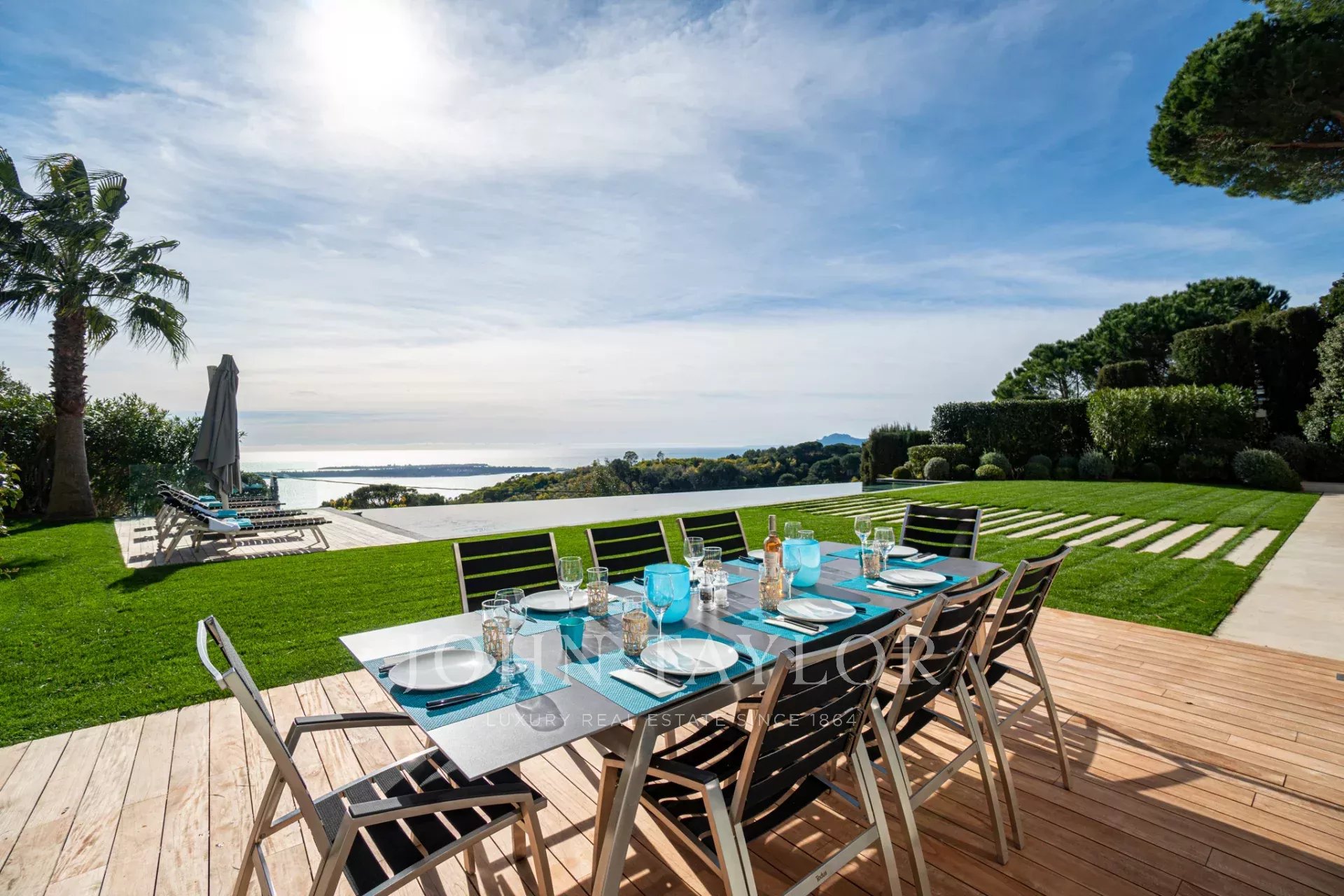 Auf den Höhen von Cannes, in dominanter Lage und mit Panoramablick auf das Meer, die Lérins-Inseln, Cap d'Antibes und das Esterel-Massiv, schöne klimatisierte Villa im zeitgenössischen Stil, neu mit hochwertigen Dienstleistungen, mit einer Wohnfläche von ca. 630 m² auf einem sehr schönen Grundstück von ca. 2.000 m².