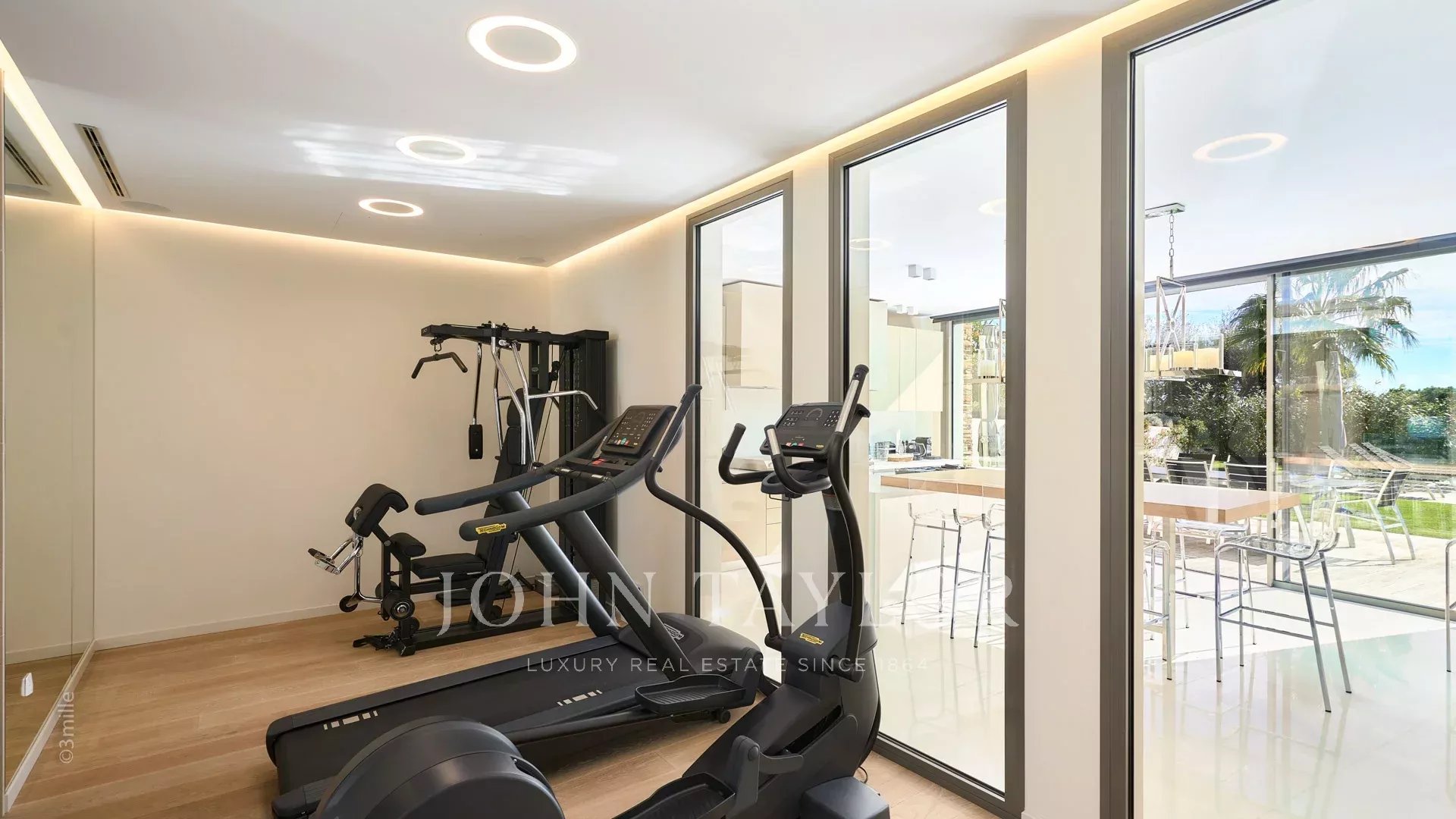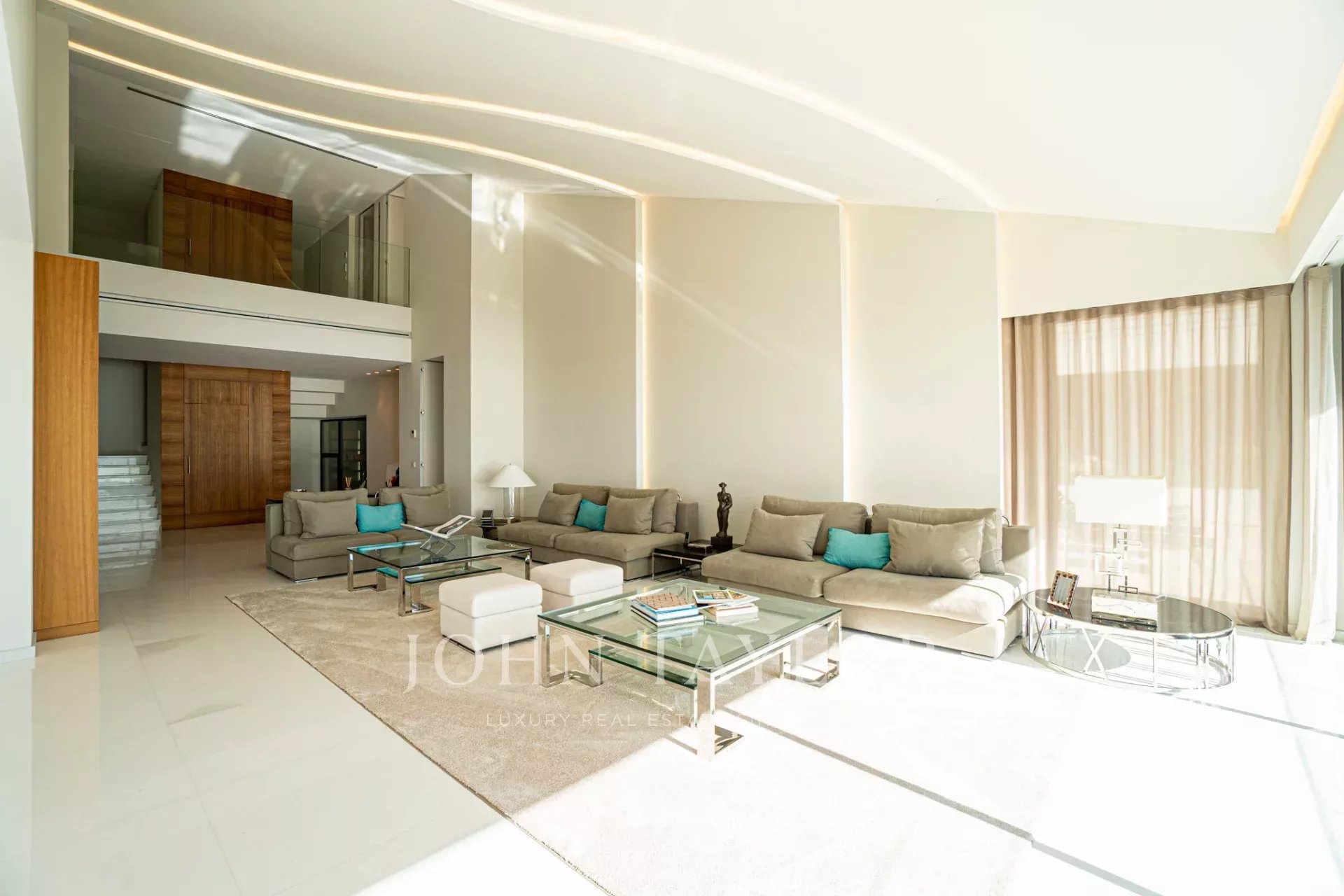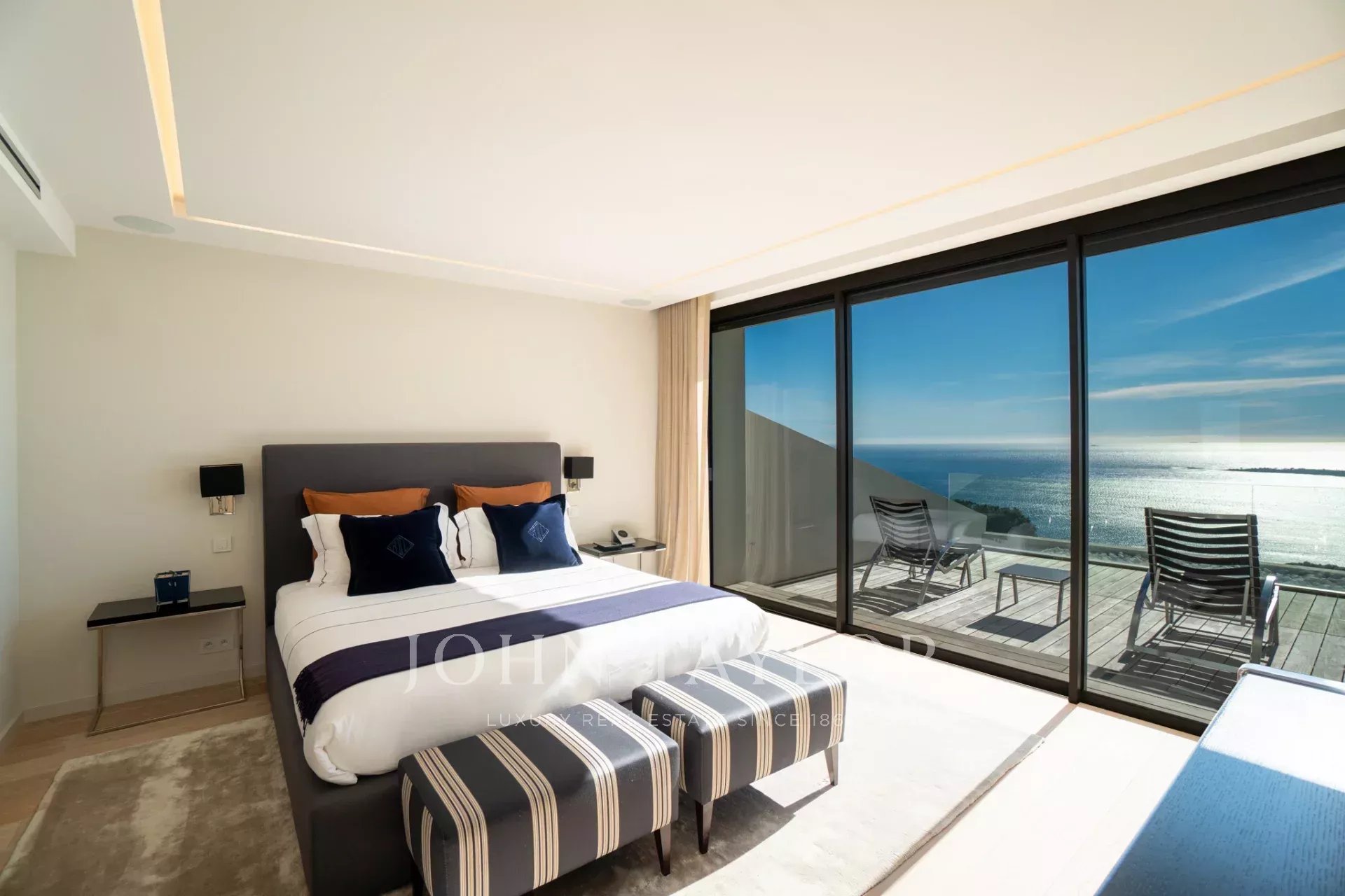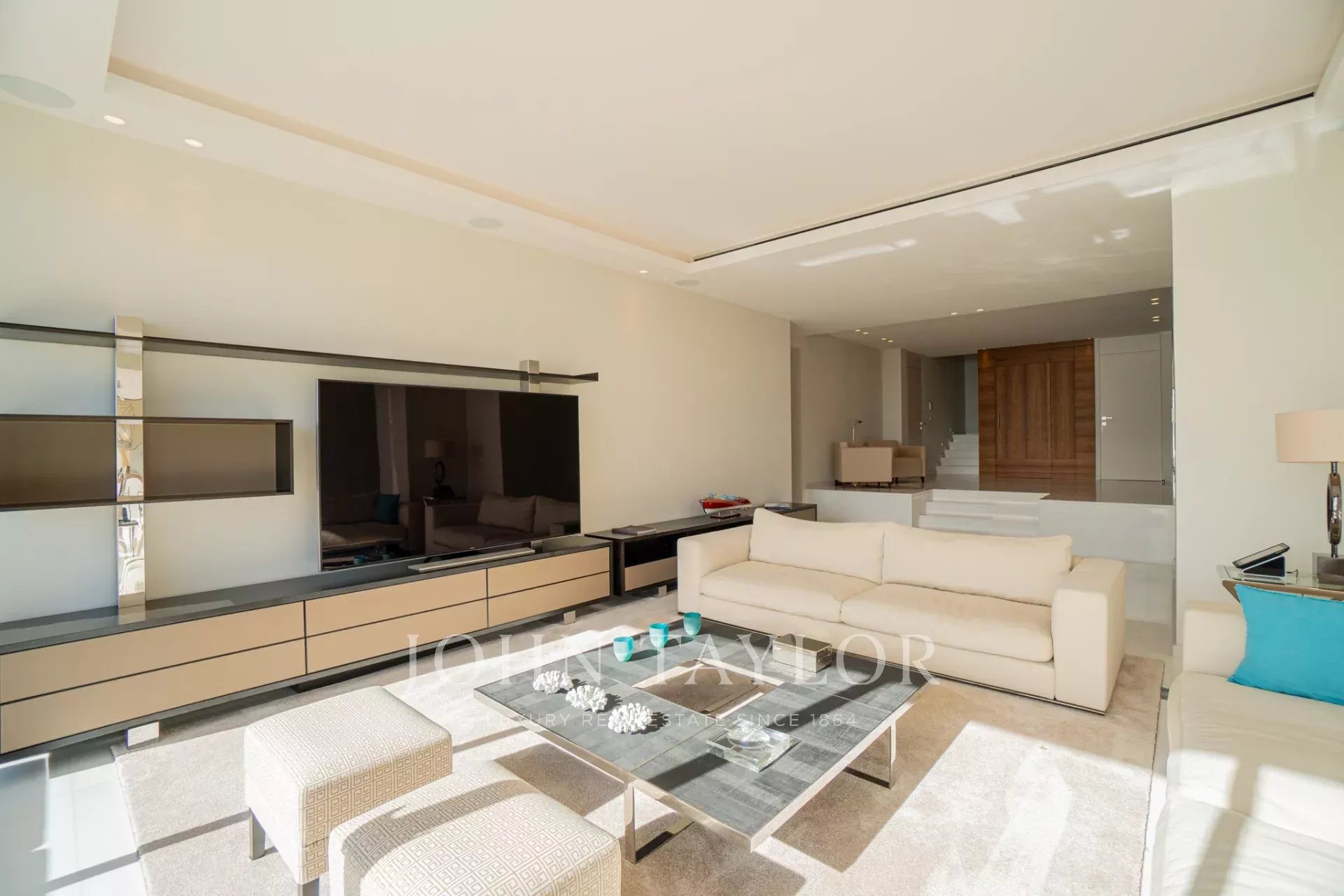 Auf den Höhen von Cannes, in dominanter Lage und mit Panoramablick auf das Meer, die Lérins-Inseln, Cap d'Antibes und das Esterel-Massiv, schöne klimatisierte Villa im zeitgenössischen Stil, neu mit hochwertigen Dienstleistungen, mit einer Wohnfläche von ca. 630 m² auf einem sehr schönen Grundstück von ca. 2.000 m².