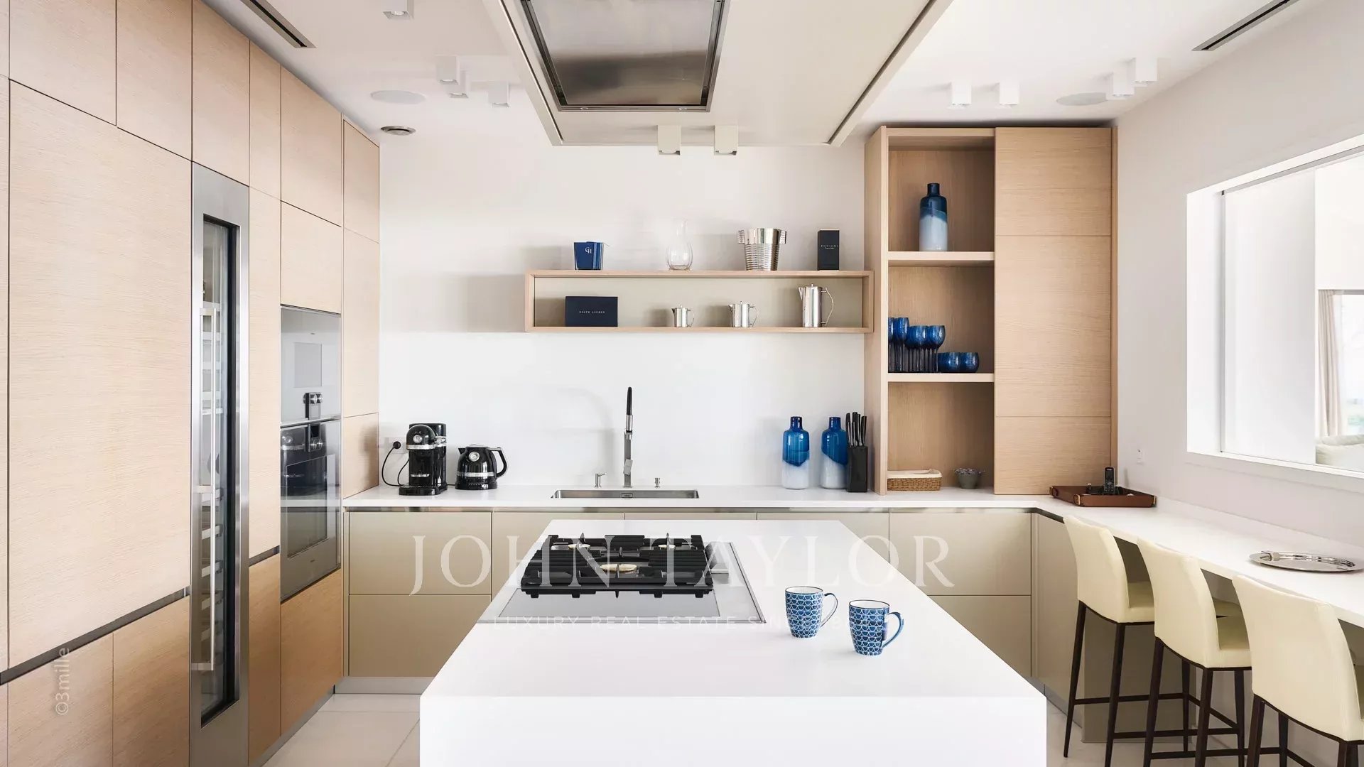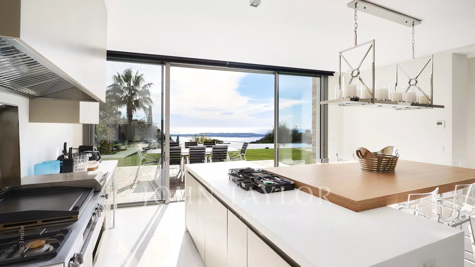 Großer und schöner Empfang mit ausgestatteter Küche, Esszimmer, großem Wohnzimmer, das sich auf große Terrassen mit Meerblick öffnet.
