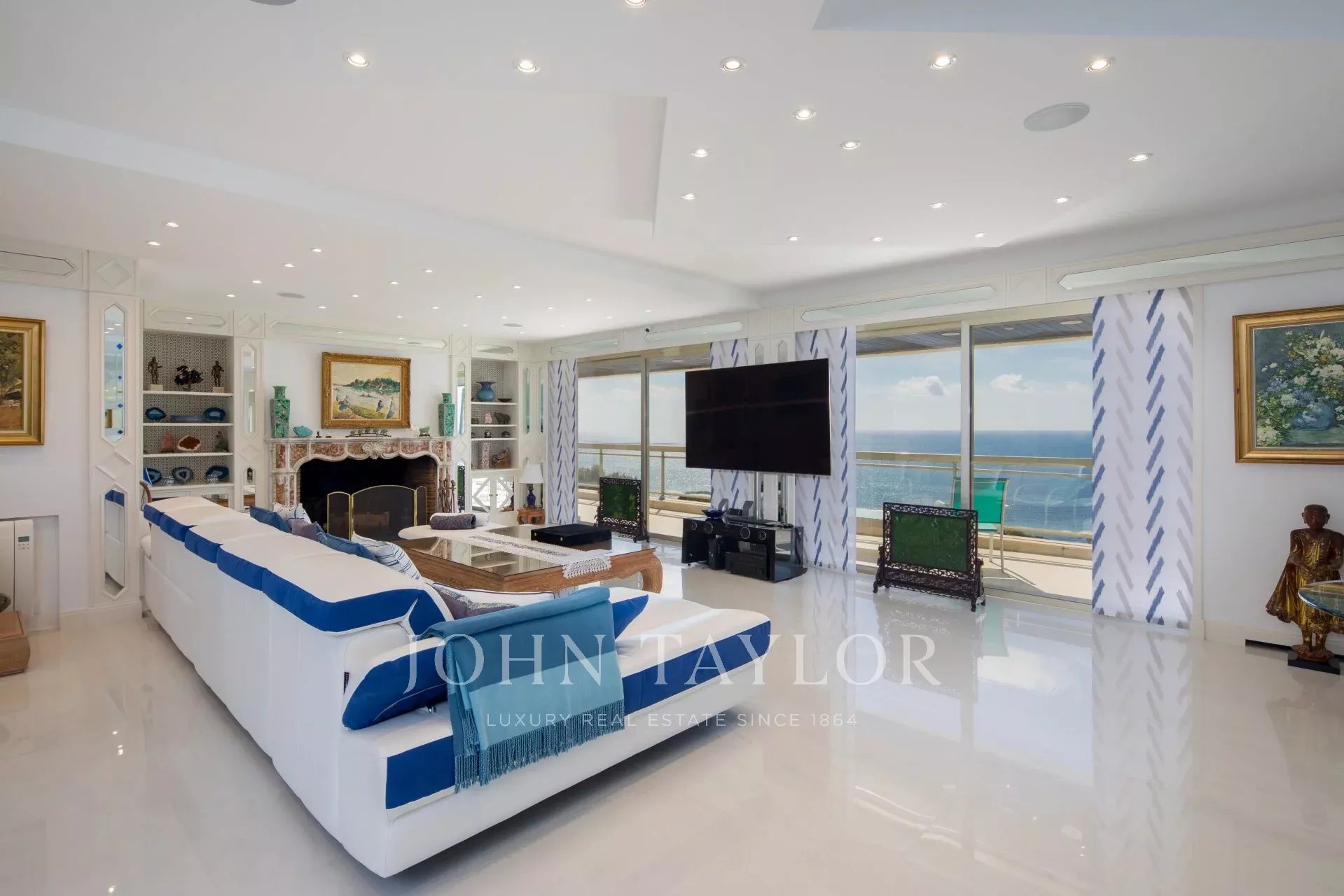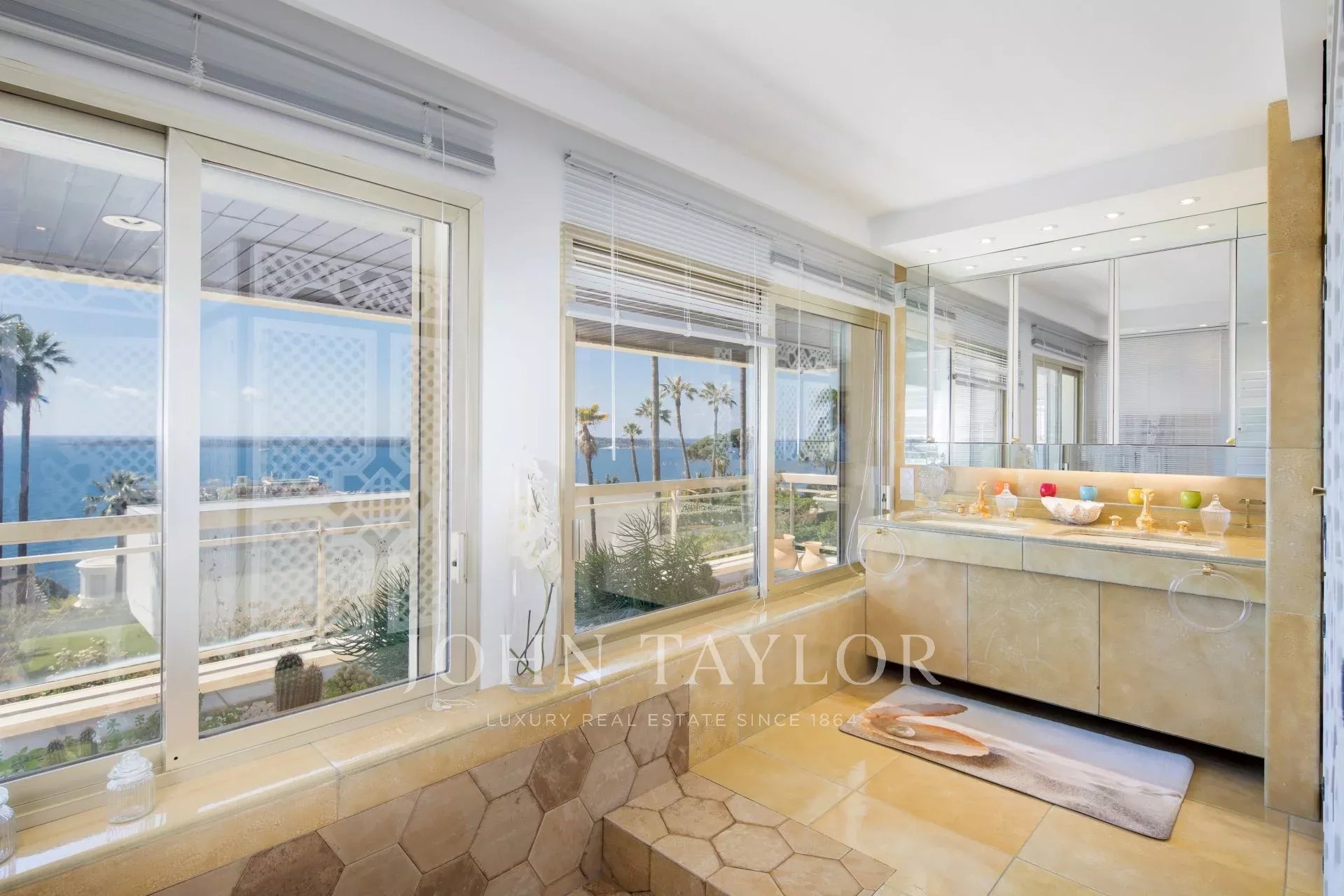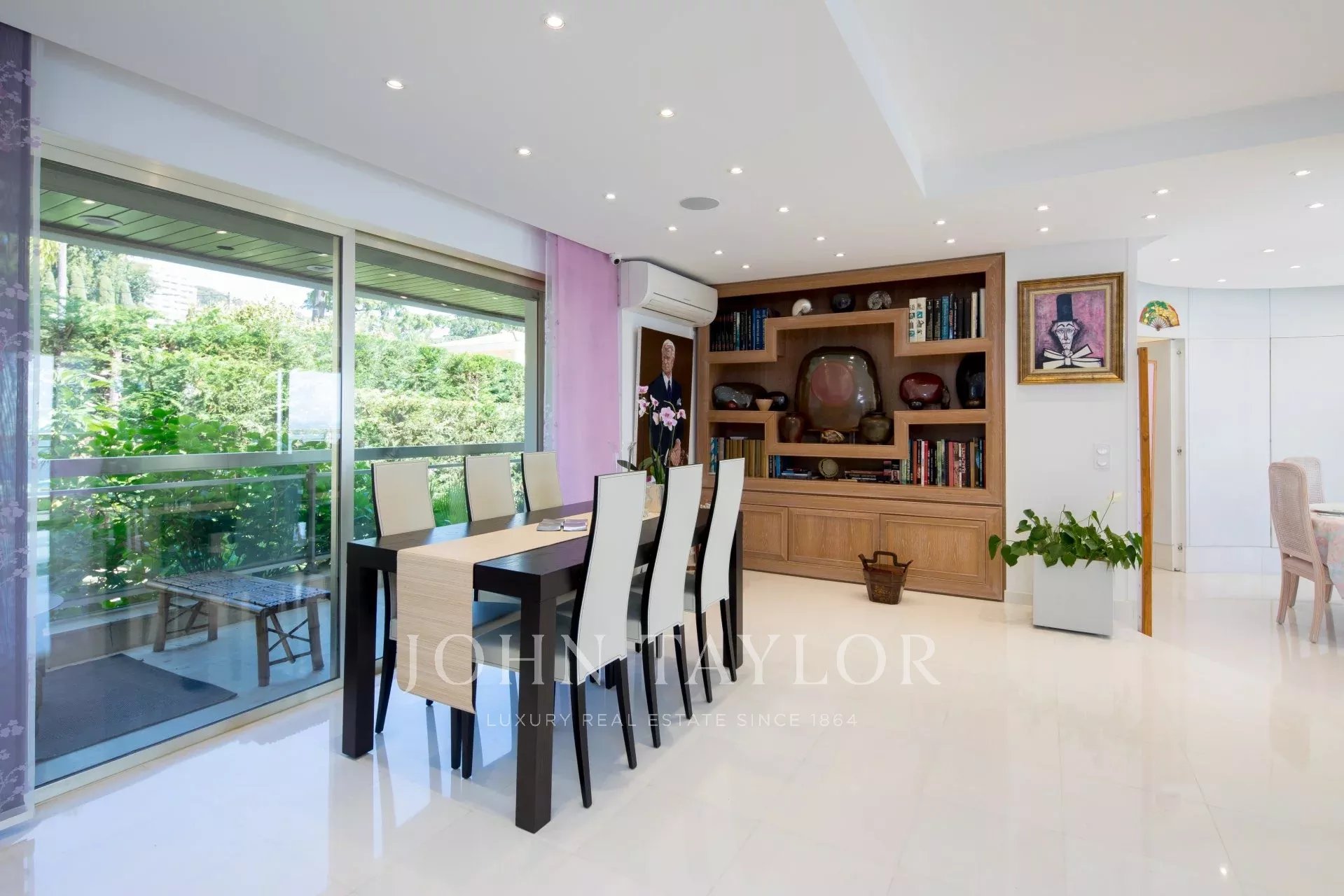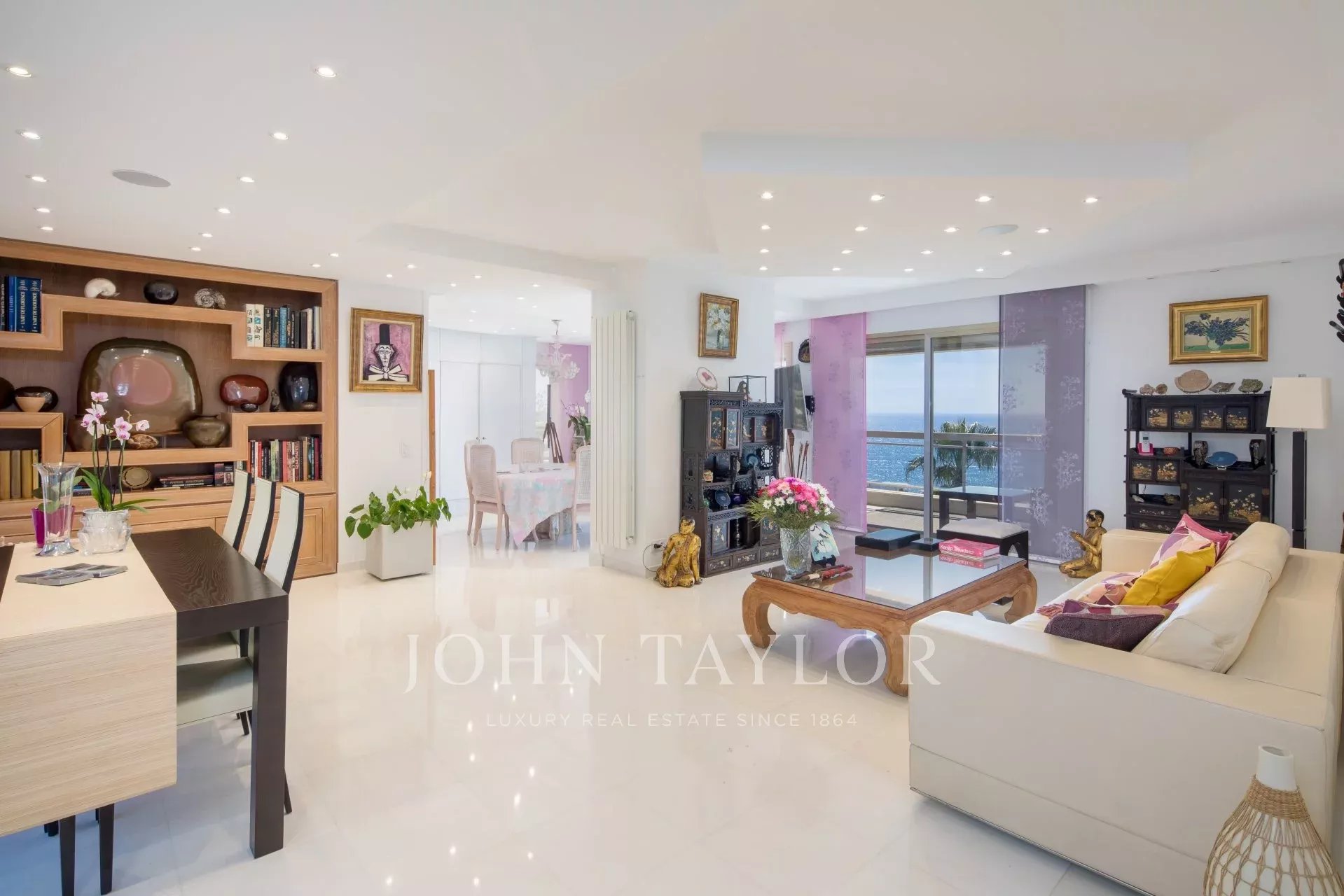 Eingang zu einem doppelten Wohn-/Esszimmer mit Zugang zur Terrasse mit Blick auf die Bucht von Cannes und die Lérins-Inseln.