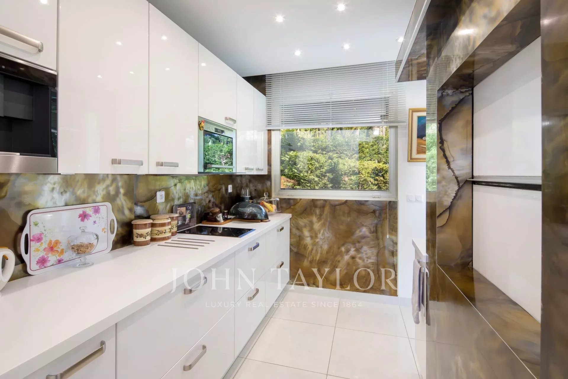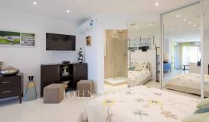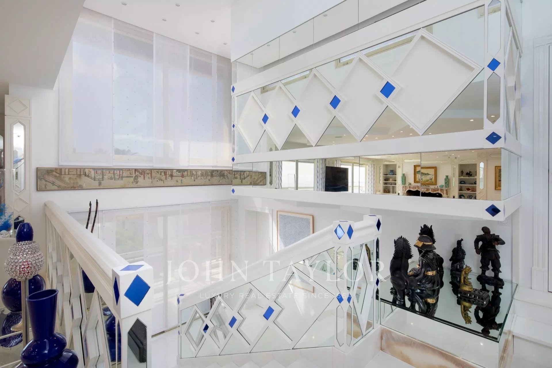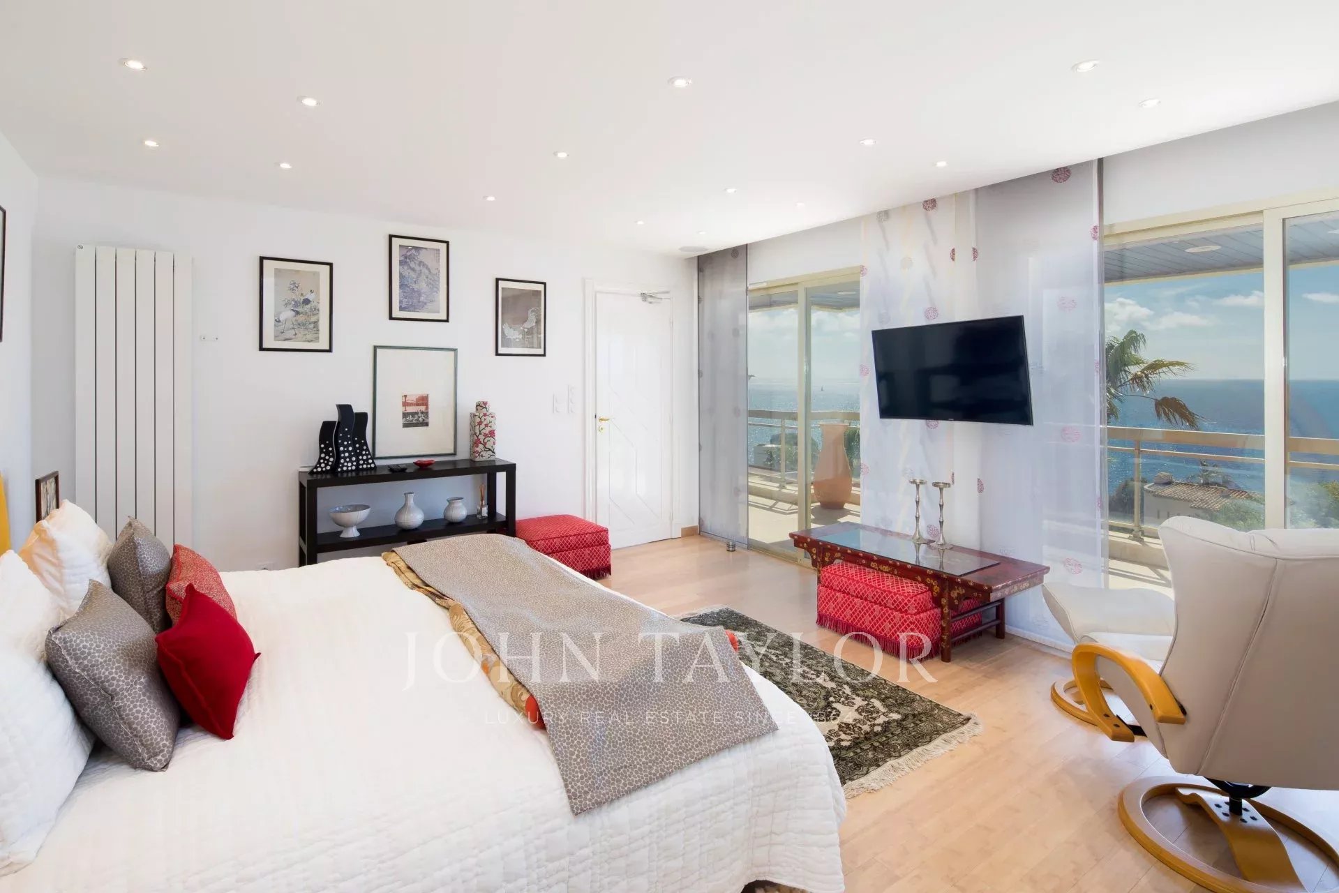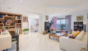 Eingang zu einem doppelten Wohn-/Esszimmer mit Zugang zur Terrasse mit Blick auf die Bucht von Cannes und die Lérins-Inseln.