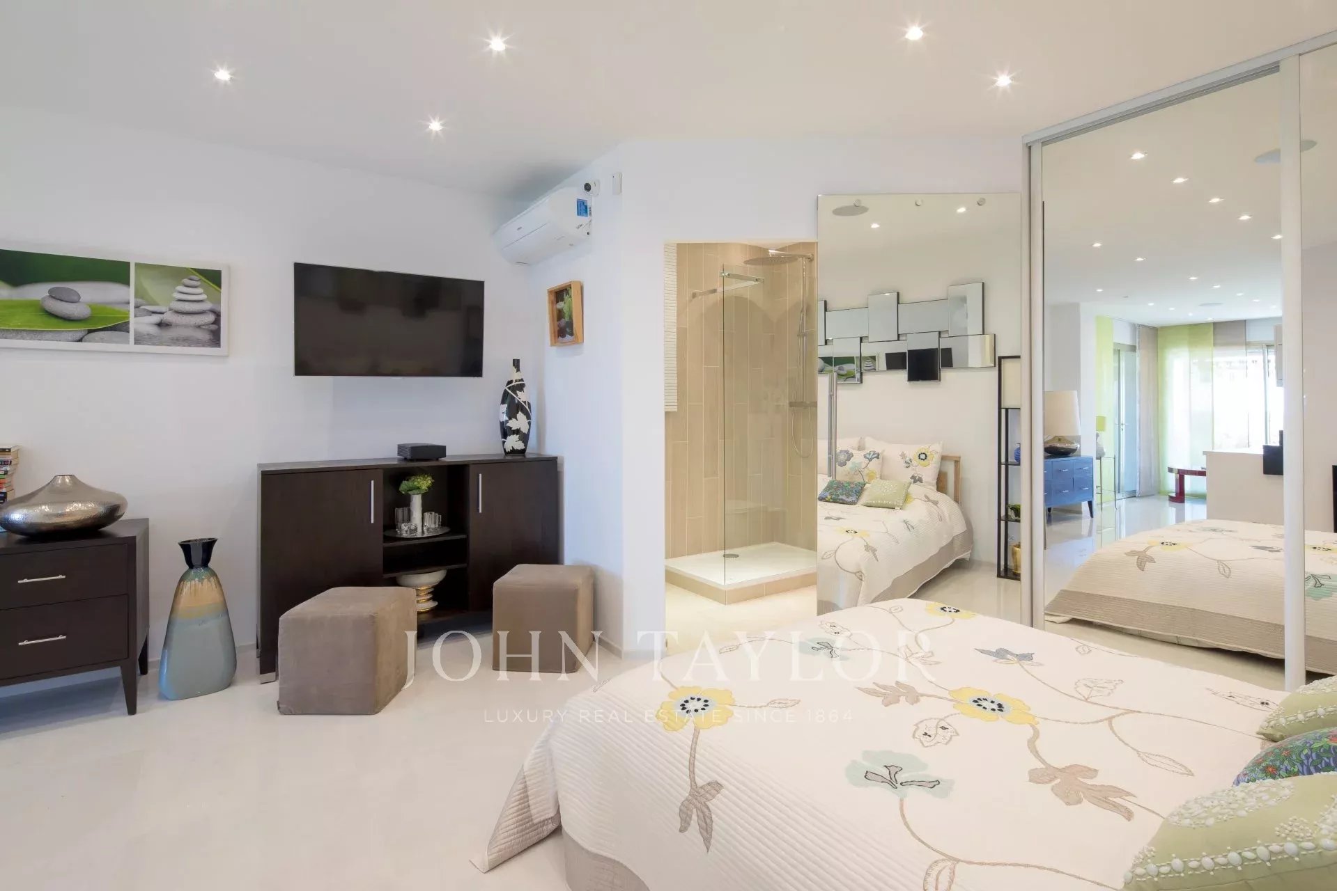 Studio (Bett 160 cm), das sich zum Garten hin öffnet und aus einer Küchenzeile, einem Ankleidezimmer, einem Duschbad / WC besteht.