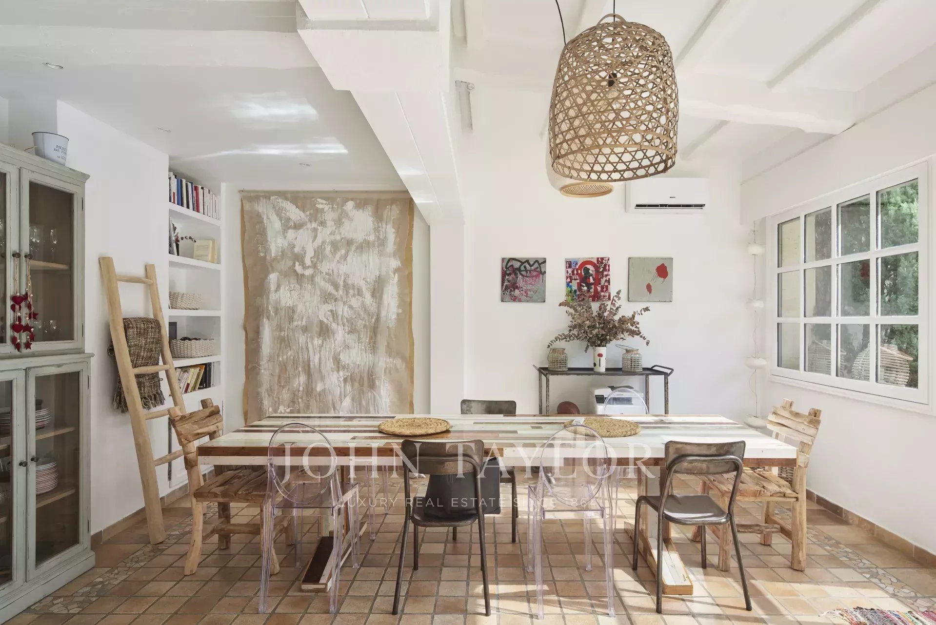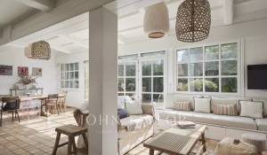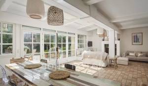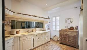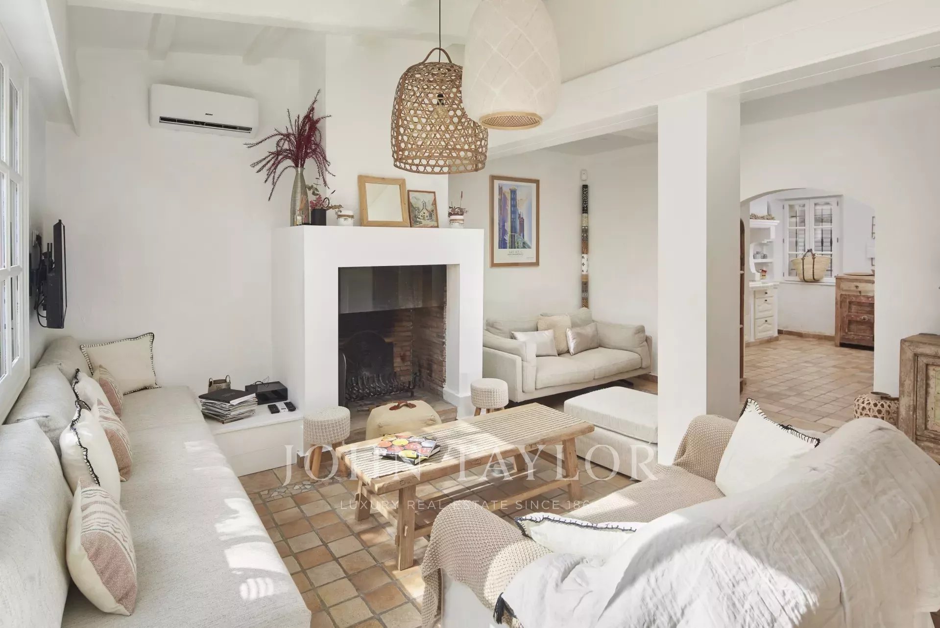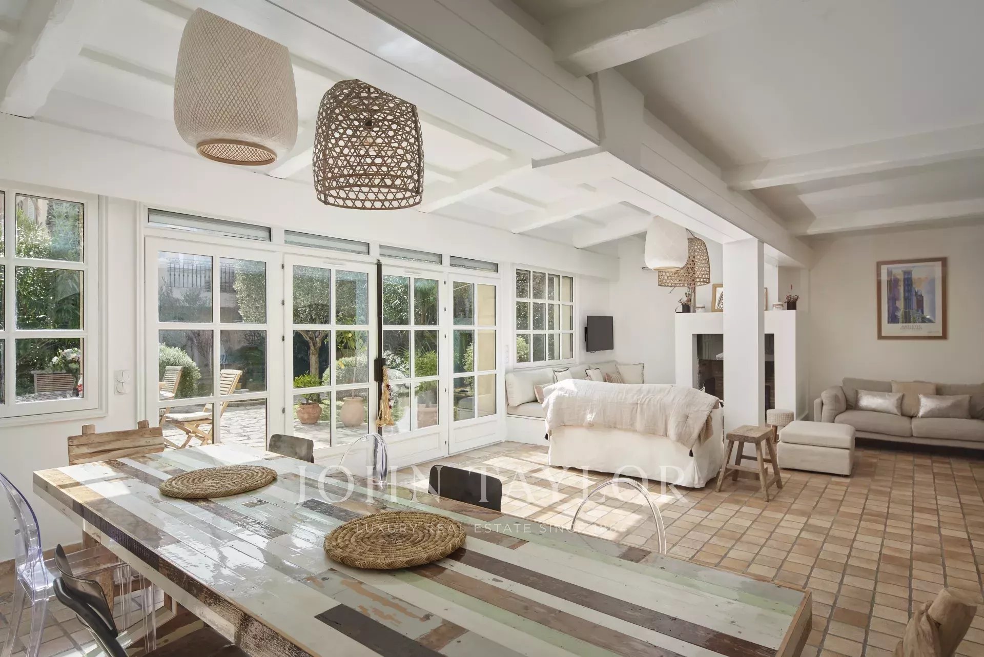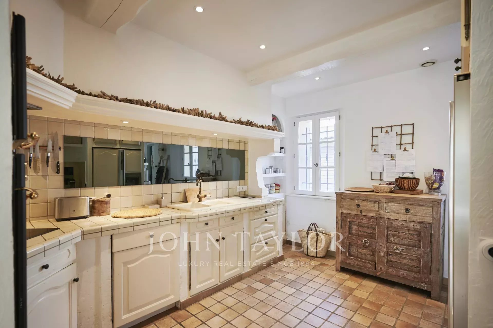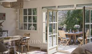 Große, voll ausgestattete Küche mit Blick auf den klimatisierten Empfangsraum, der ein Wohnzimmer mit Kamin und Essbereich bietet und zum Garten und seiner Terrasse hin offen ist (Sommer-Esszimmer).