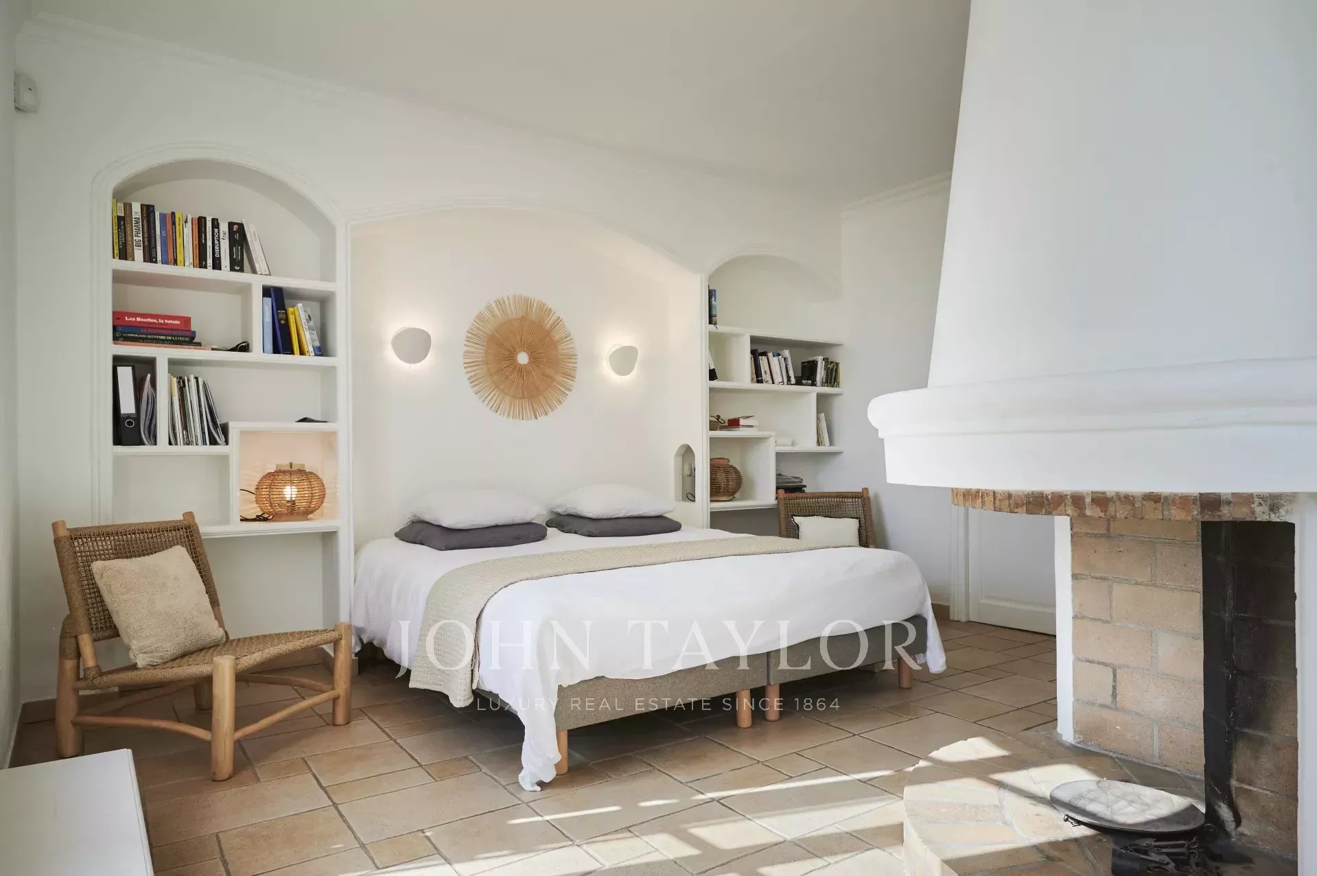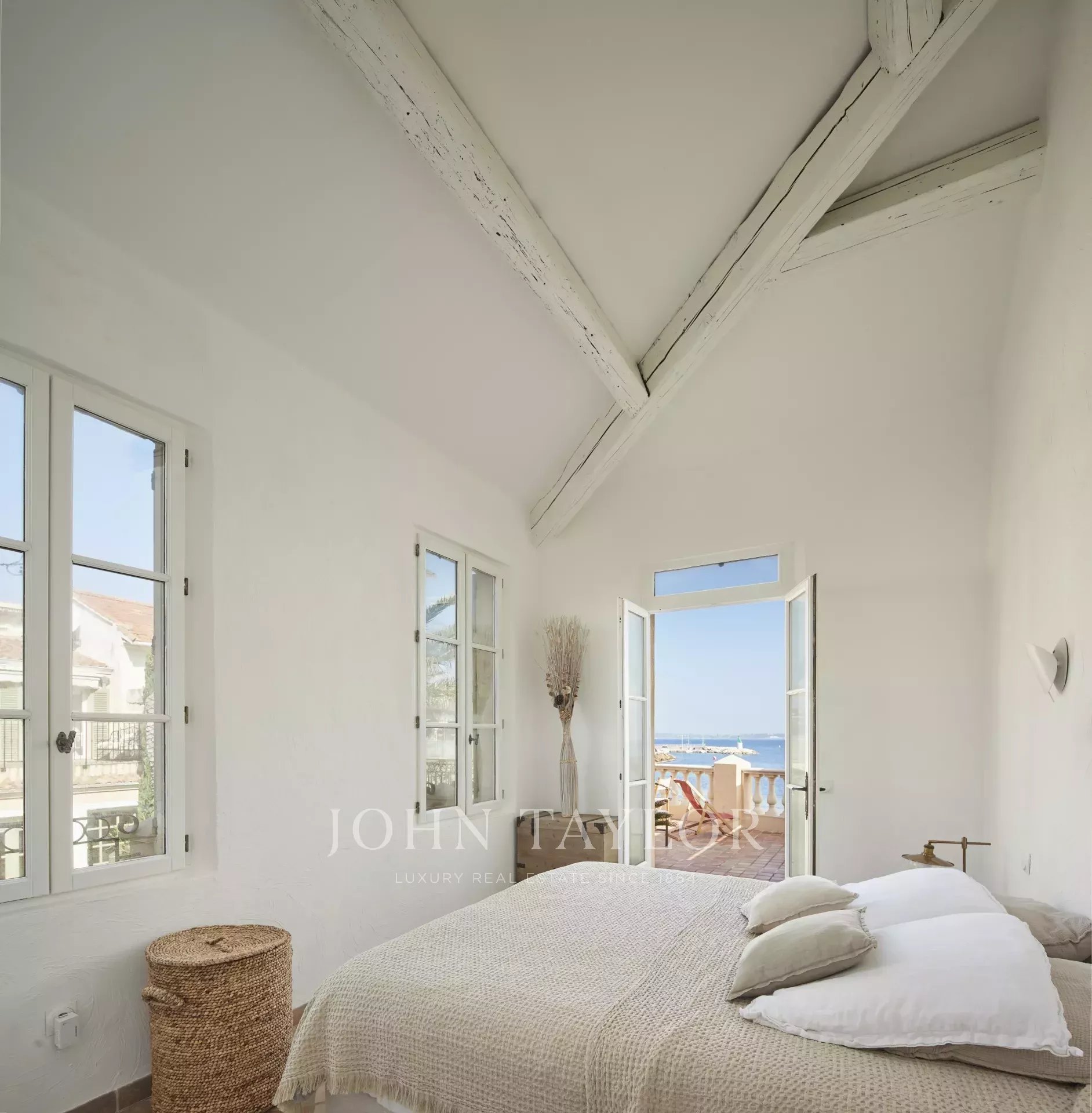 Zwei klimatisierte Schlafzimmer mit jeweils eigenem Duschbad, die sich zu Terrassen mit Meerblick öffnen.