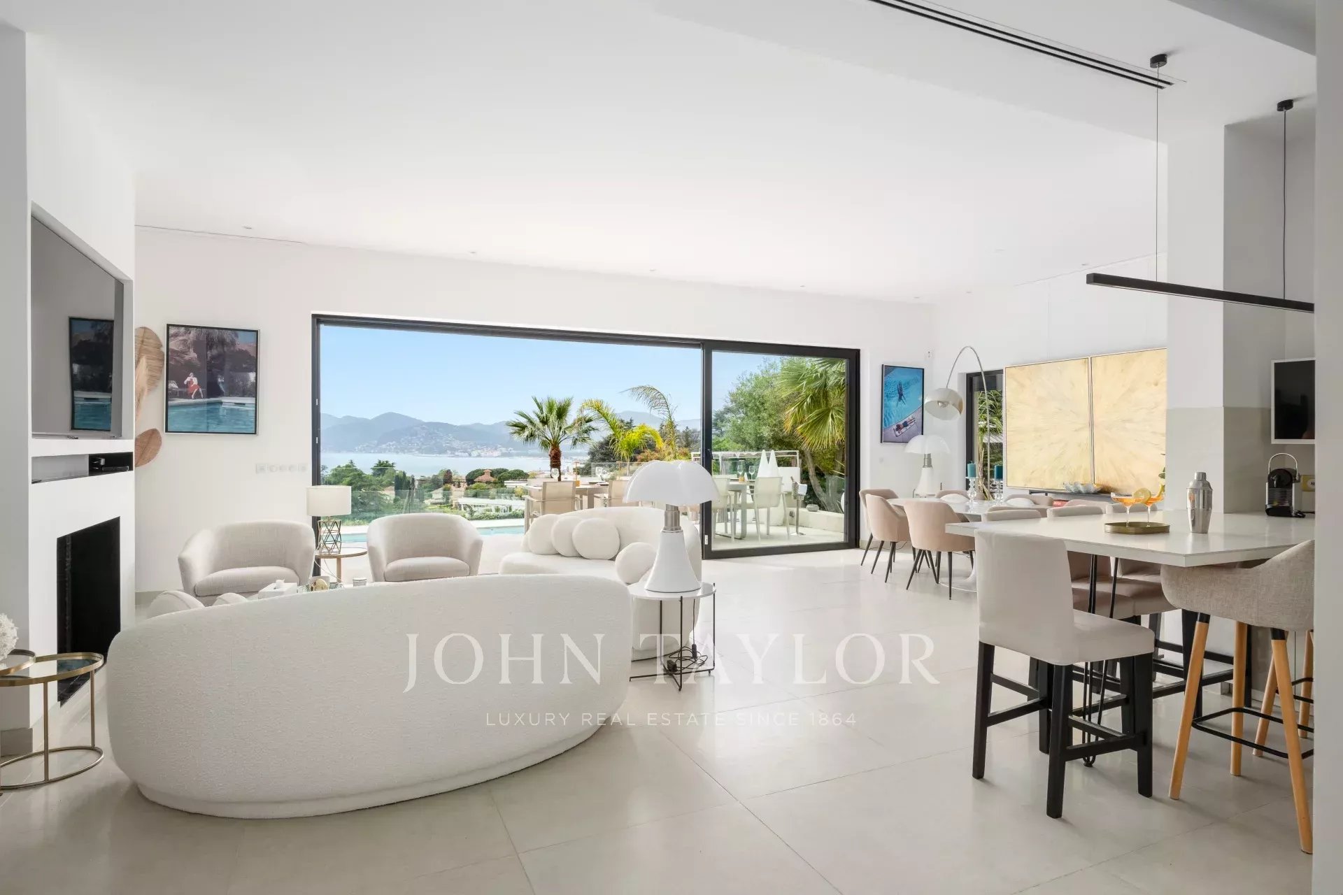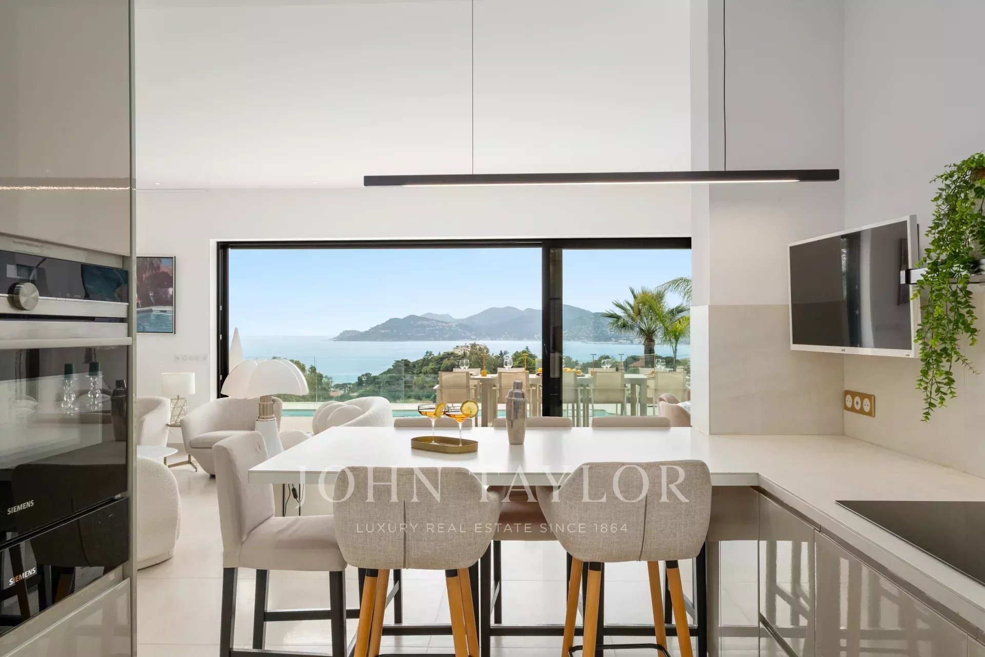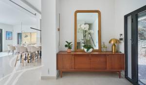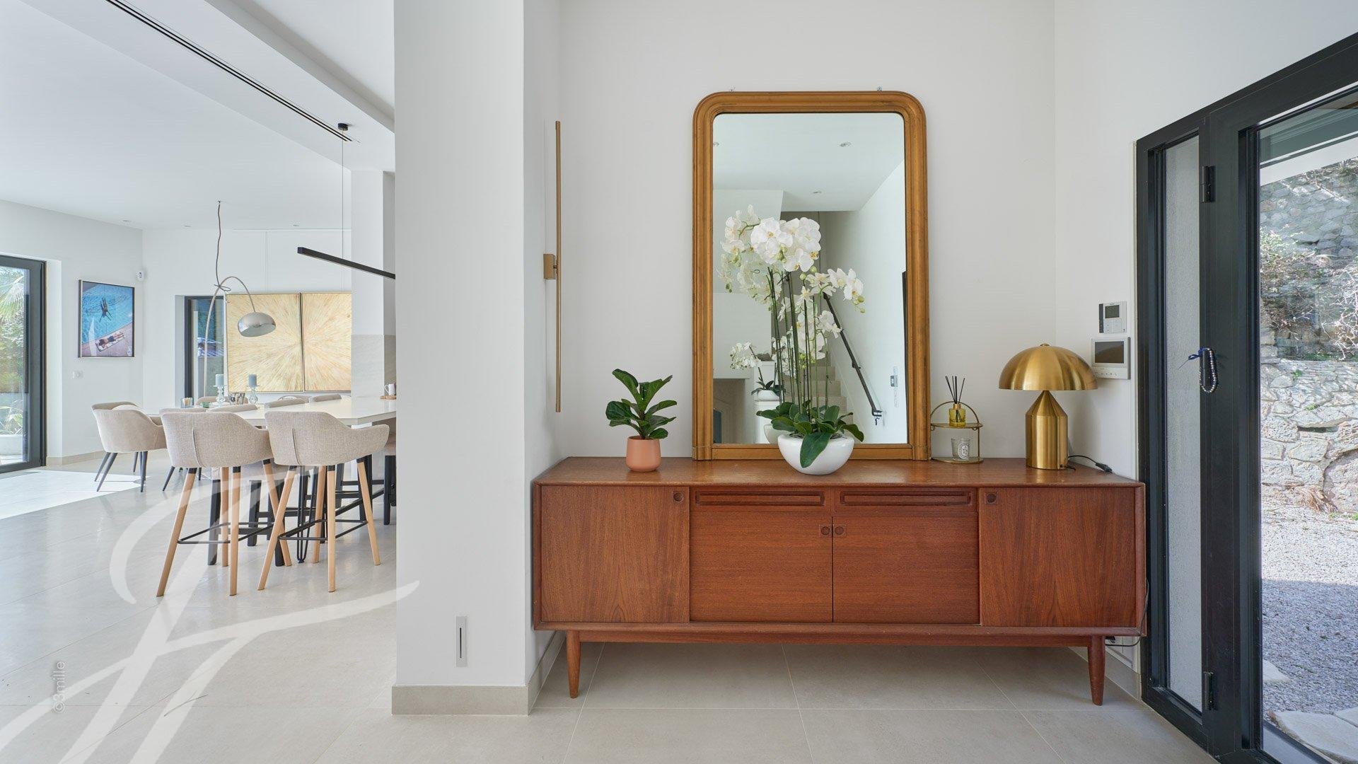Eingang zum Empfangsbereich mit Wohnzimmer, Esszimmer und offener Küche, die sich zur Terrasse und zum Pool mit Meerblick hin öffnen.