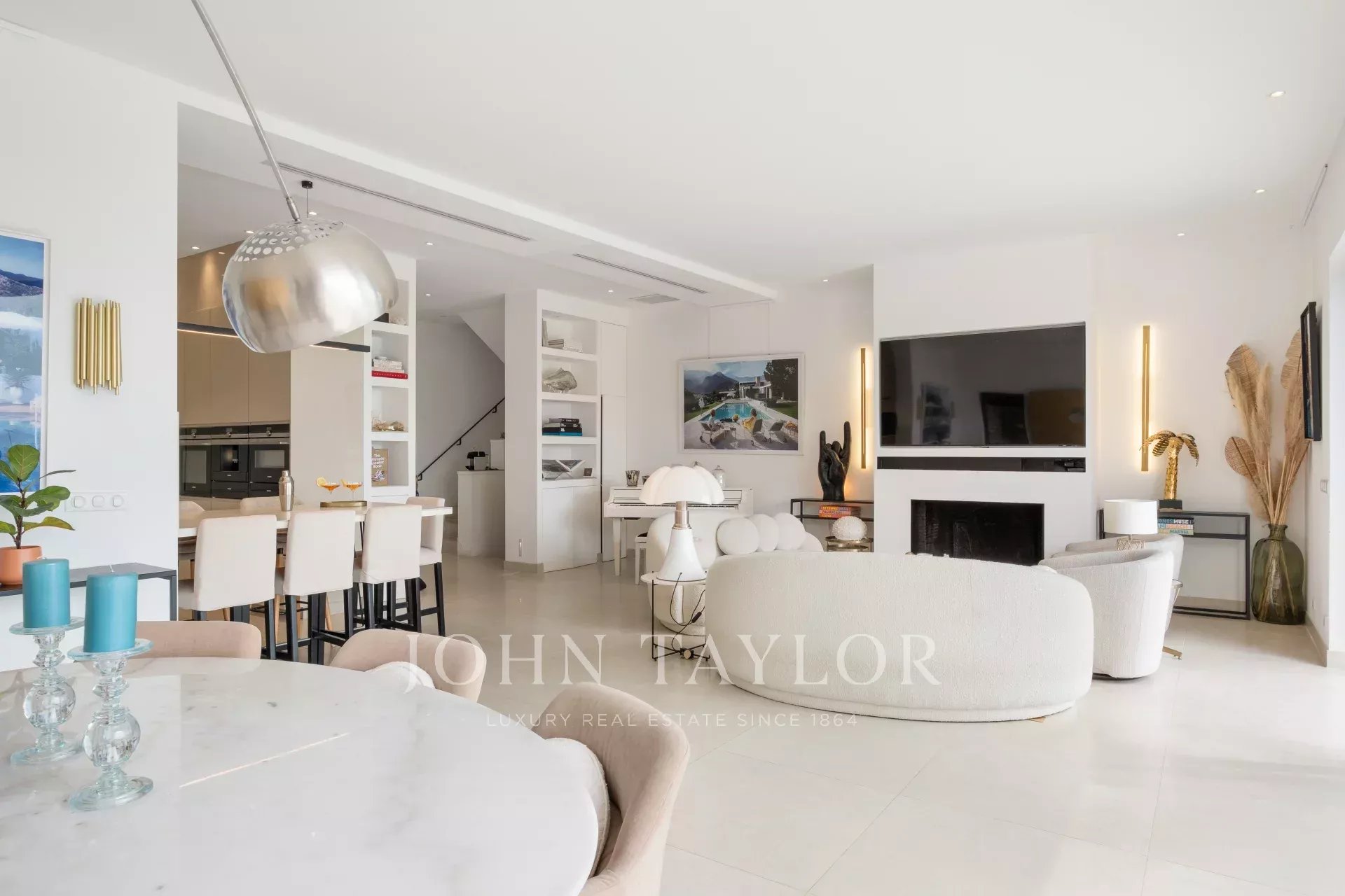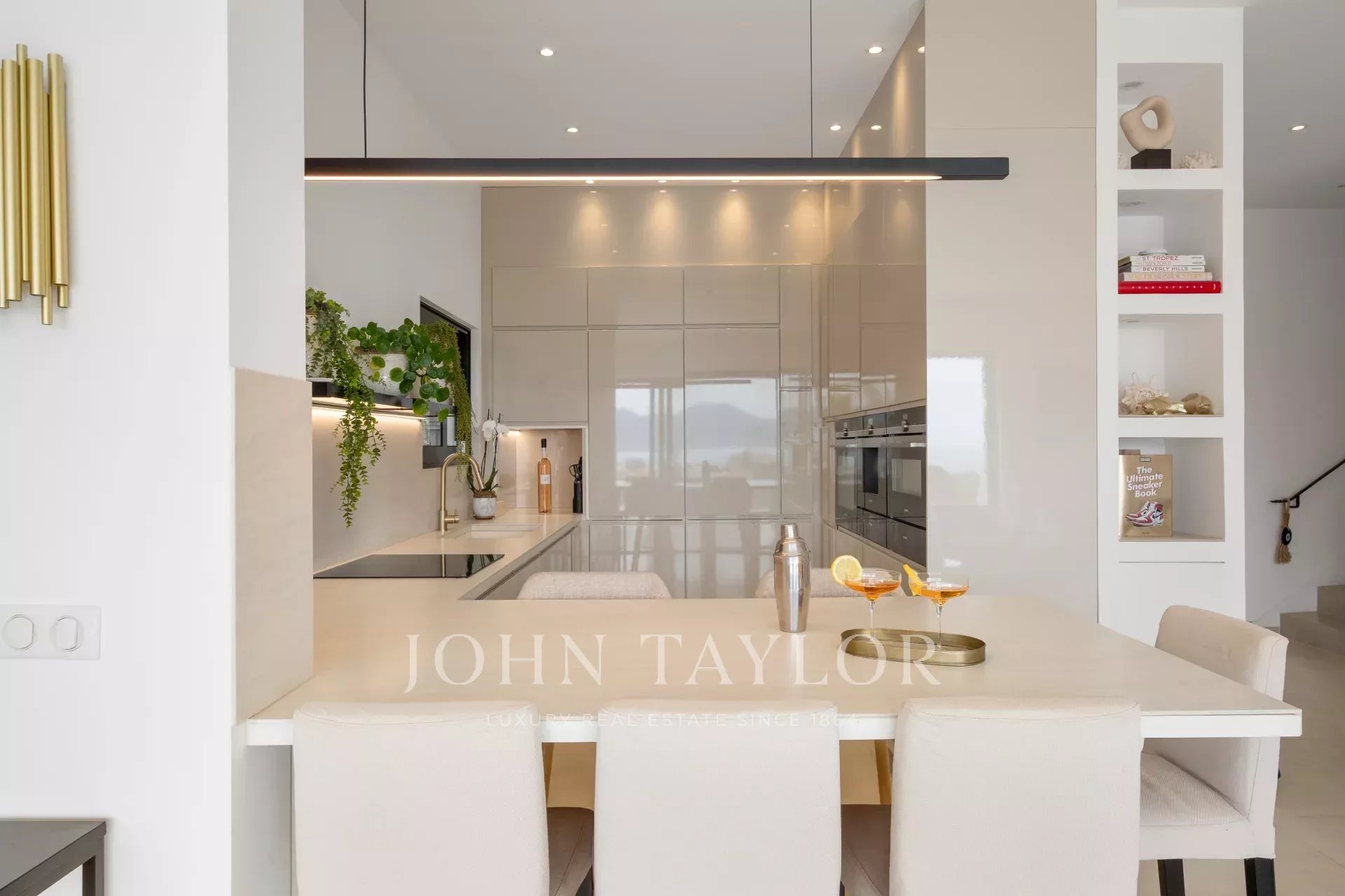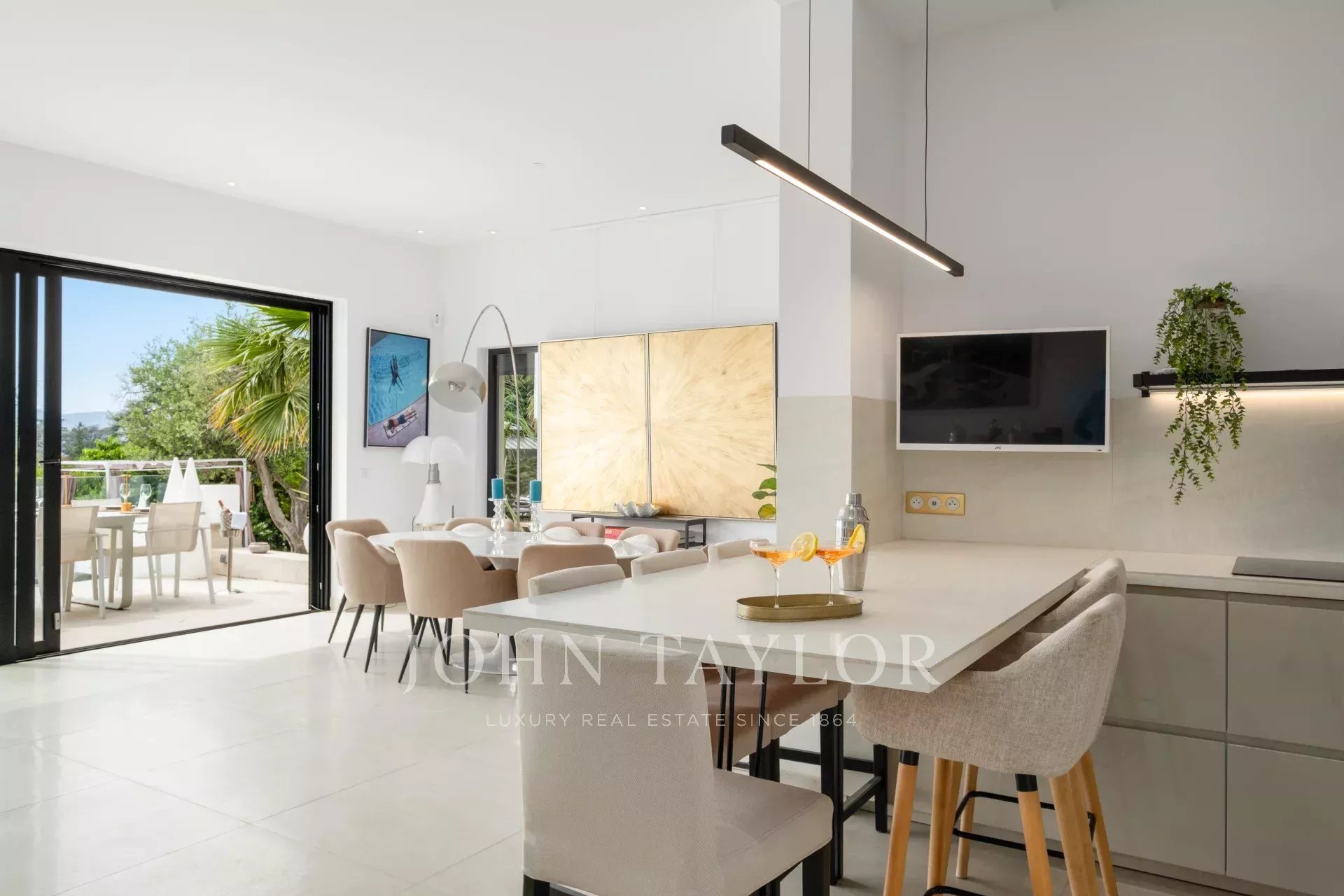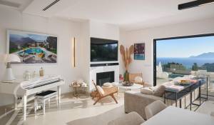 Eingang zum Empfangsbereich mit Wohnzimmer, Esszimmer und offener Küche, die sich zur Terrasse und zum Pool mit Meerblick hin öffnen.