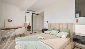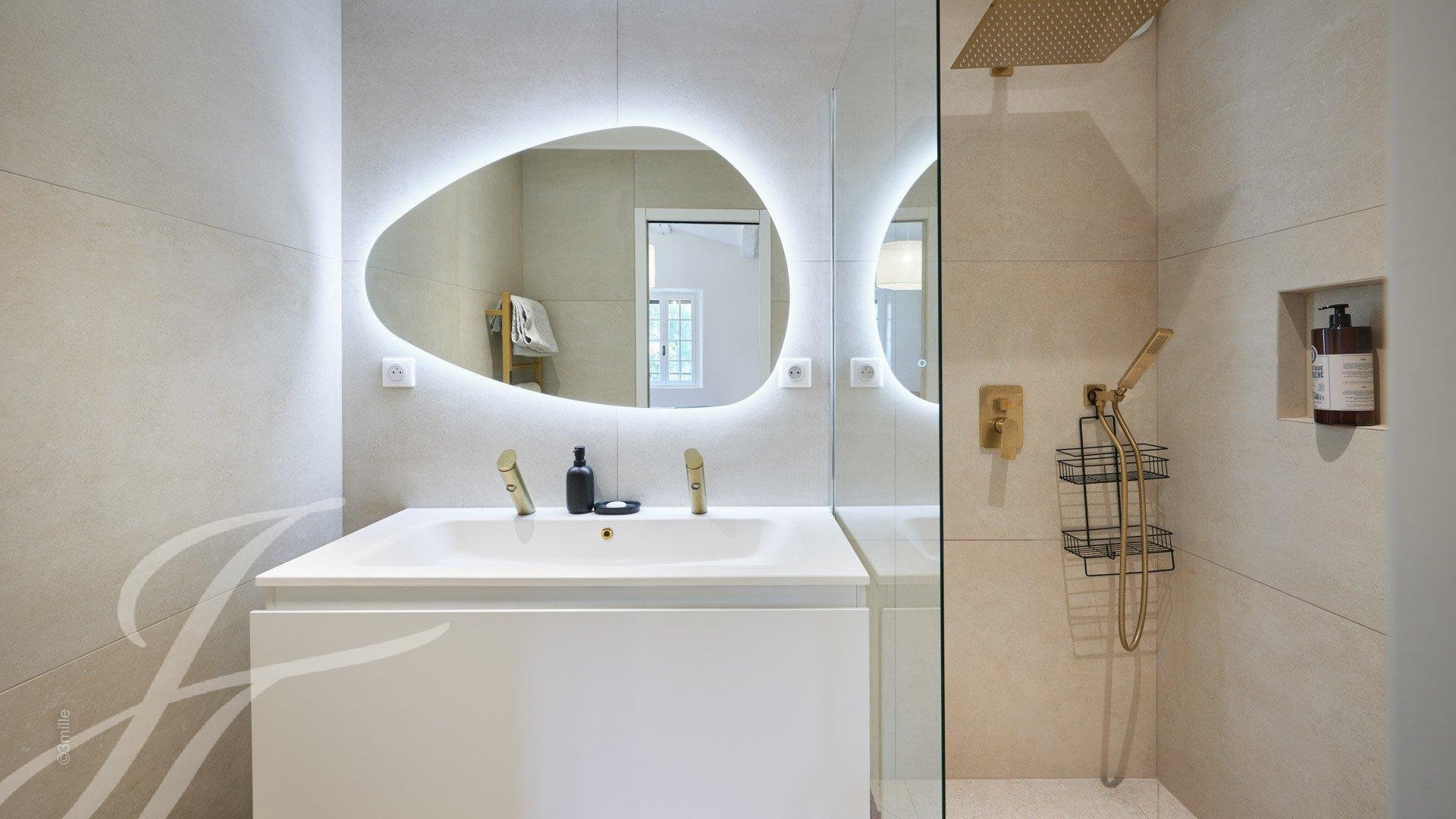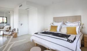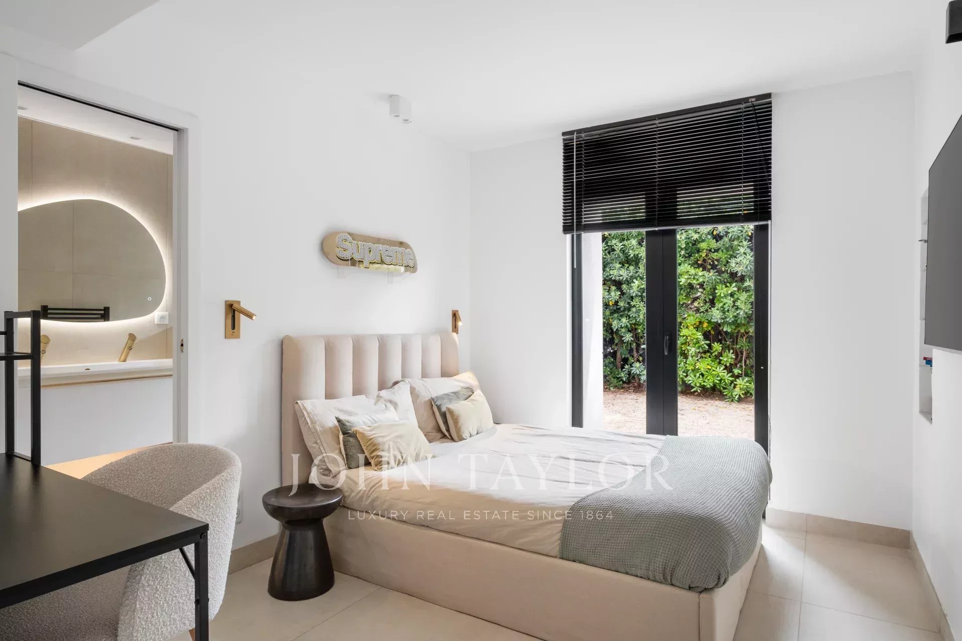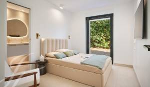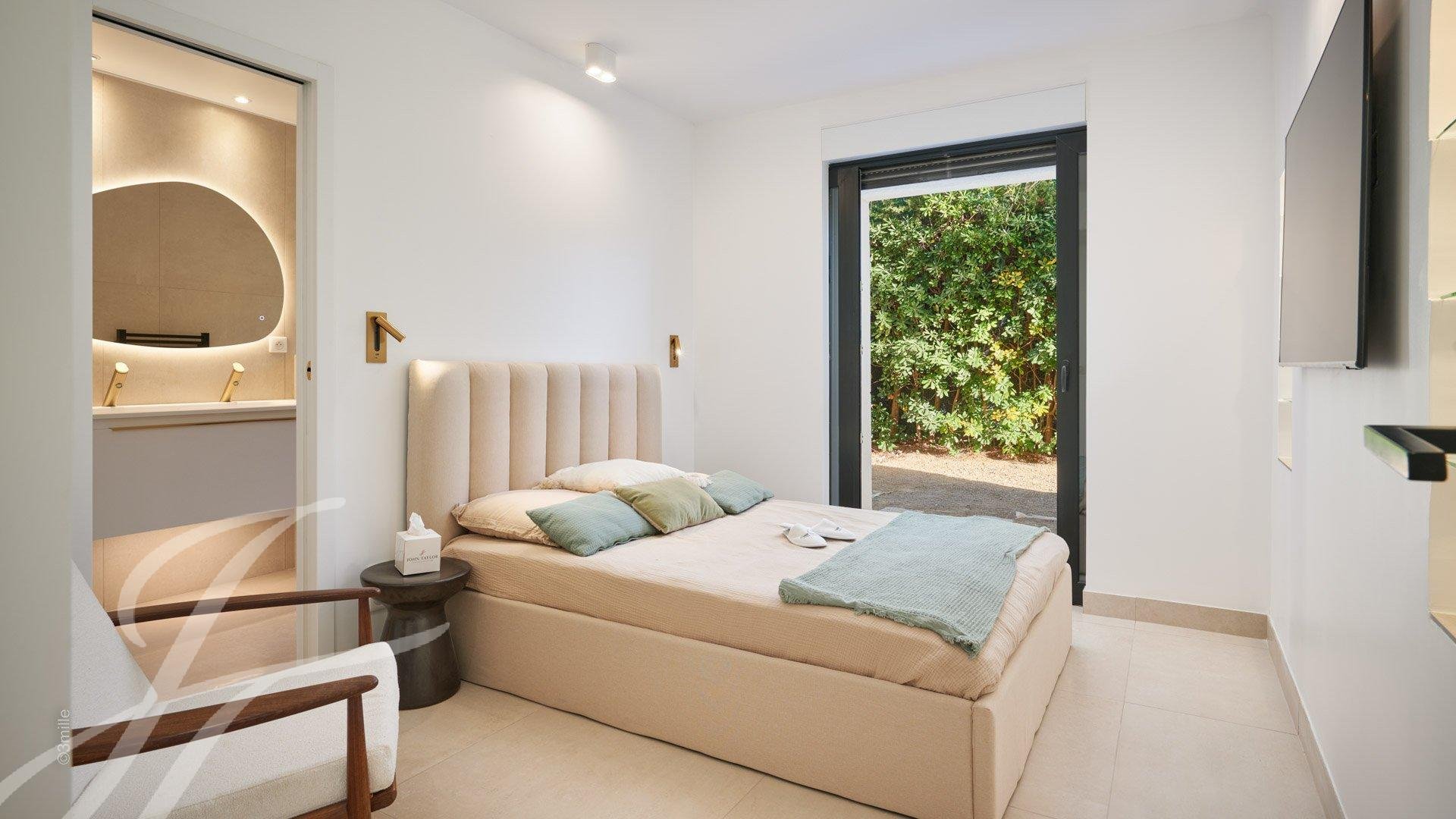 Schlafzimmer (Doppelbett kann getrennt werden) mit TV und eigenem Duschbad, das sich zum Garten und Pool öffnet, Meerblick.