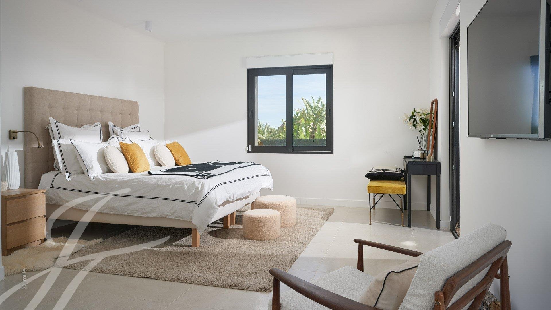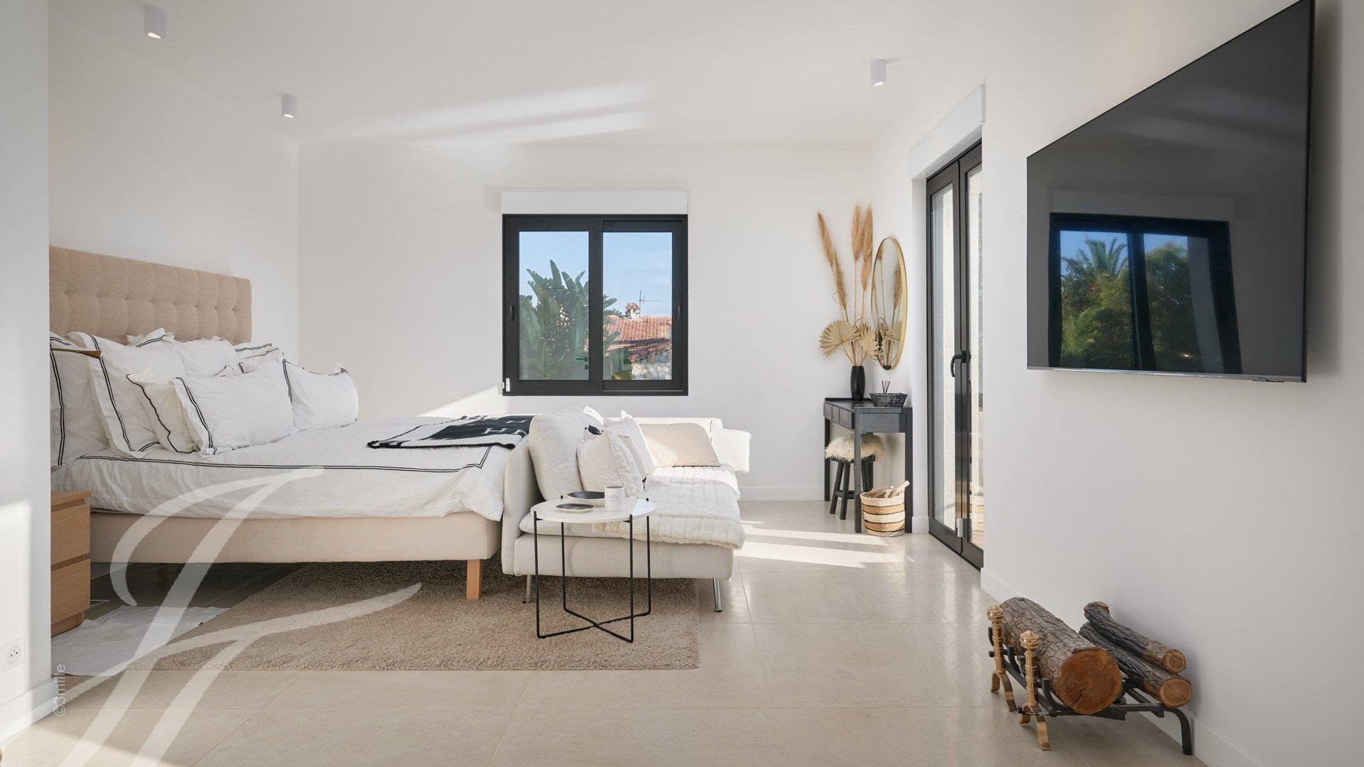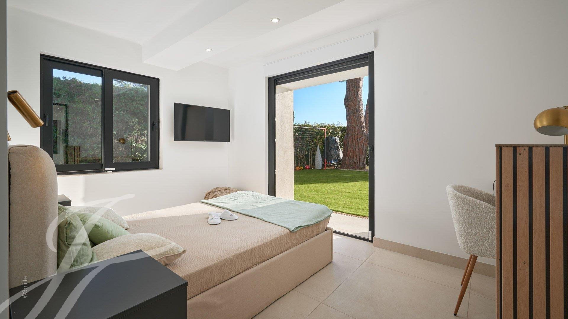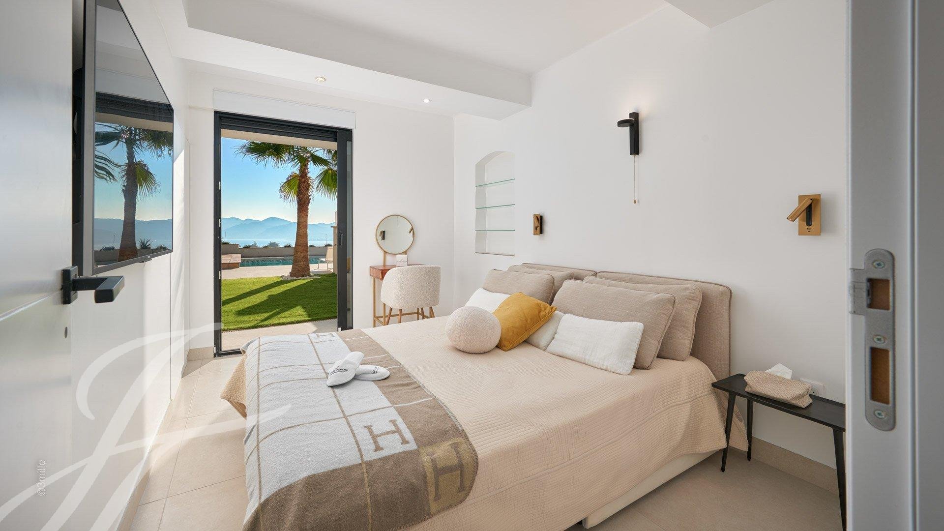 Schlafzimmer (Doppelbett) TV öffnet sich auf den Garten und den Pool mit Meerblick.