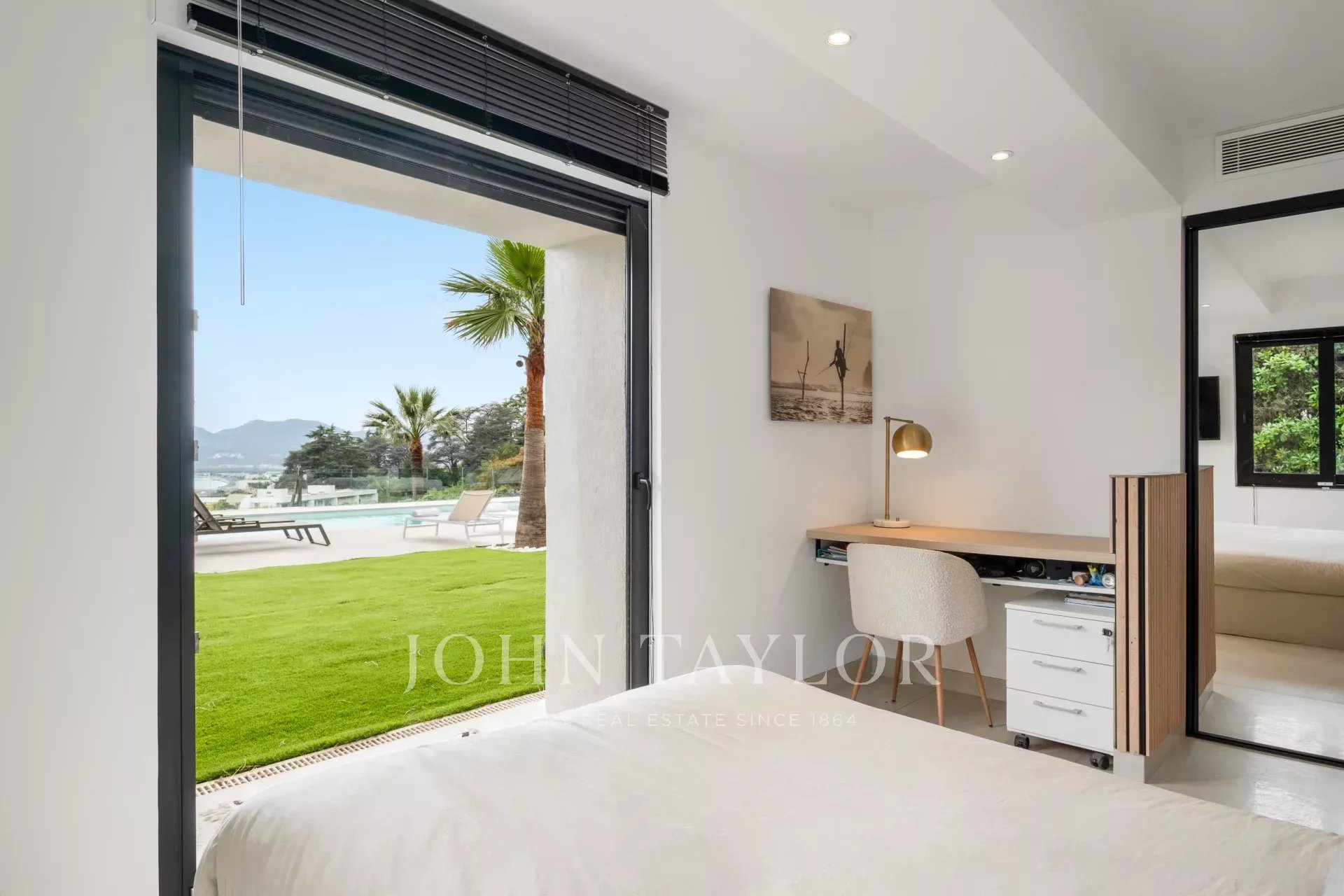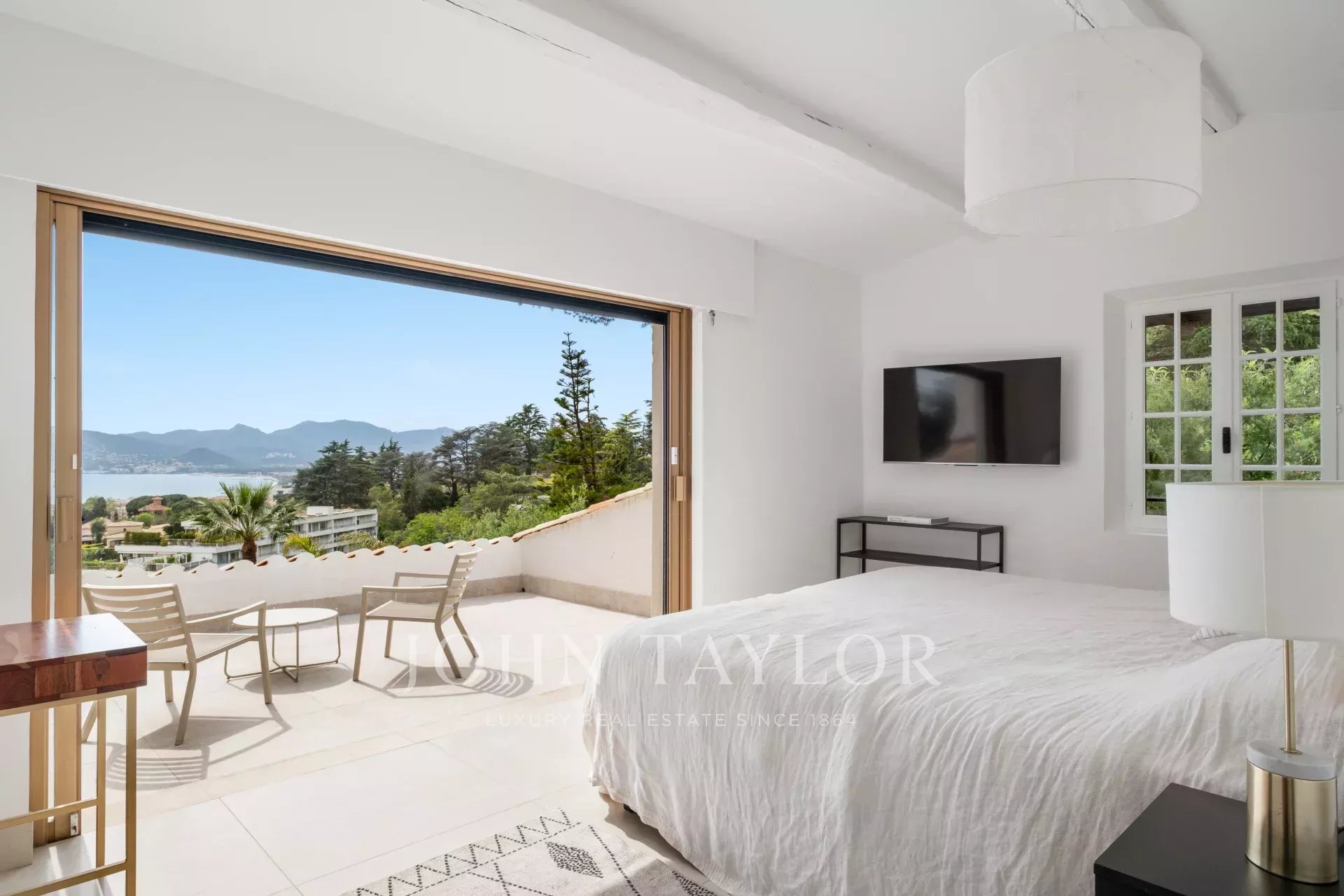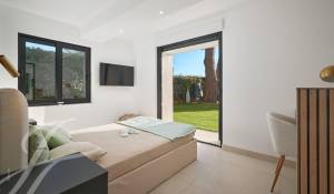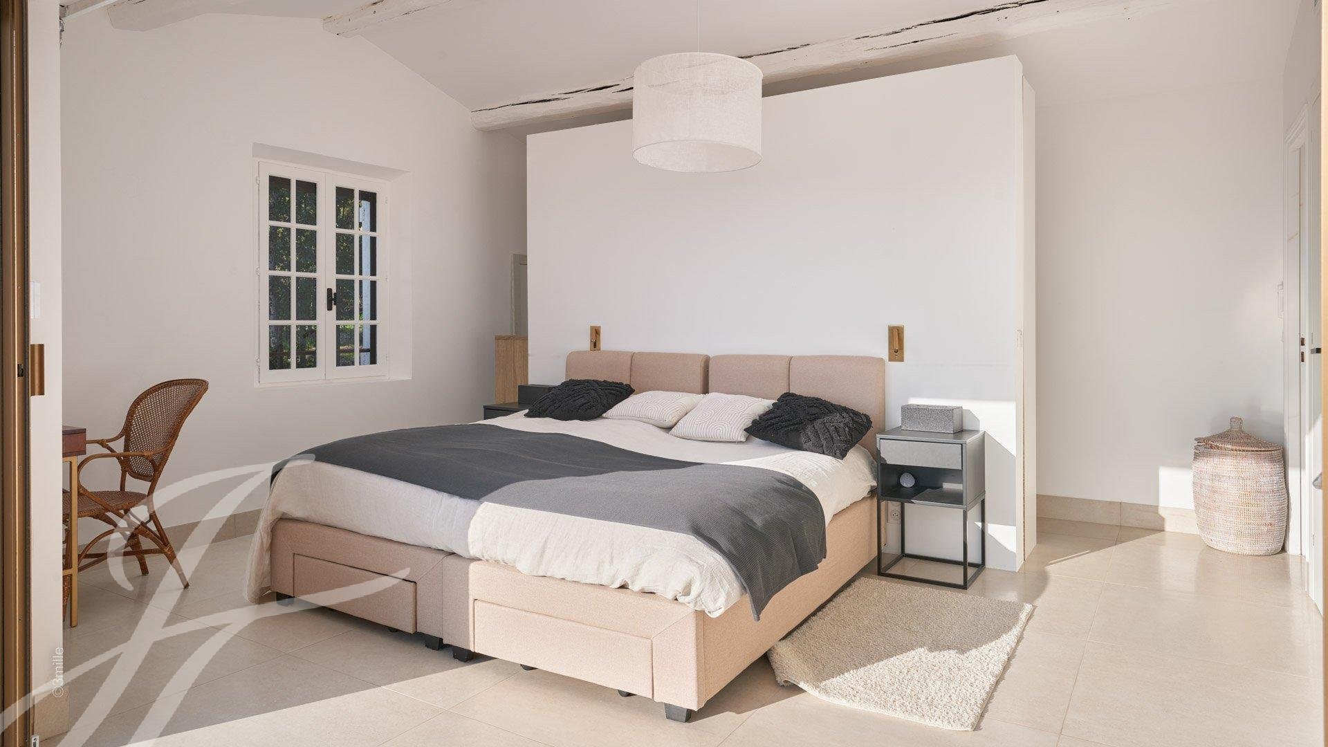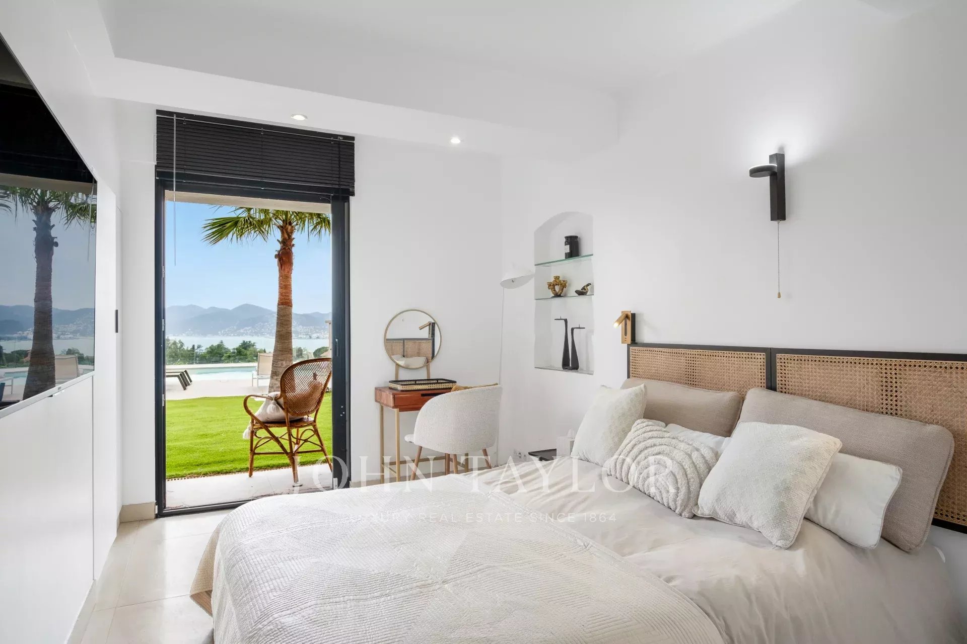 Schlafzimmer (Doppelbett) TV öffnet sich auf den Garten und den Pool mit Meerblick.